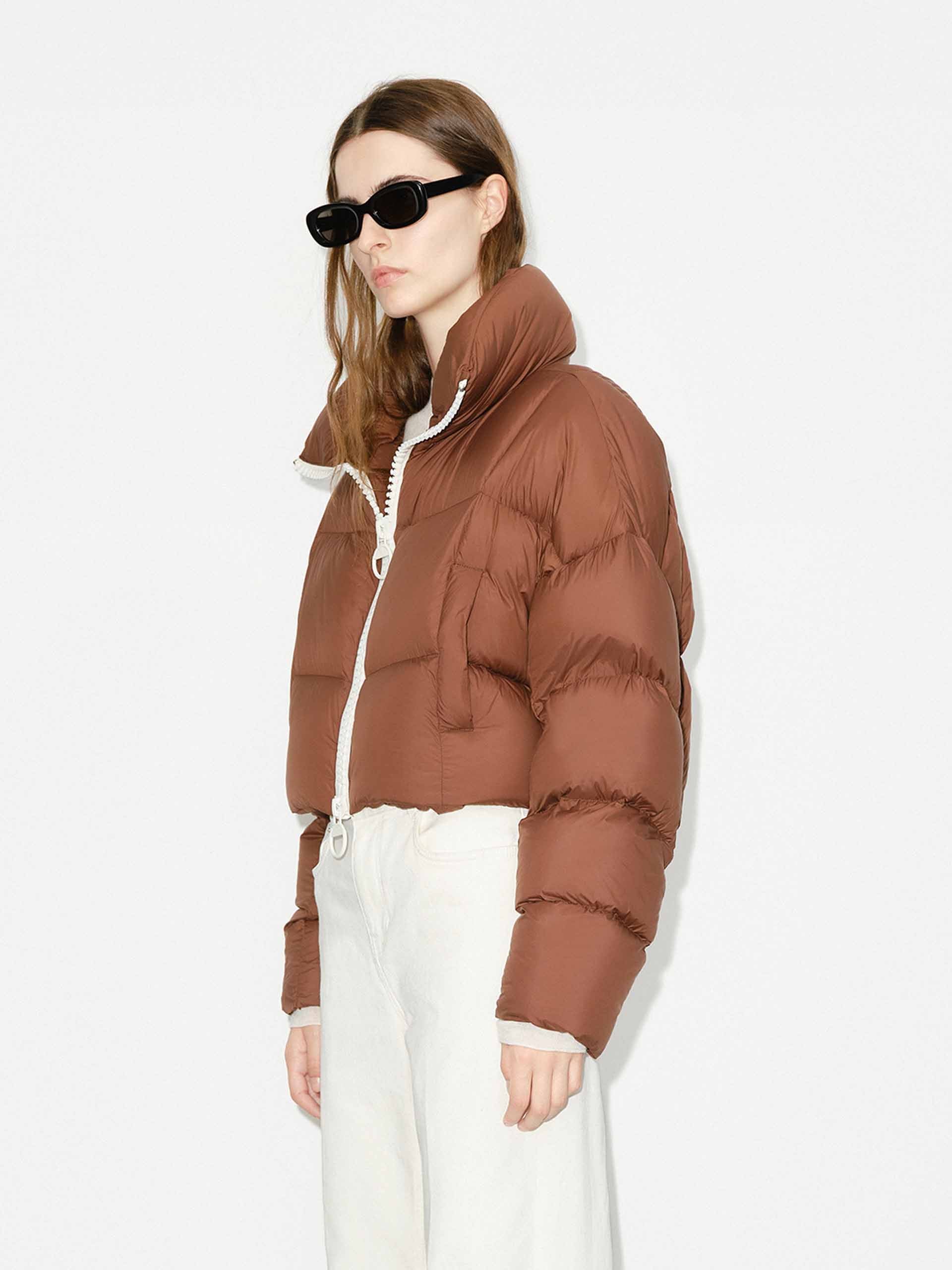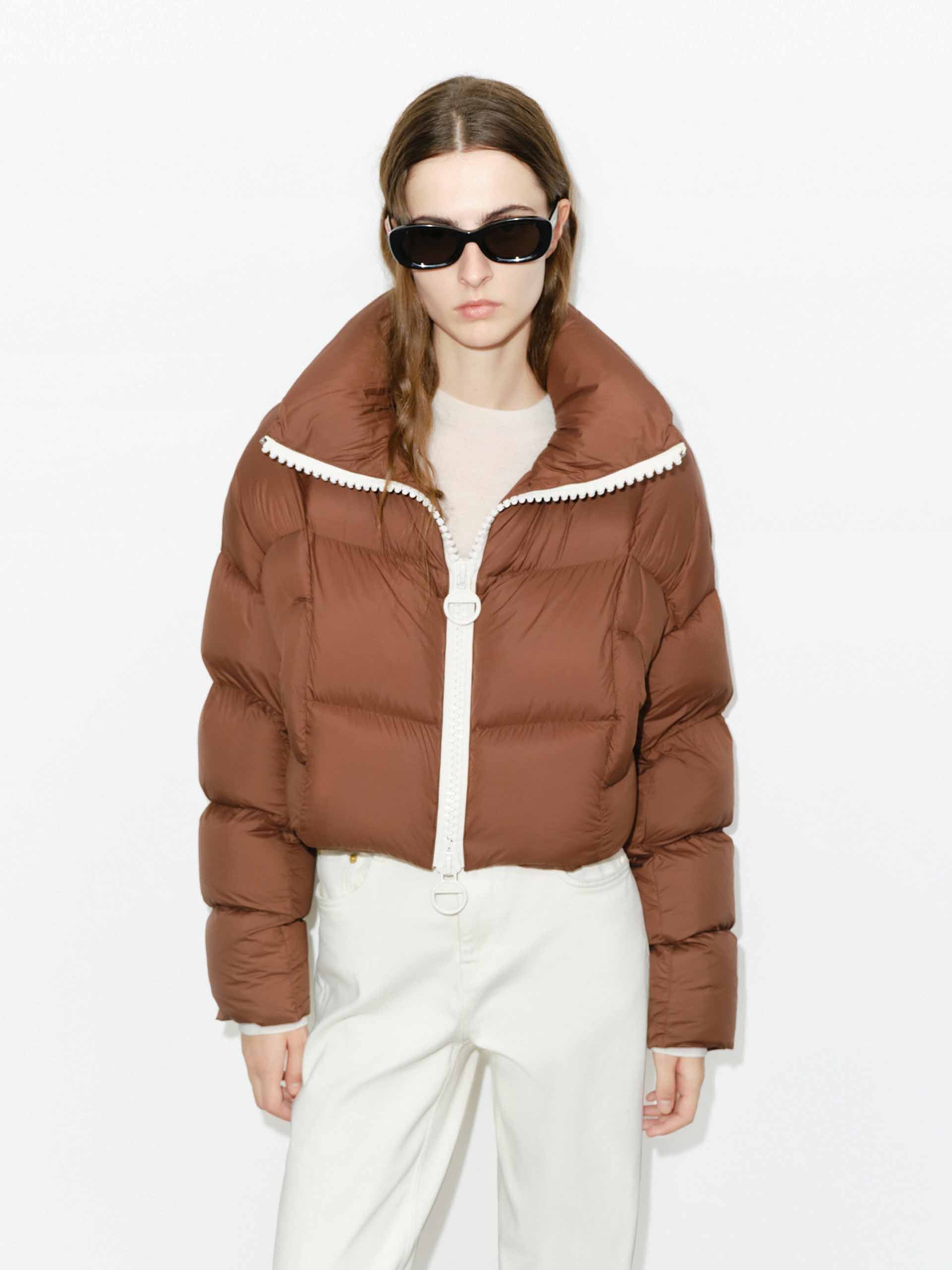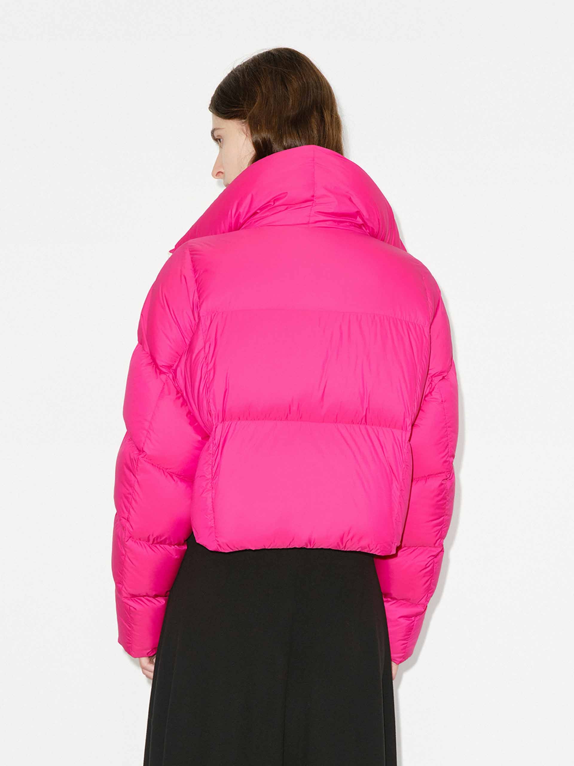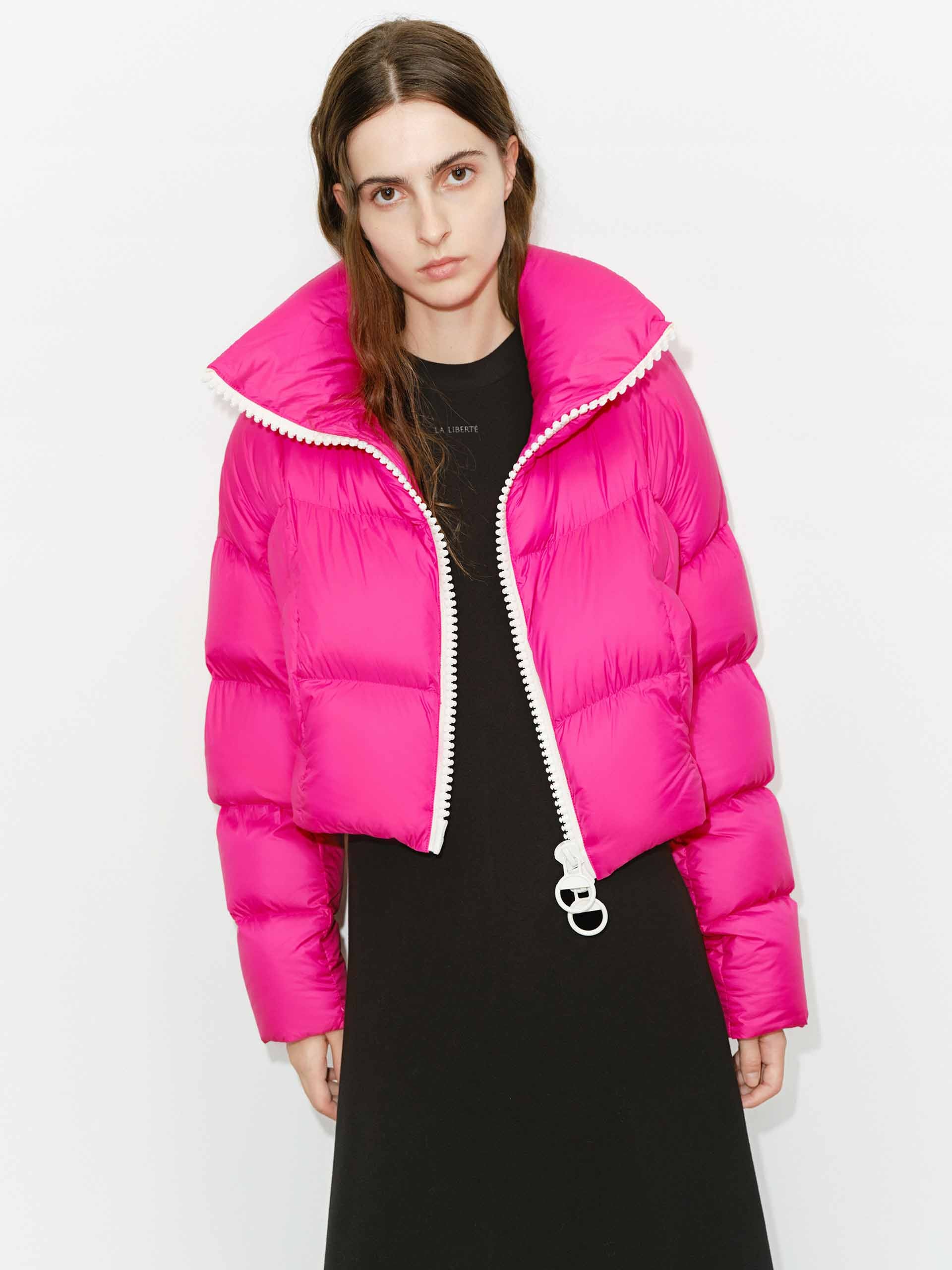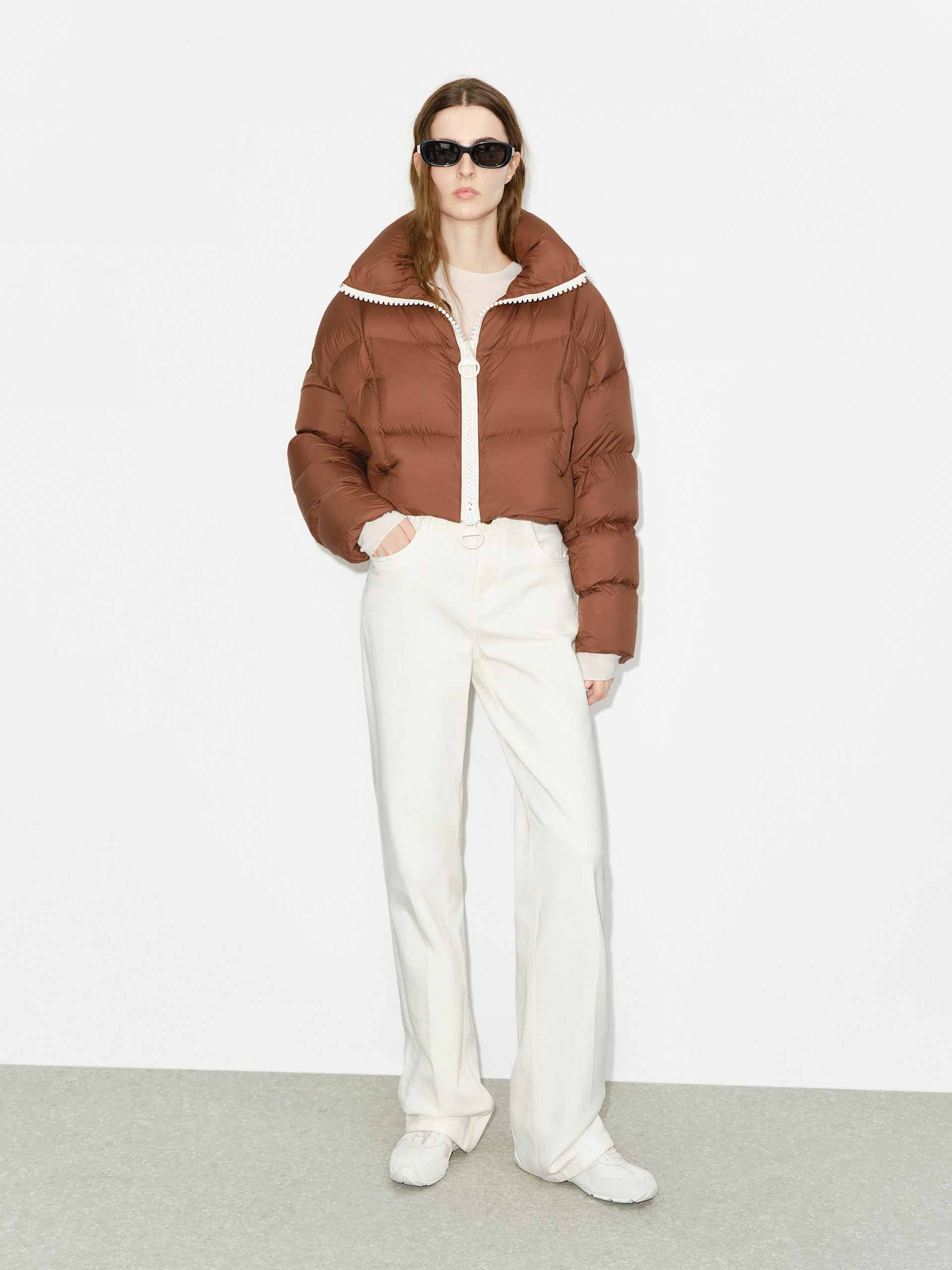 Designed for the cooler months ahead, this liner jacket is filled with recycled down and feather padding. It features a side pocket and a funnel neck for extra protection. With a unique short and contrast zipper design, it effortlessly combines fashion and practicality.