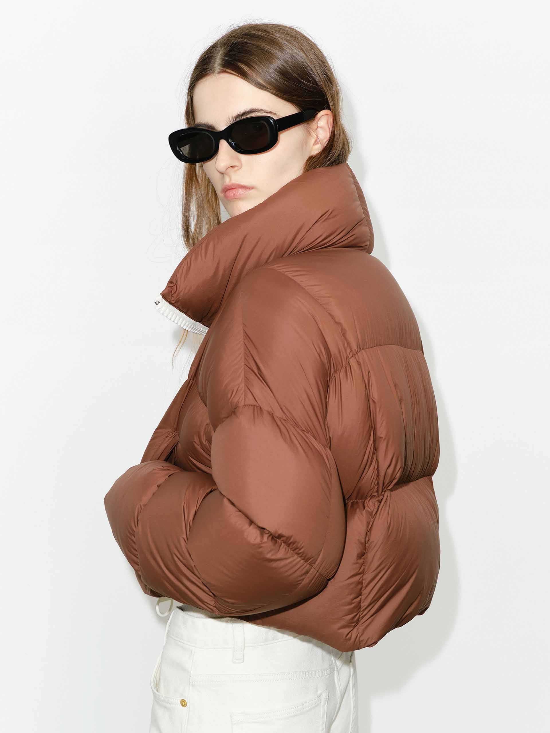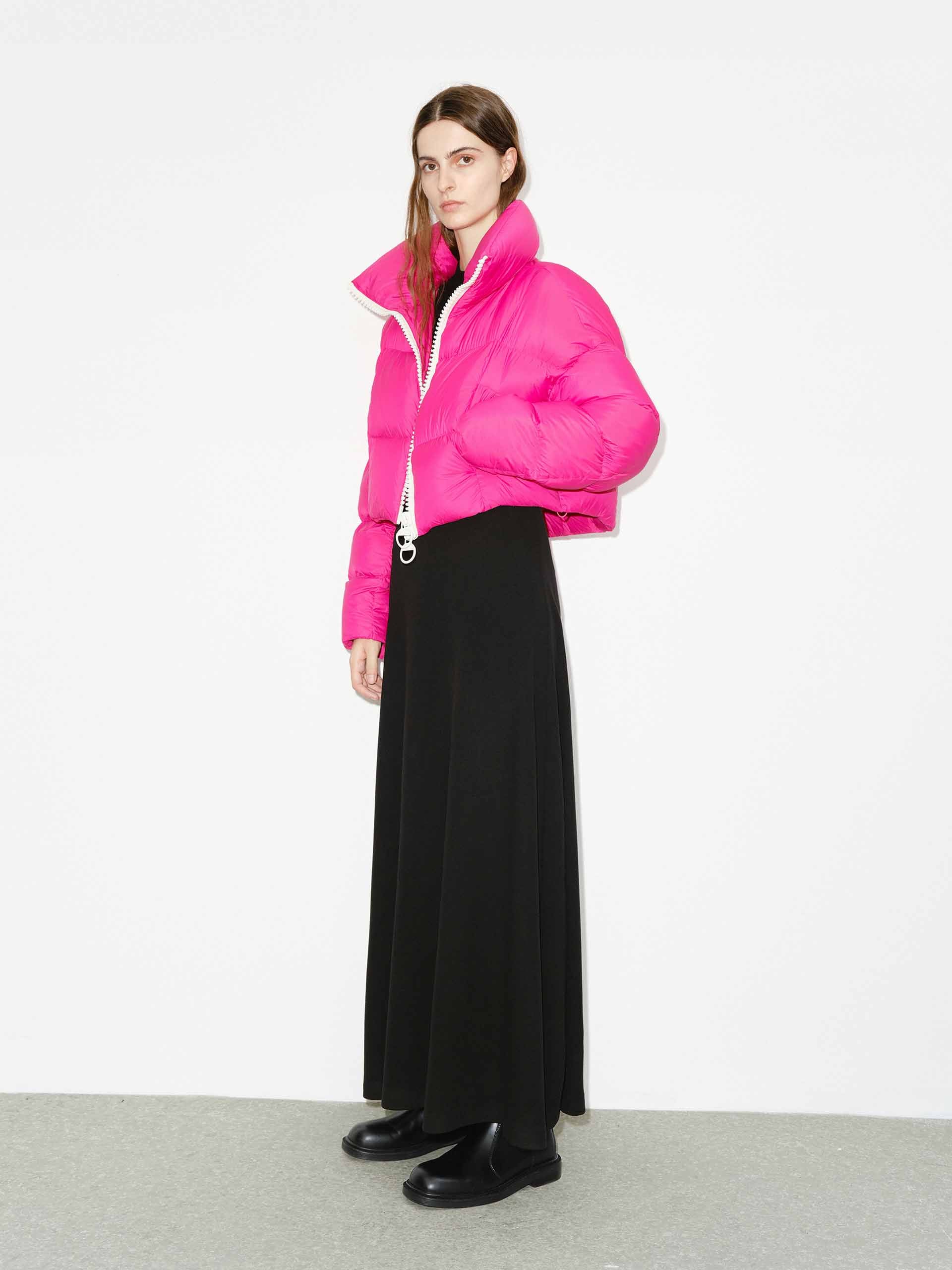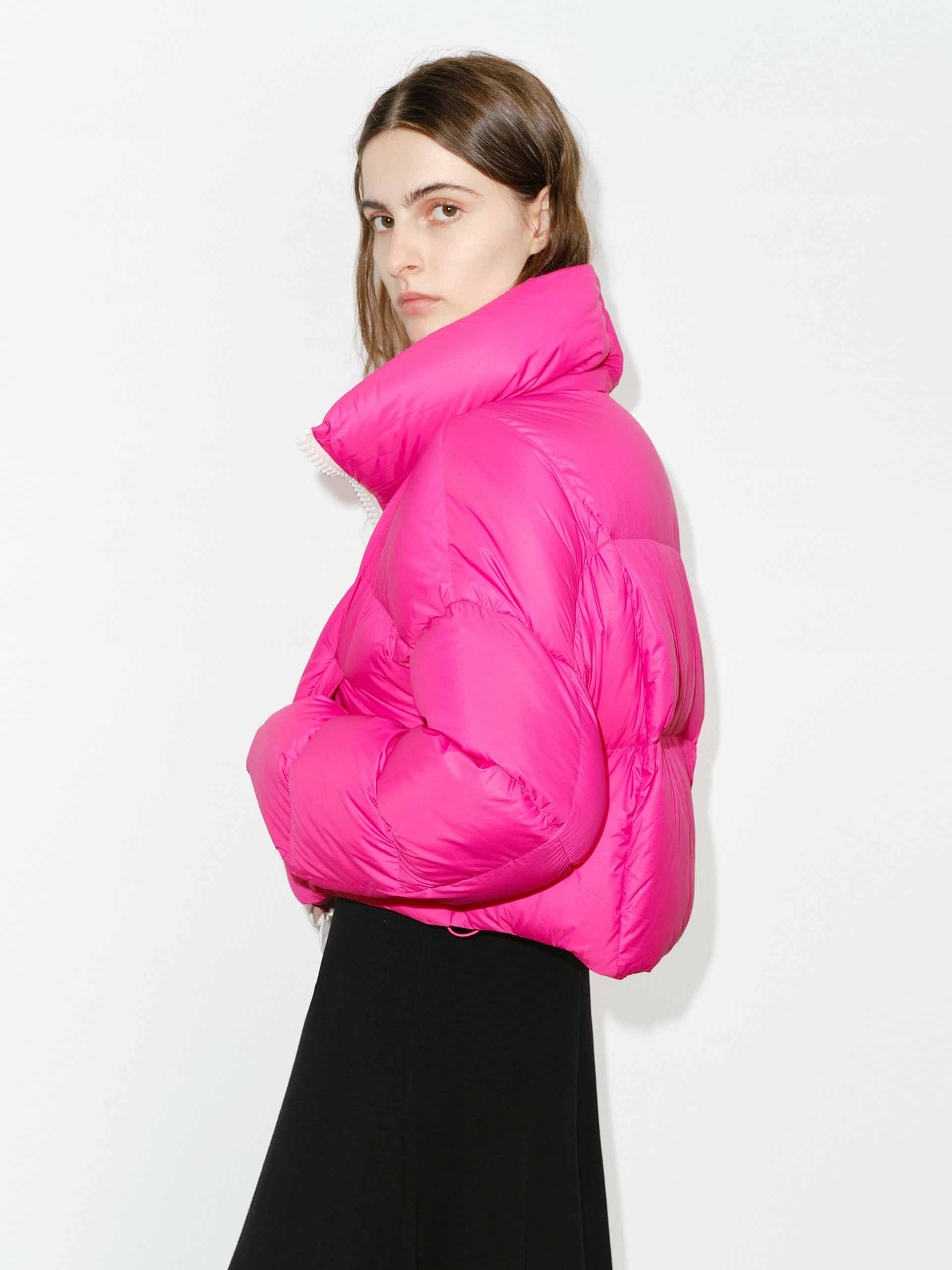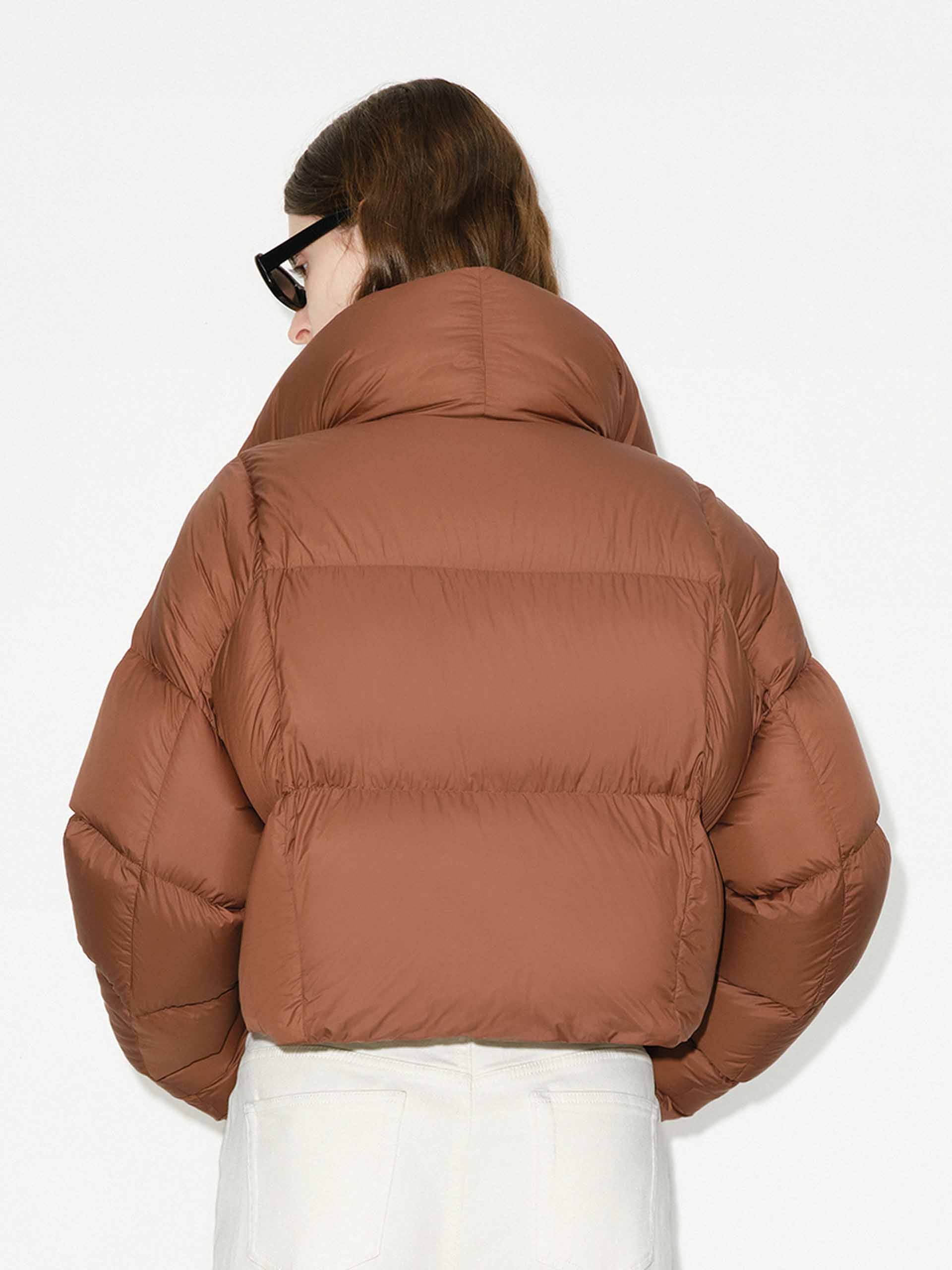 Designed for the cooler months ahead, this liner jacket is filled with recycled down and feather padding. It features a side pocket and a funnel neck for extra protection. With a unique short and contrast zipper design, it effortlessly combines fashion and practicality.