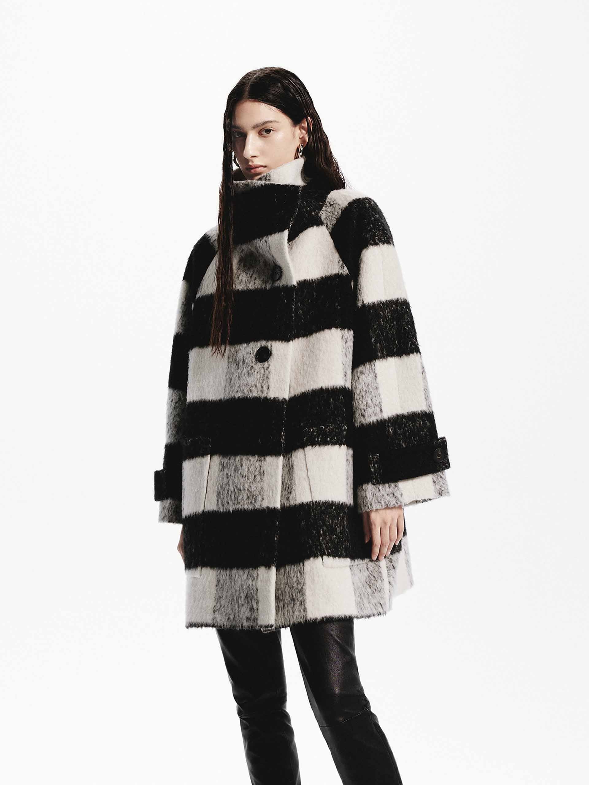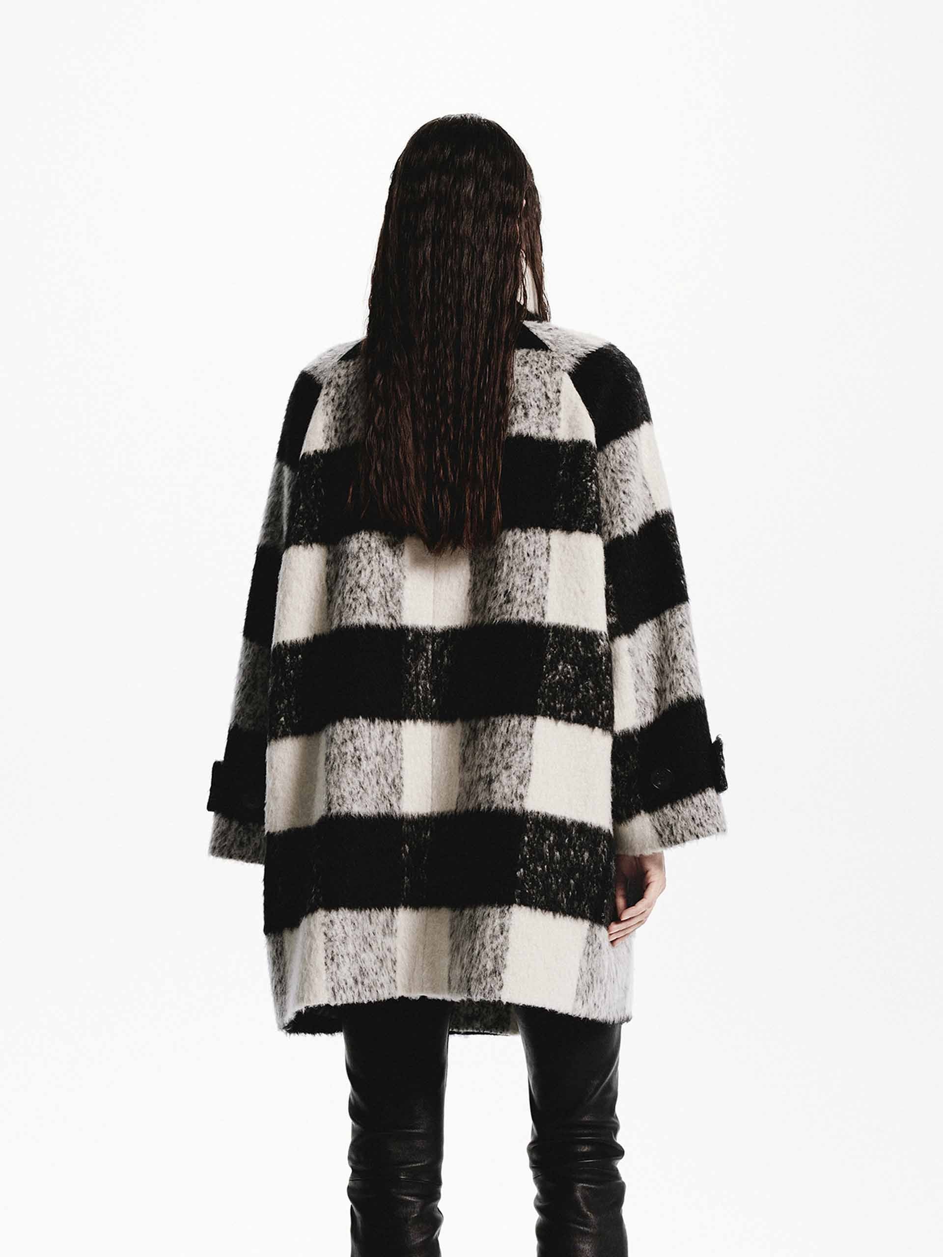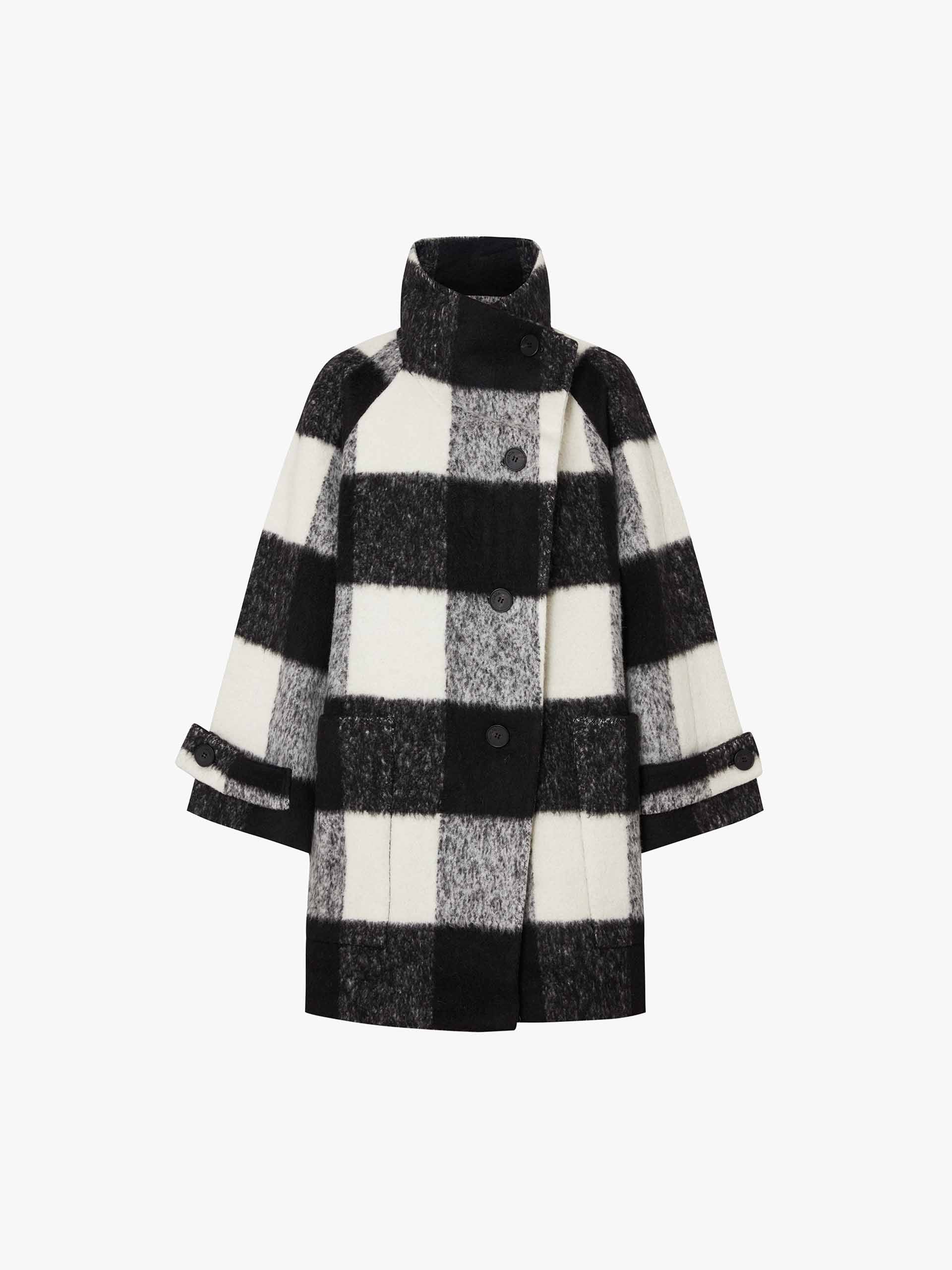This coat is a contemporary take on traditional tailoring, featuring a checked pattern and an oversized silhouette. It is made from a wool blend with hints of alpaca, which adds softness and warmth. Designed with front patch pockets, a button closure, and a funnel neck for added style and functionality to ensure it will see you through countless cold spells.