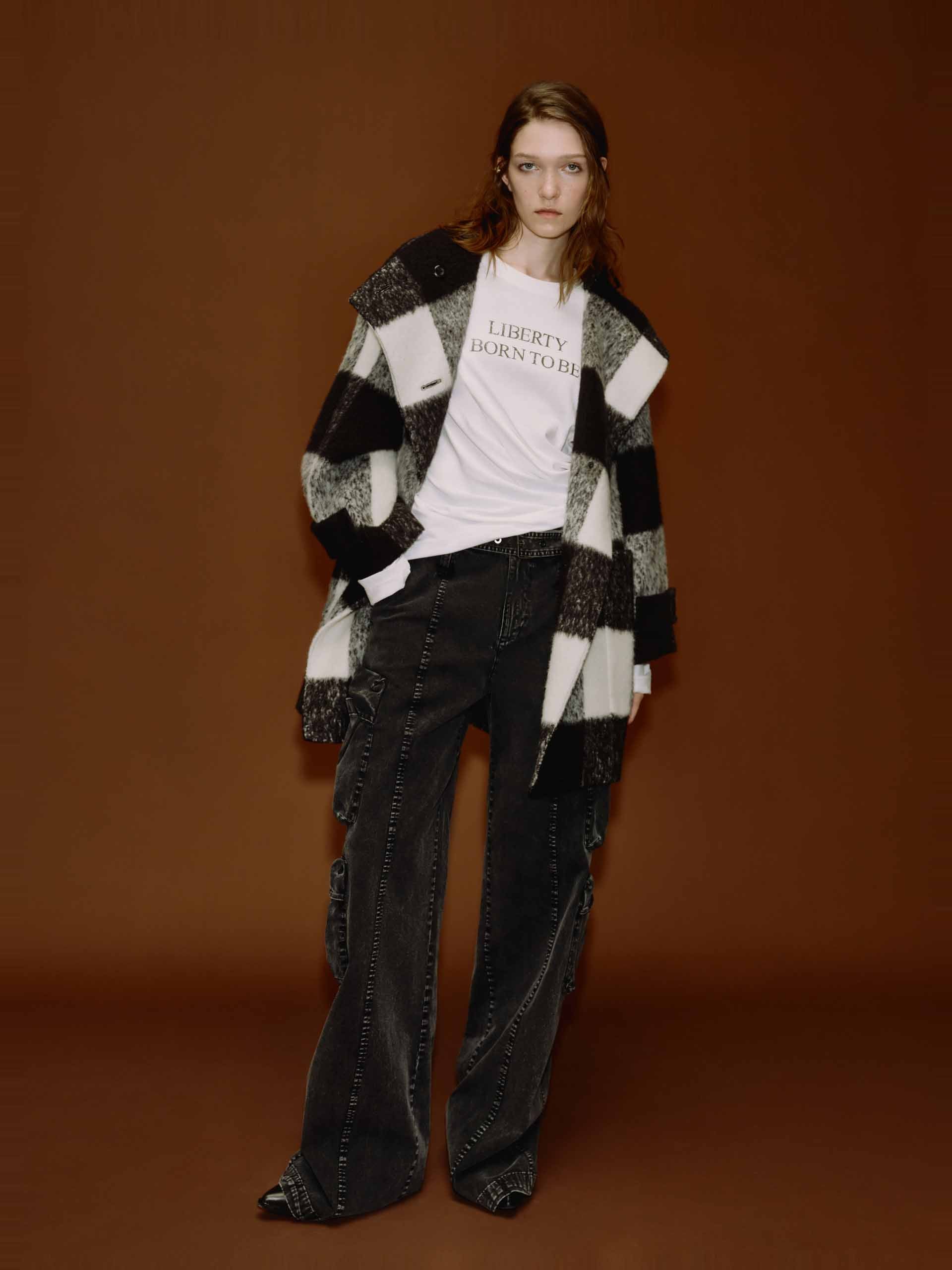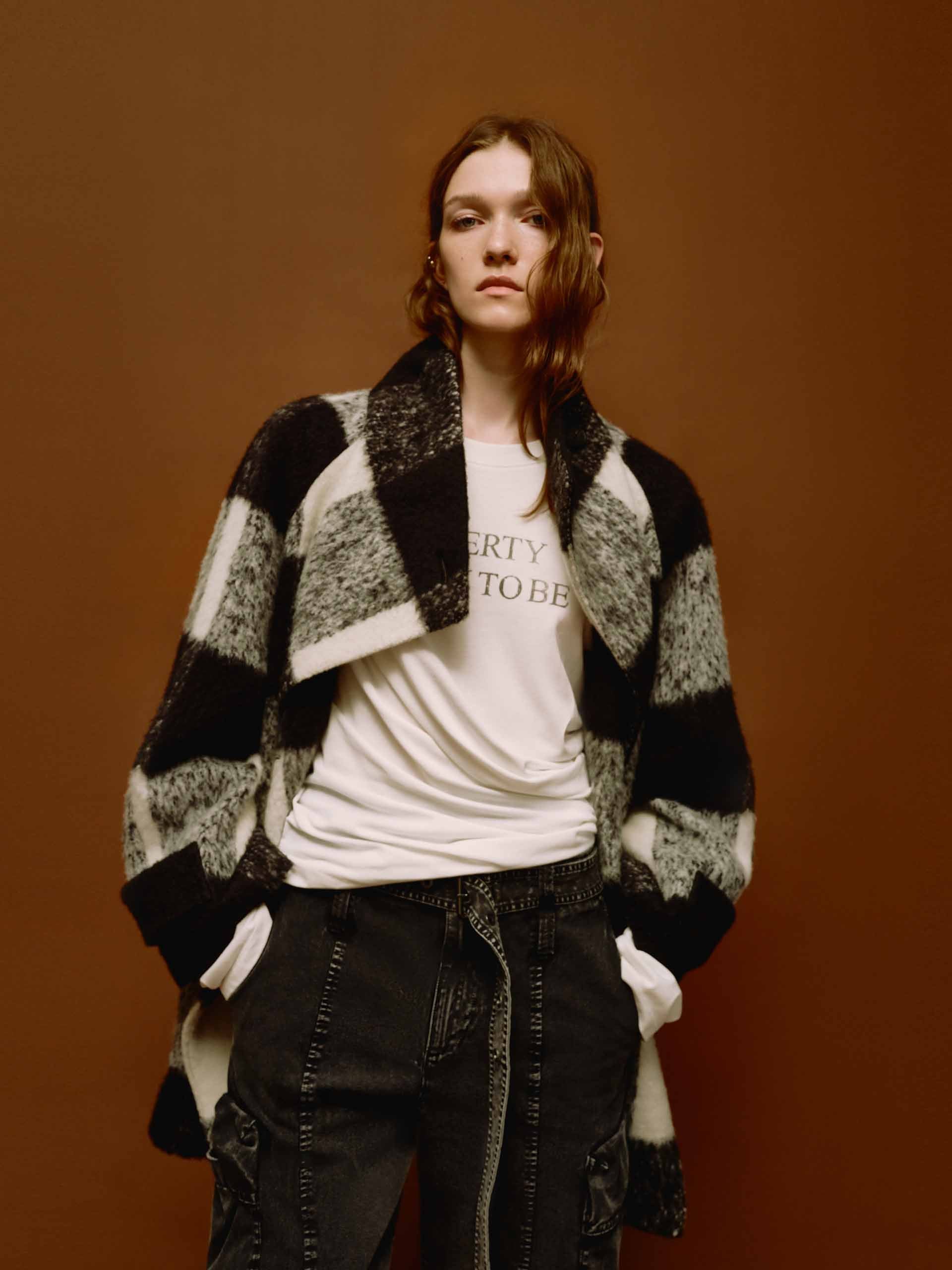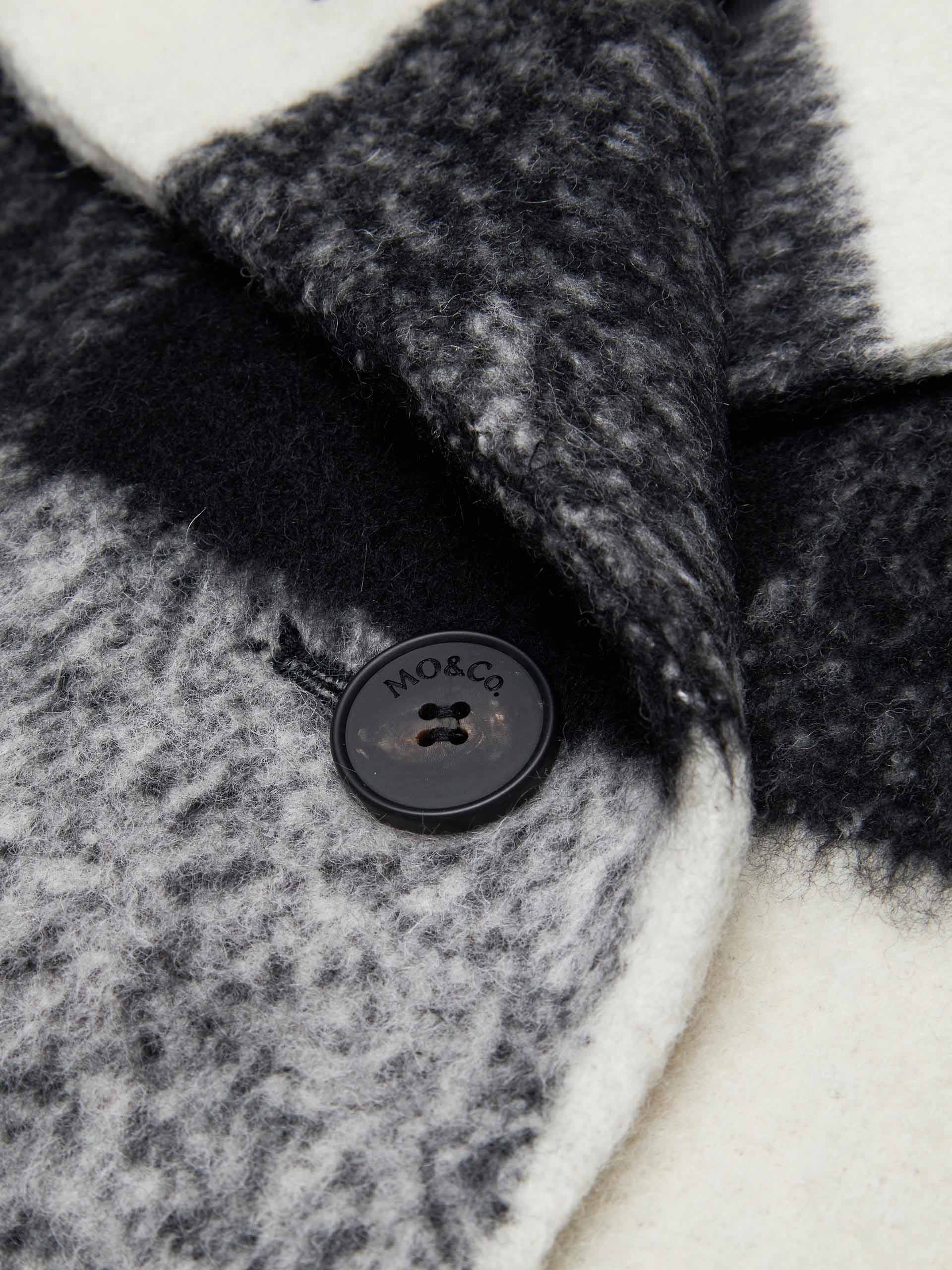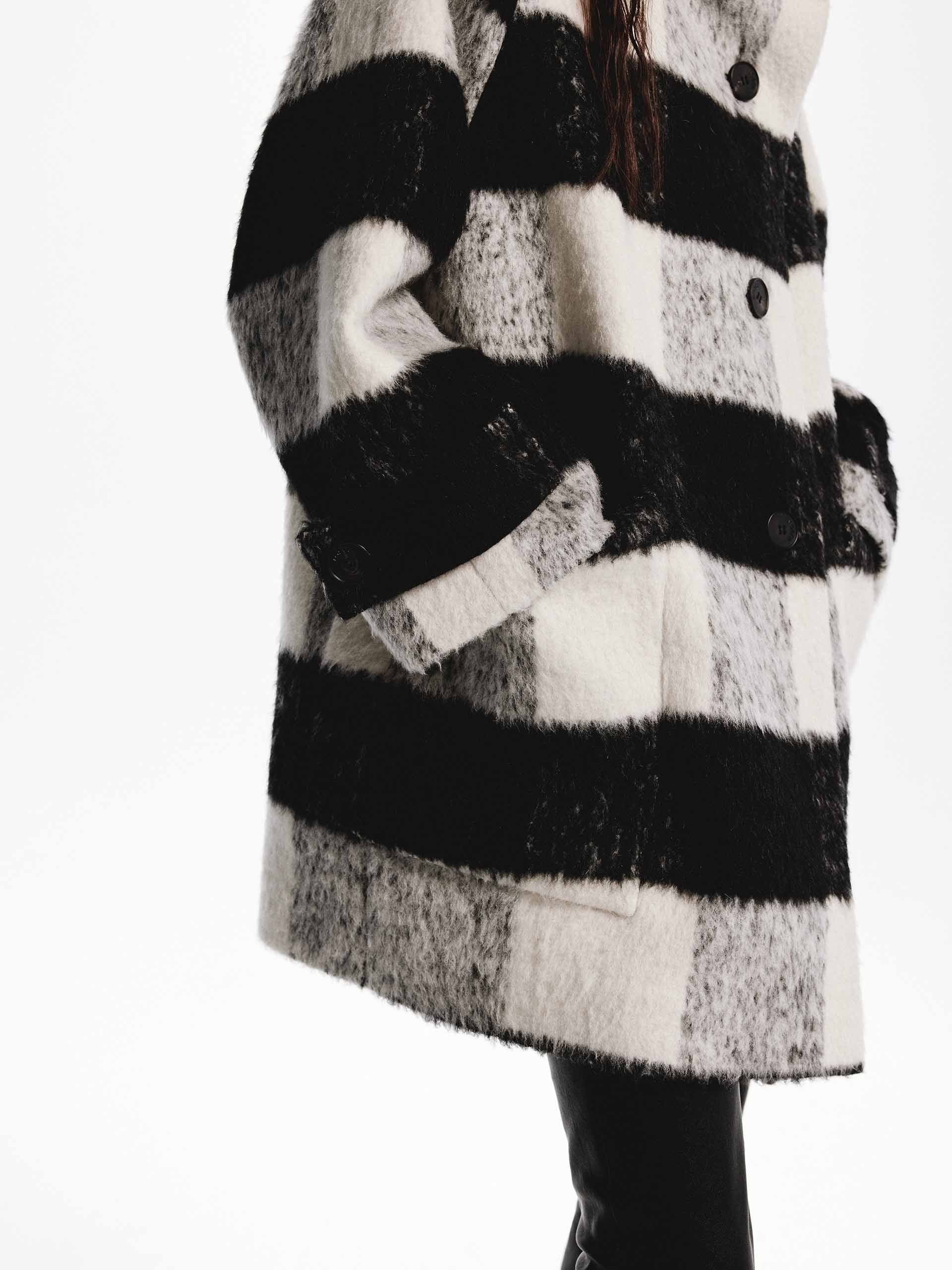 This coat is a contemporary take on traditional tailoring, featuring a checked pattern and an oversized silhouette. It is made from a wool blend with hints of alpaca, which adds softness and warmth. Designed with front patch pockets, a button closure, and a funnel neck for added style and functionality to ensure it will see you through countless cold spells.