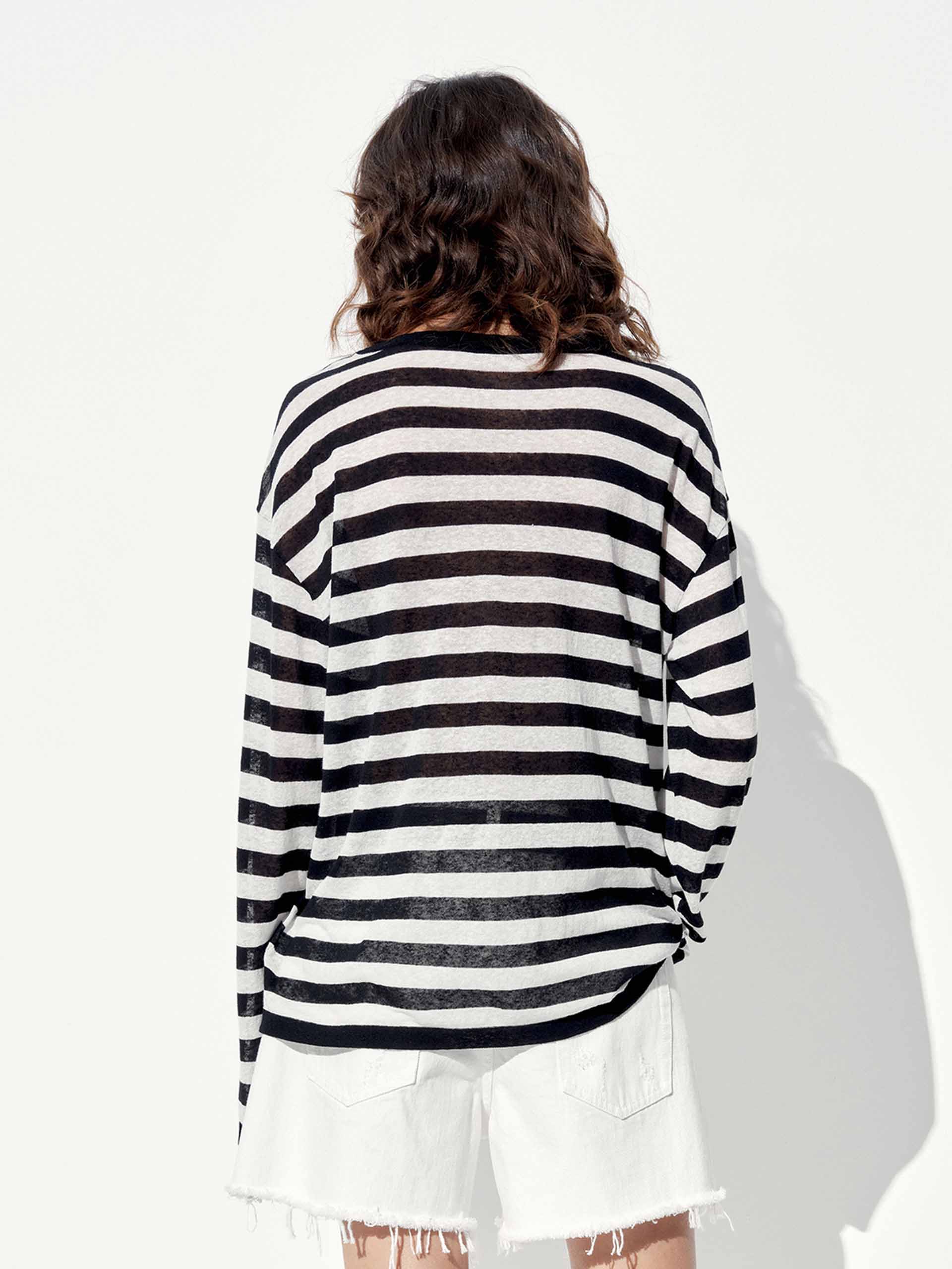 Introducing our cozy and stylish sweater, made from a soft and comfortable blend of cotton and linen for a lightweight, breathable feel. Designed with a relaxed fit, this sweater features drop shoulders, a classic crew neck, and timeless black and white stripes for an effortlessly chic look. Perfect for transitioning between spring and layering.