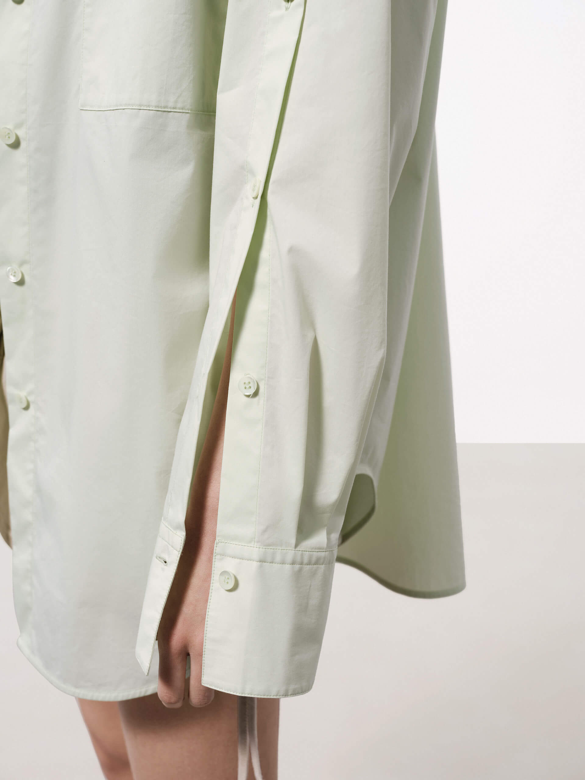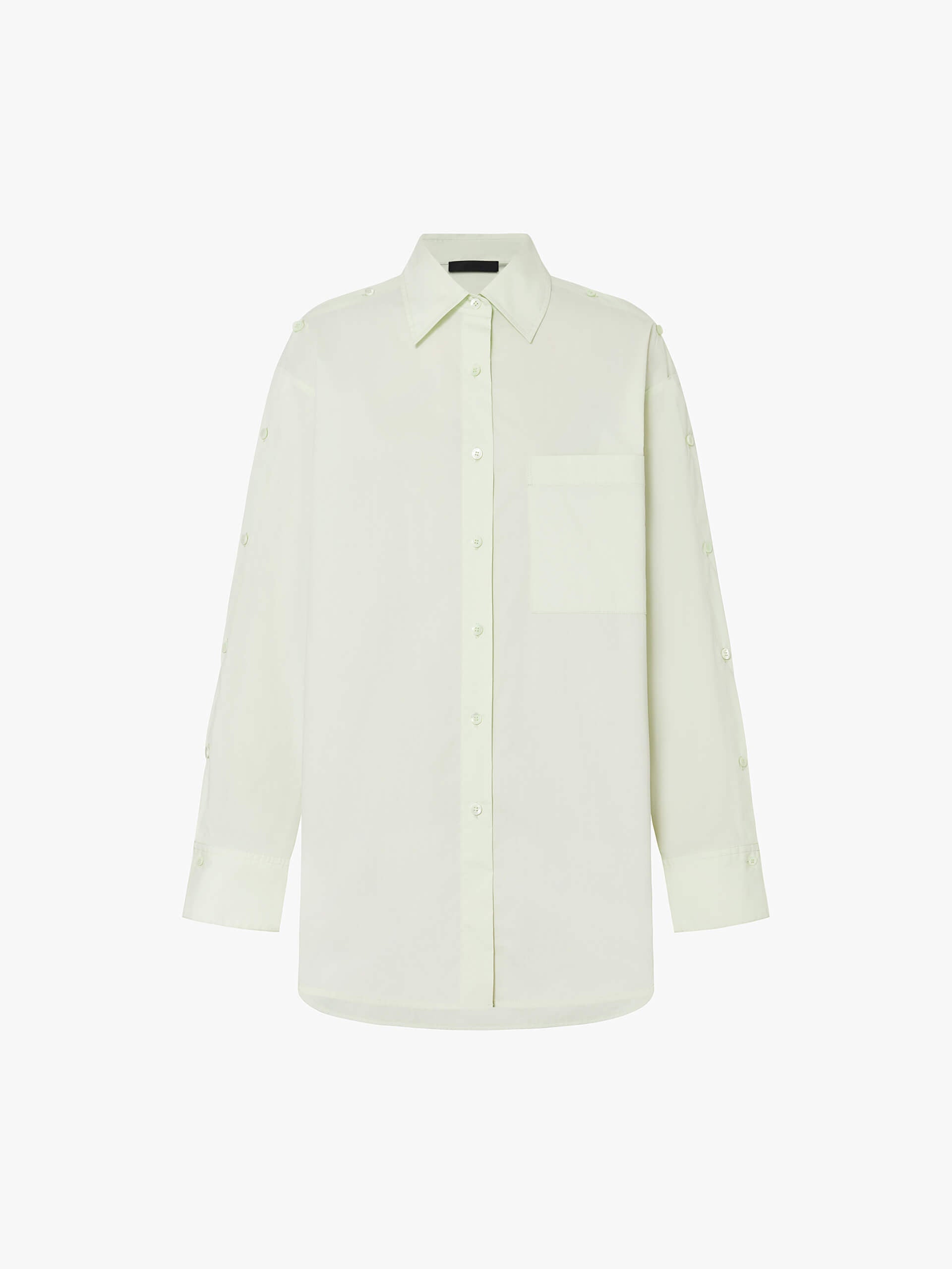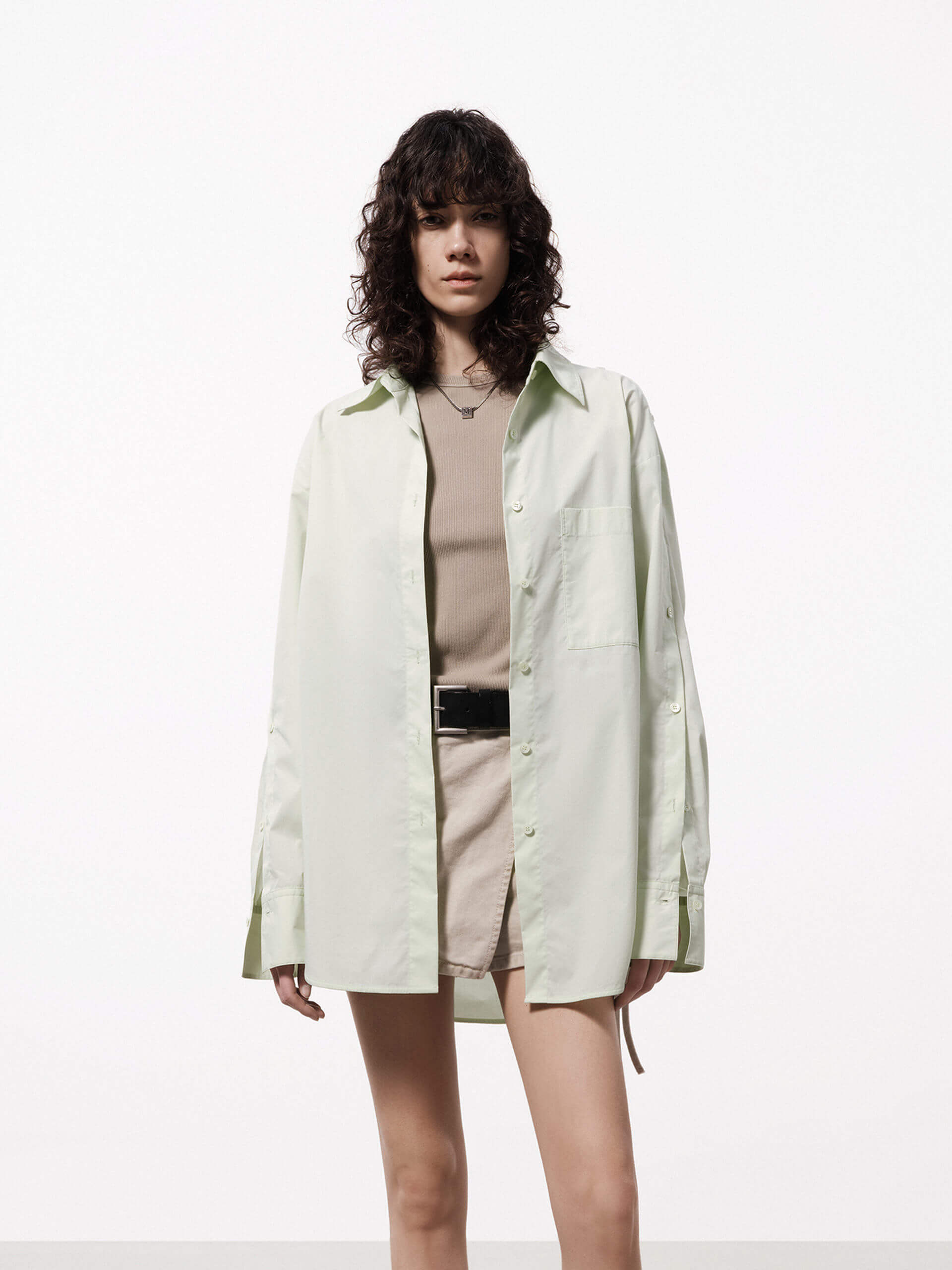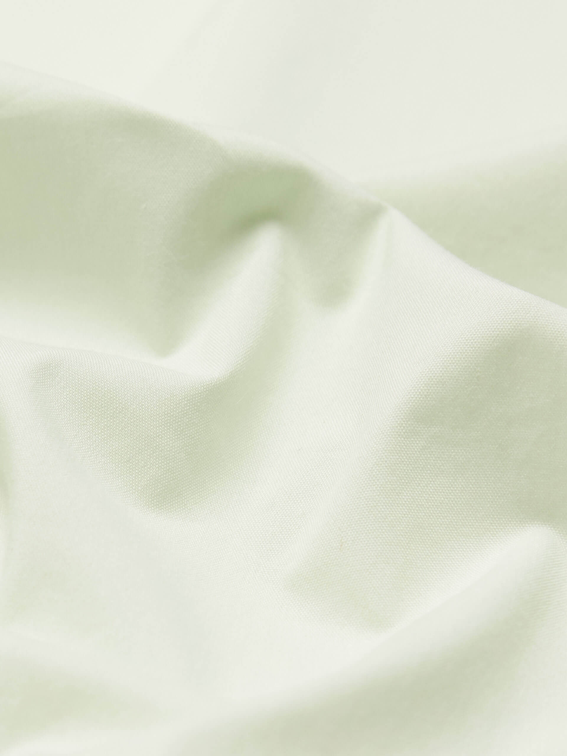 This shirt is a classic style made from a comfortable cotton blend fabric. It features long sleeves with button details on the cuffs, adding a touch of sophistication. The collar is a traditional point collar, and there is a chest pocket for added convenience. It has a mint and white hue, creating a fresh and clean look. Pair well with khaki pants or dark-wash denim for a casual look.