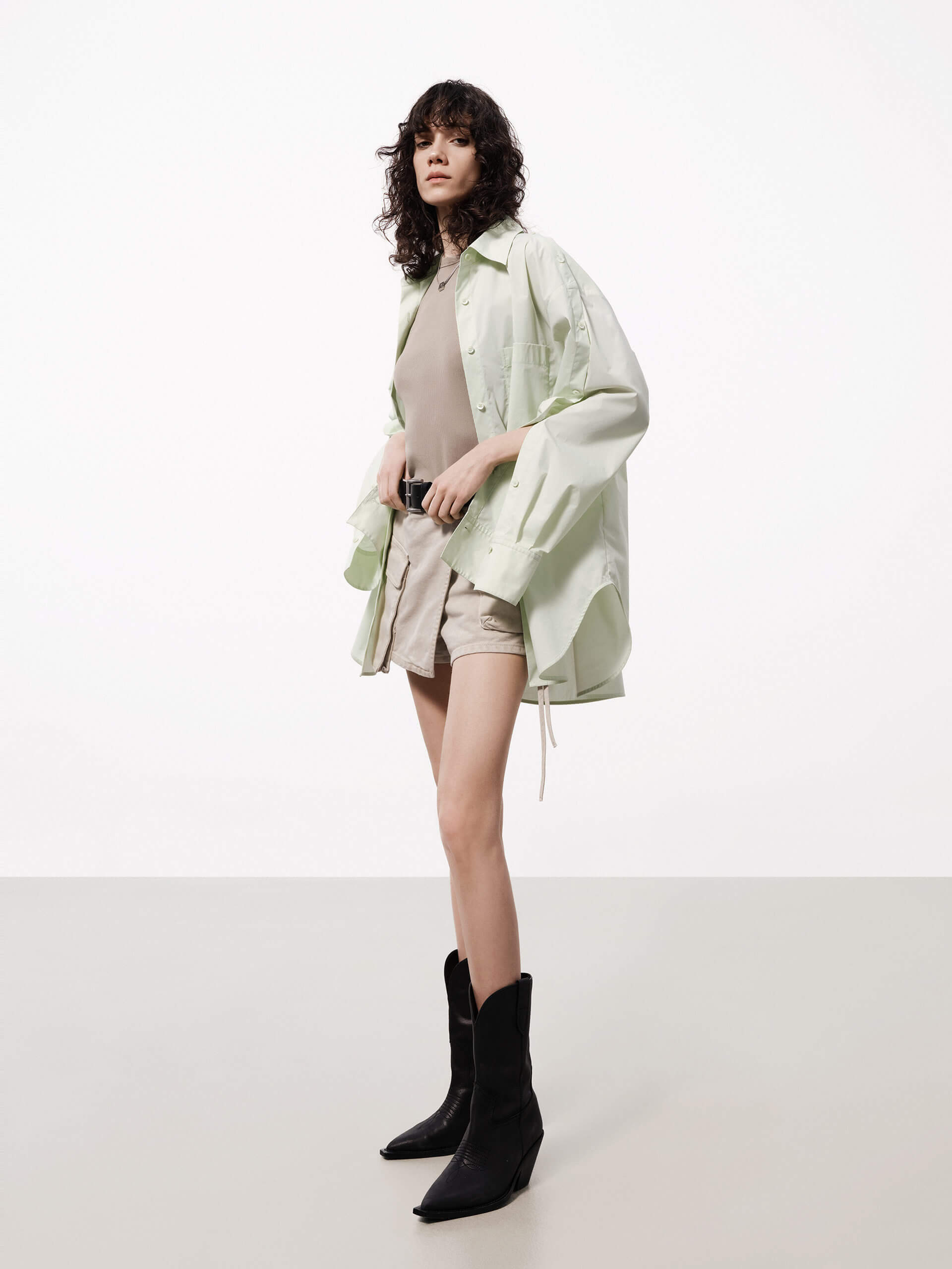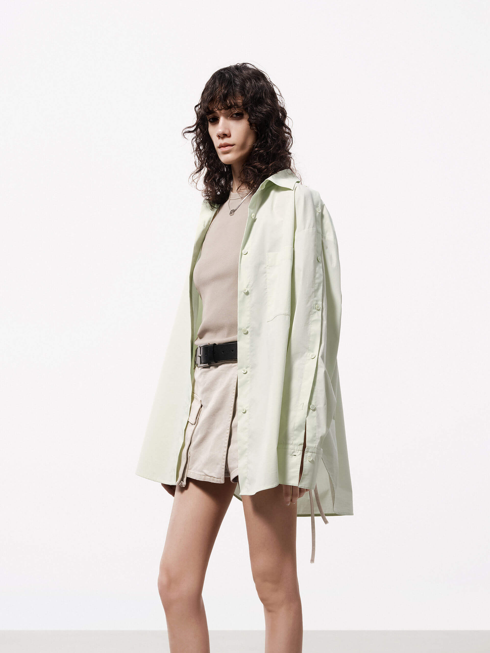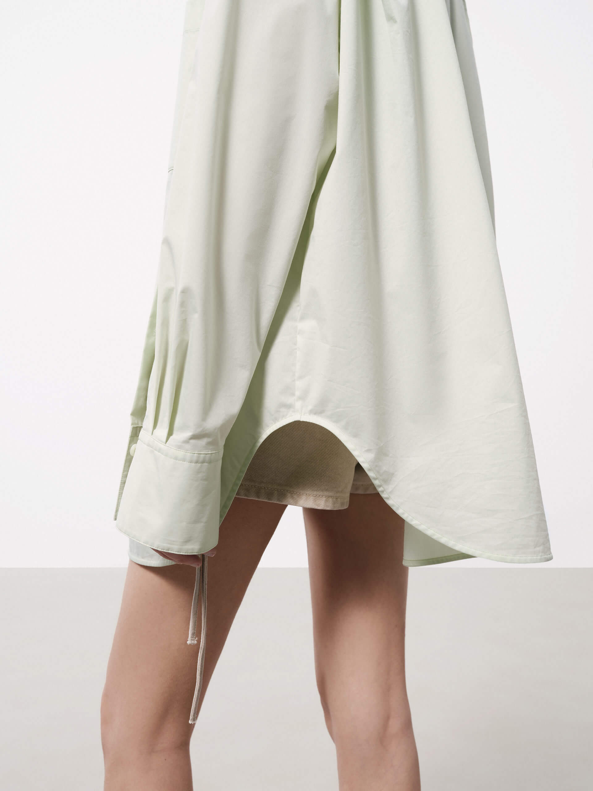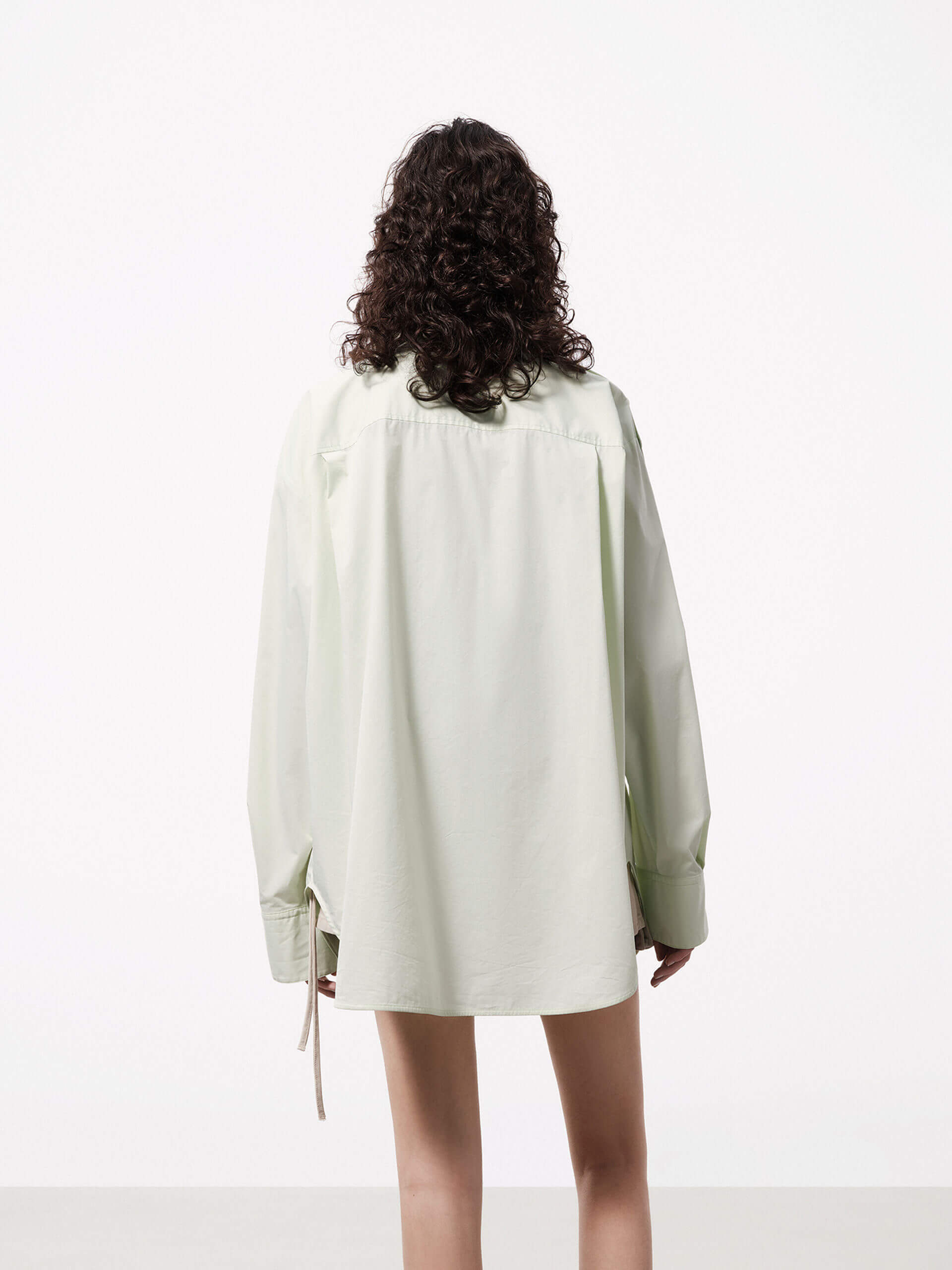 This shirt is a classic style made from a comfortable cotton blend fabric. It features long sleeves with button details on the cuffs, adding a touch of sophistication. The collar is a traditional point collar, and there is a chest pocket for added convenience. It has a mint and white hue, creating a fresh and clean look. Pair well with khaki pants or dark-wash denim for a casual look.