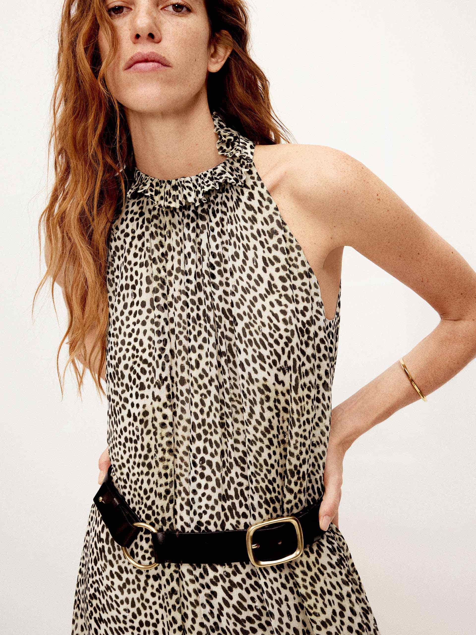 - Sophisticated pleated hem and halter neck