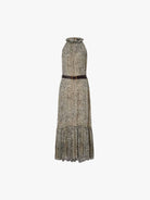 This elegant dress is crafted from luxuriously soft silk, offering a delicate and comfortable feel against the skin. It features a graceful, flowy maxi silhouette that creates effortless movement, complete with an included belt to define the waist. Sophisticated details include a pleated hem for added texture and a chic halter neckline.