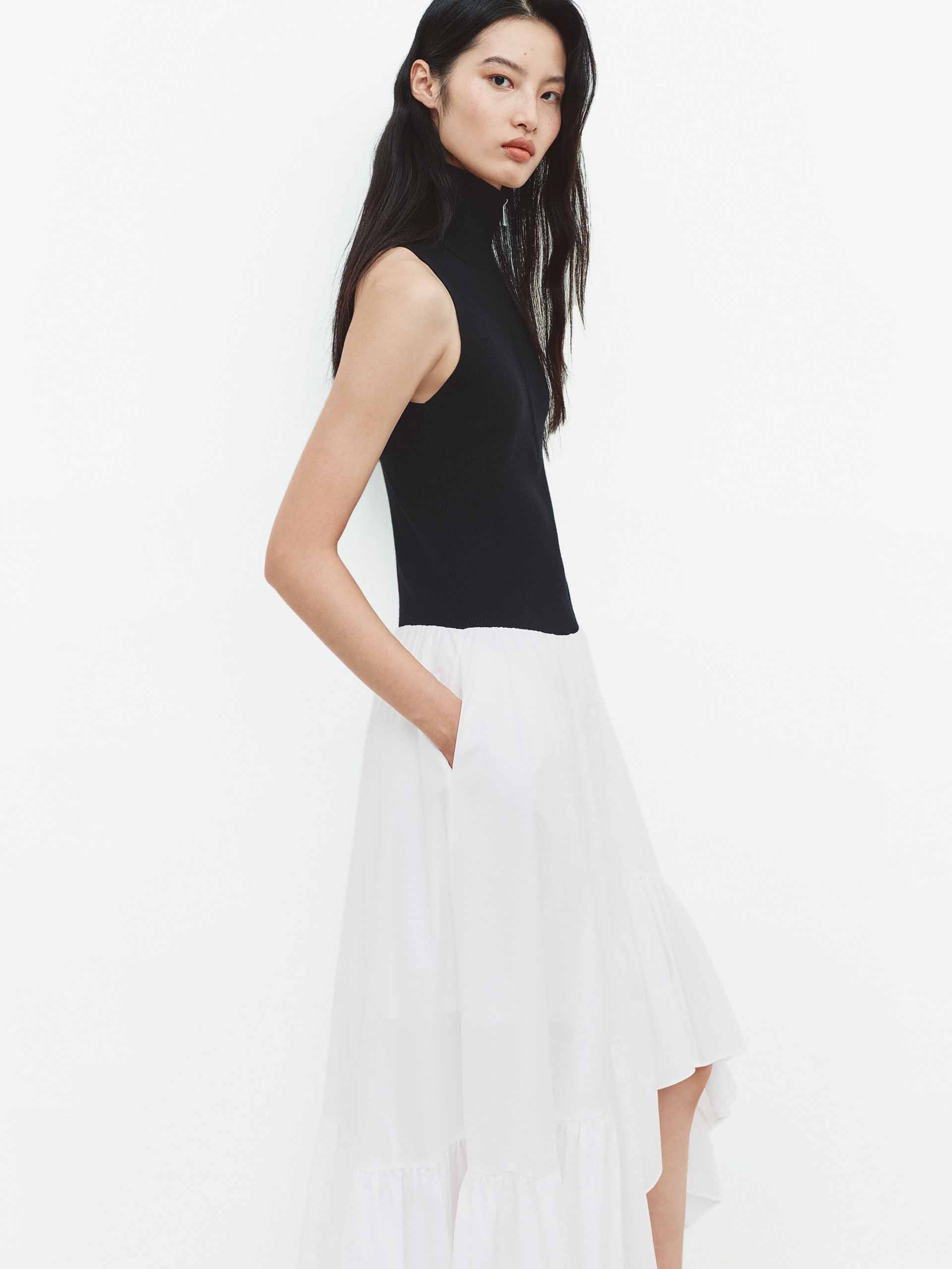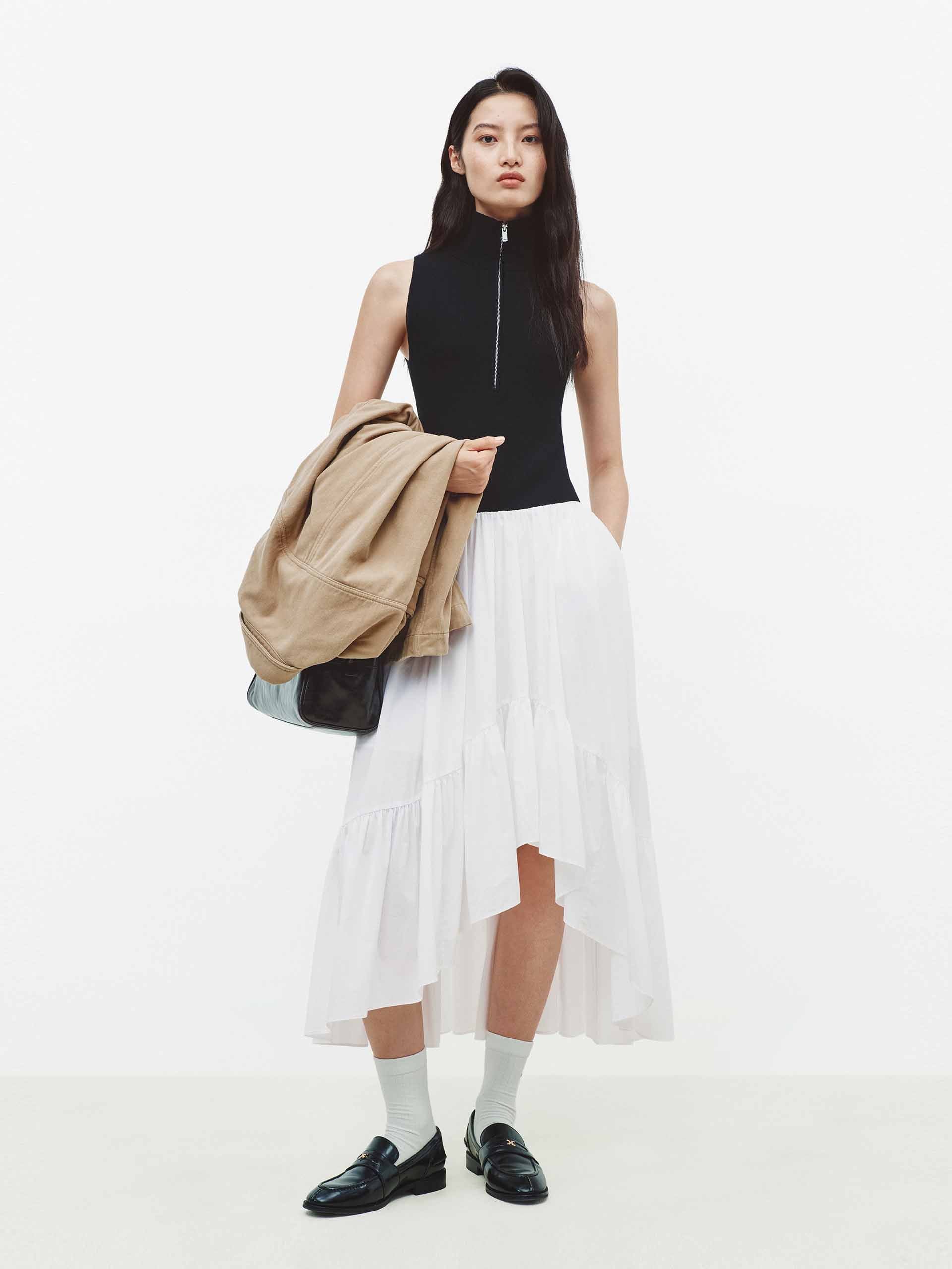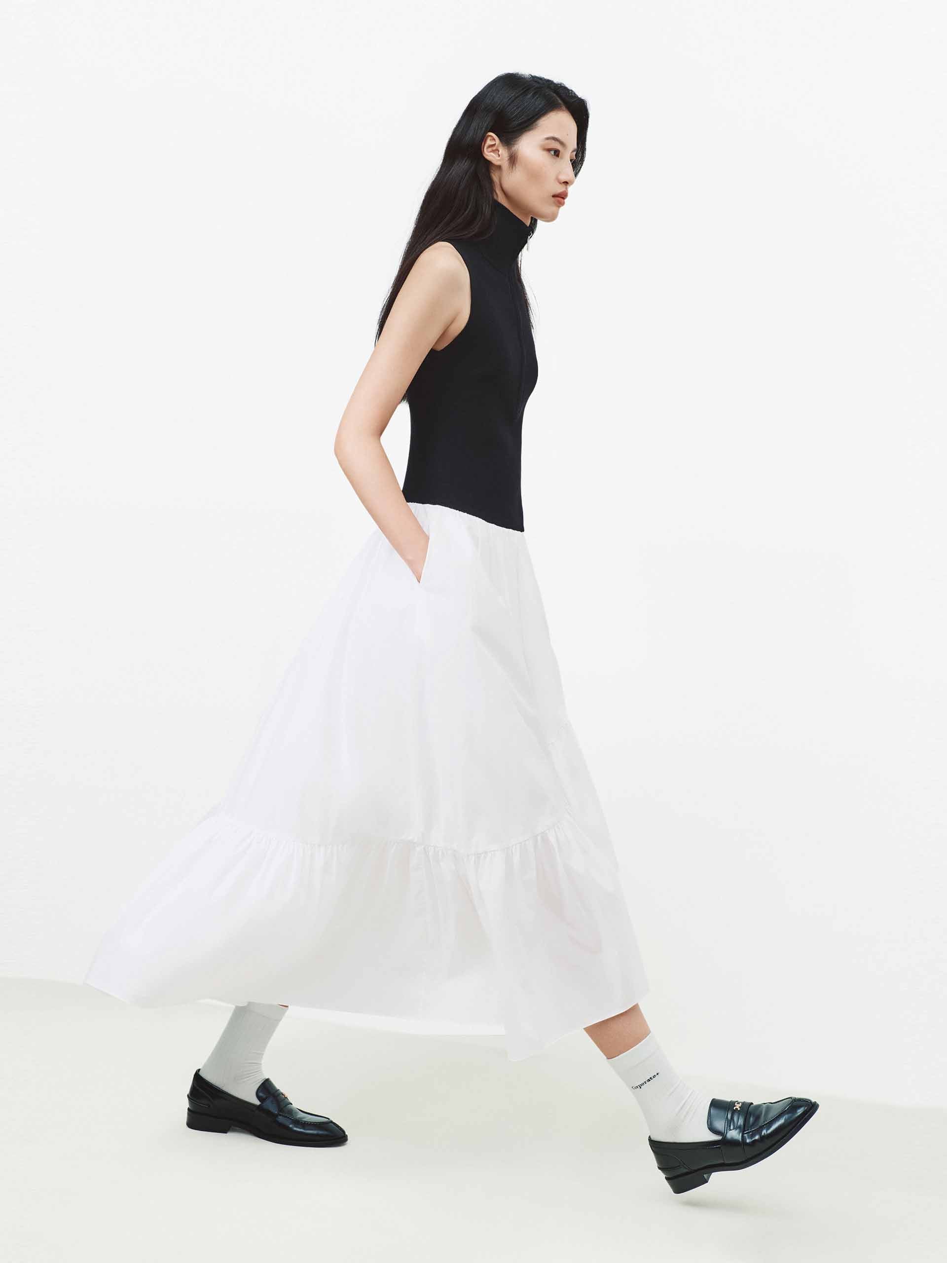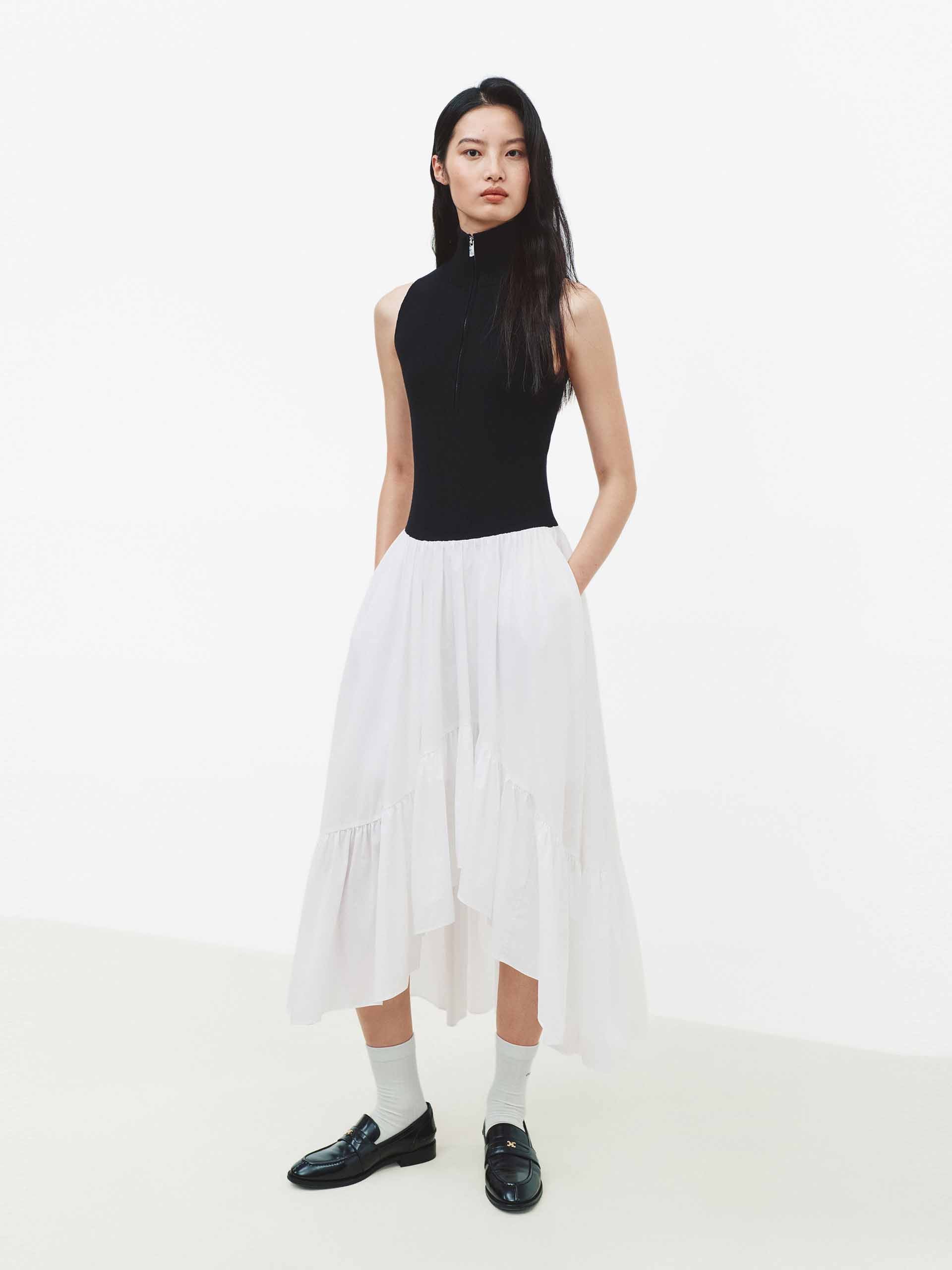 This dress features a faux two-piece design for a layered visual effect. The asymmetrical hem and half-open zipper add modern sophistication to the clean silhouette, while the hem pleated patchwork enriches the texture and detail. Perfect for dates or artistic occasions, it pairs effortlessly with minimalist footwear to create a structured yet personal style.