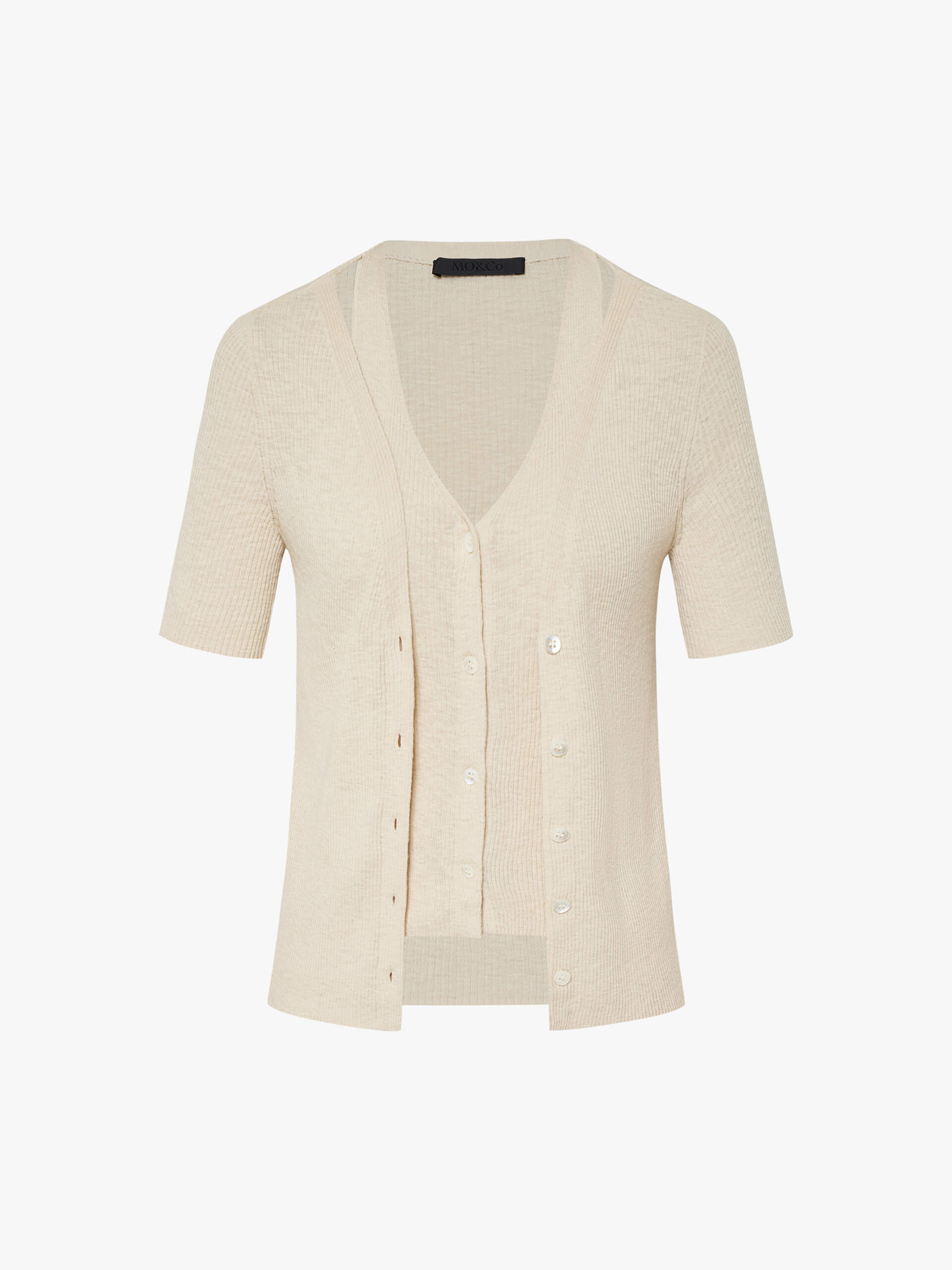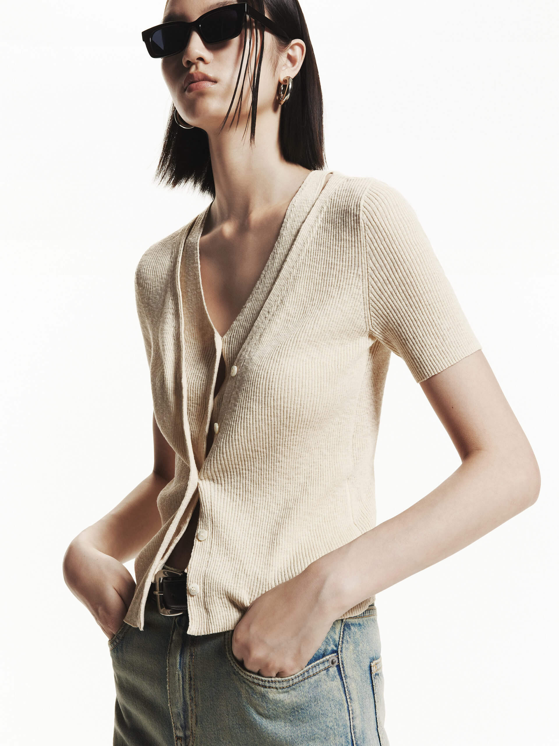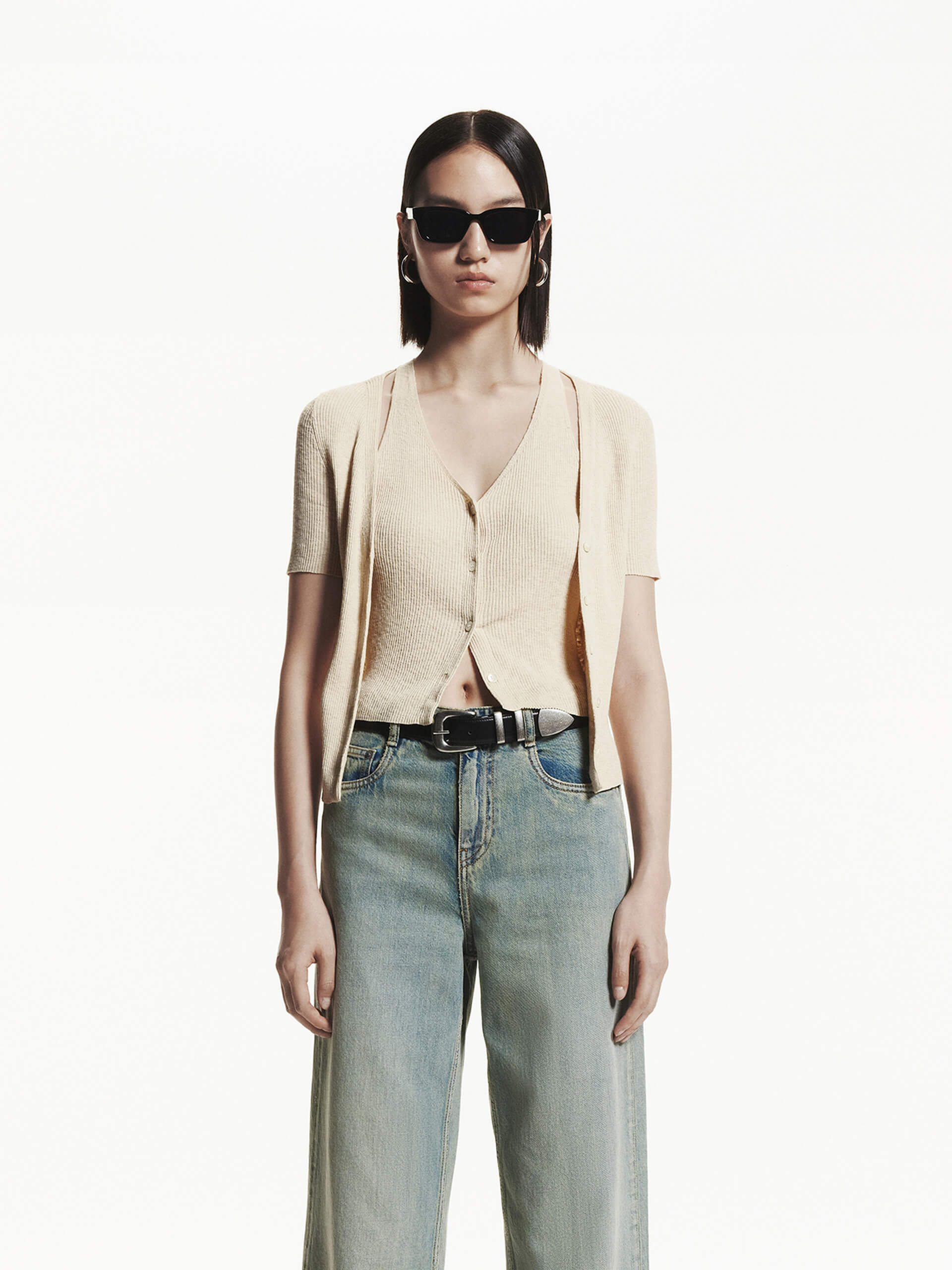 This cardigan is crafted from cotton, linen, and other fibers. The slim fit and ribbed knit add stylish texture, while the short sleeves make it perfect for layering. Pair it with high-waisted jeans for a chic and versatile look. Expertly designed for a flattering fit and comfortable wear.