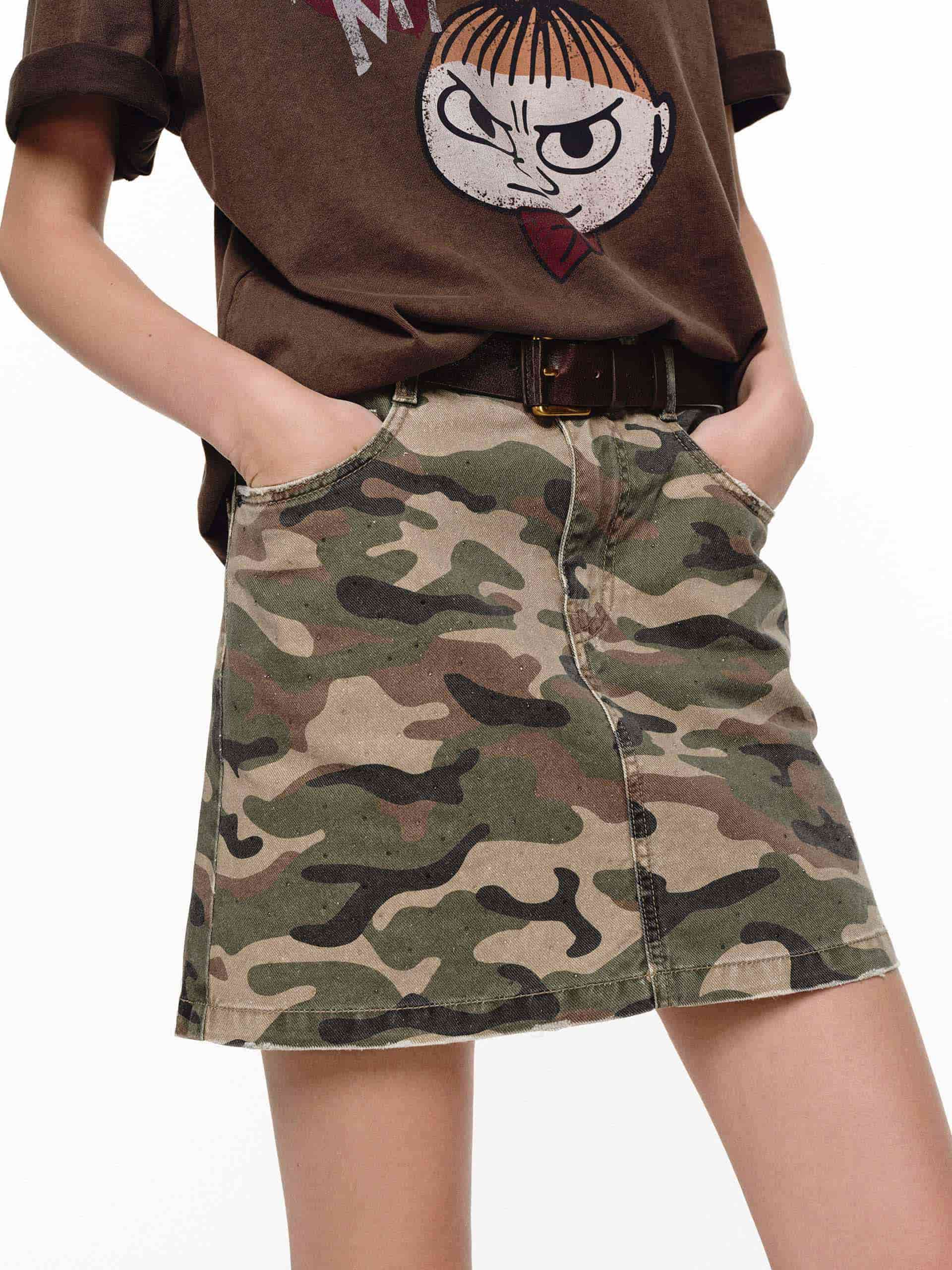 This camo skirt with a workwear vibe features rhinestones scattered casually across the fabric, their subtle sparkle adding a touch of rock-and-roll edge for a uniquely personal style in your spring and summer looks.