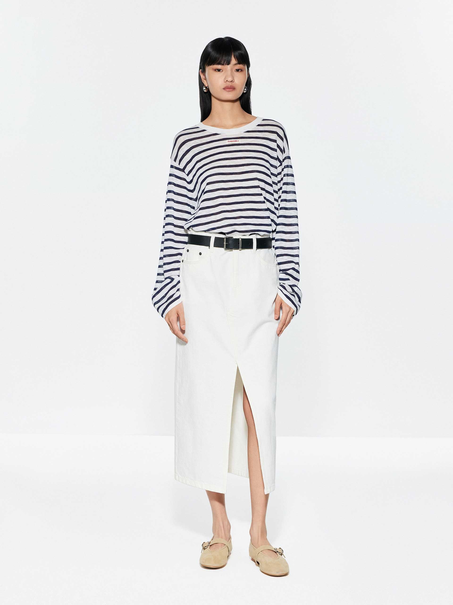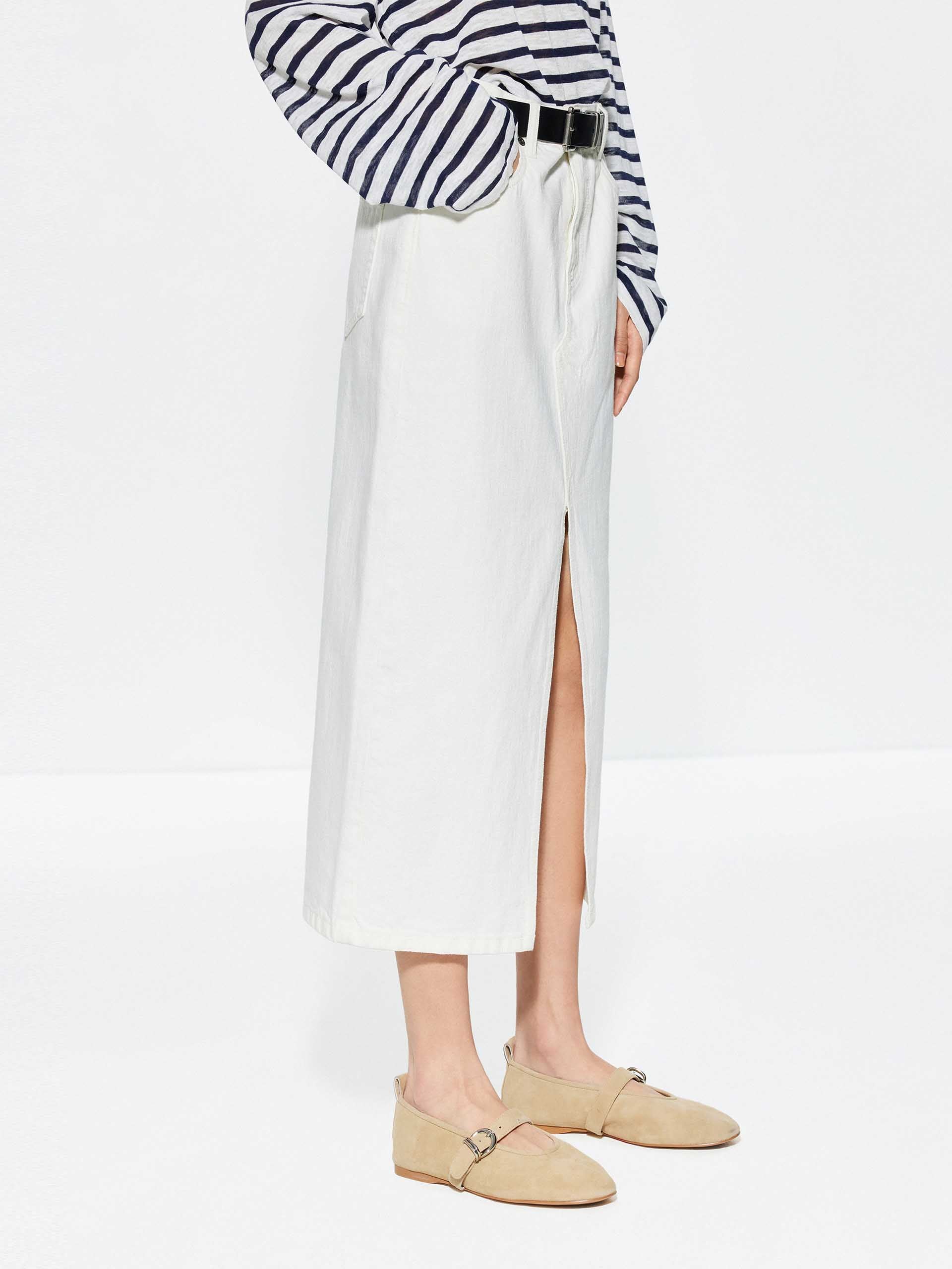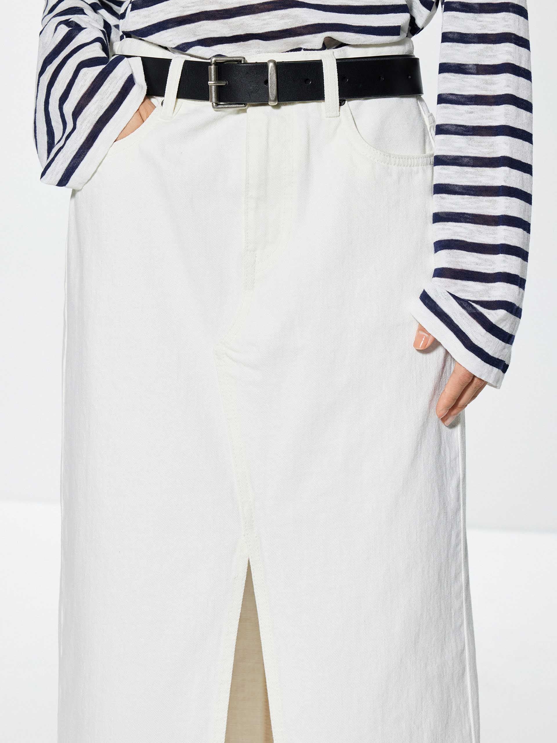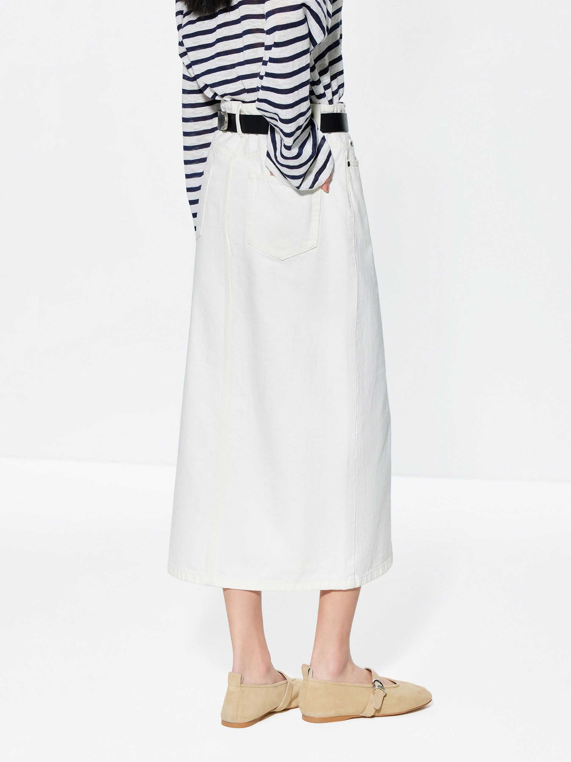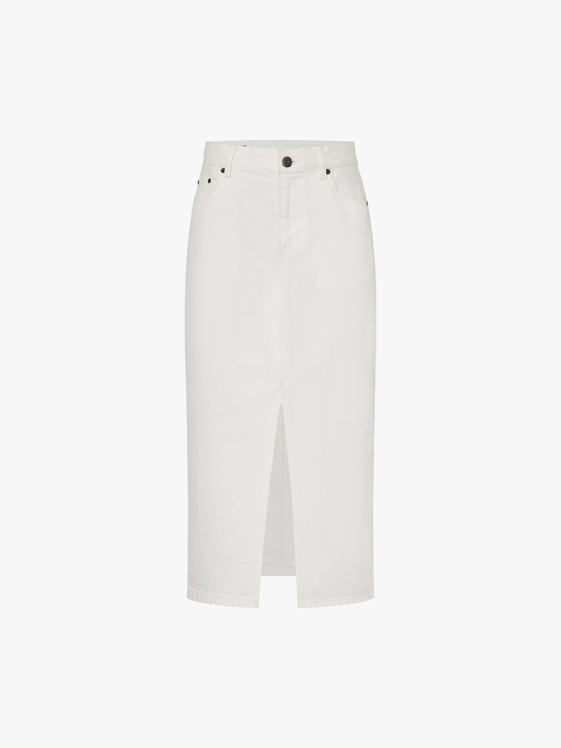 This high waist slit denim skirt features a front slit for added detail, as well as double side and back pockets for convenience. Made of 100% pure cotton, this straight cut skirt is both stylish and comfortable. Zipper and button closure add a touch of classic design.