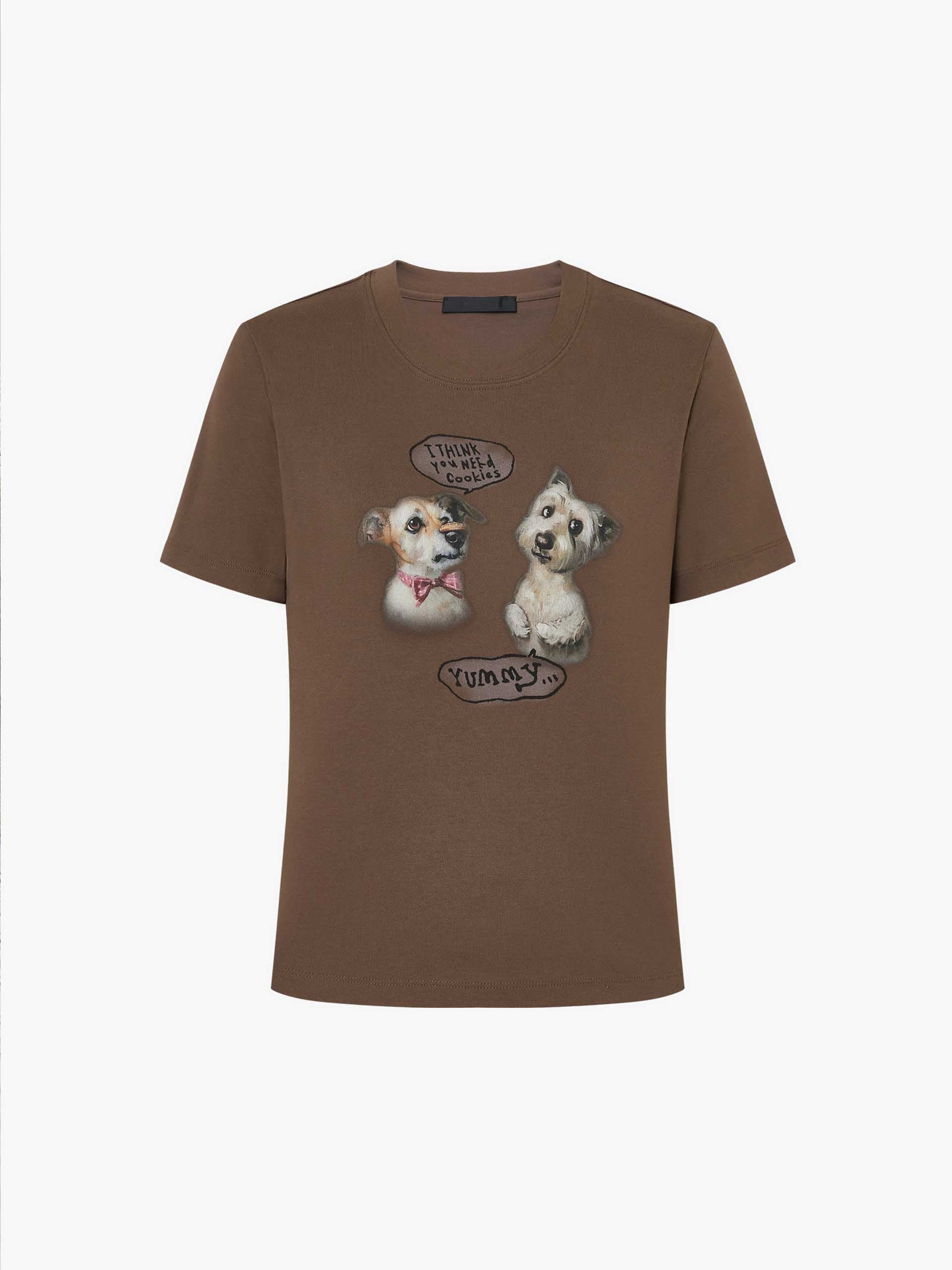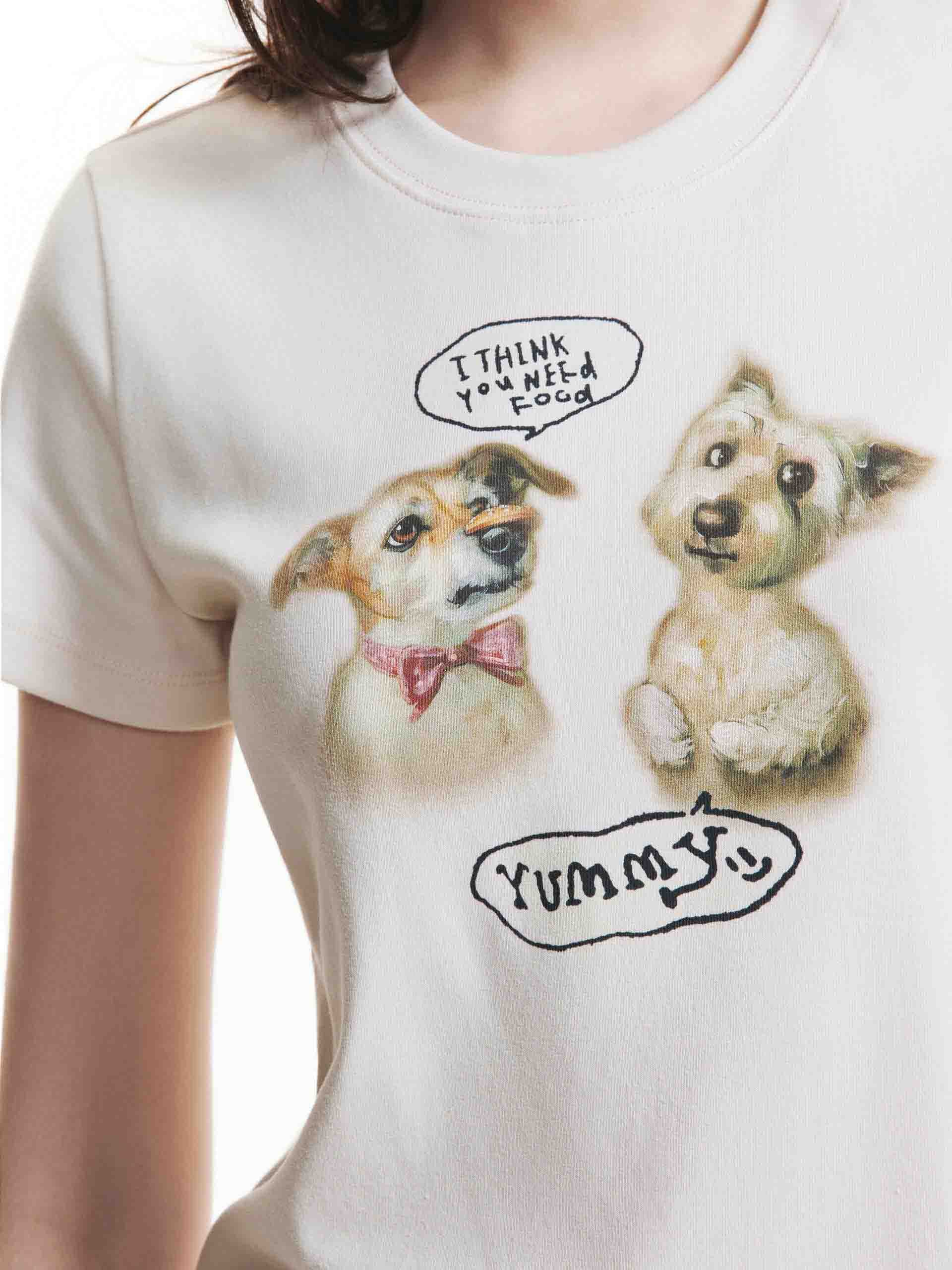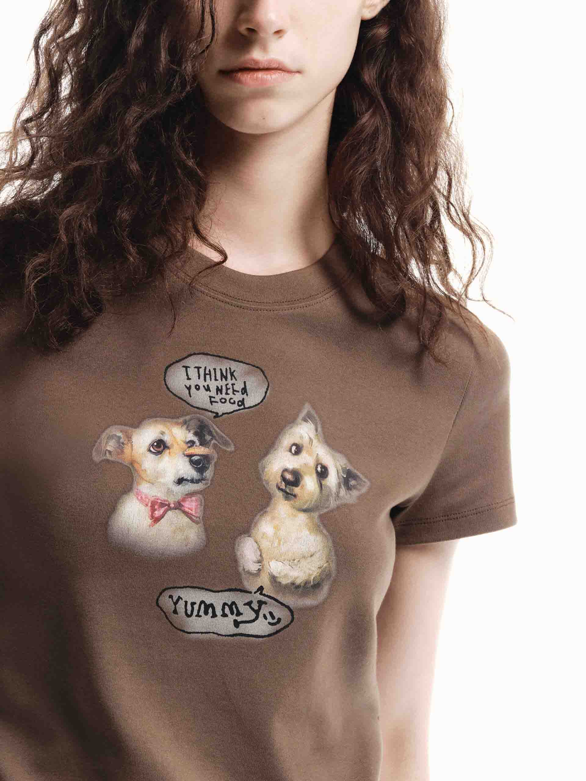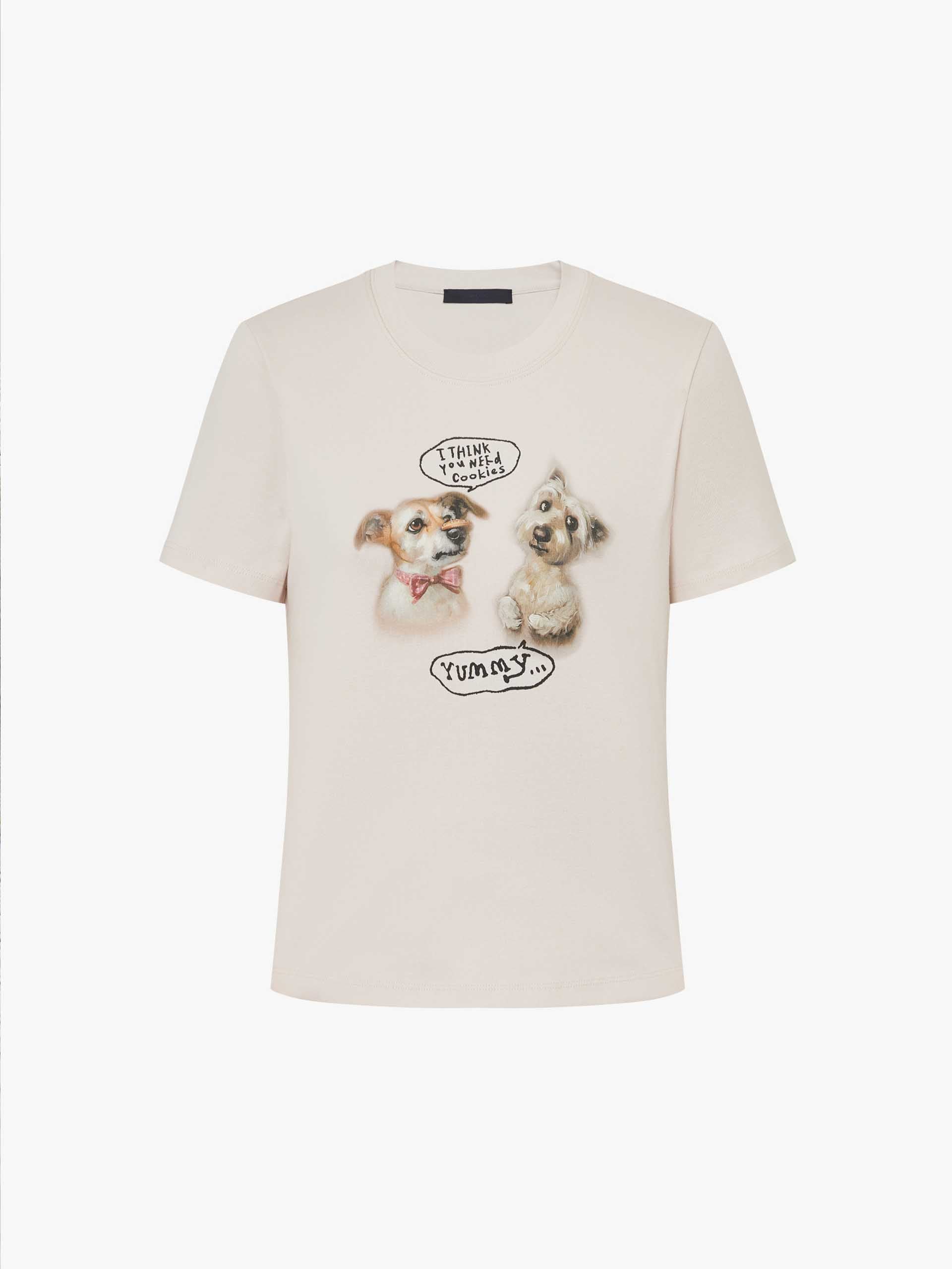 Crafted from a soft cotton blend, this slim-fitted T-shirt boasts a playful puppy print on the front. Its comfortable design ensures a cozy fit, making it a must-have for any dog lover's wardrobe.
