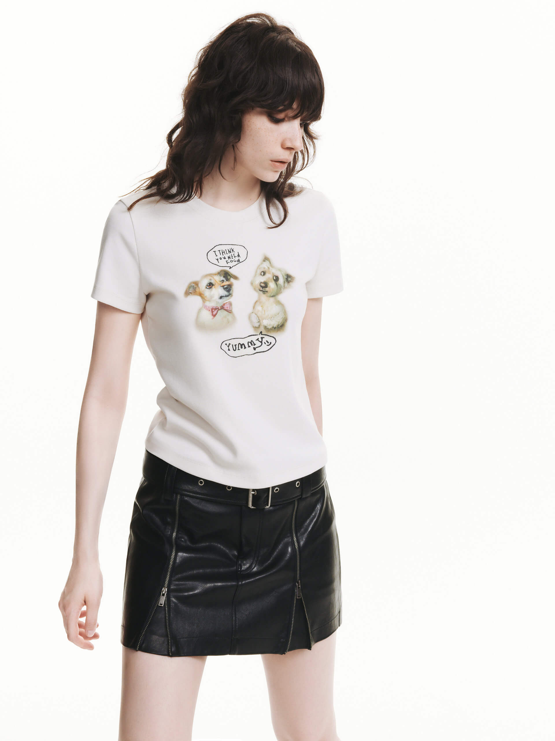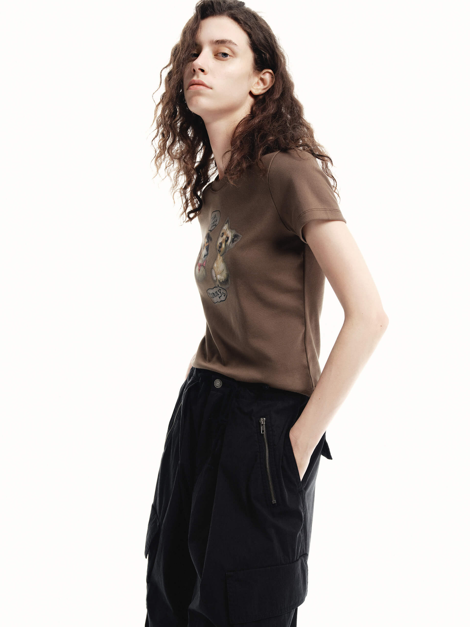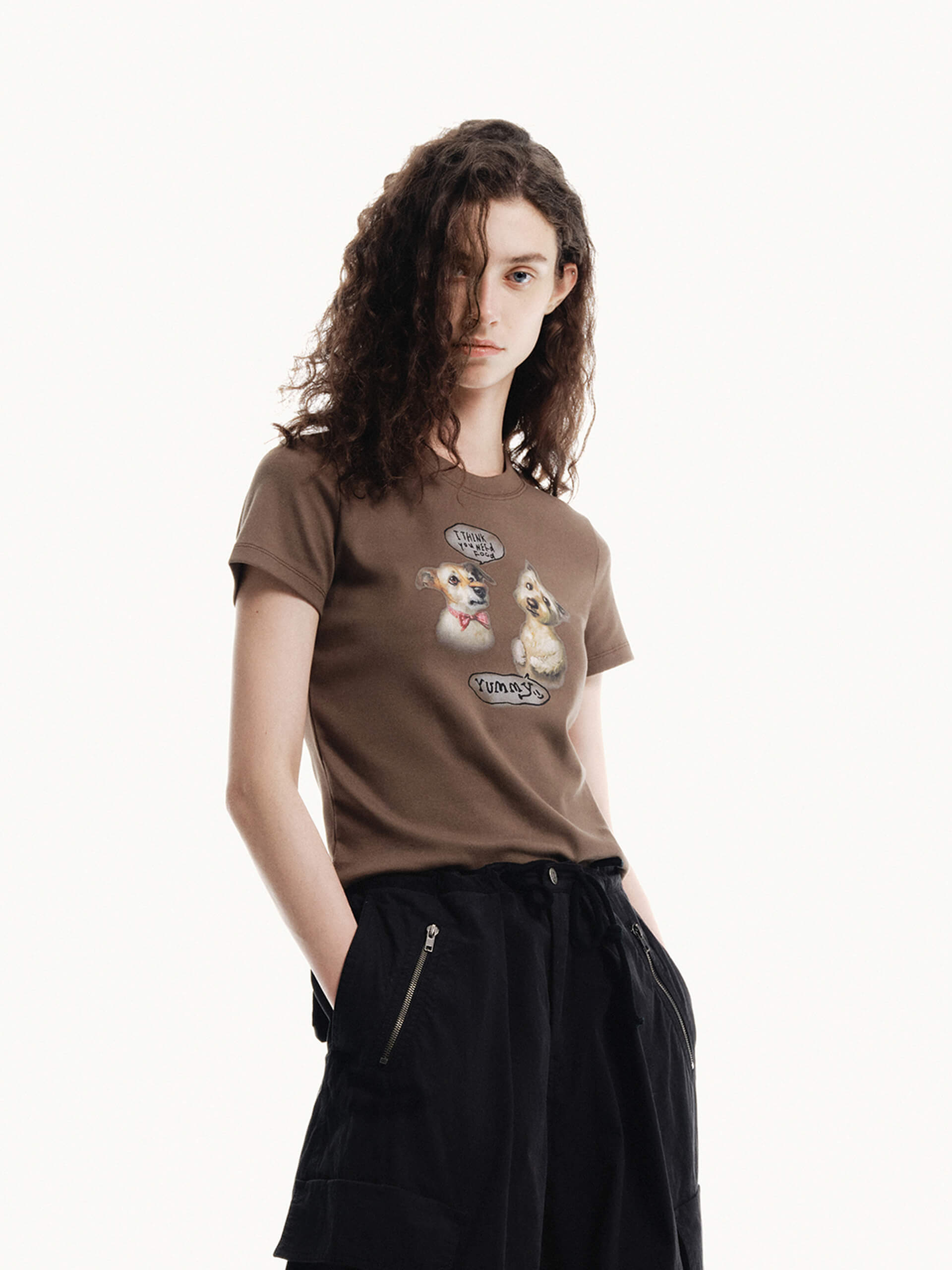 Crafted from a soft cotton blend, this slim-fitted T-shirt boasts a playful puppy print on the front. Its comfortable design ensures a cozy fit, making it a must-have for any dog lover's wardrobe.