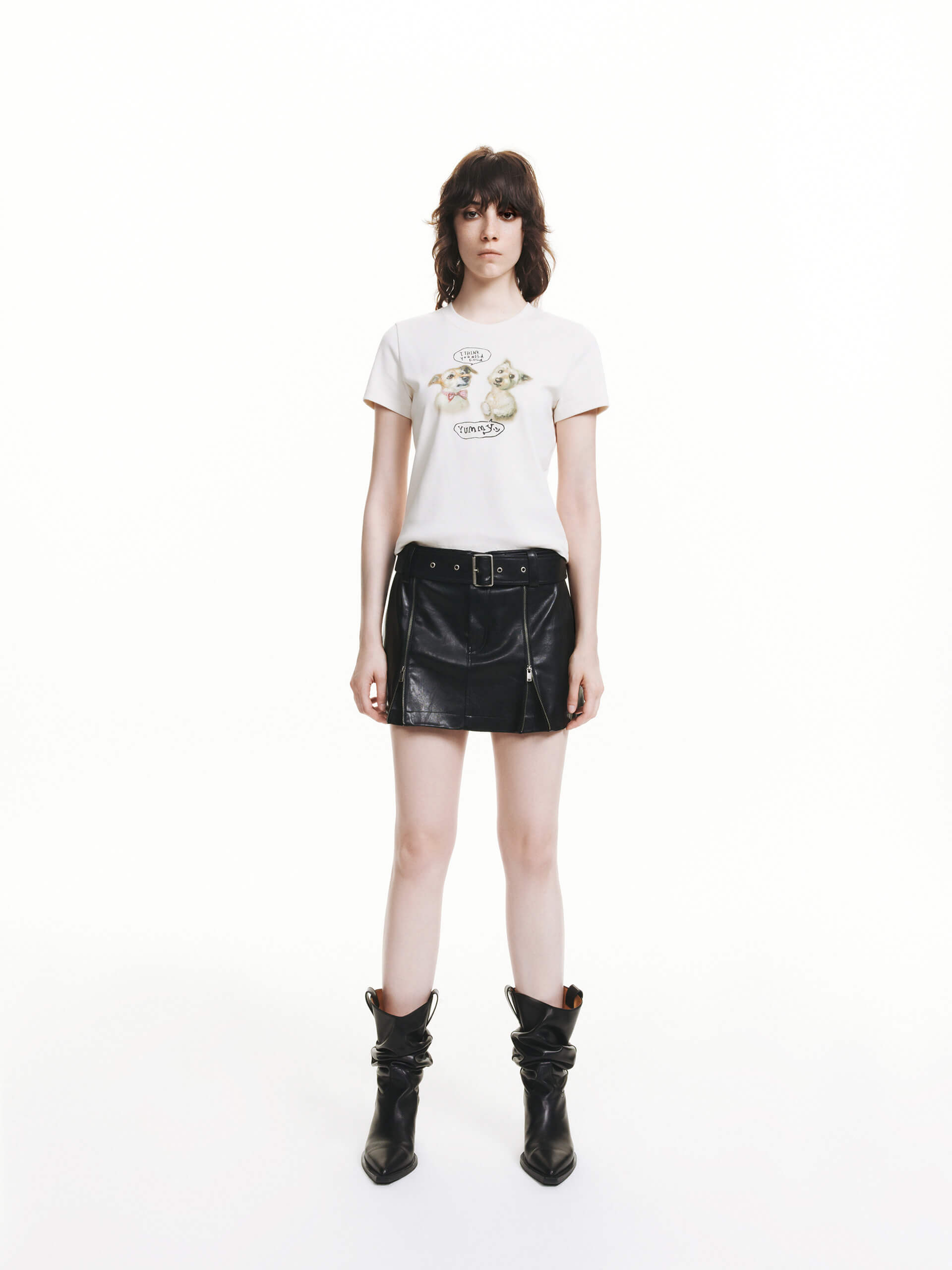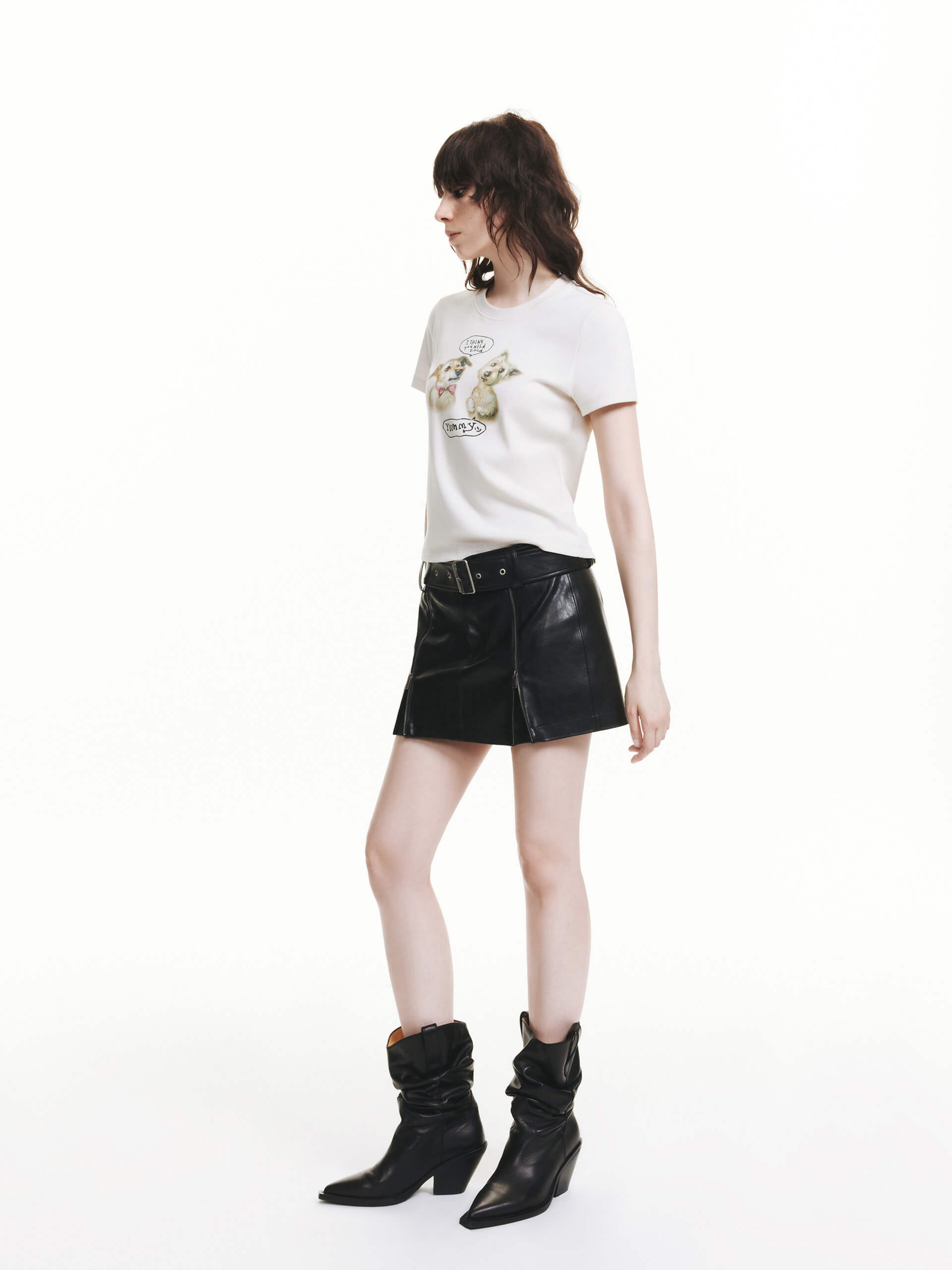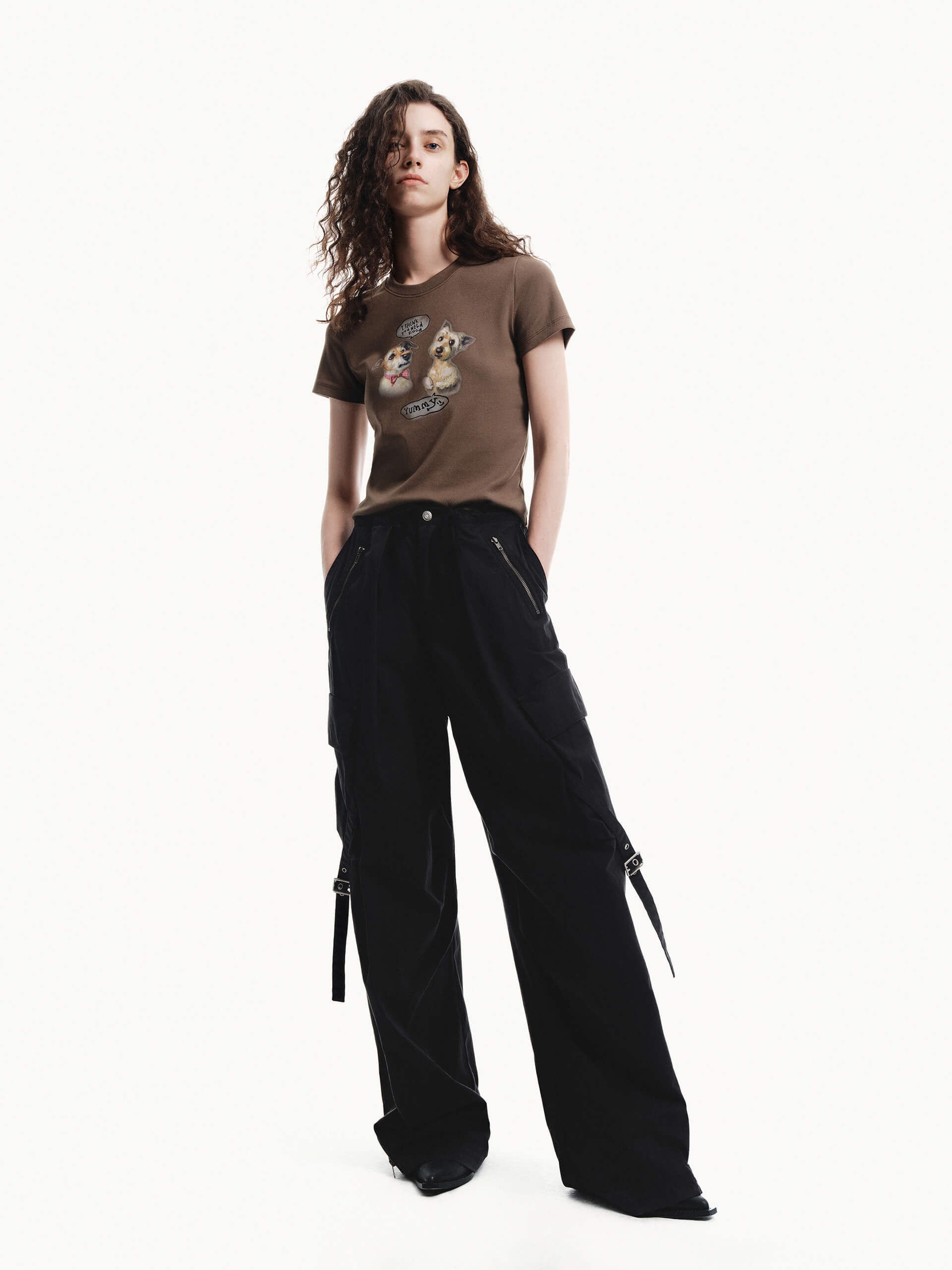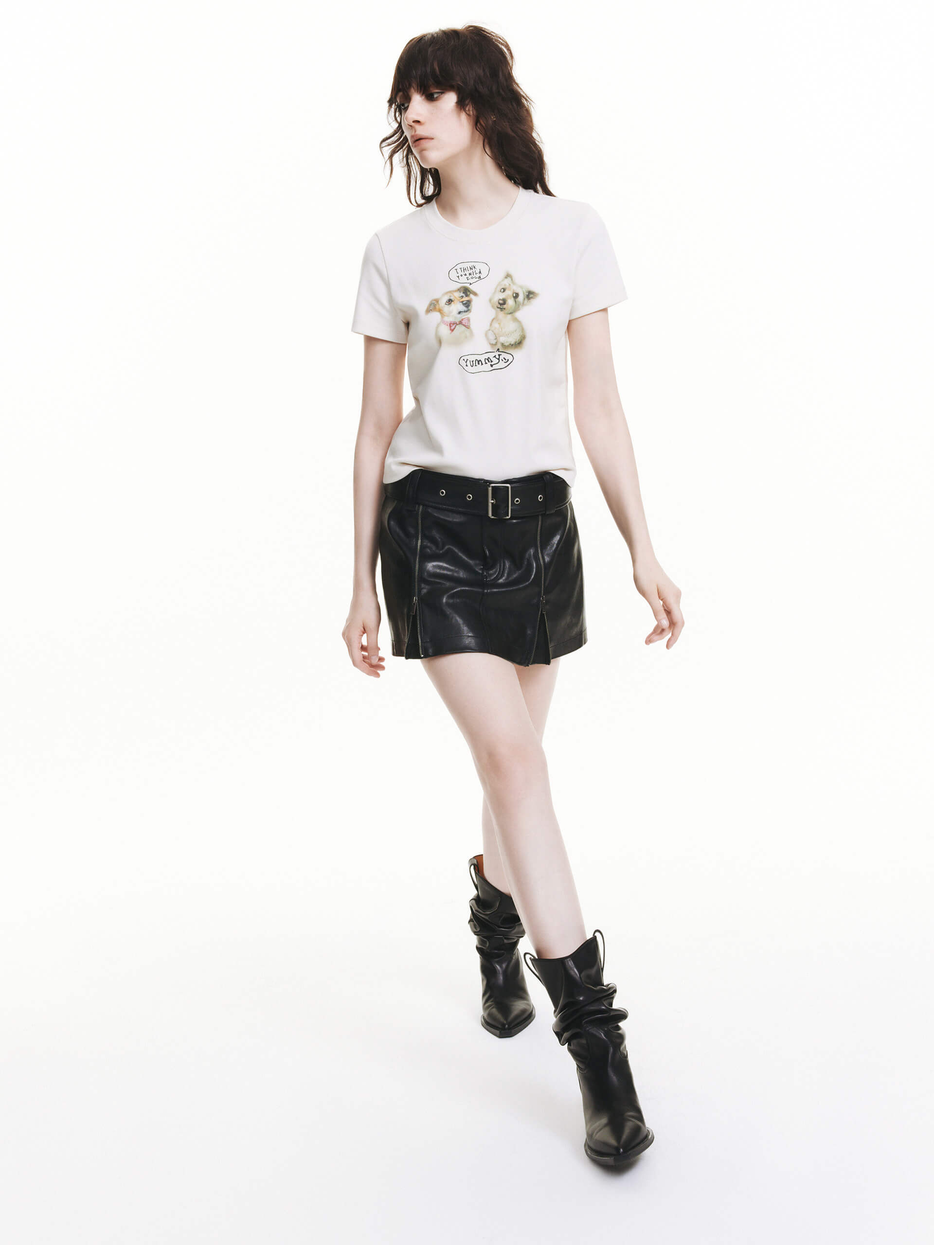Crafted from a soft cotton blend, this slim-fitted T-shirt boasts a playful puppy print on the front. Its comfortable design ensures a cozy fit, making it a must-have for any dog lover's wardrobe.