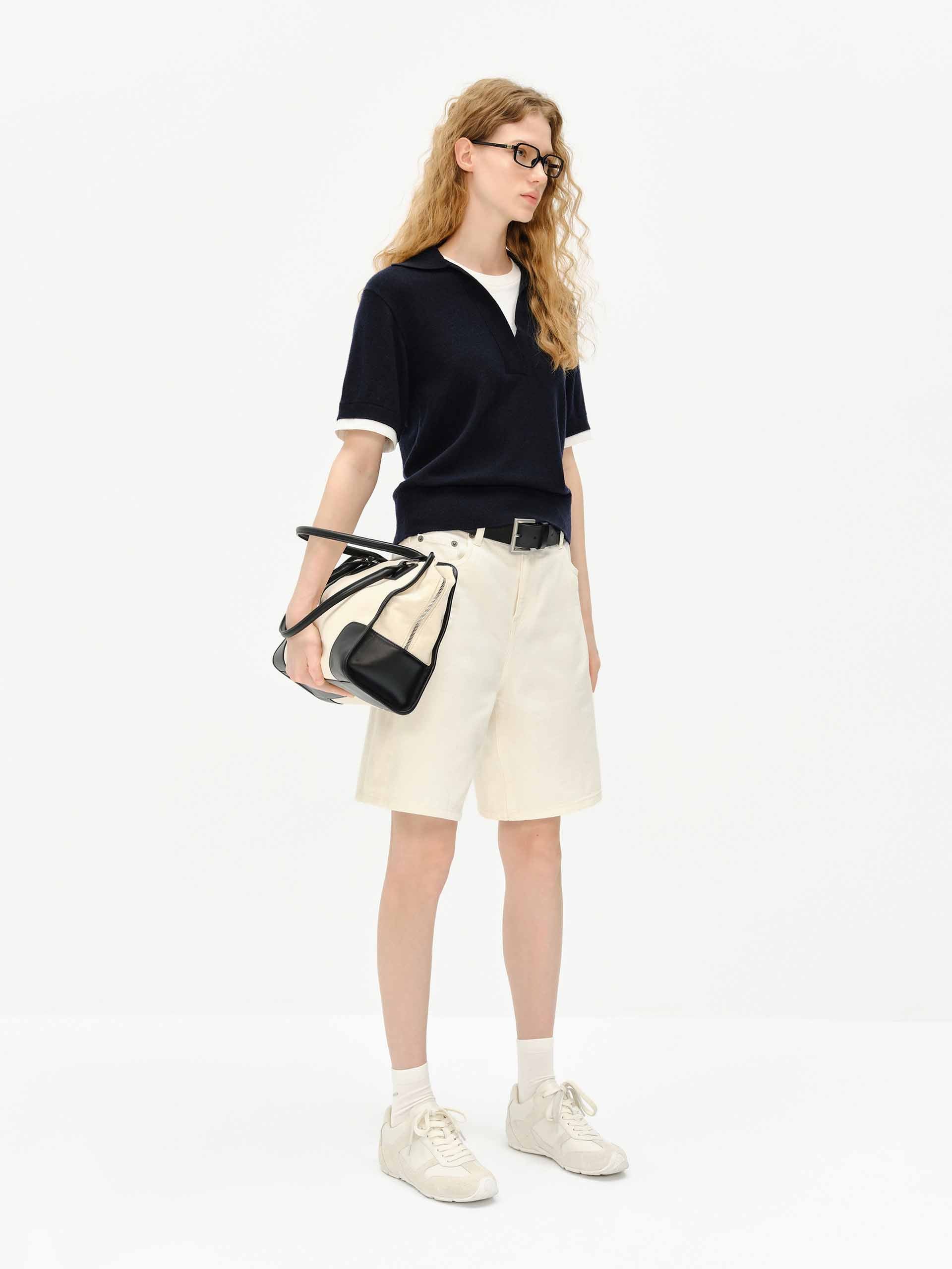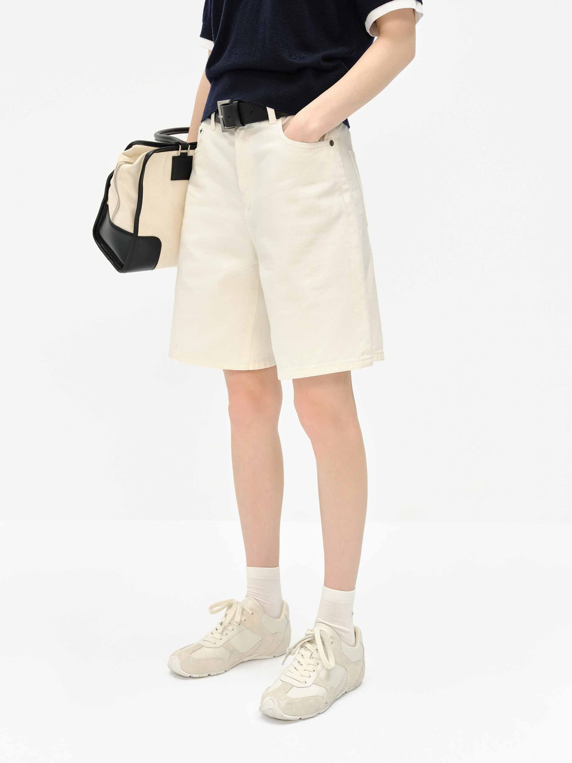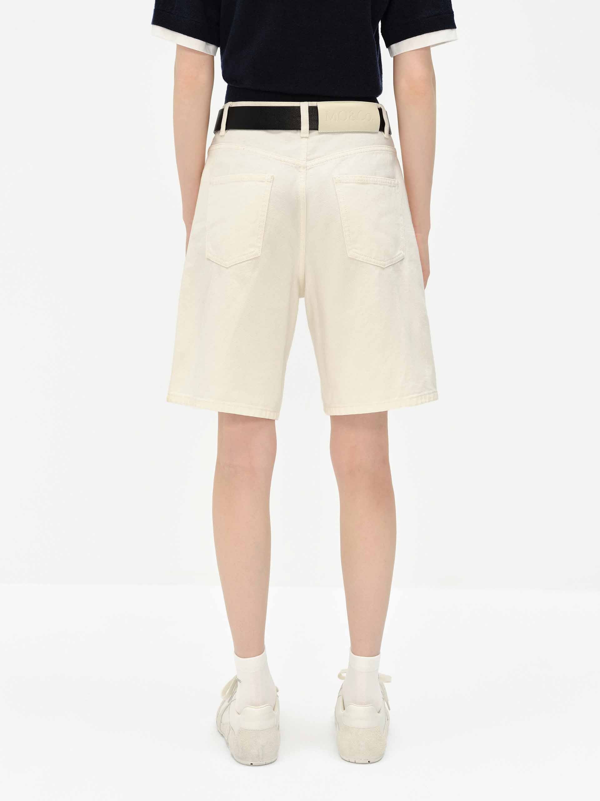 These shorts are made from white wash denim, offering a fresh and clean look perfect for spring. It feature a midi length and a classic five pocket design that combines functionality with timeless appeal. A must-have spring staple, these shorts are ideal for creating chic and casual outfits.
