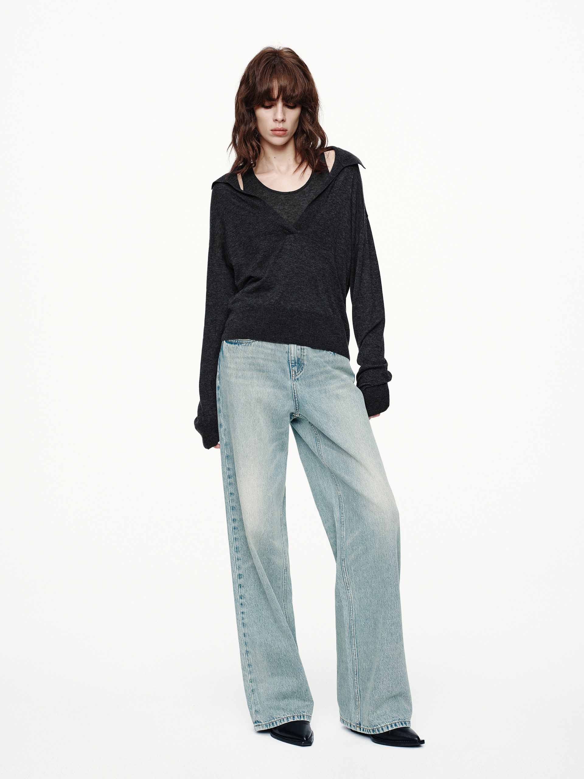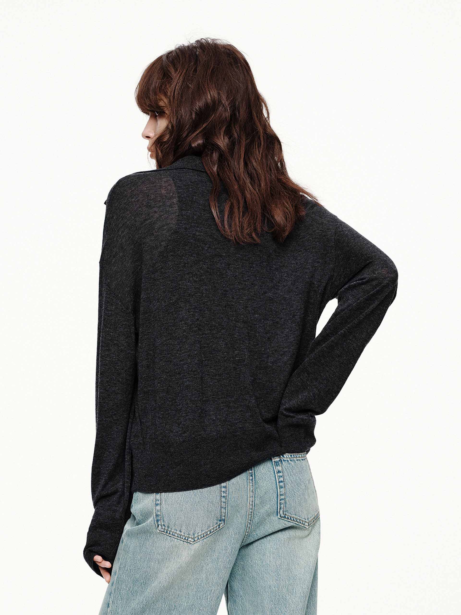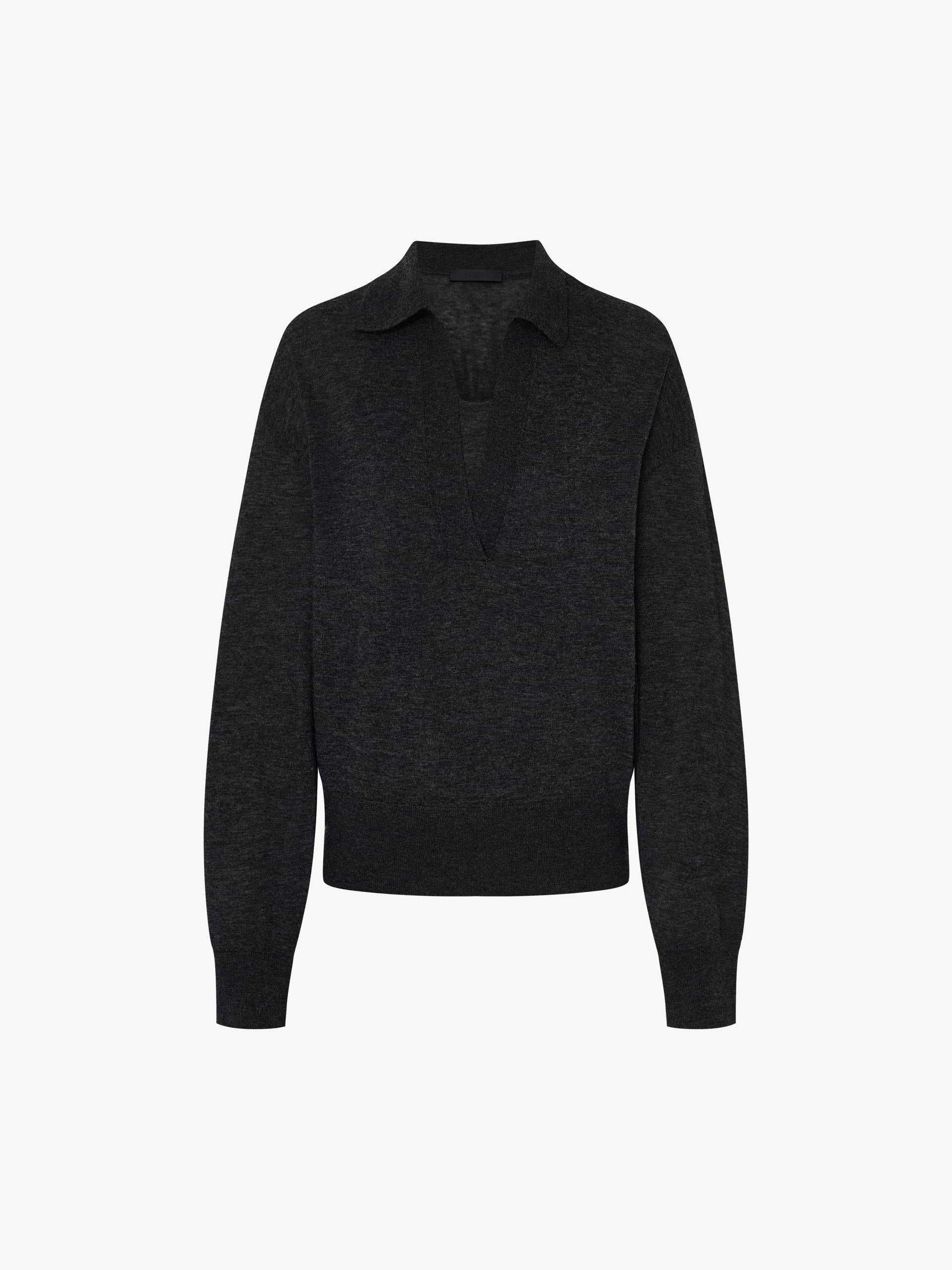 Crafted from 100% premium wool, this sweater redefines easy elegance with its built-in tonal tank and polished polo collar. The V-neckline reveals just the right amount of the layered base, creating dimension without bulk, while the long sleeves and regular silhouette ensure all-day comfort, making it ideal for transitional weather. A hybrid shade between black and grey.