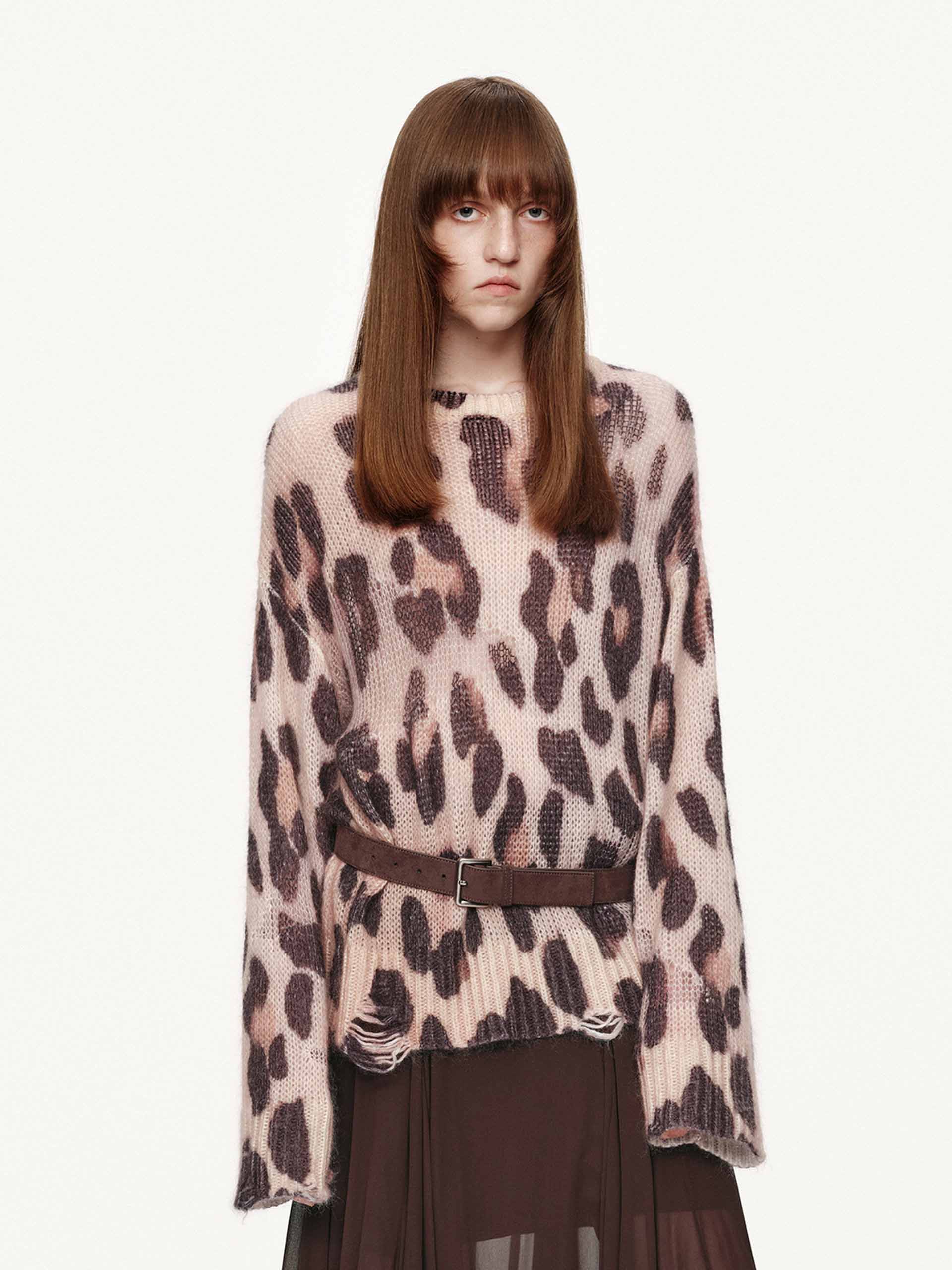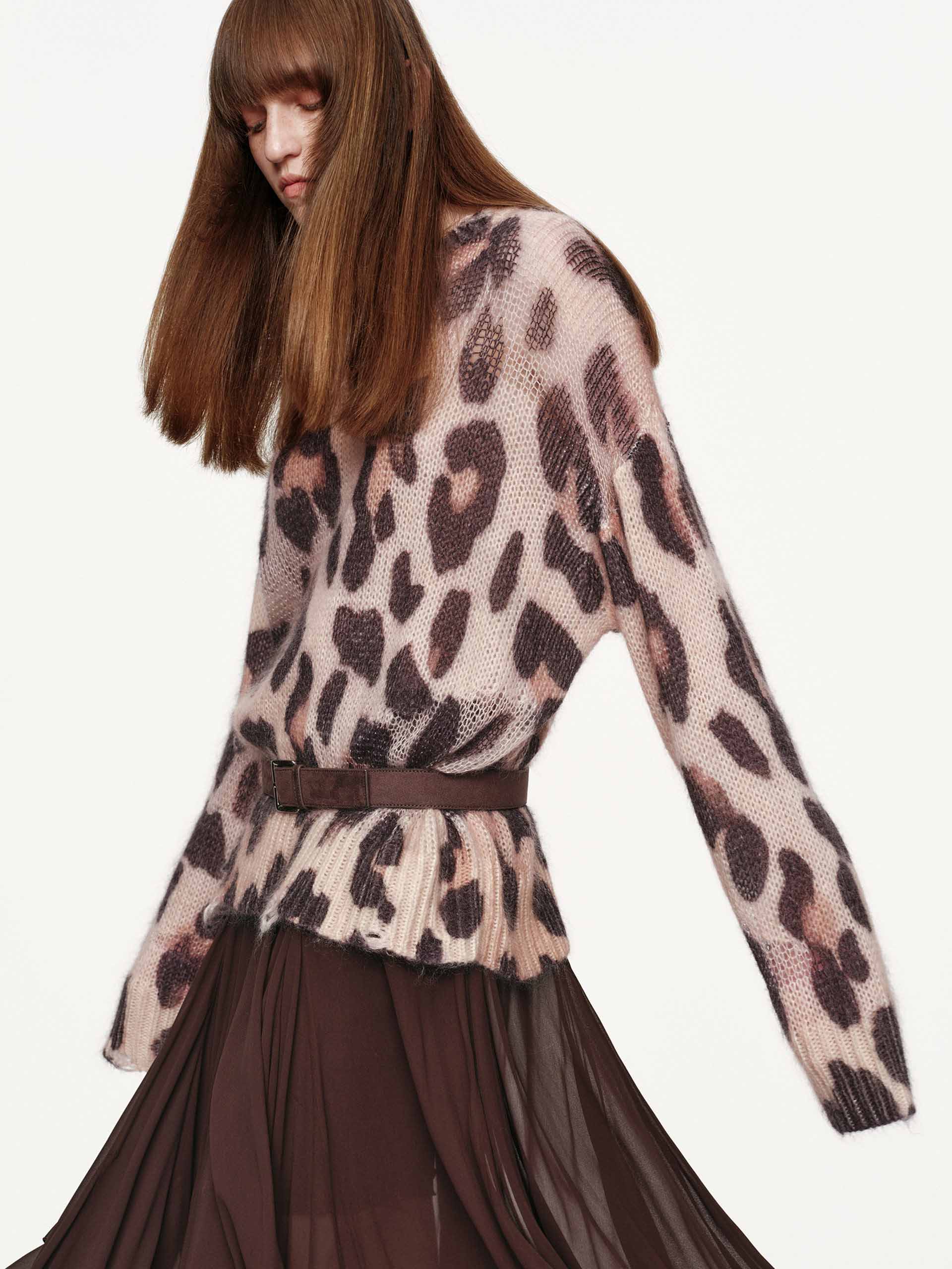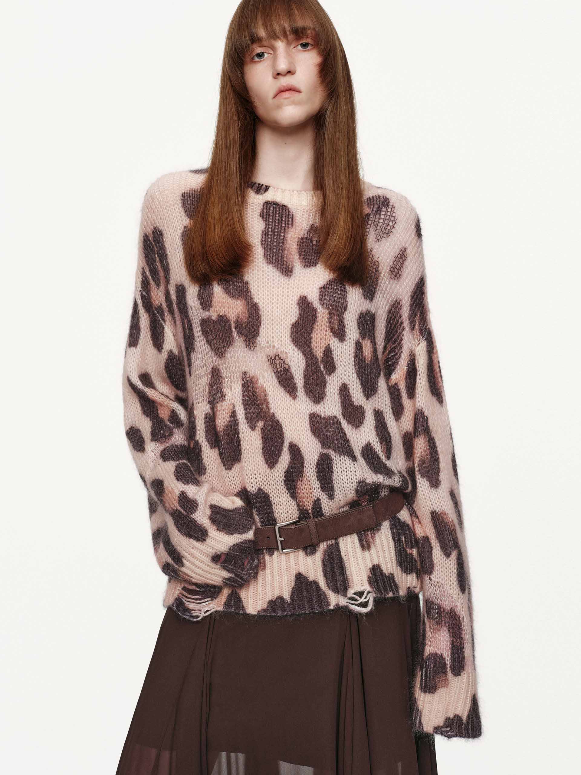 Embrace a blend of untamed style and laid-back luxury with the sweater. The classic round neck and long sleeves offer timeless comfort and versatility, while the bold leopard print delivers a fierce yet sophisticated statement. Finished with an artisanal raw hem, this piece adds a touch of modern edge and textural depth. The color may vary slightly in model images due to lighting. For the most accurate color, please refer to the individual product images.
