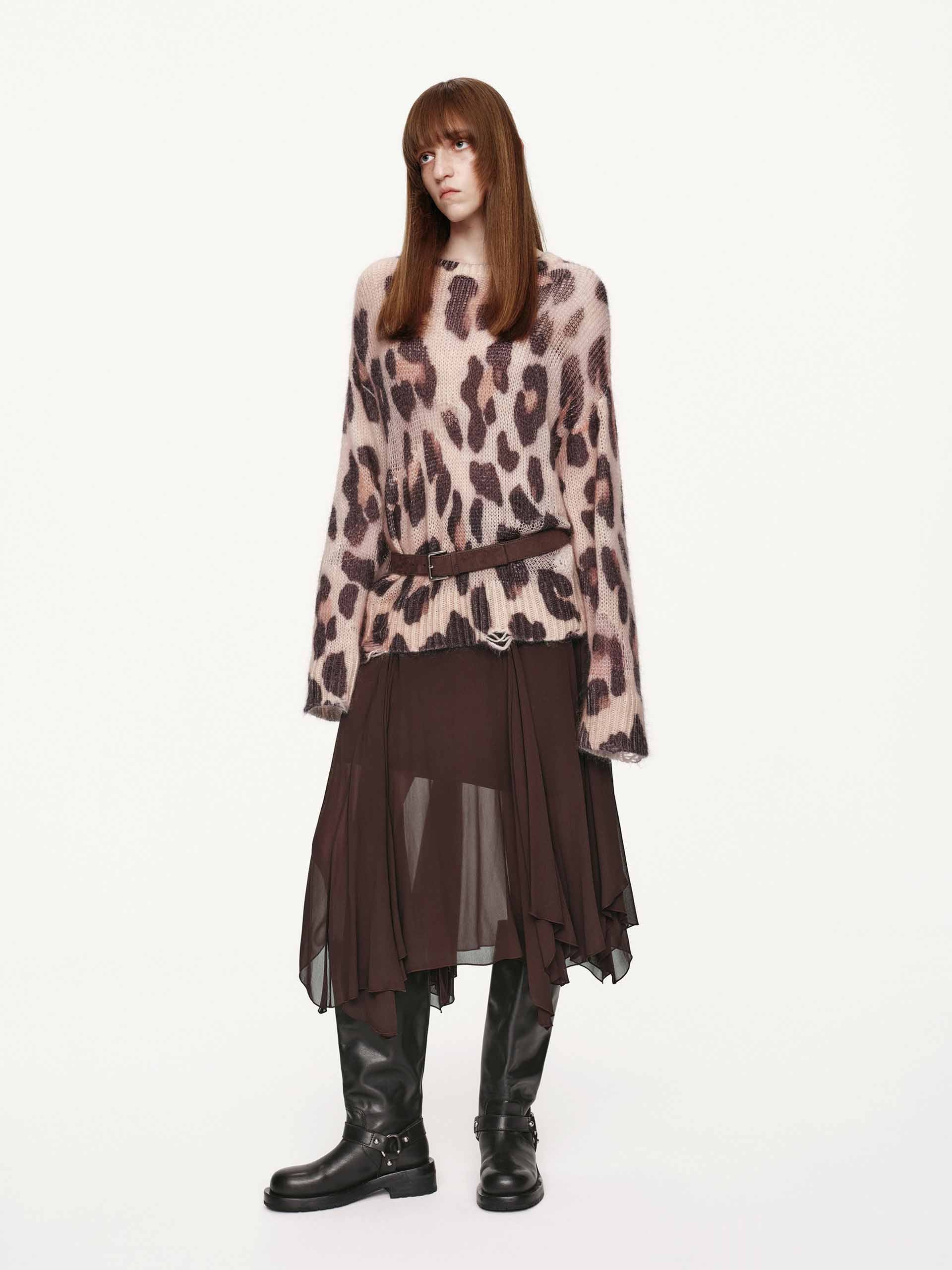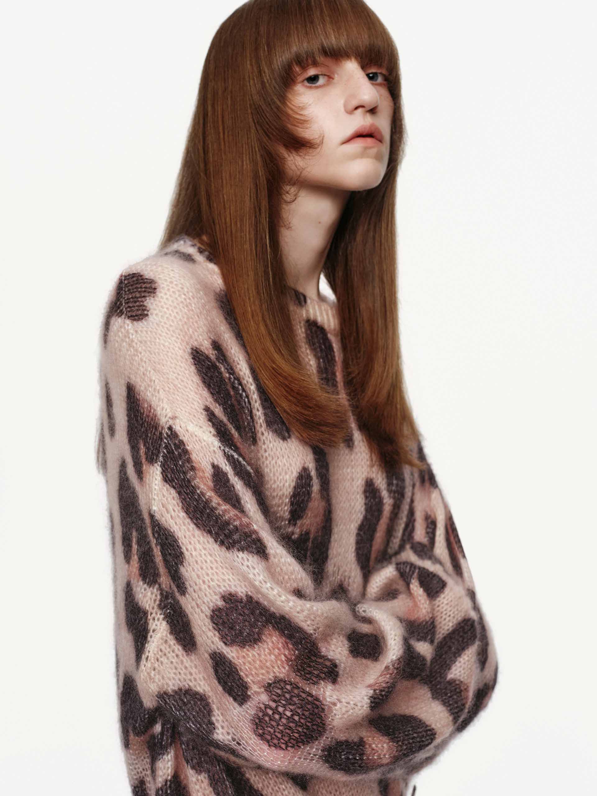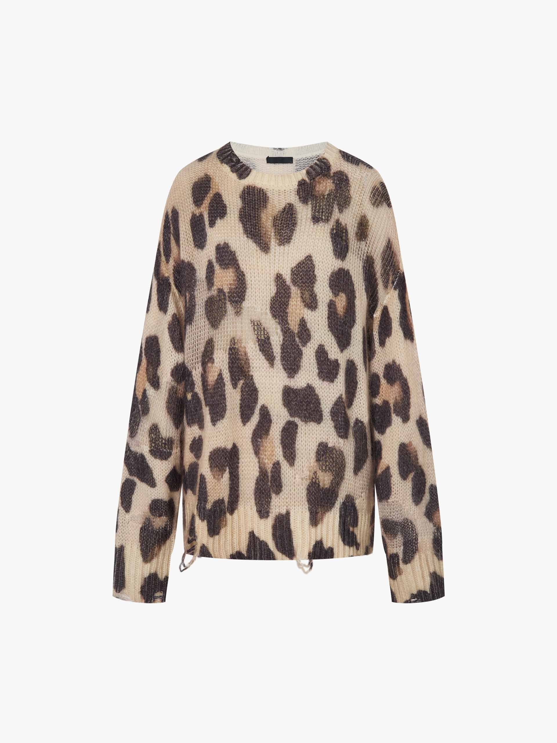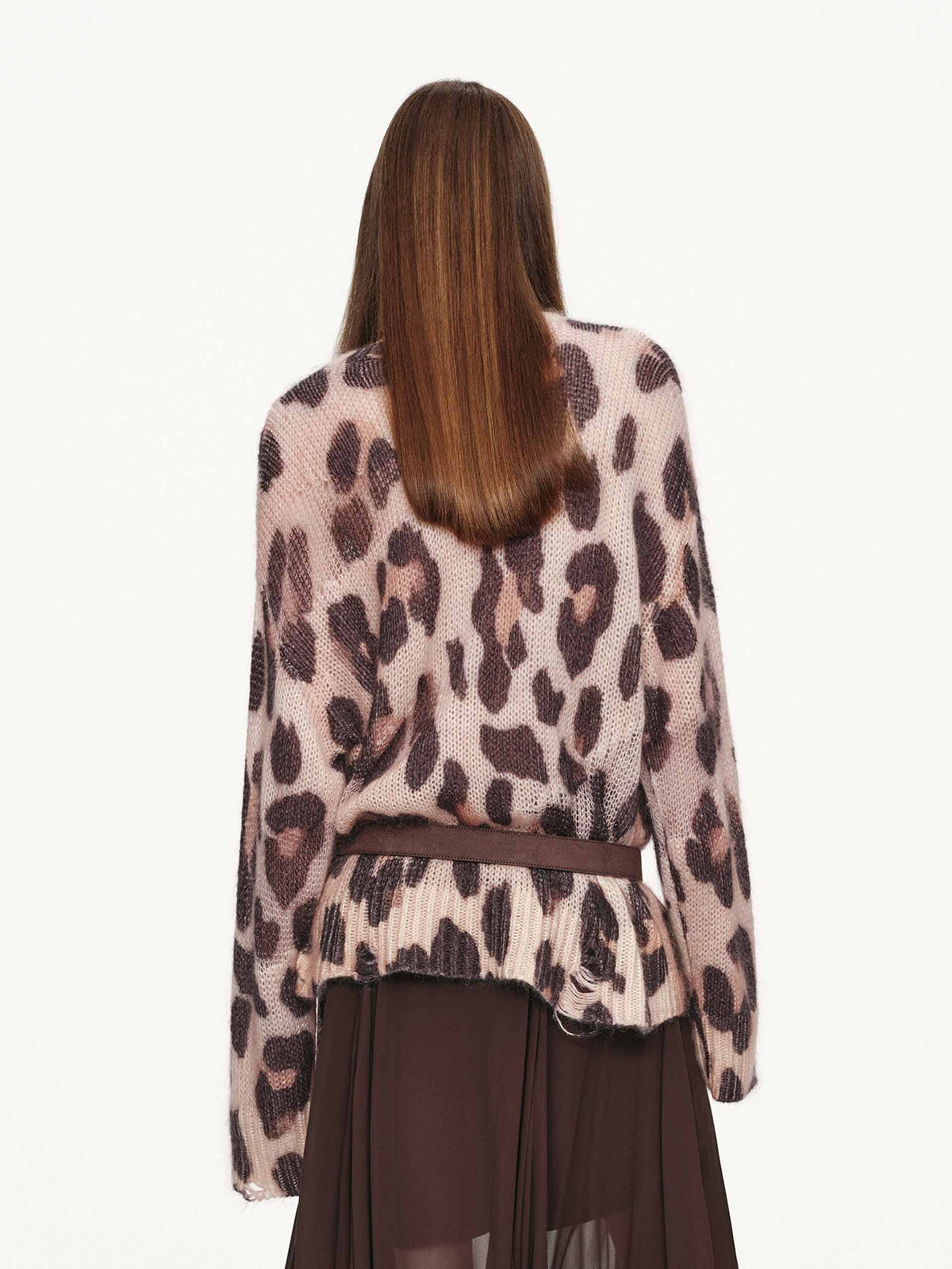 Embrace a blend of untamed style and laid-back luxury with the sweater. The classic round neck and long sleeves offer timeless comfort and versatility, while the bold leopard print delivers a fierce yet sophisticated statement. Finished with an artisanal raw hem, this piece adds a touch of modern edge and textural depth. The color may vary slightly in model images due to lighting. For the most accurate color, please refer to the individual product images.