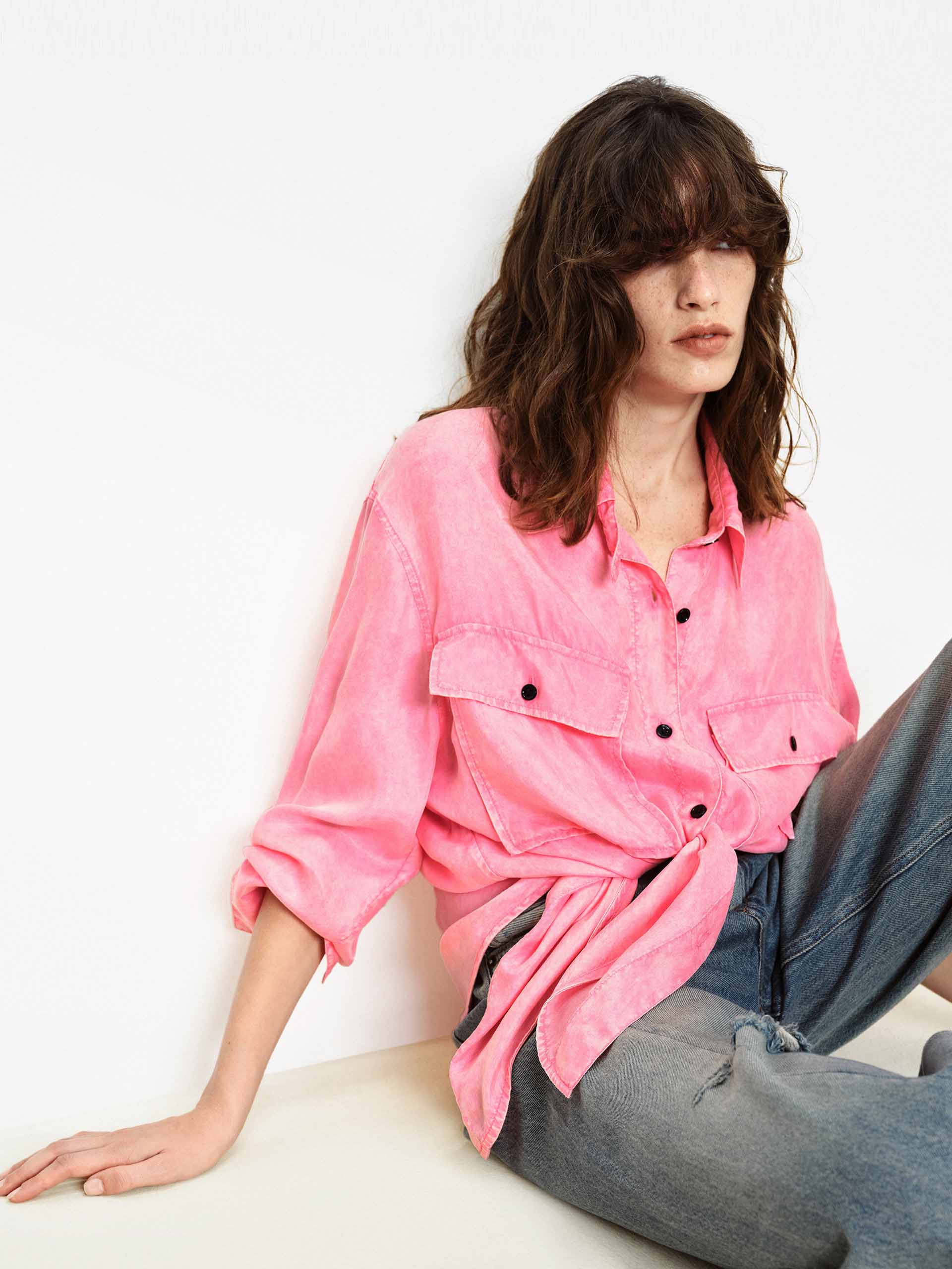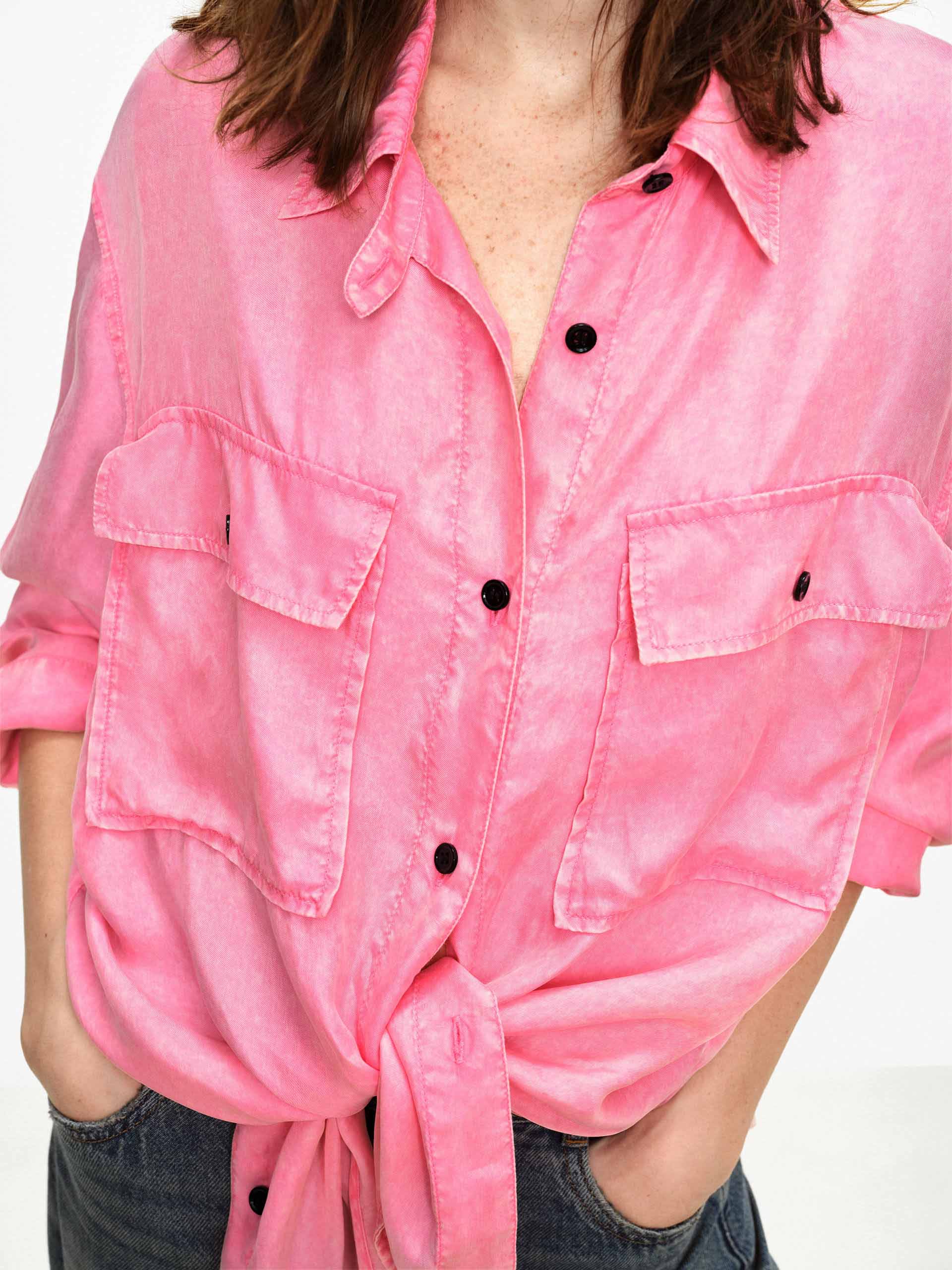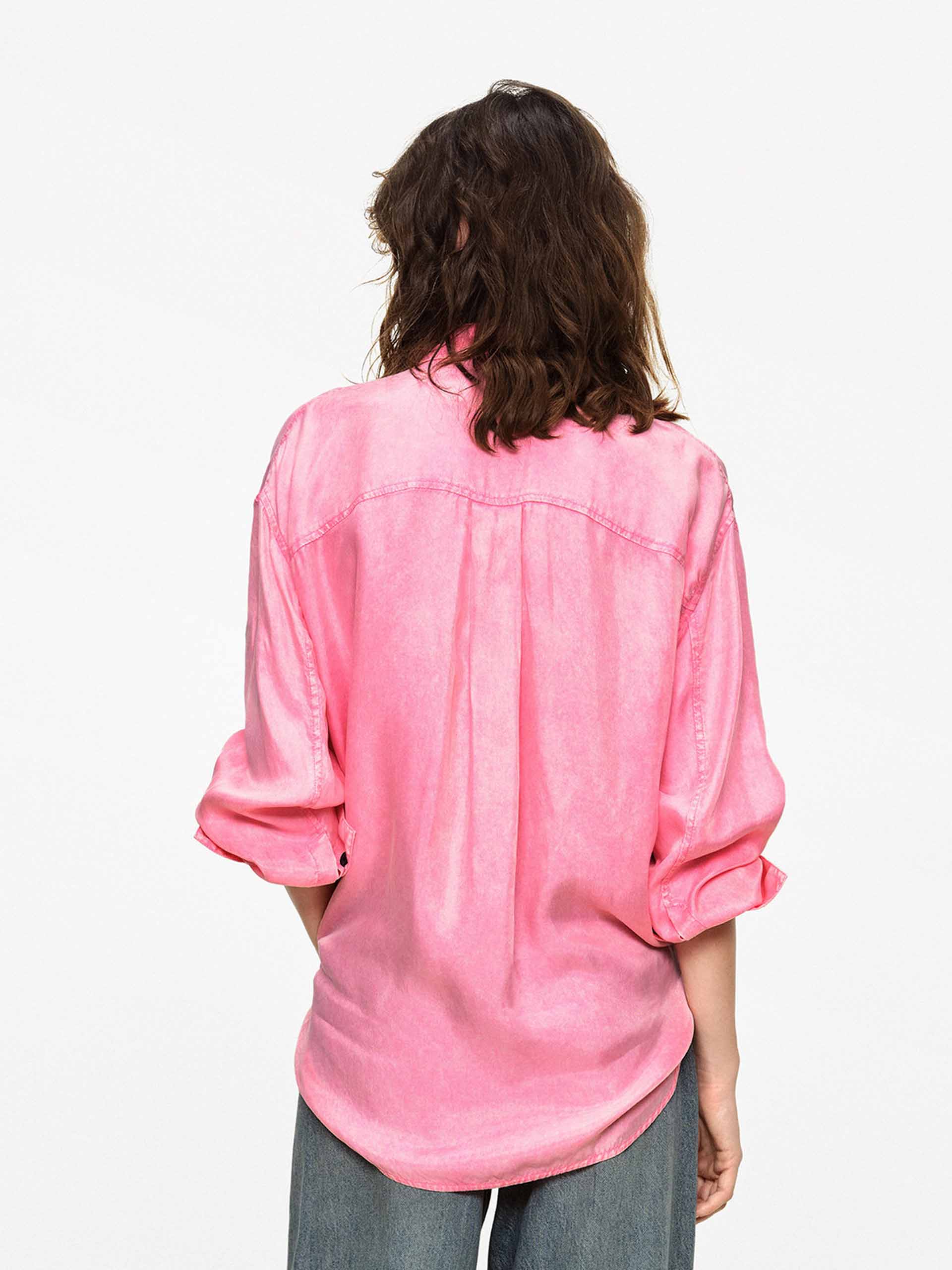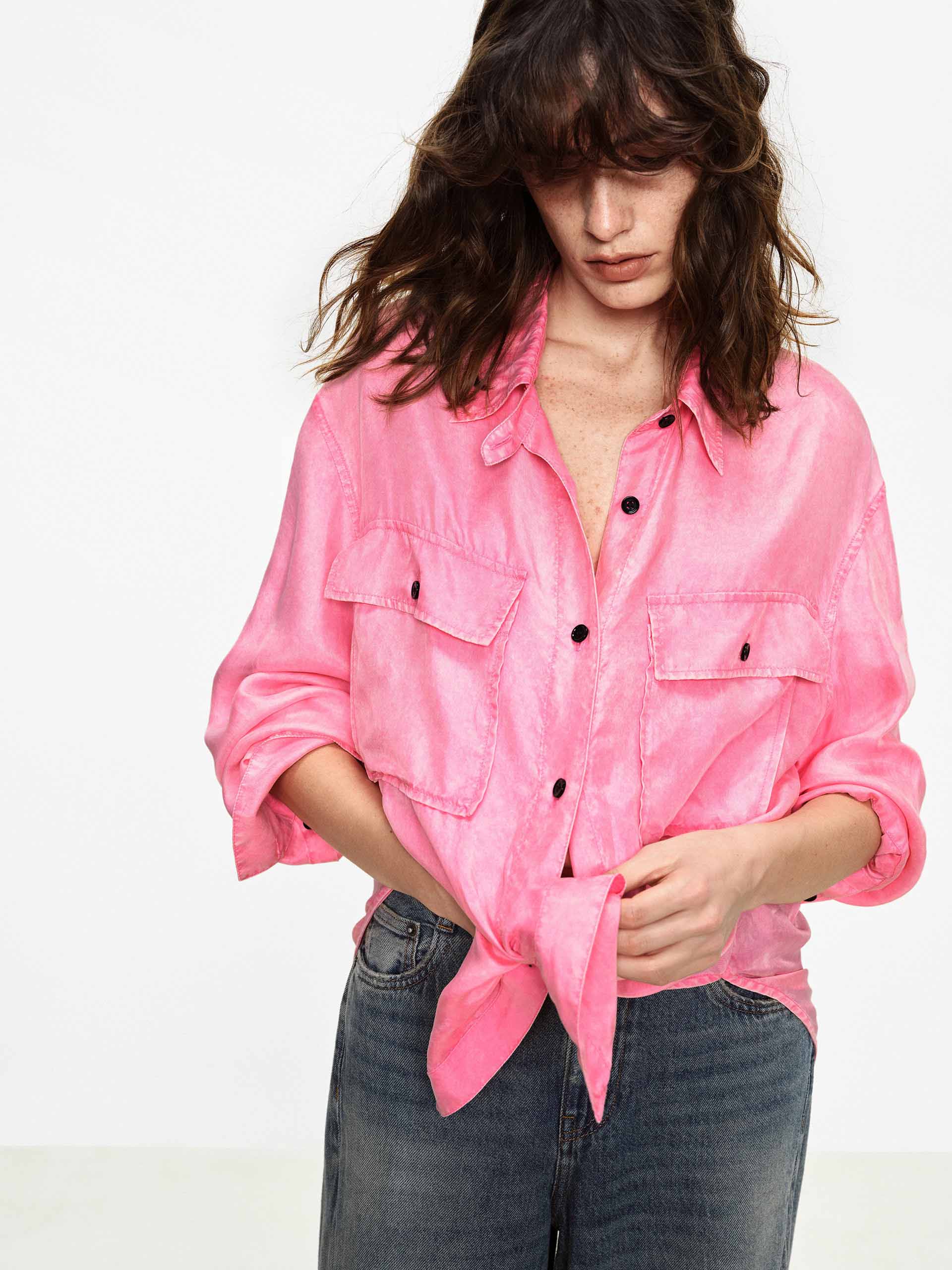 This shirt with dropped shoulders features a lapel design and double chest pockets, accented with contrasting color buttons that add refined detail to its workwear-inspired base. Whether in a classic navy or a bright pink, it pairs effortlessly with jeans or trousers to create a polished yet relaxed everyday style.