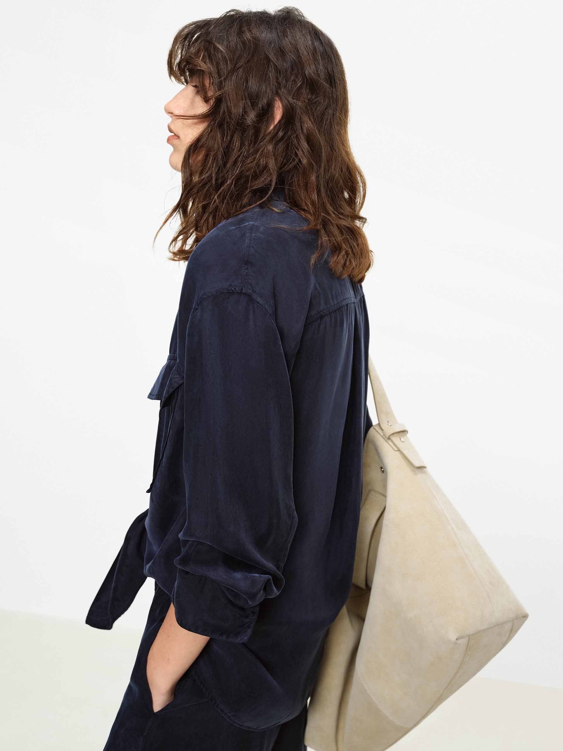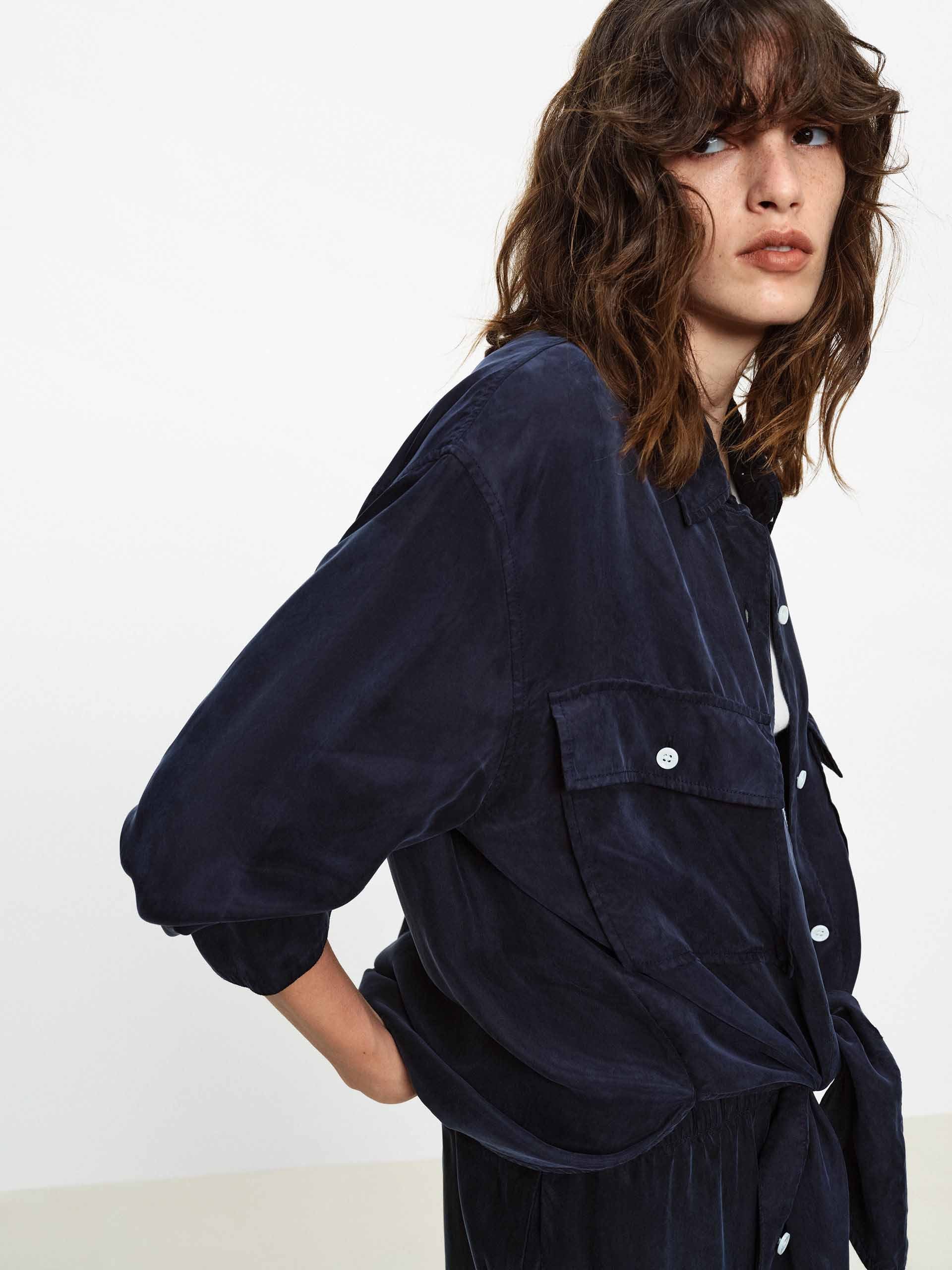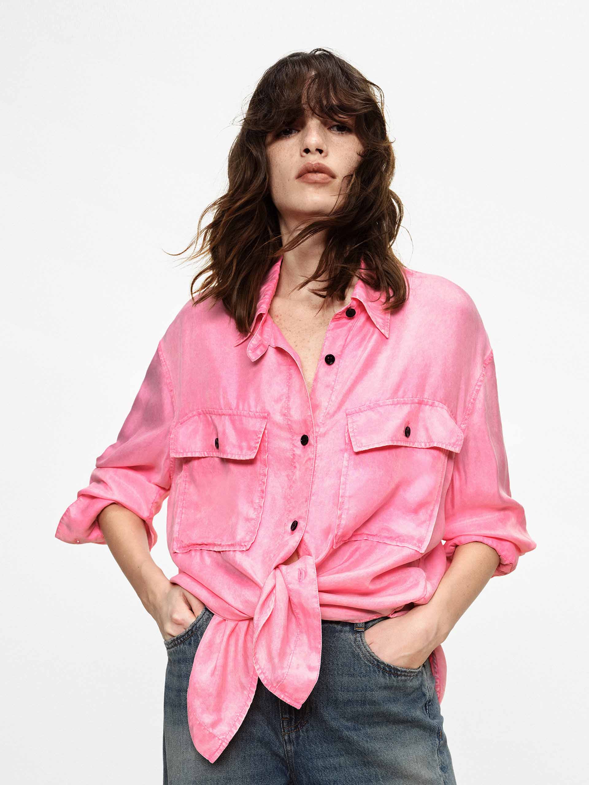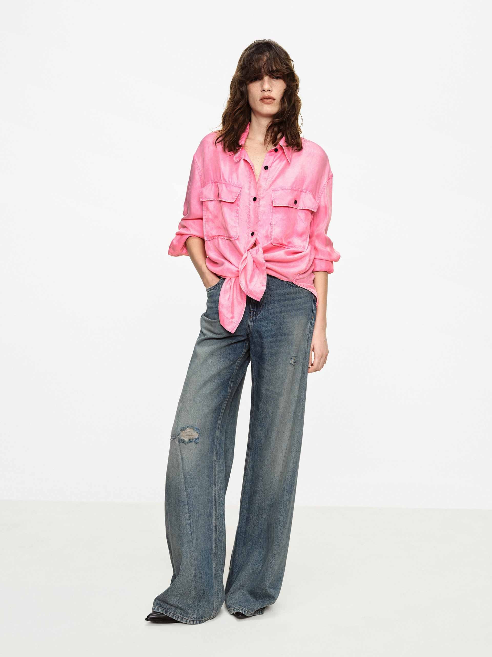 This shirt with dropped shoulders features a lapel design and double chest pockets, accented with contrasting color buttons that add refined detail to its workwear-inspired base. Whether in a classic navy or a bright pink, it pairs effortlessly with jeans or trousers to create a polished yet relaxed everyday style.