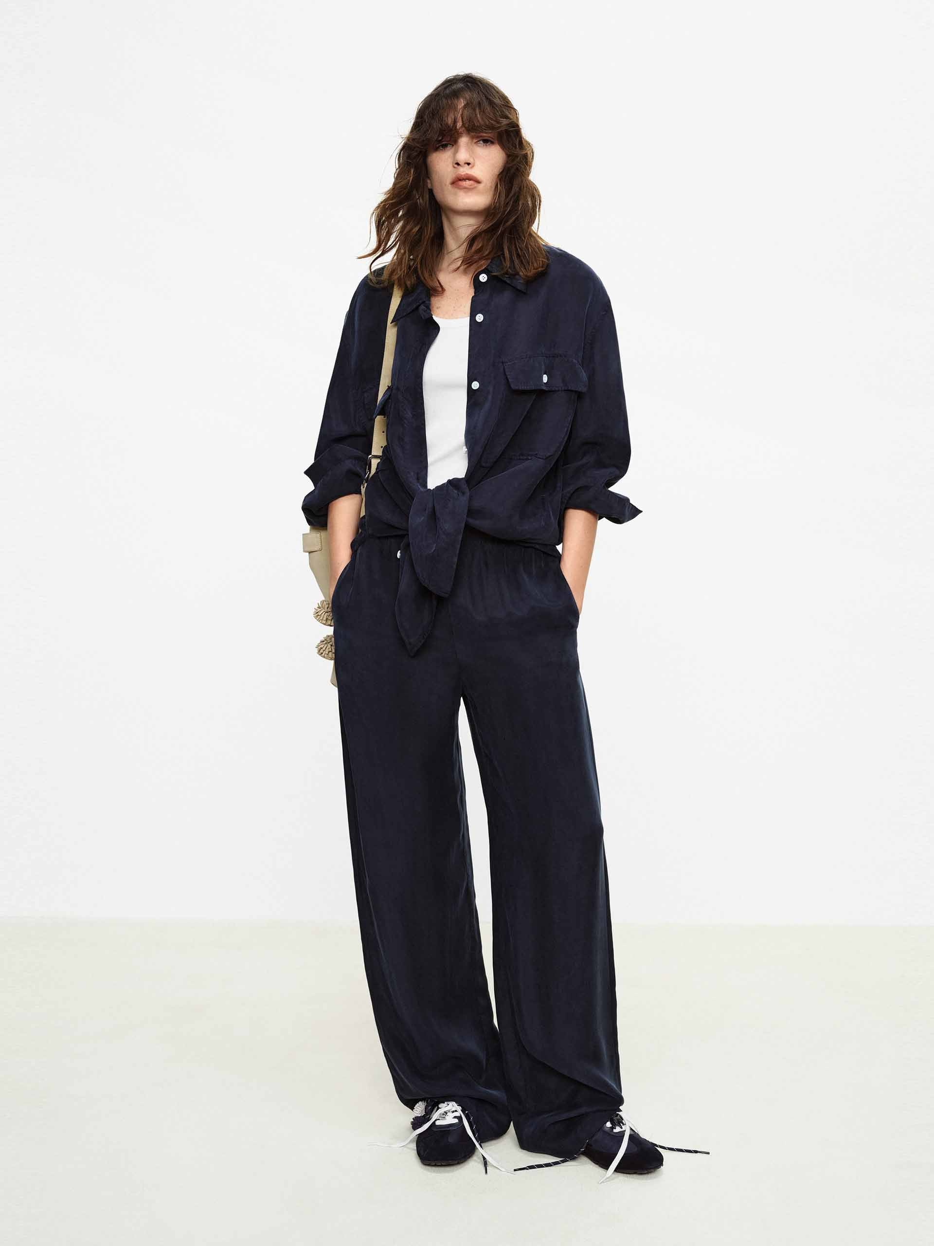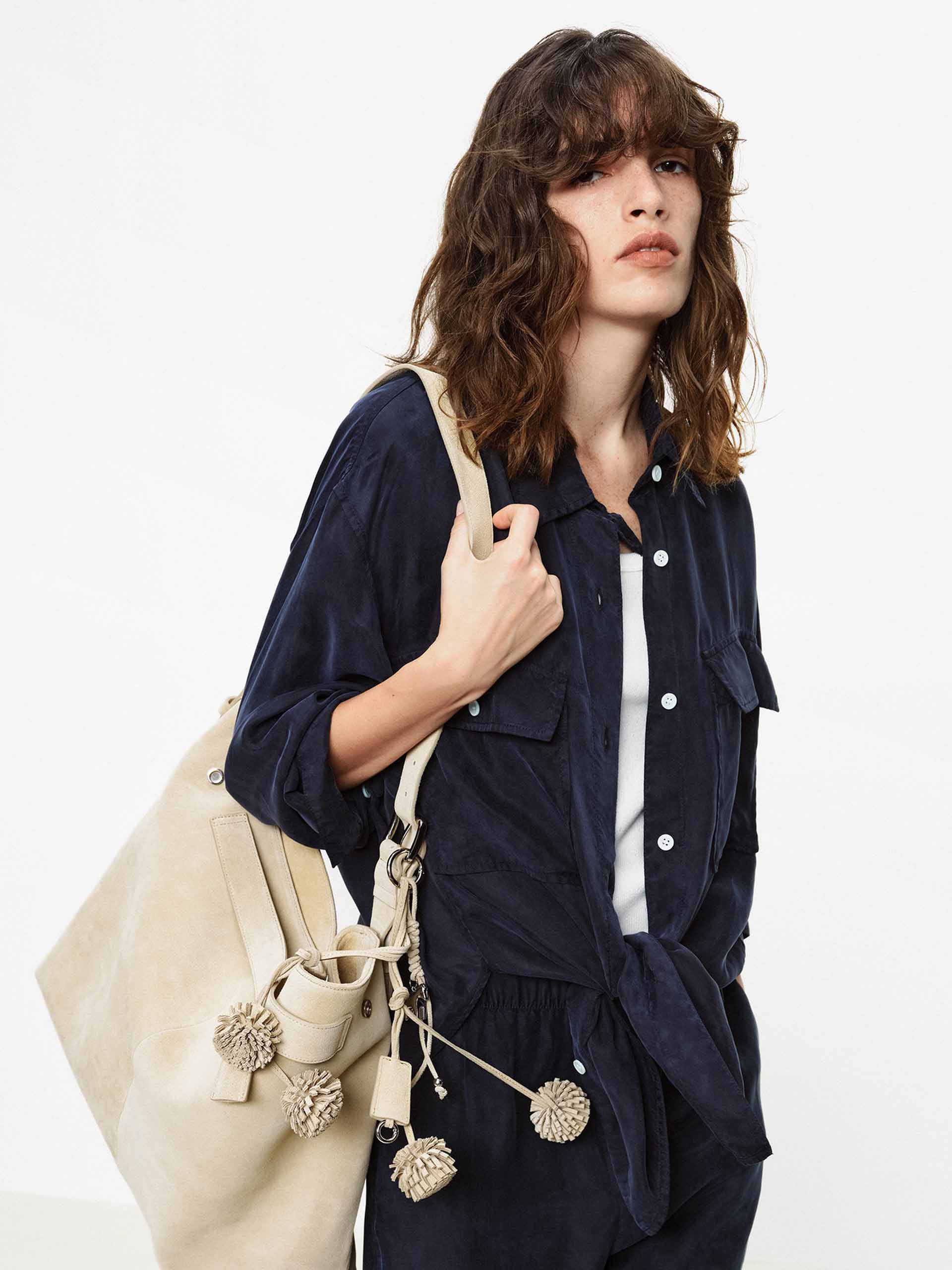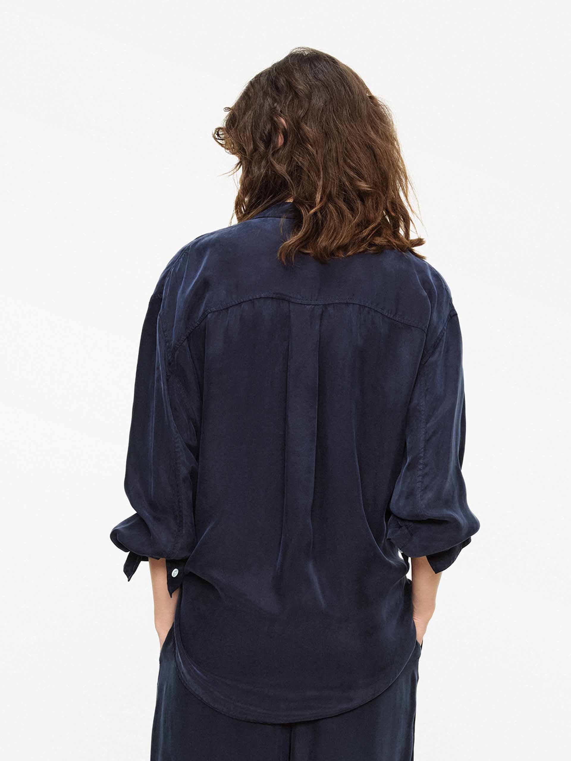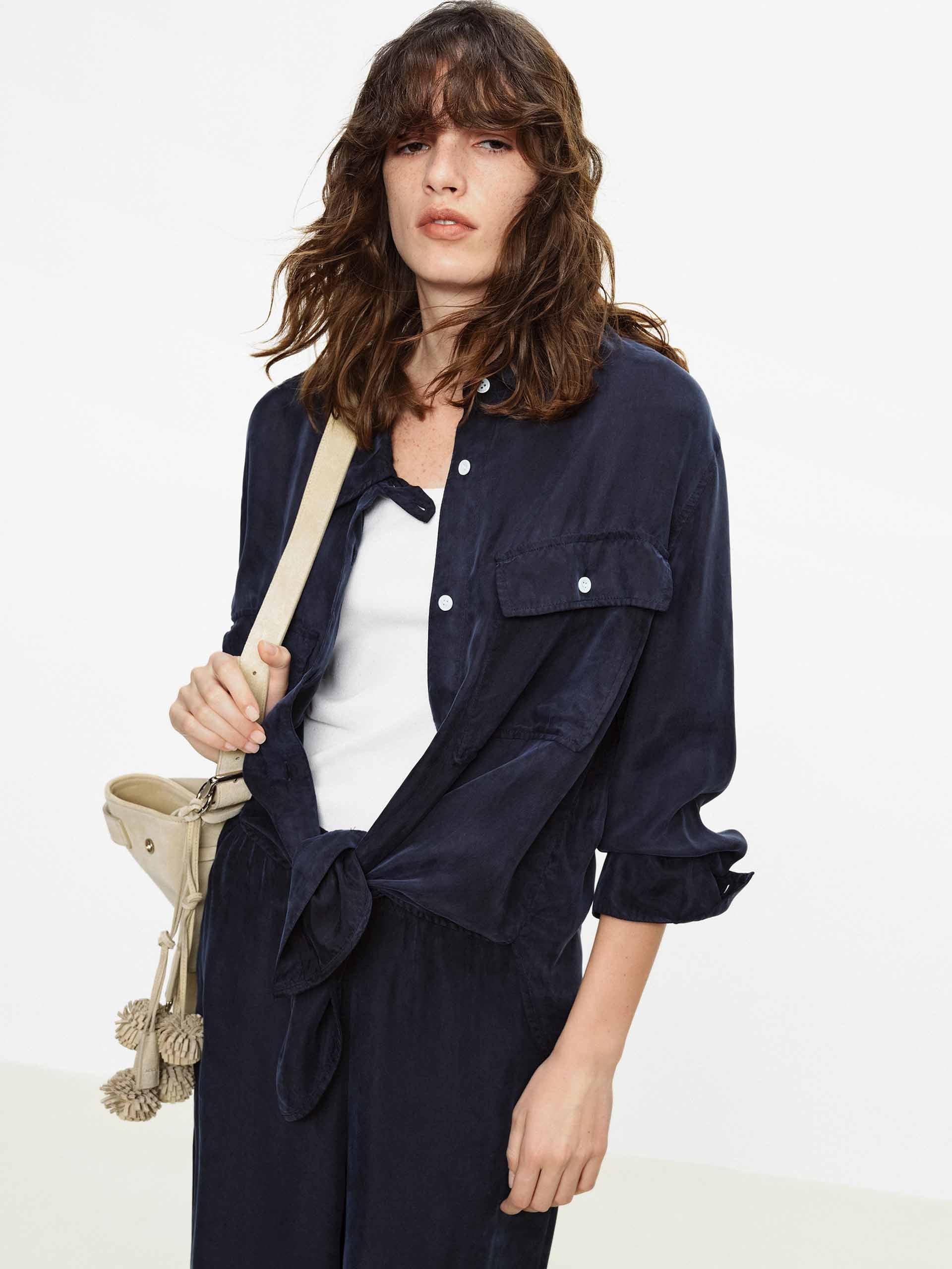 This shirt with dropped shoulders features a lapel design and double chest pockets, accented with contrasting color buttons that add refined detail to its workwear-inspired base. Whether in a classic navy or a bright pink, it pairs effortlessly with jeans or trousers to create a polished yet relaxed everyday style.