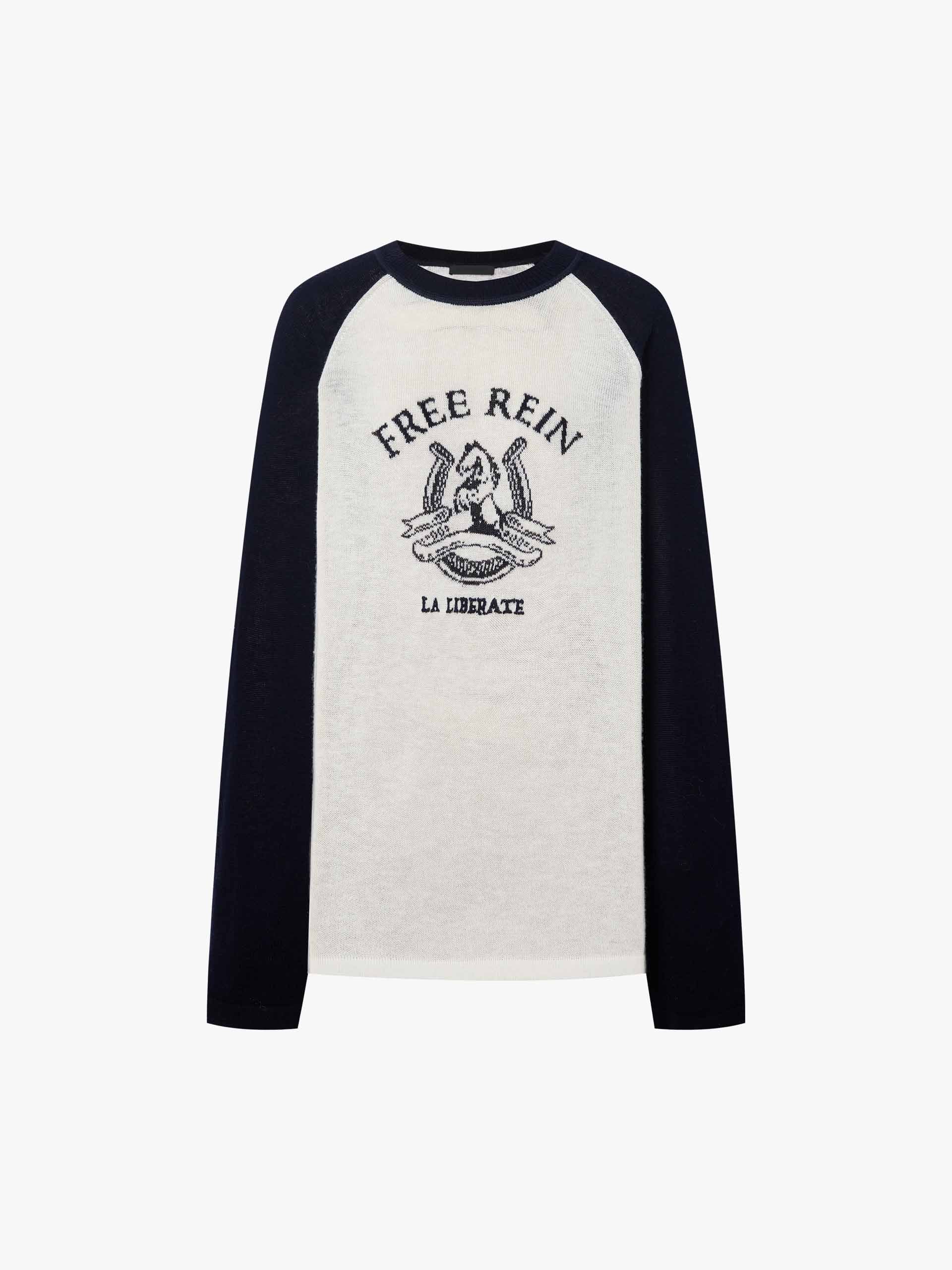 This sweater is crafted from a soft blend of wool and cashmere, offering lightweight warmth and a sumptuous feel. The classic round neck is elevated by bold contrast raglan sleeves that create a modern graphic silhouette. An intricate front pattern detail adds further visual interest, making this top a sophisticated statement piece for refined, everyday elegance.