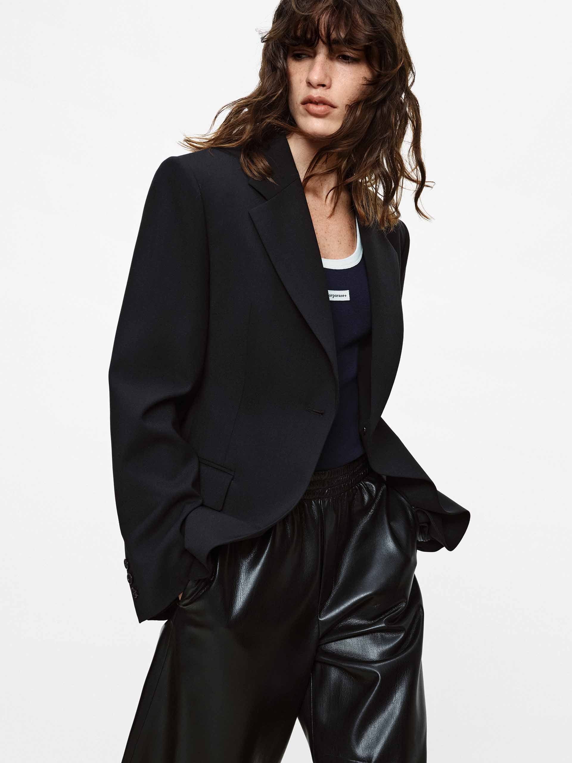 This blazer features a structured silhouette with padded shoulders that sharpen its clean outline. A single black button defines the waist, while a back center seam extends the streamlined silhouette. Perfect for commuting or semi-formal occasions, it effortlessly conveys a professional yet relaxed modern workplace style.