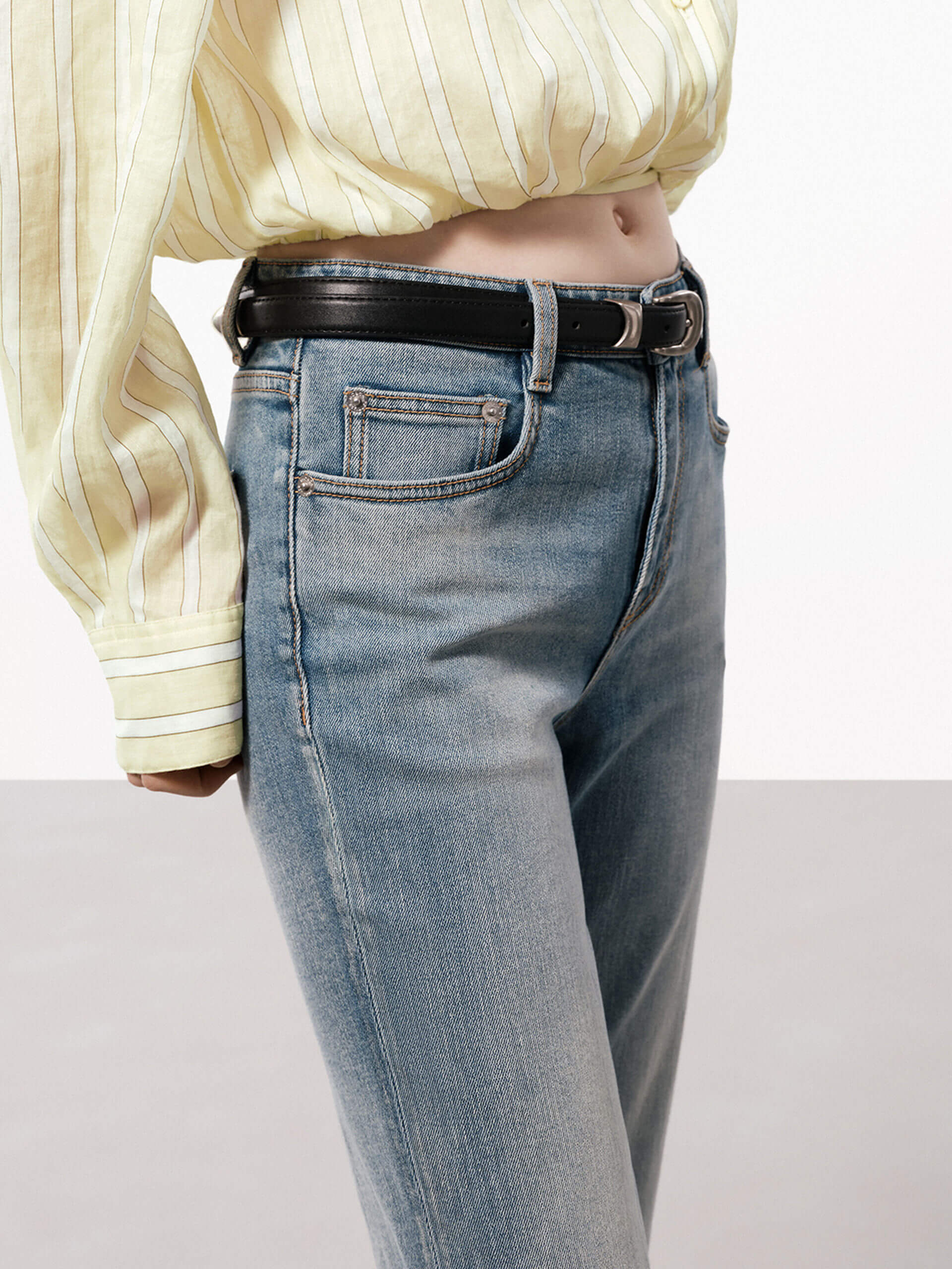 These are women's high-waisted jeans made from a lightly stretchy cotton blend material. They are designed to fit snugly around the waist and hips and provide a comfortable amount of stretch for movement. The ankle length makes them suitable for wearing with flats or ankle boots.