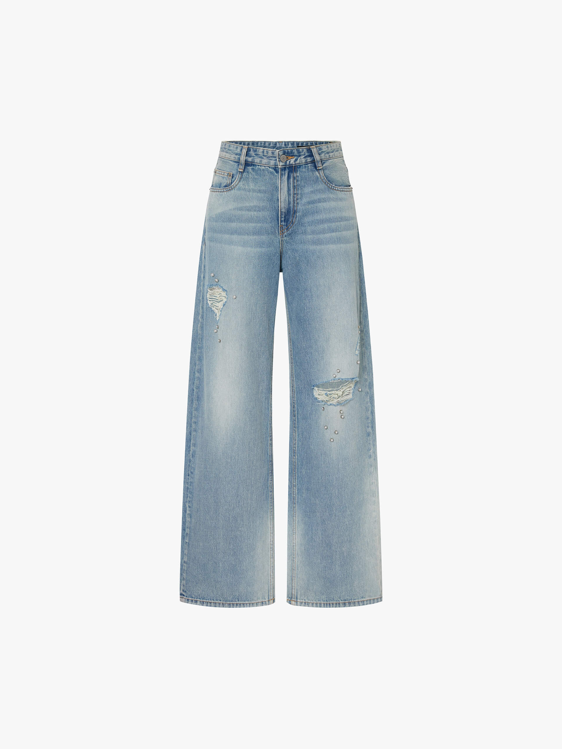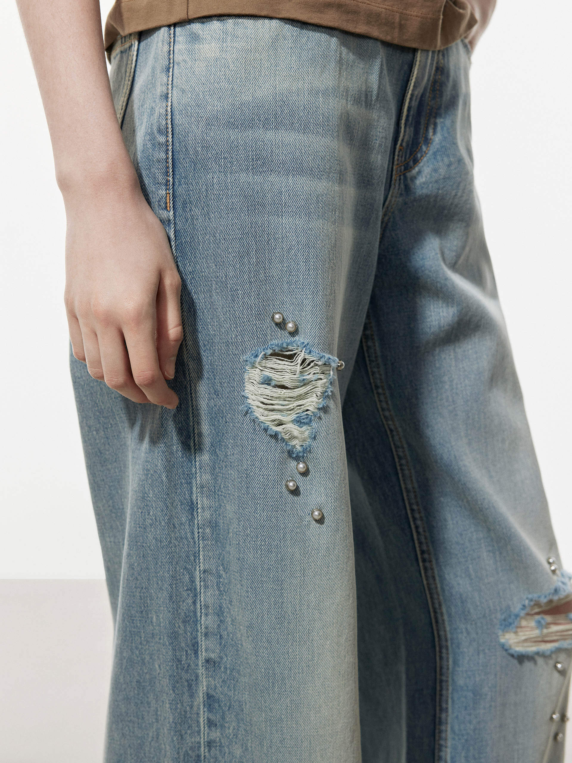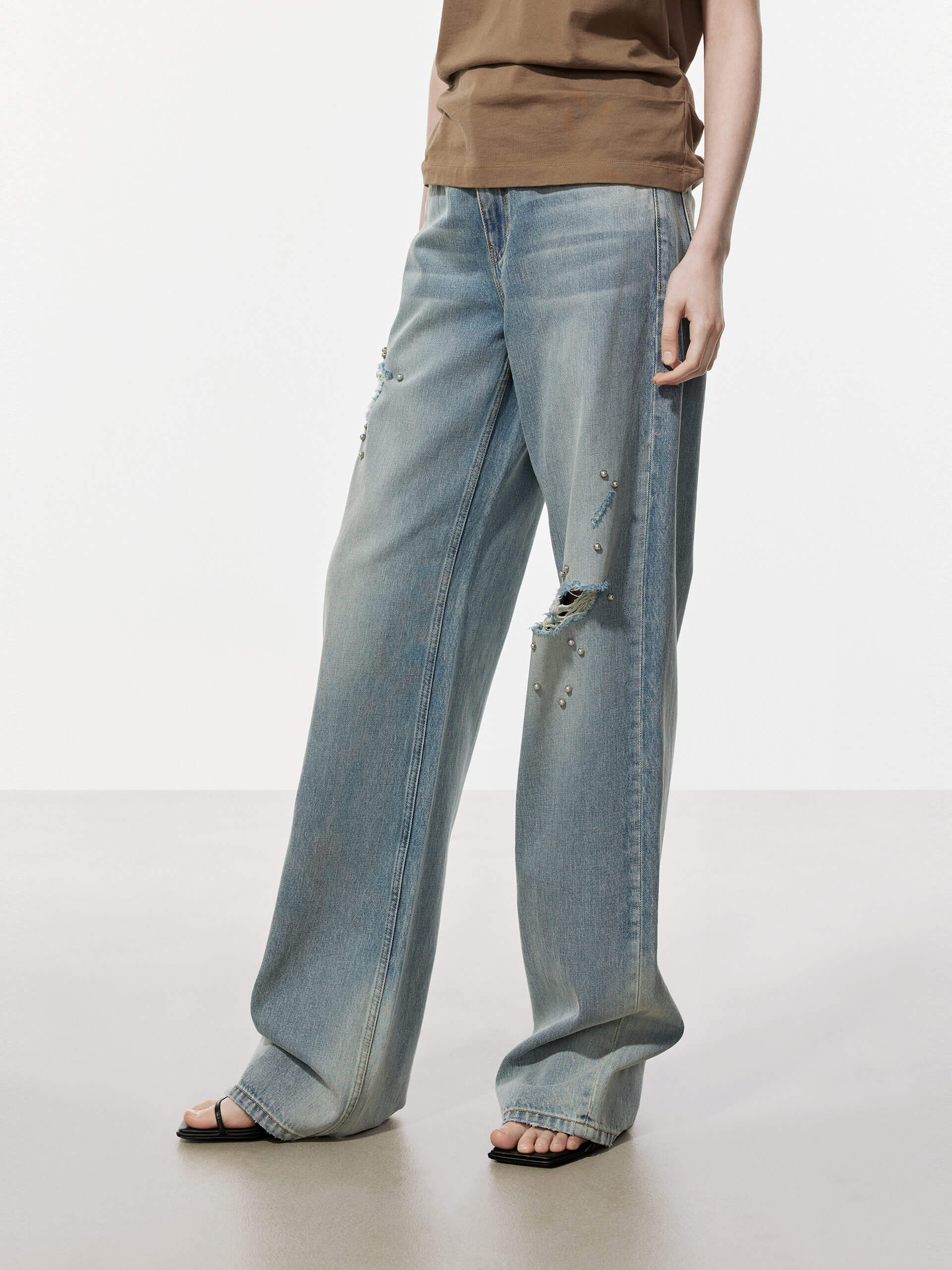 A high-waisted classic, our jeans are crafted from high-quality cotton denim and shaped with straight legs. They have full-length hems and ripped holes designed with intricate bead detailing, adding a touch of edginess to the classic straight cut.