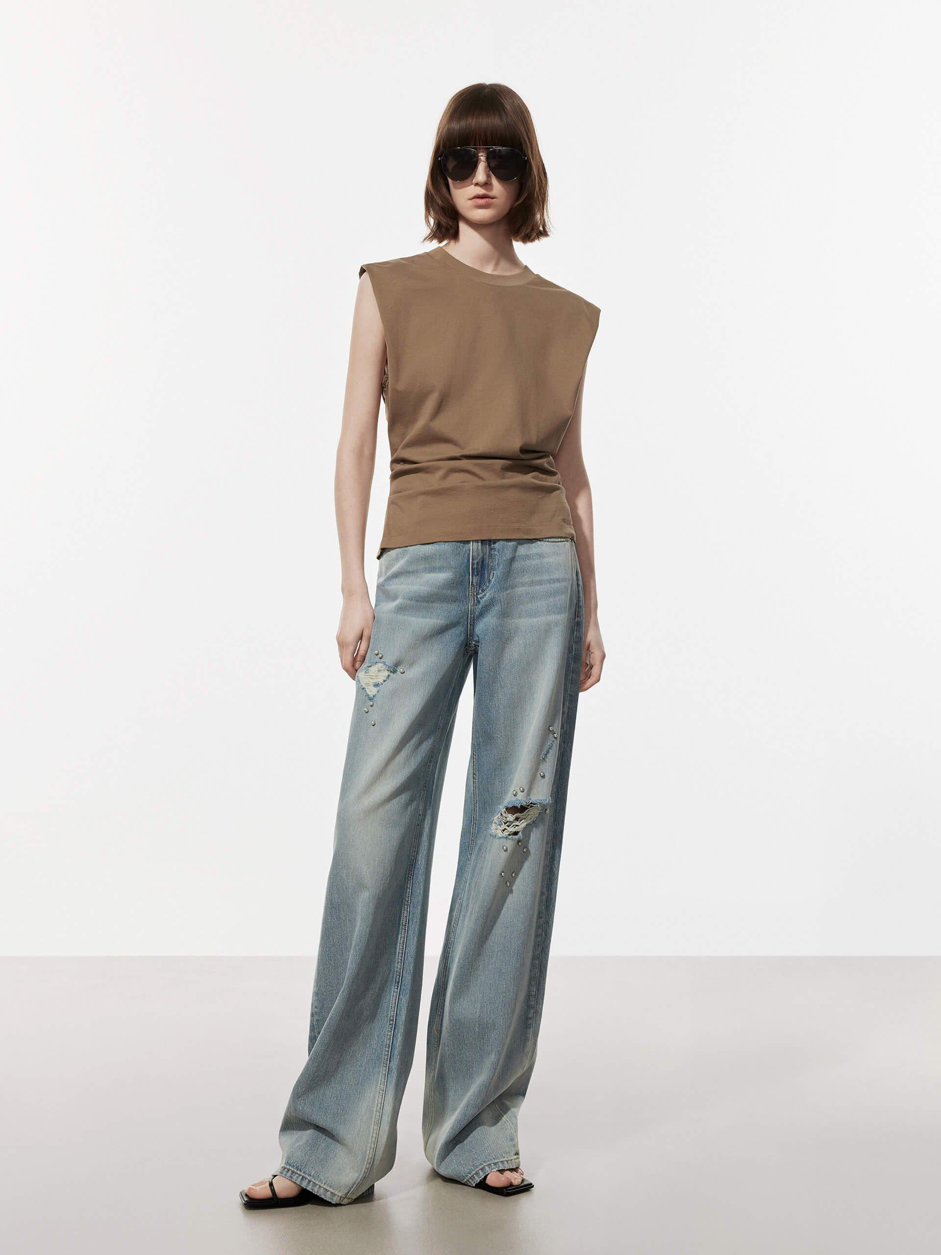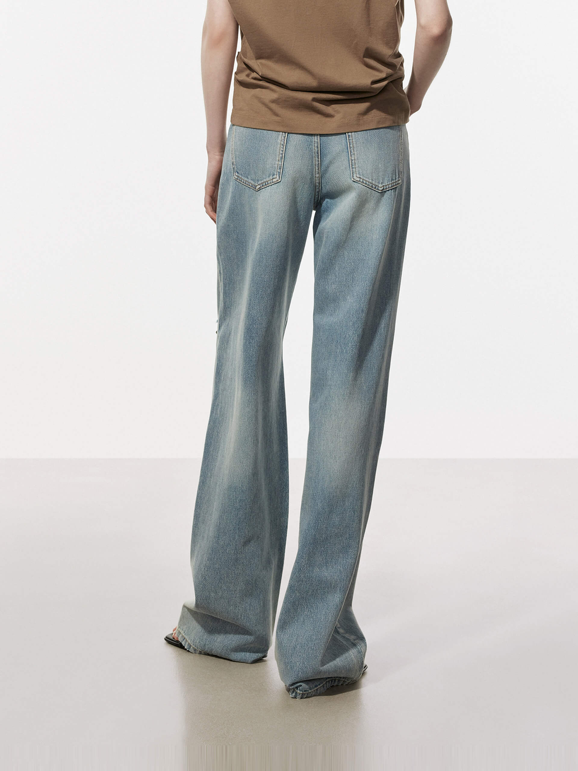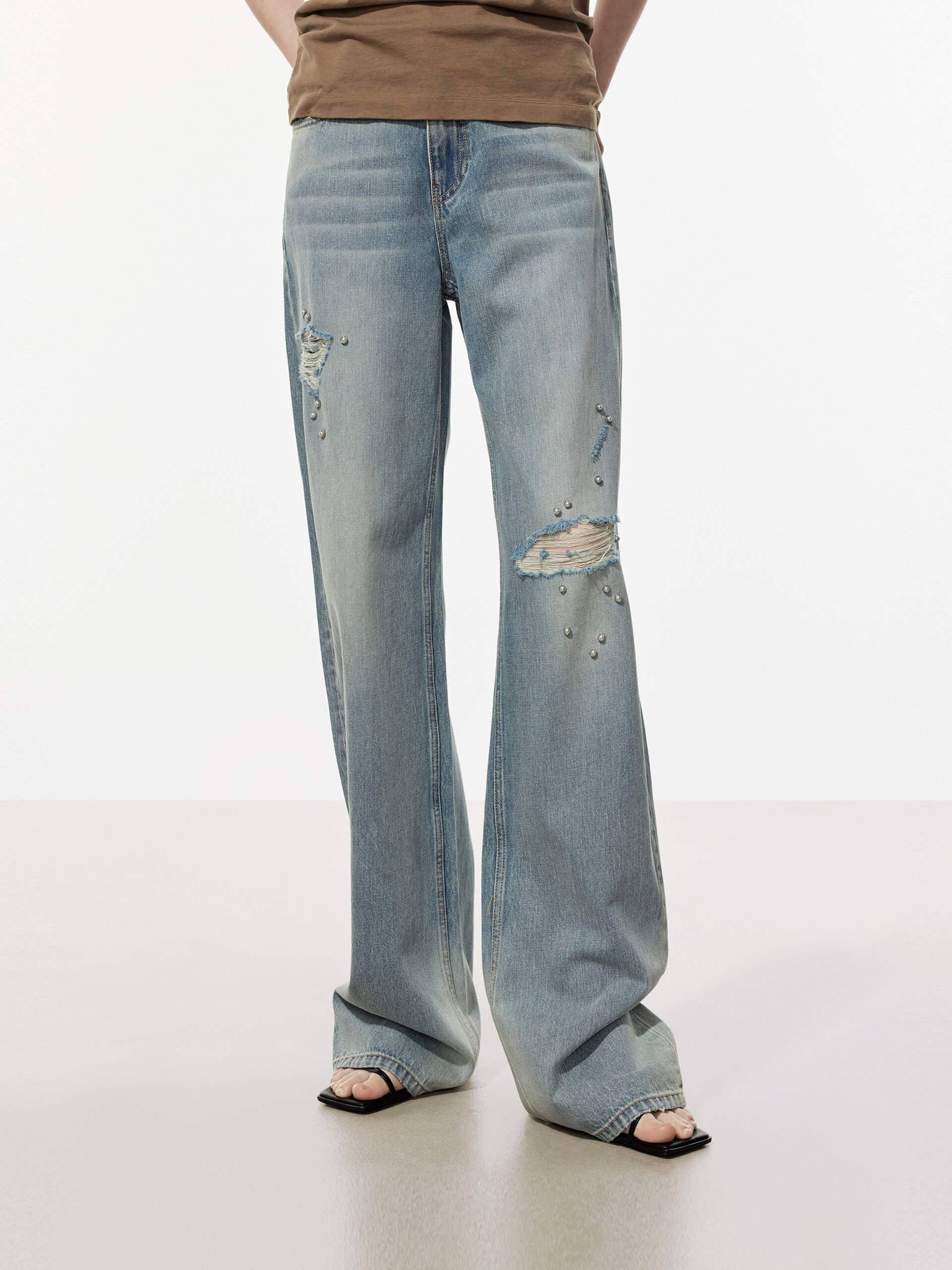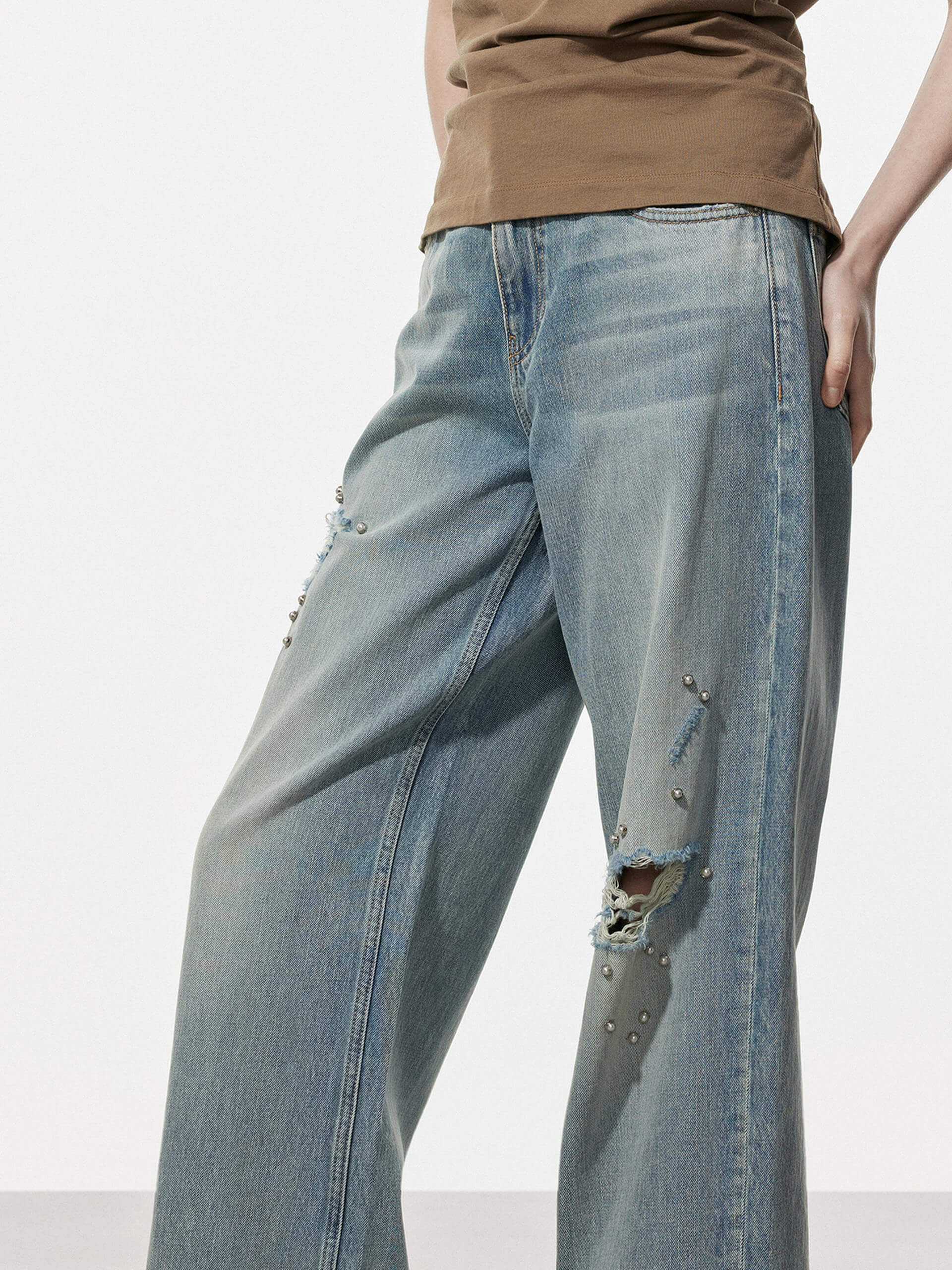 A high-waisted classic, our jeans are crafted from high-quality cotton denim and shaped with straight legs. They have full-length hems and ripped holes designed with intricate bead detailing, adding a touch of edginess to the classic straight cut.
