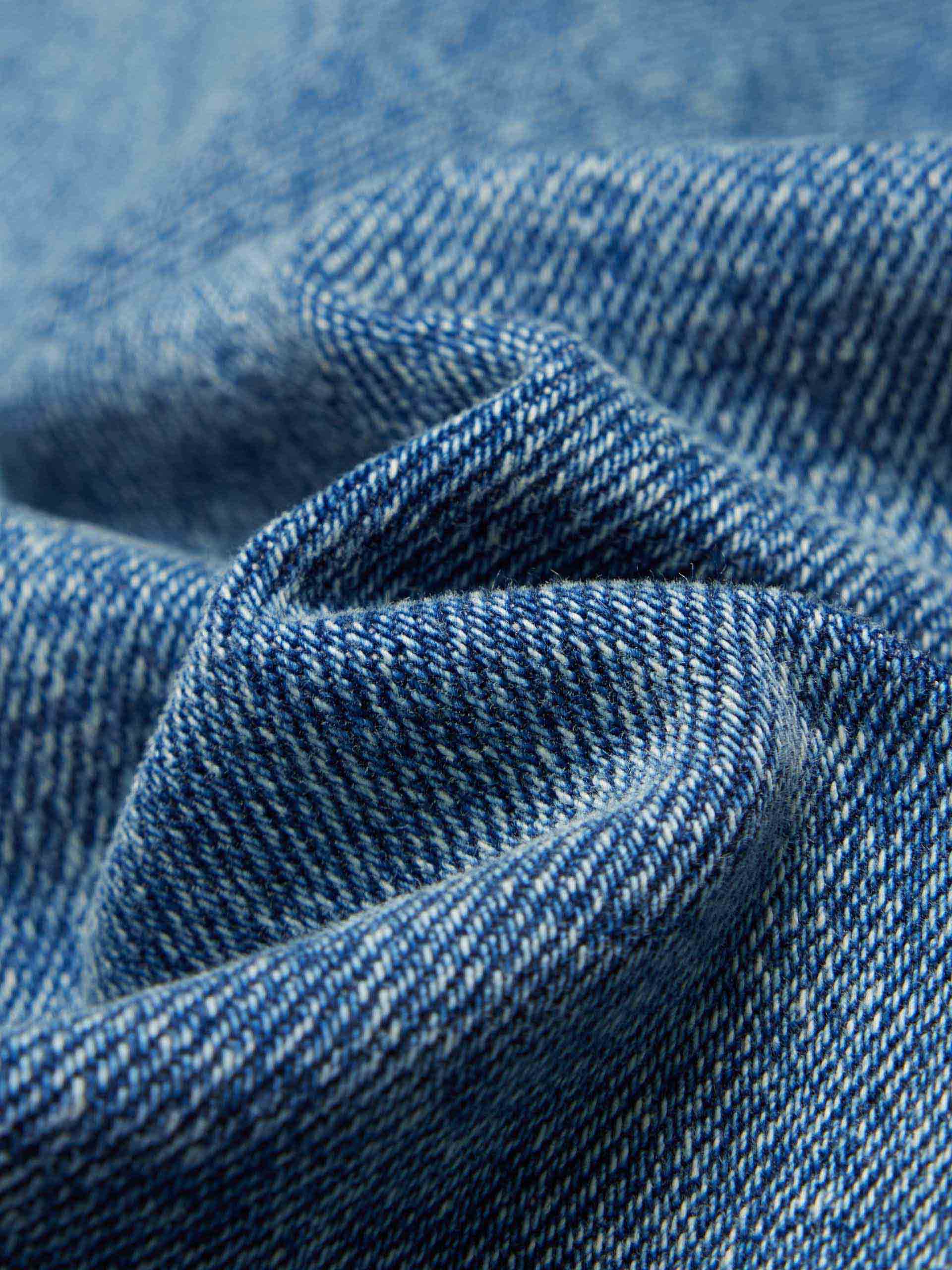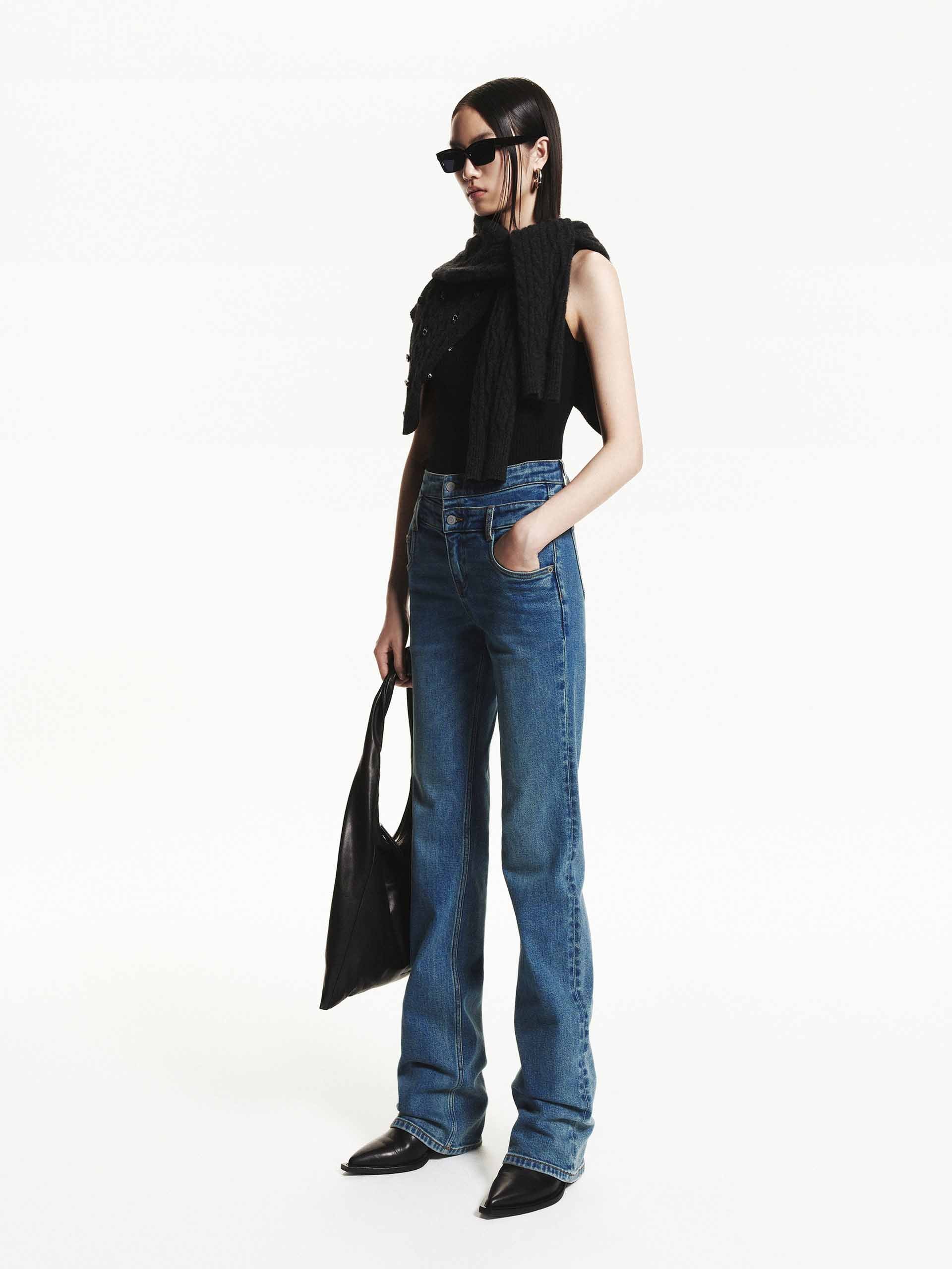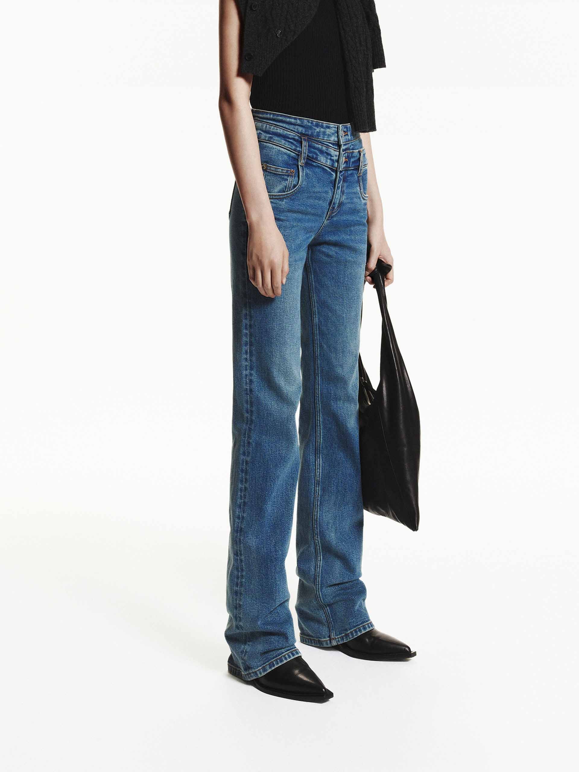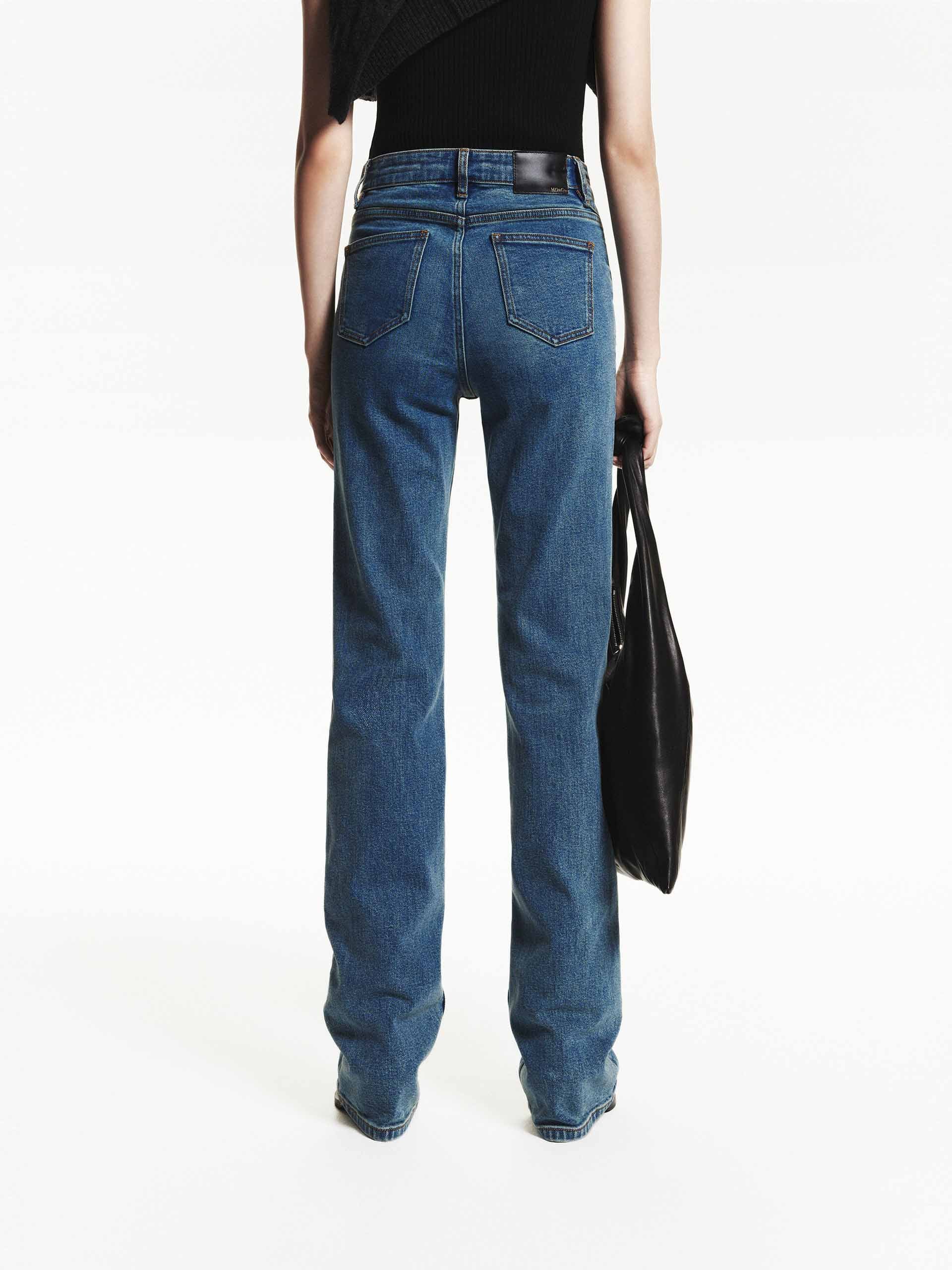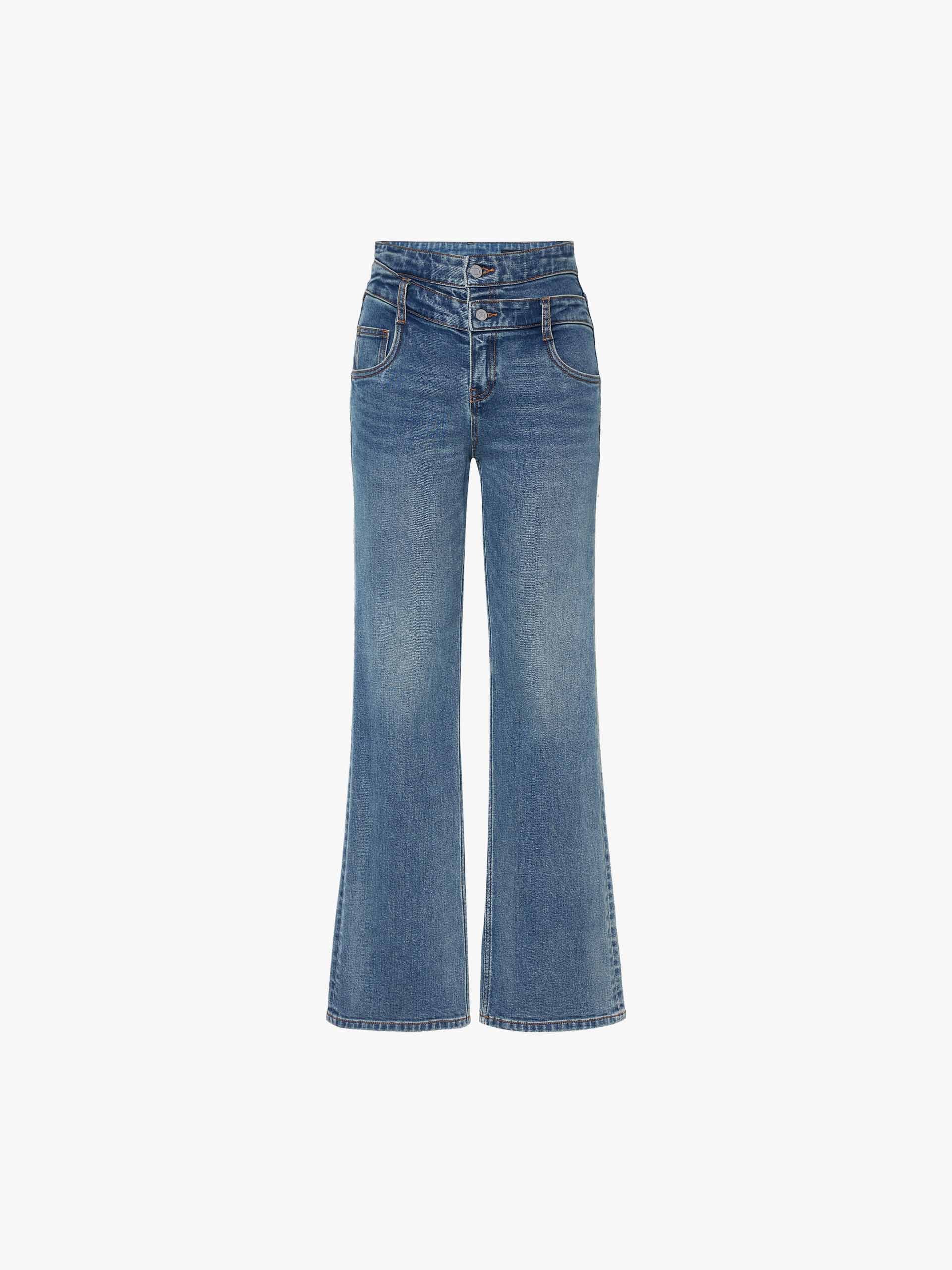 Crafted from a comfortable cotton blend, these jeans feature a slight stretch for added flexibility. The deconstructed double waistband adds a unique touch to the classic straight cut. Feature a high waist and classic five-pocket design.