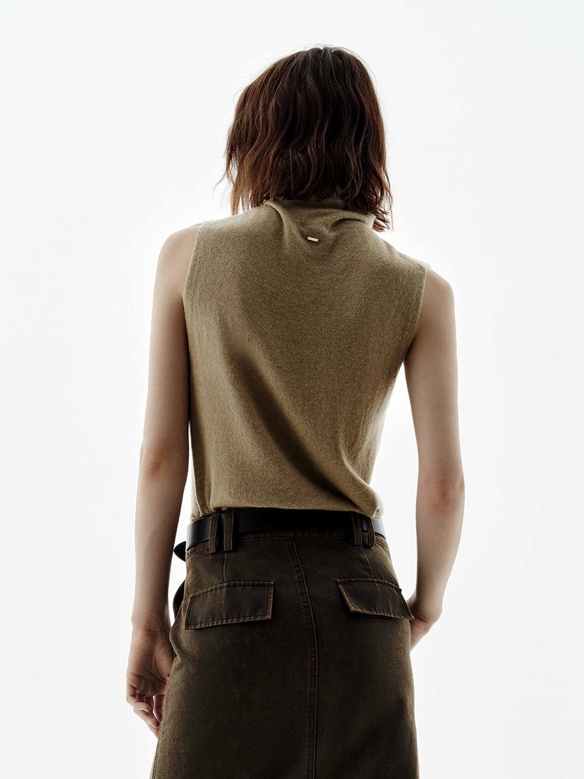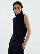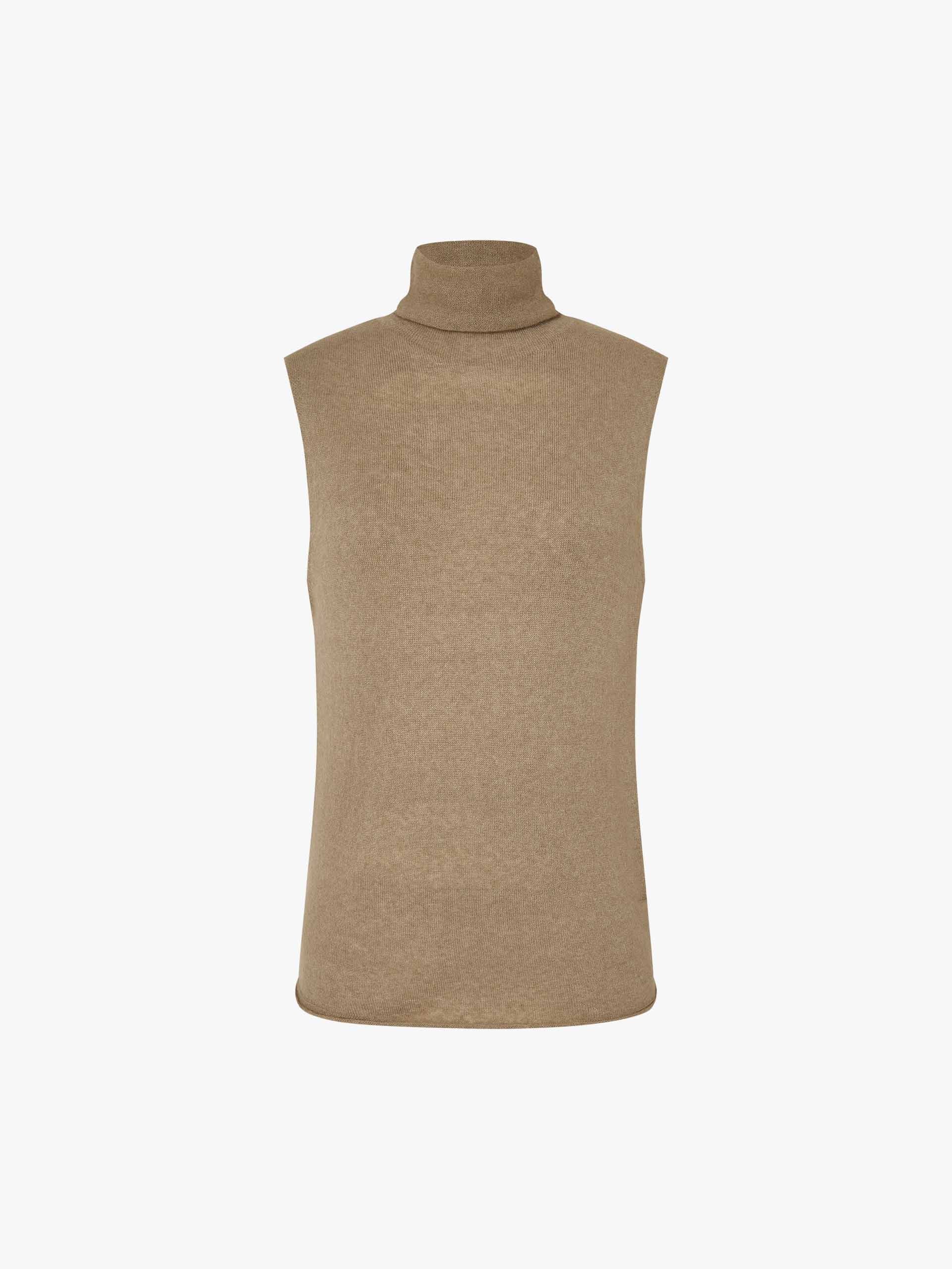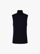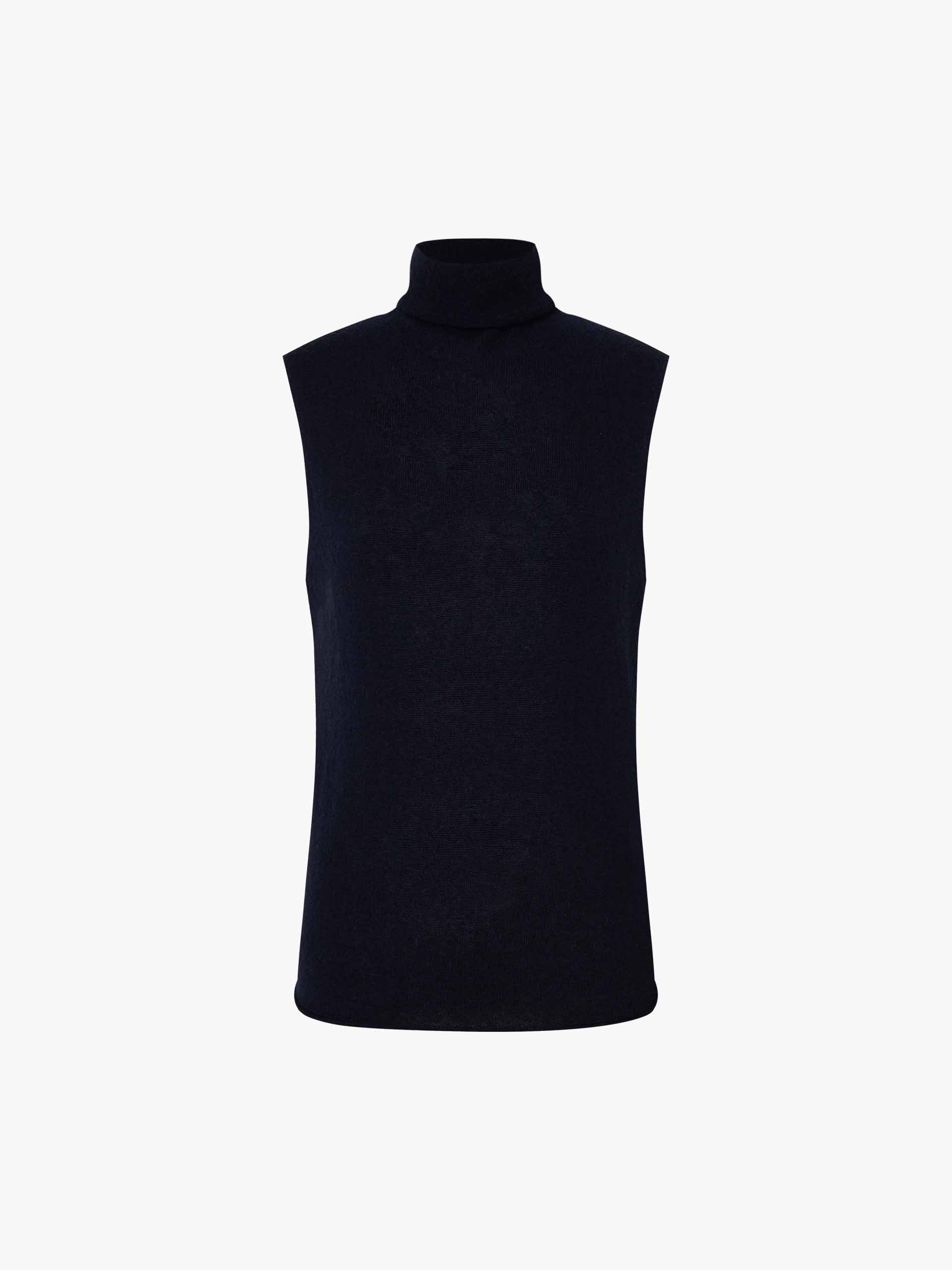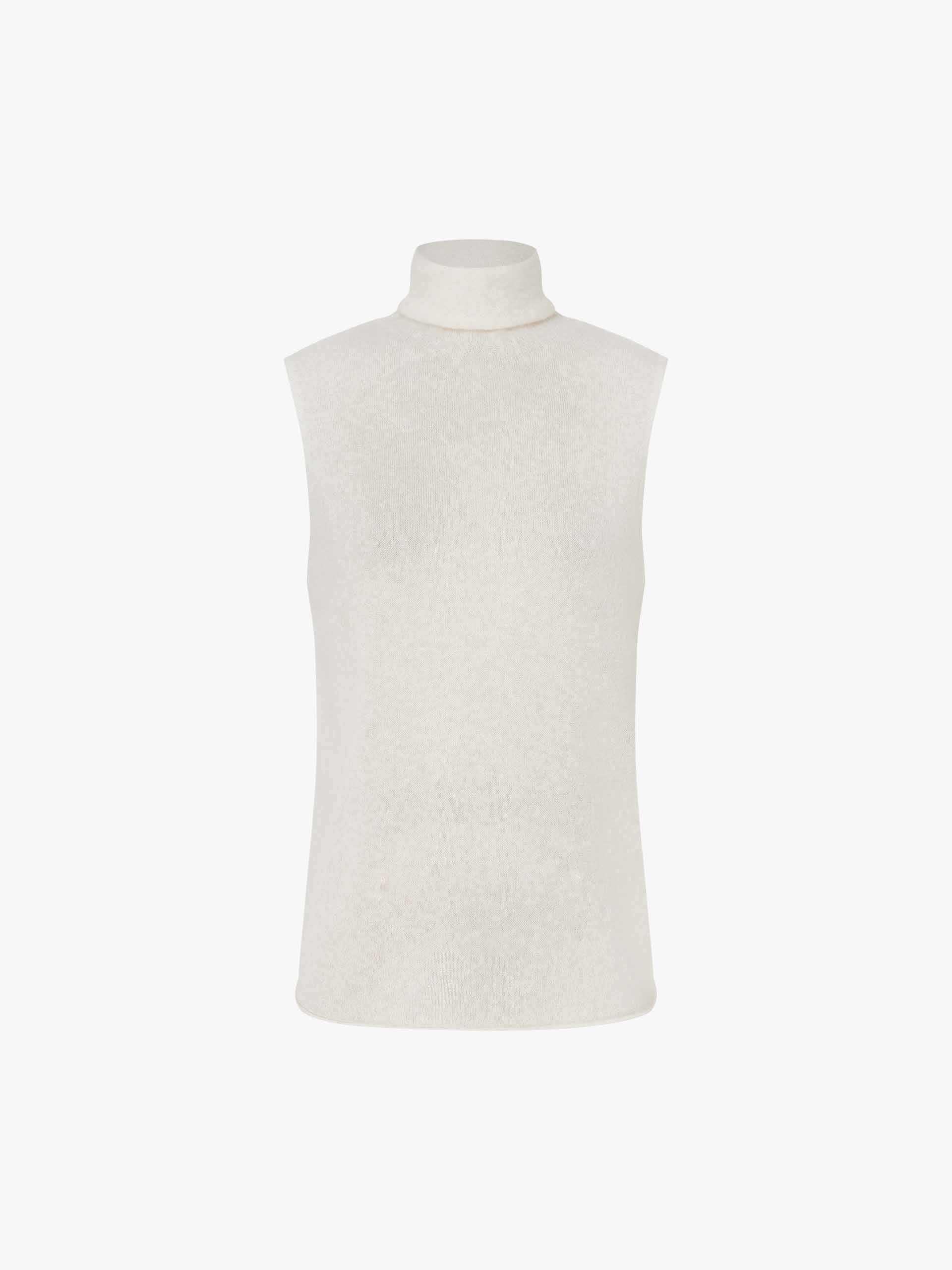 Elevate your layering game with this sweater, a masterful blend of wool, silk, and cashmere that delivers sumptuous softness and effortless sophistication. The slim-fit silhouette skims the body with refined precision, while the high turtleneck adds a touch of timeless elegance. Designed without sleeves for versatile styling, it becomes the perfect foundation for transitional weather.