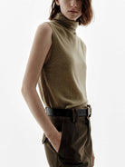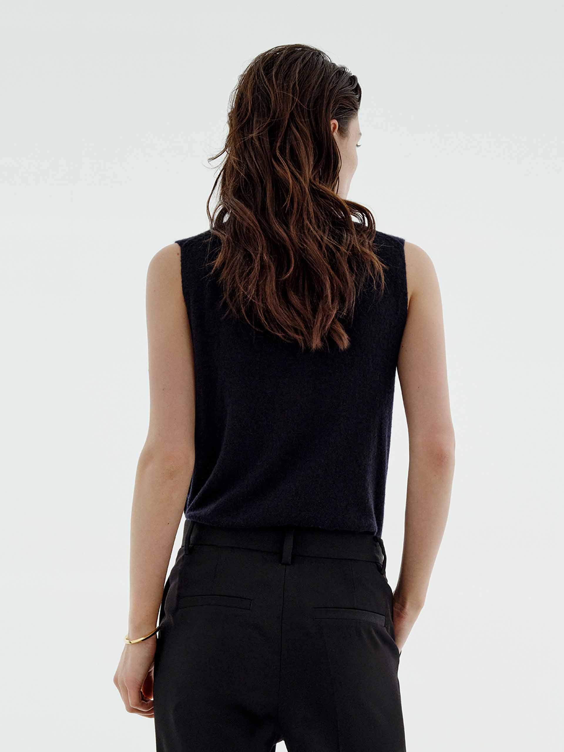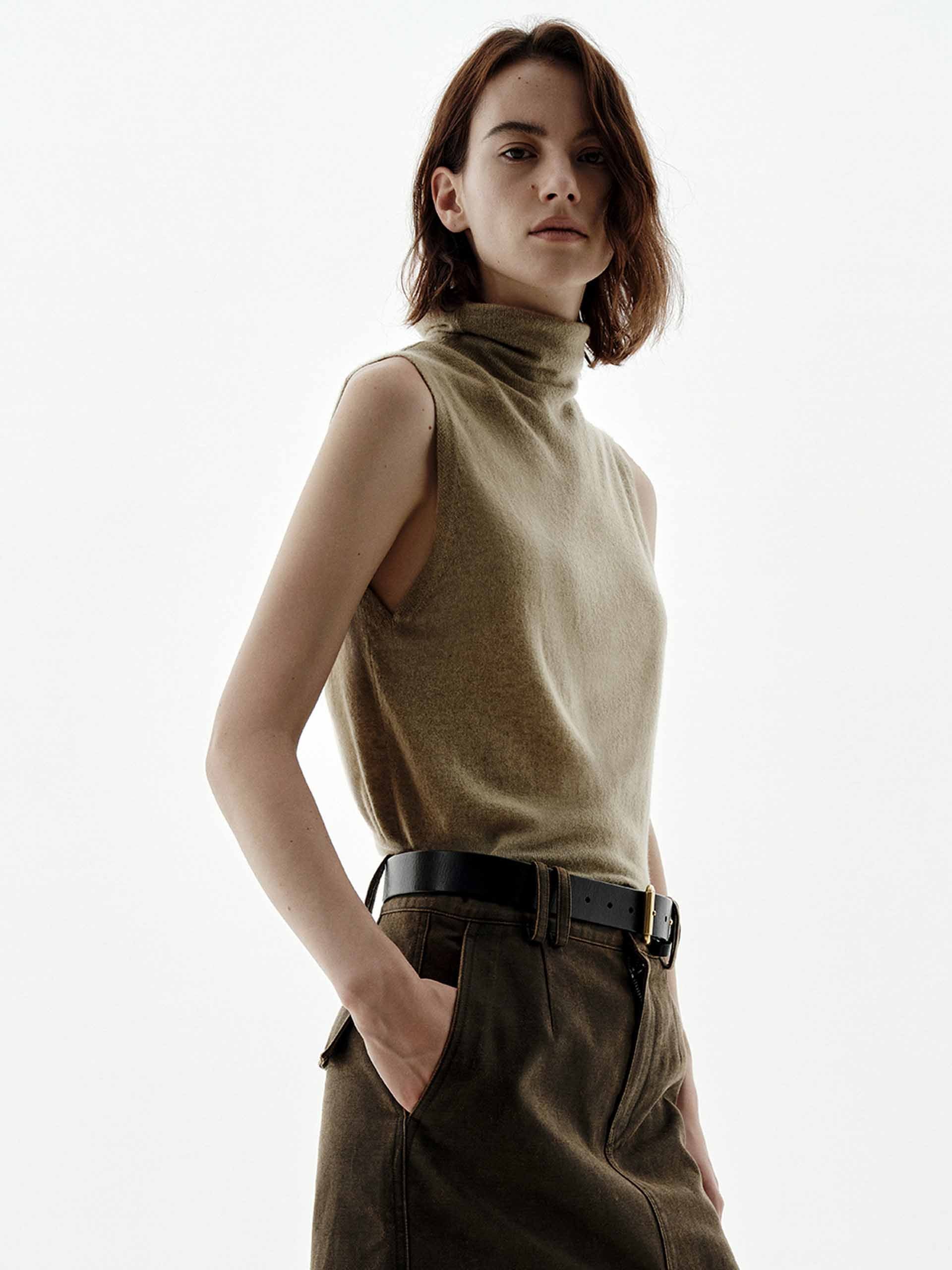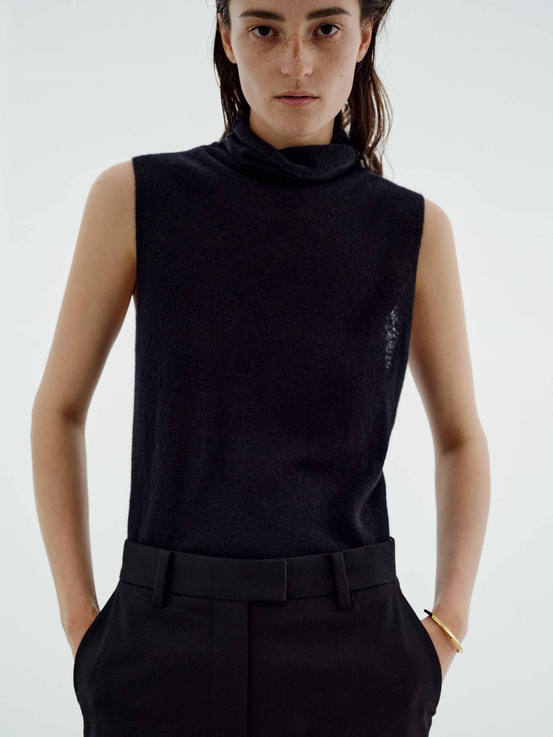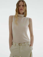 Elevate your layering game with this sweater, a masterful blend of wool, silk, and cashmere that delivers sumptuous softness and effortless sophistication. The slim-fit silhouette skims the body with refined precision, while the high turtleneck adds a touch of timeless elegance. Designed without sleeves for versatile styling, it becomes the perfect foundation for transitional weather.
