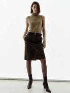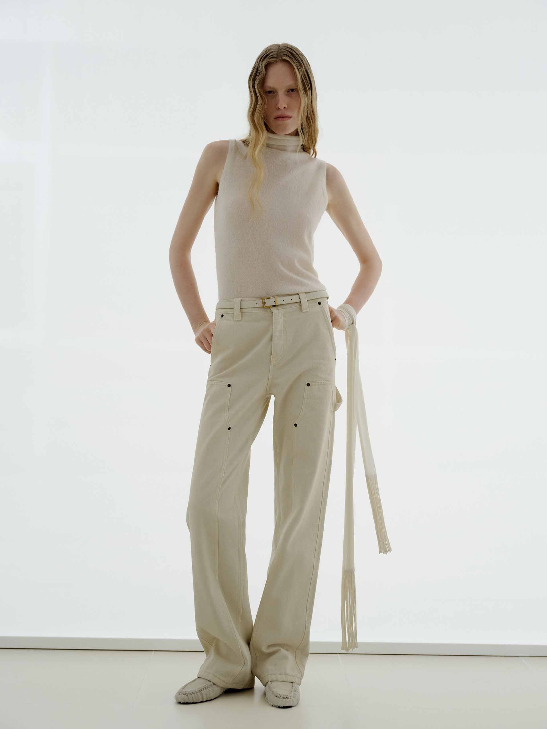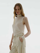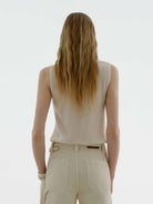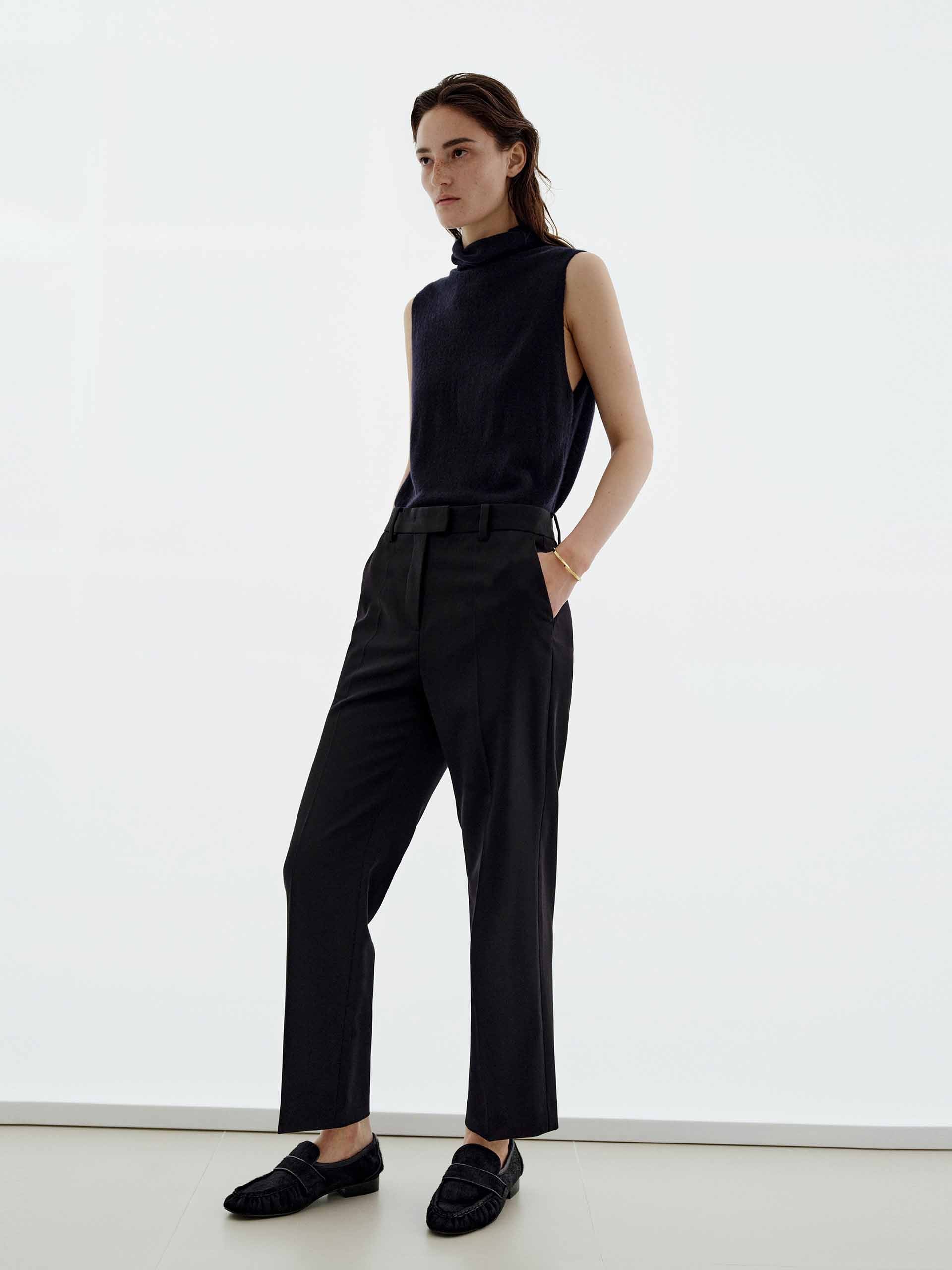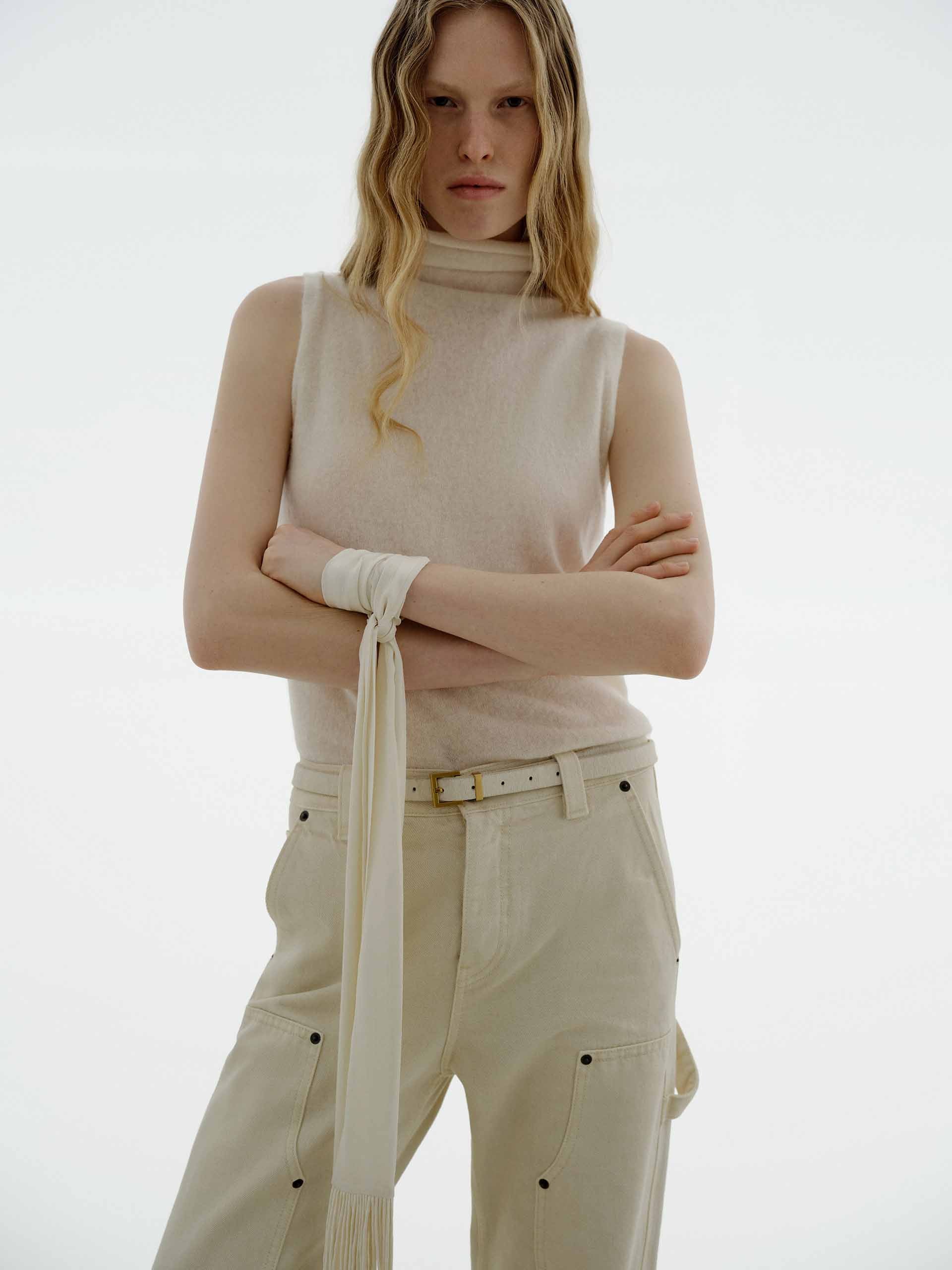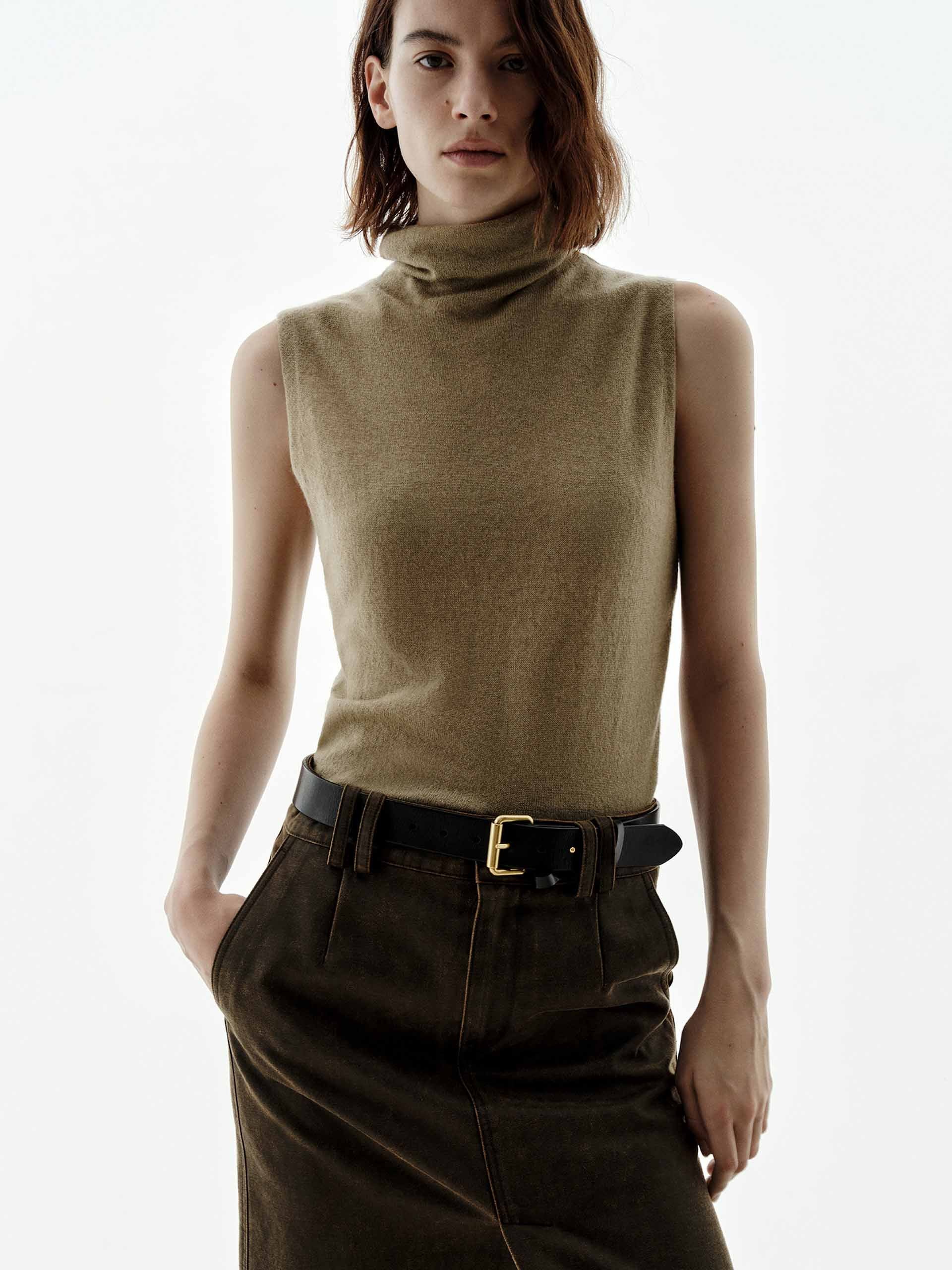 Elevate your layering game with this sweater, a masterful blend of wool, silk, and cashmere that delivers sumptuous softness and effortless sophistication. The slim-fit silhouette skims the body with refined precision, while the high turtleneck adds a touch of timeless elegance. Designed without sleeves for versatile styling, it becomes the perfect foundation for transitional weather.
