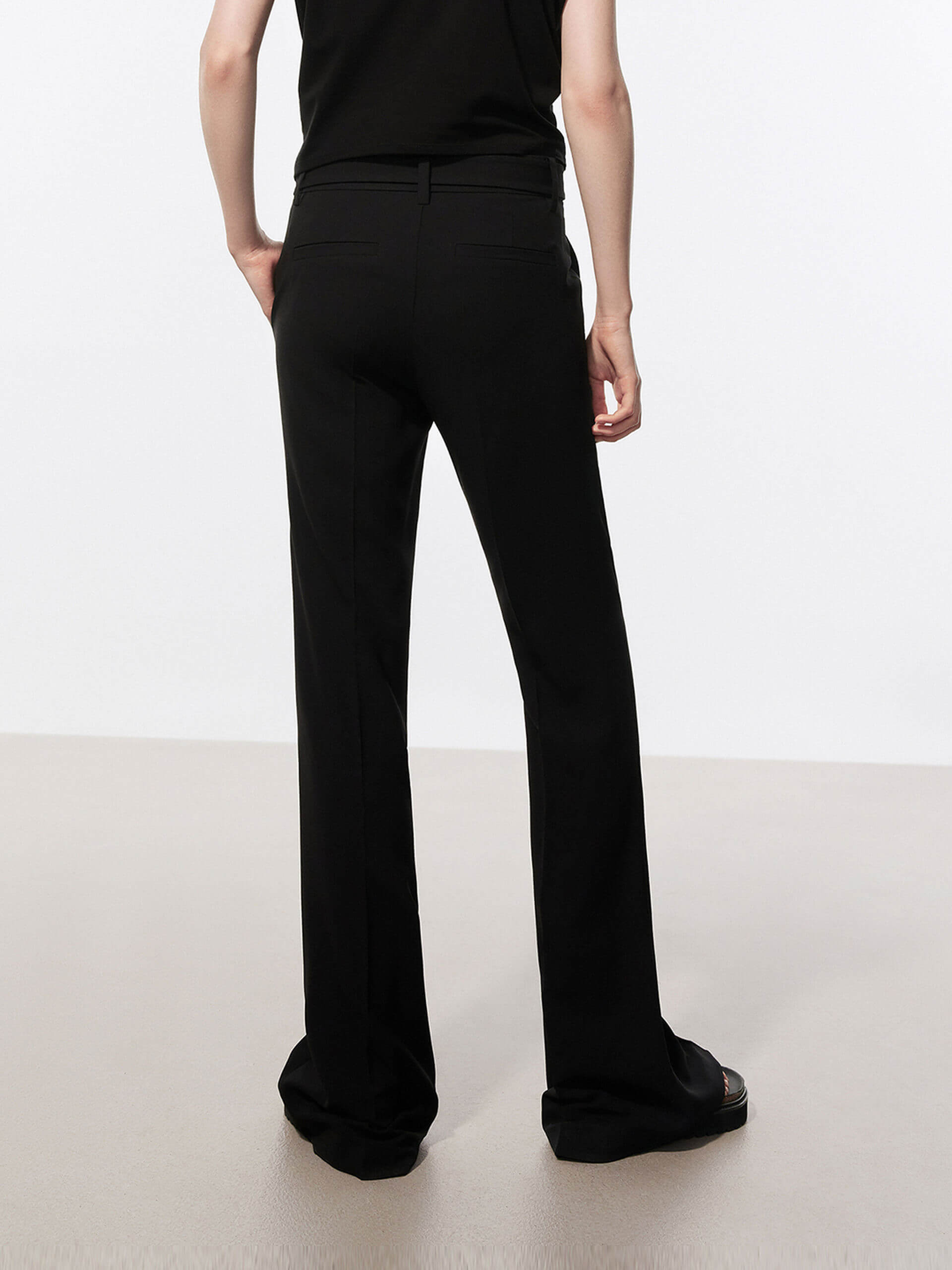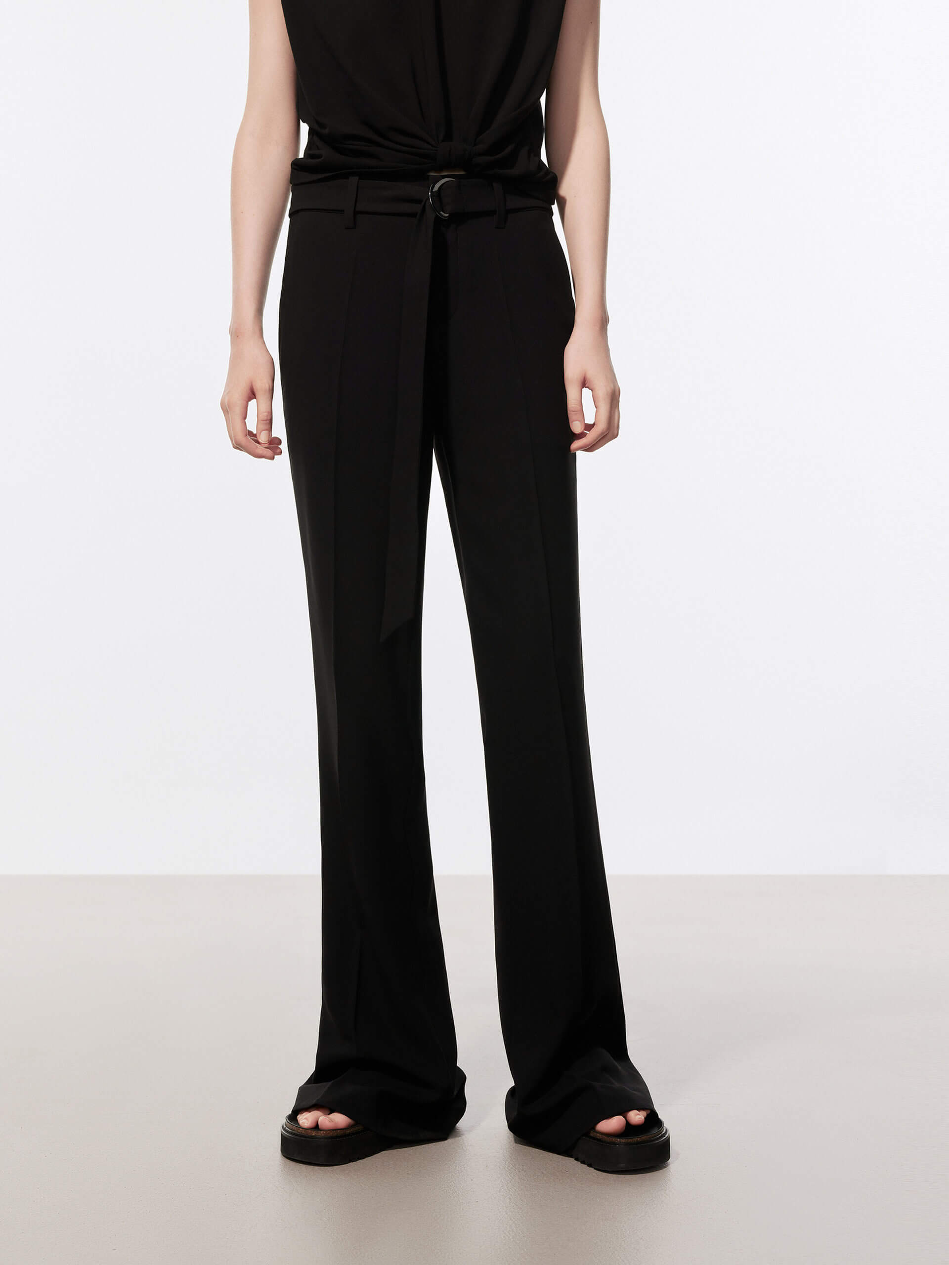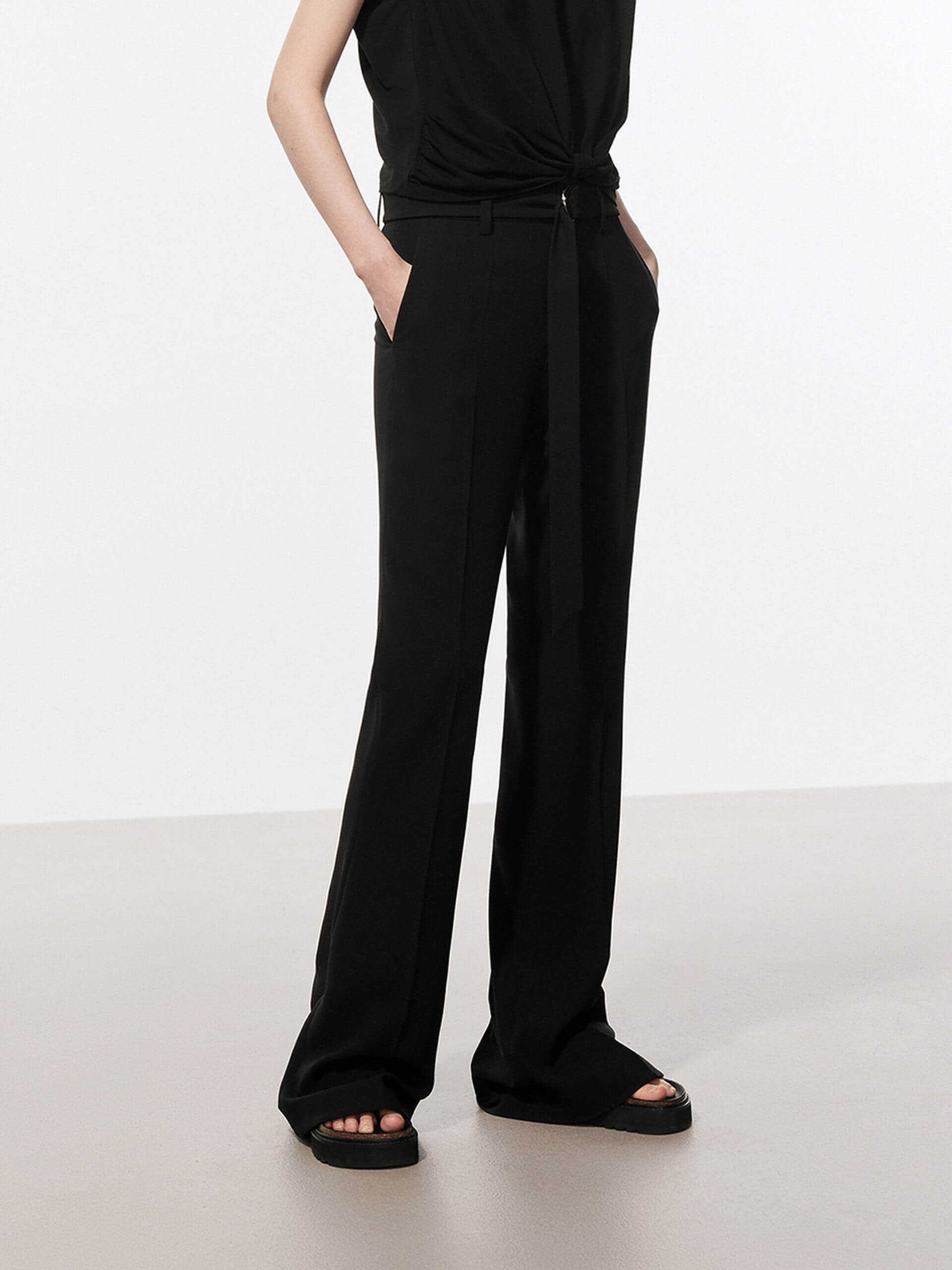 These trousers are made from a blend of acetate and polyester materials, making them comfortable and long-lasting. Feature a straight-leg and slightly flared hem, providing a modern, sleek look that flatters many body types. The included belt adds a touch of sophistication and allows for adjustability in fit. Paired with tops and shoes to create stylish looks, making them a versatile addition to any wardrobe.