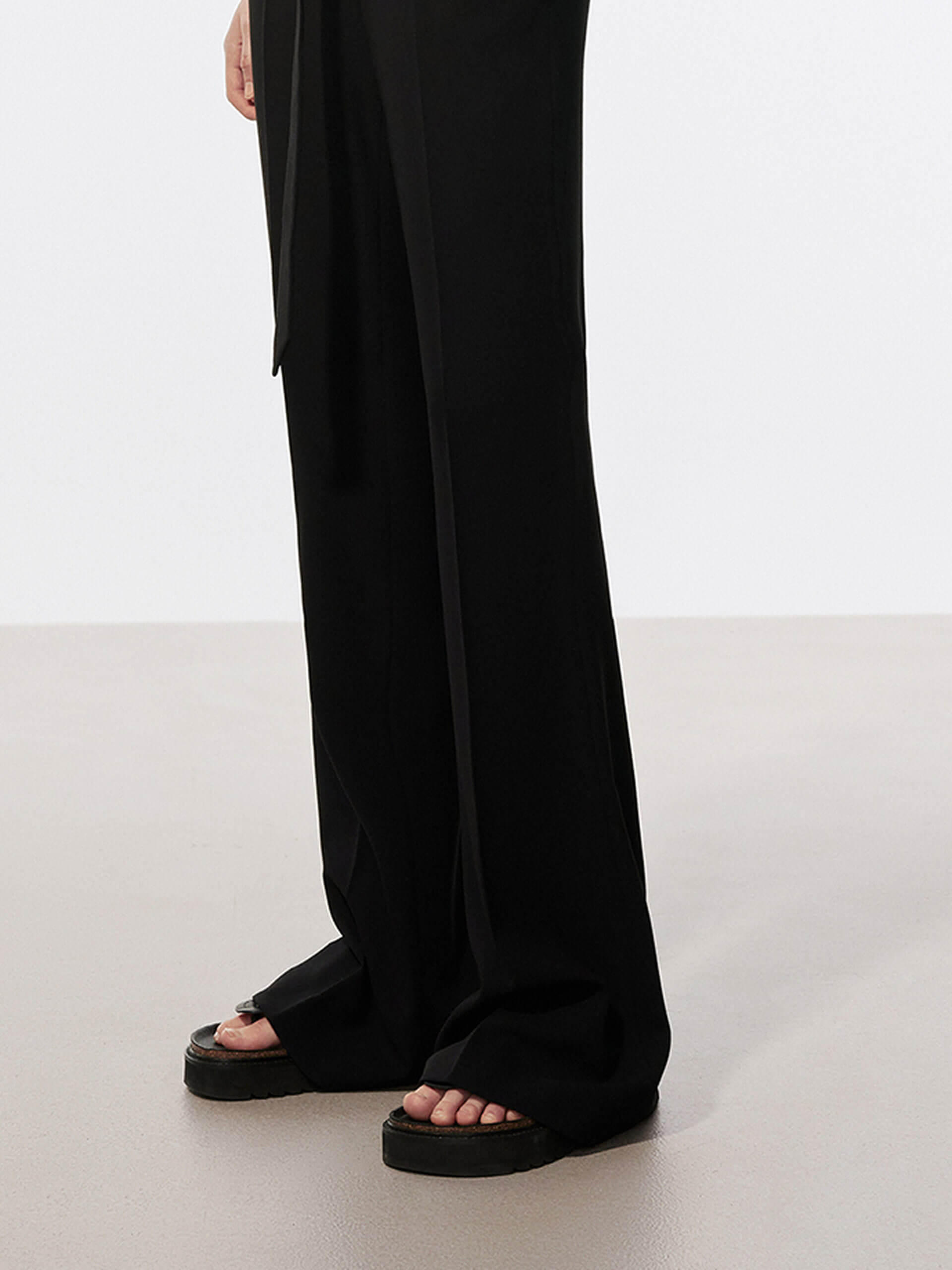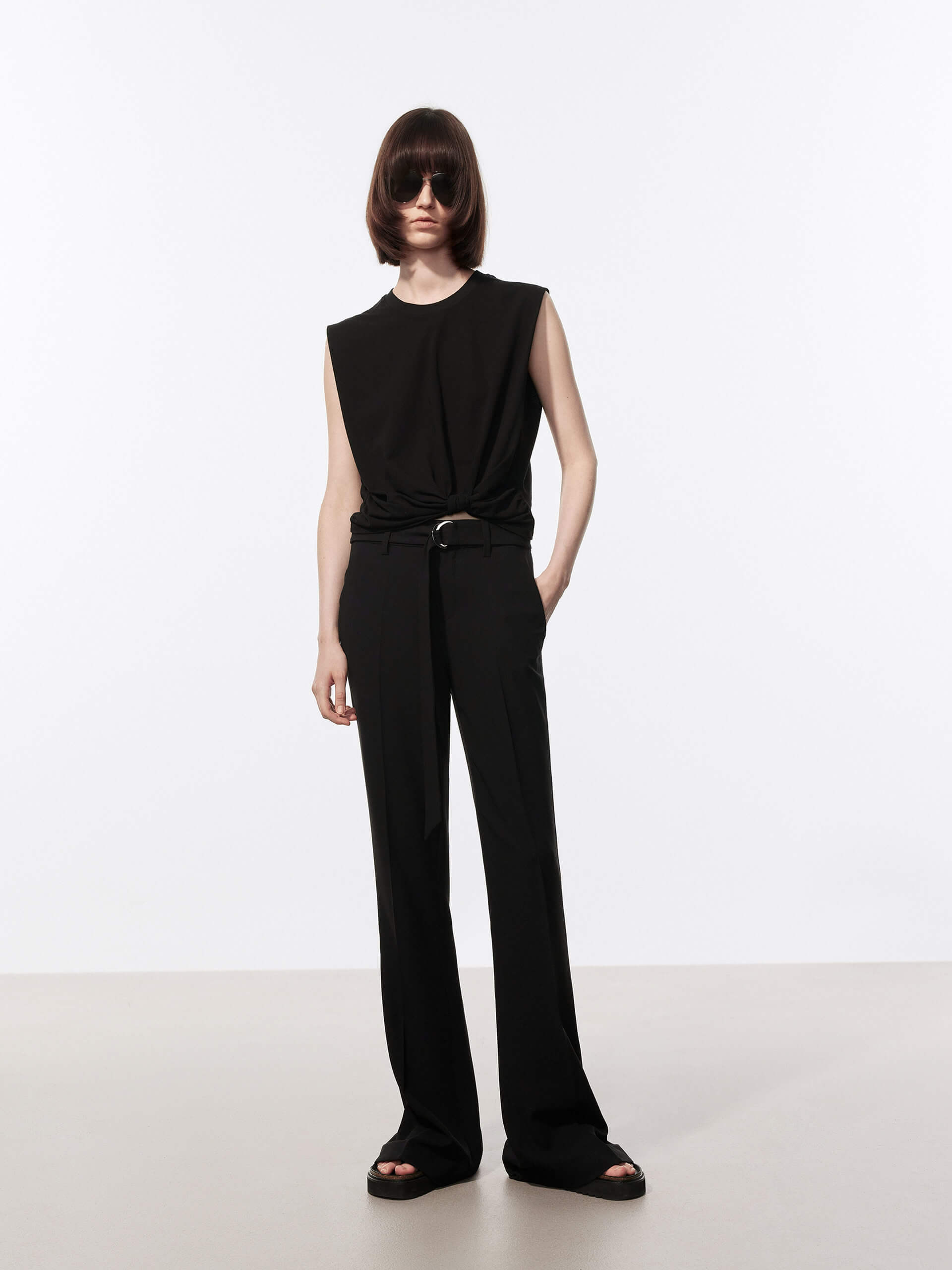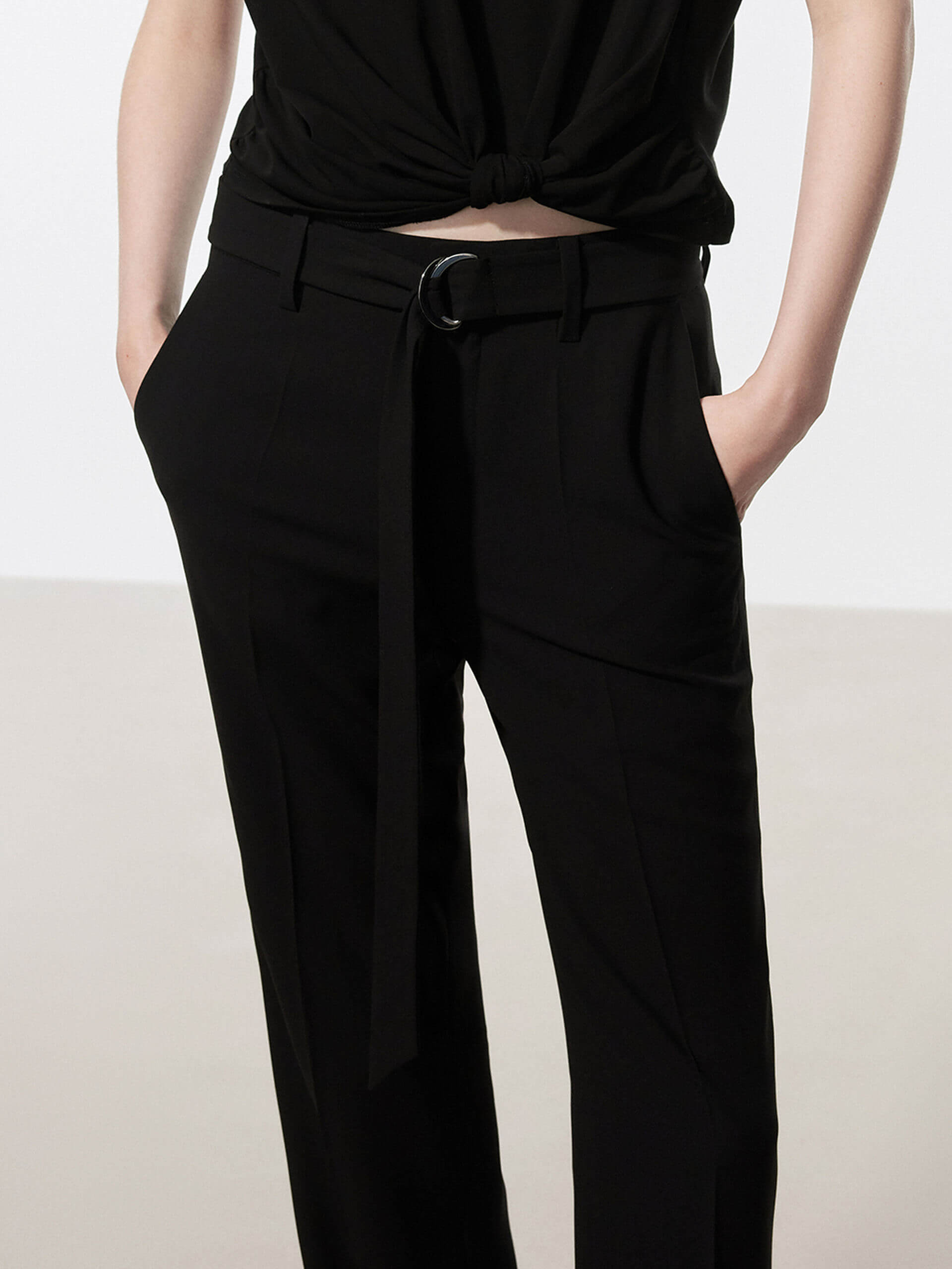 These trousers are made from a blend of acetate and polyester materials, making them comfortable and long-lasting. Feature a straight-leg and slightly flared hem, providing a modern, sleek look that flatters many body types. The included belt adds a touch of sophistication and allows for adjustability in fit. Paired with tops and shoes to create stylish looks, making them a versatile addition to any wardrobe.