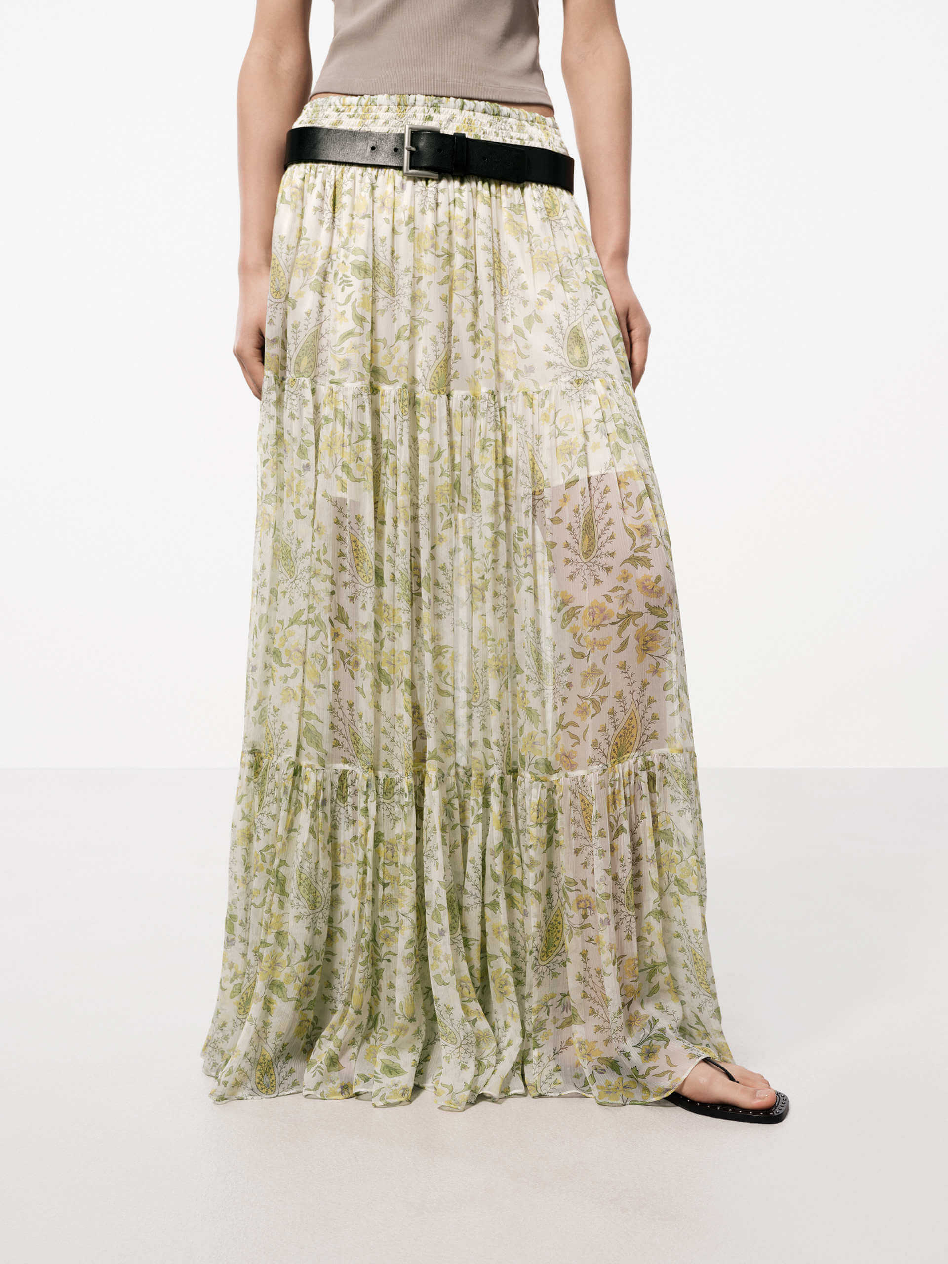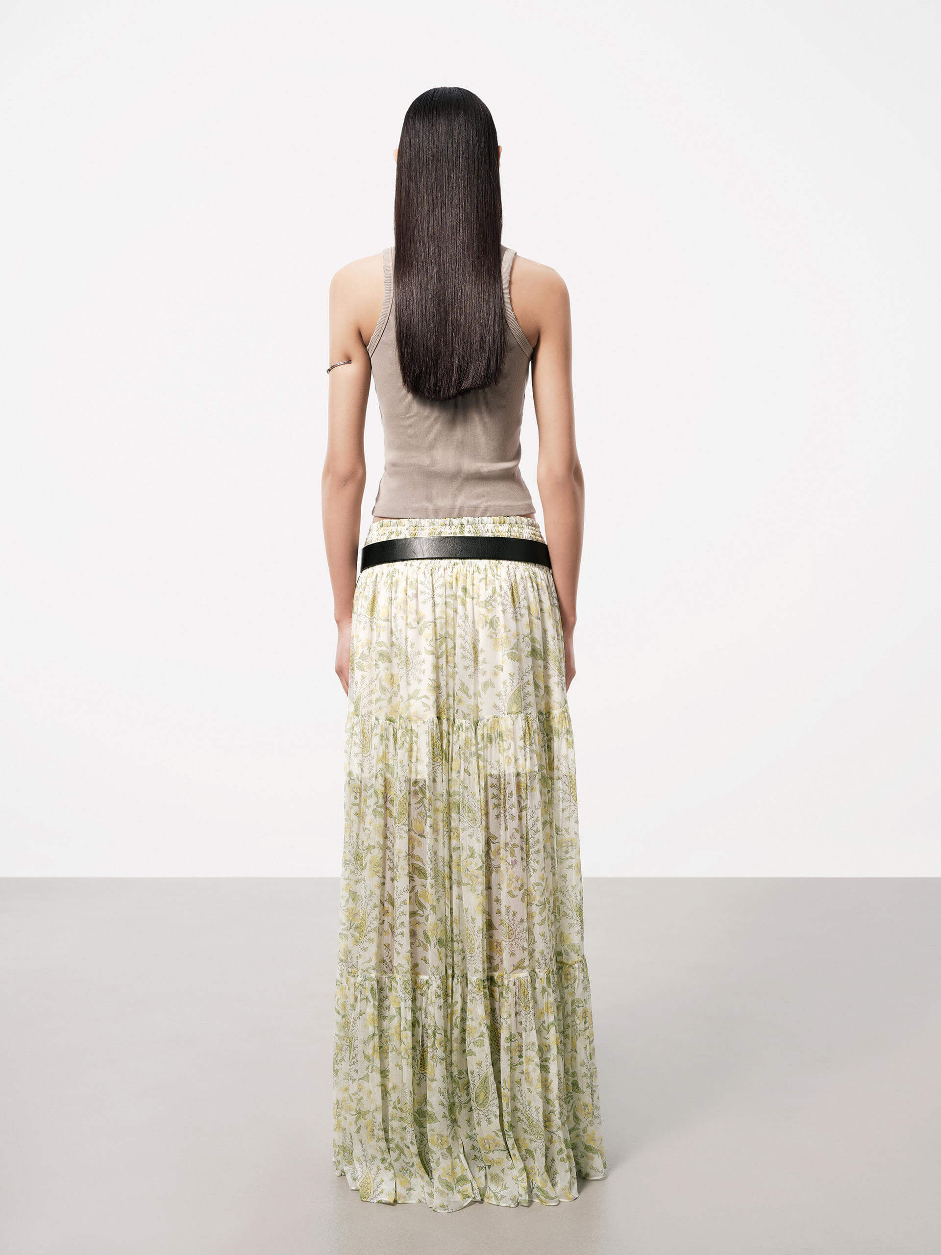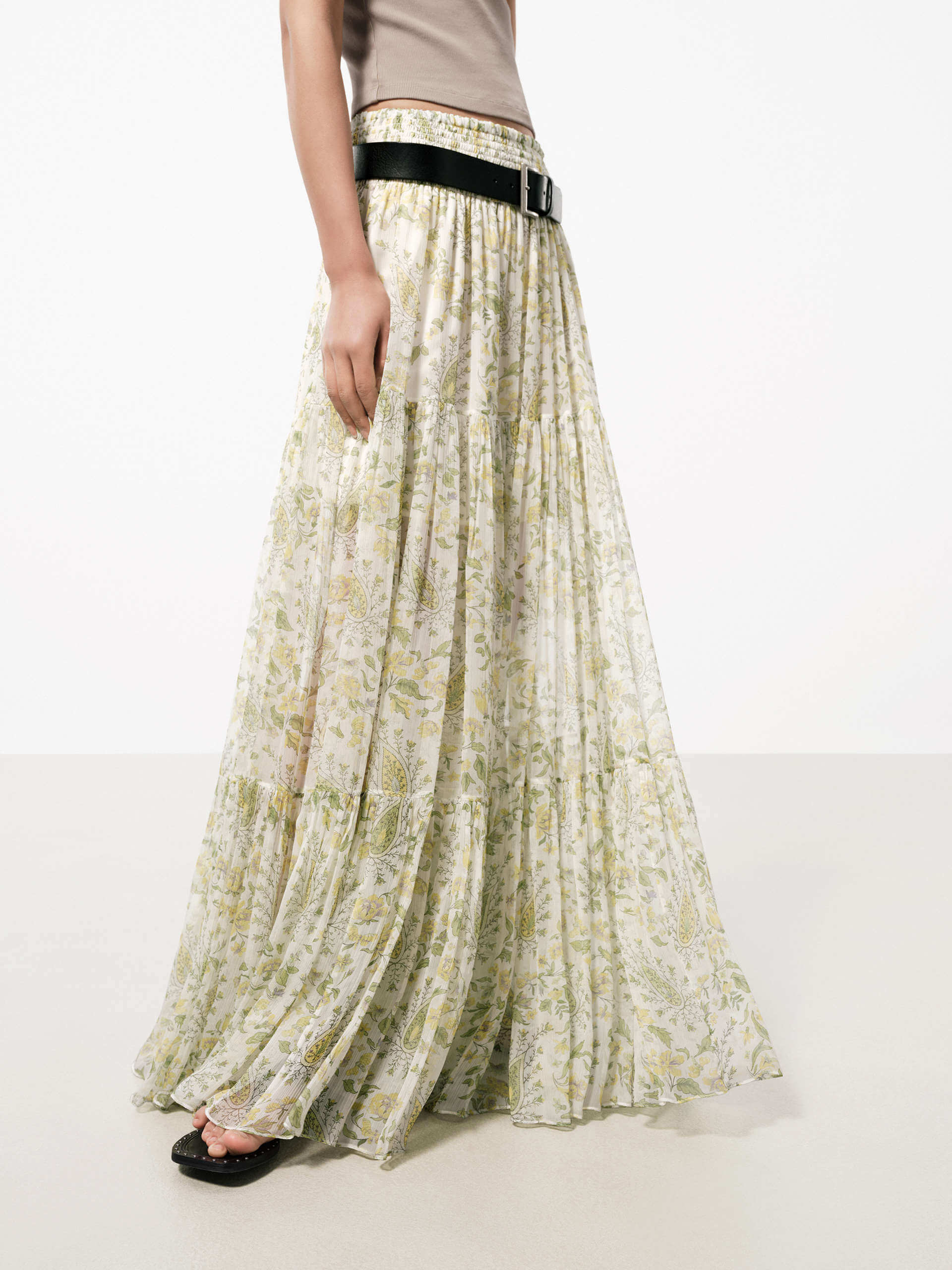 This stunning floral print flowy maxi skirt is made from comfortable chiffon fabric and features a graceful long silhouette. The delicate pleat details and soft green color with floral print are perfectly complemented by the elastic waistband for a flattering fit. Includes a mini lining skirt for added coverage.