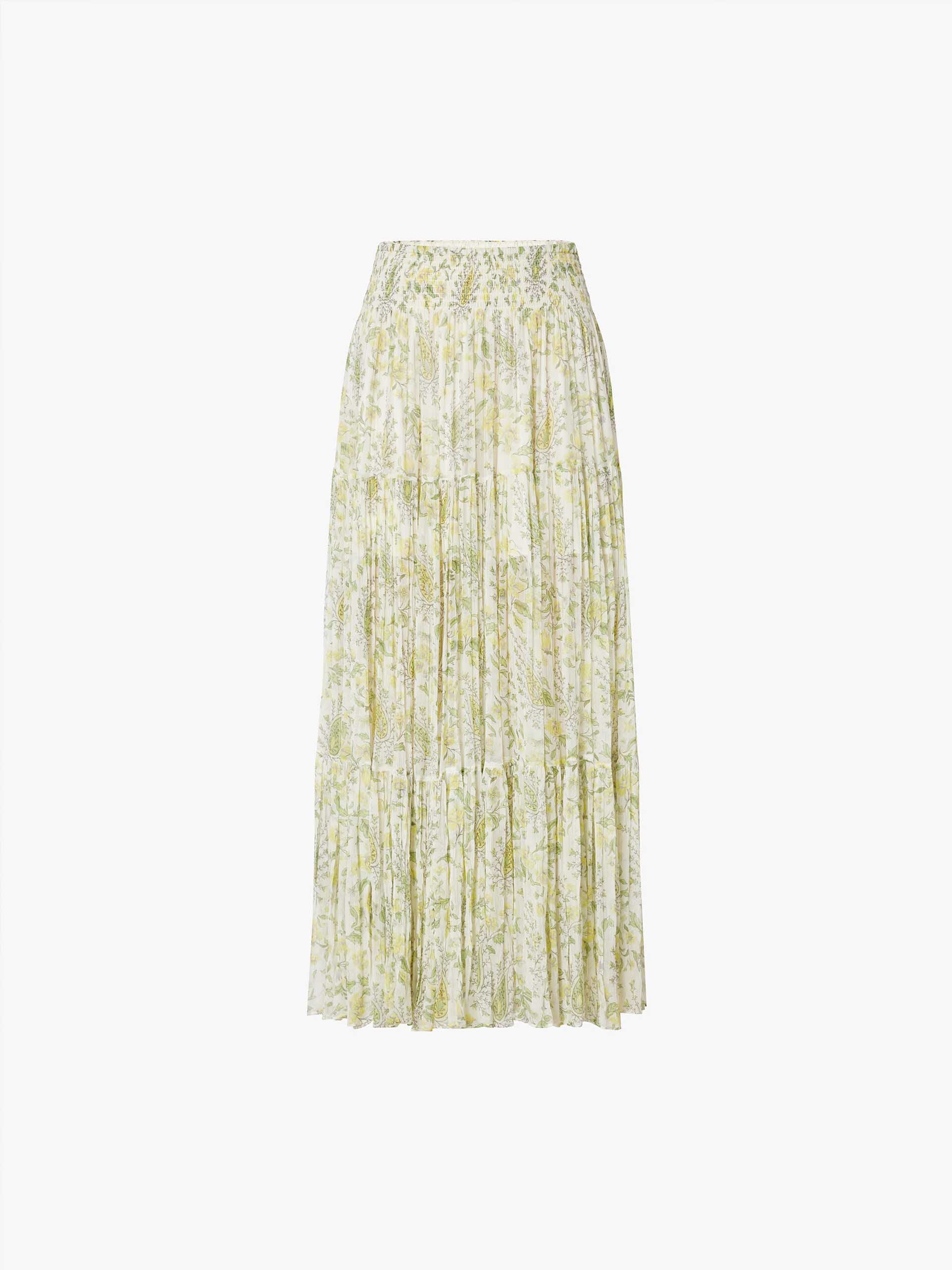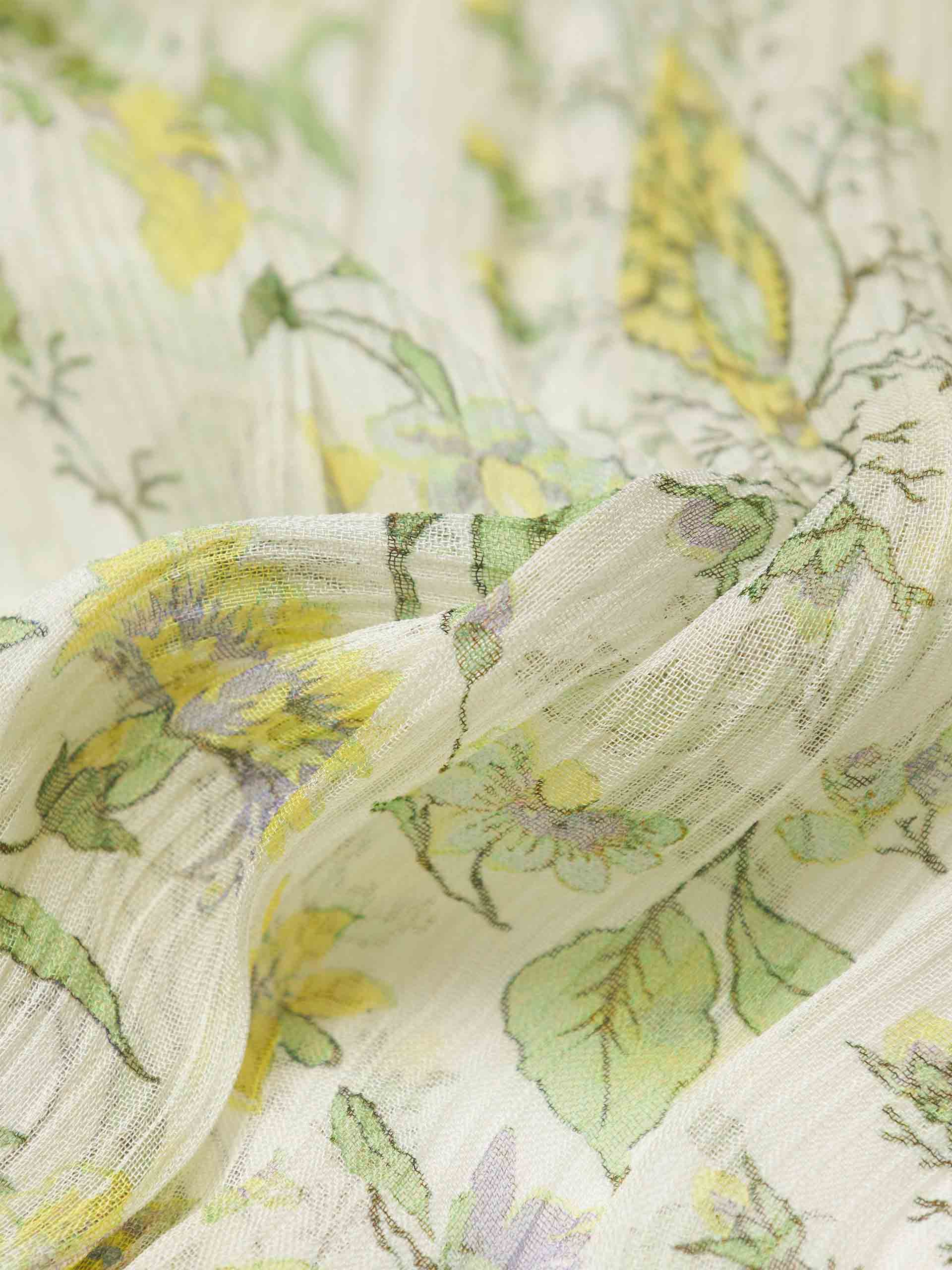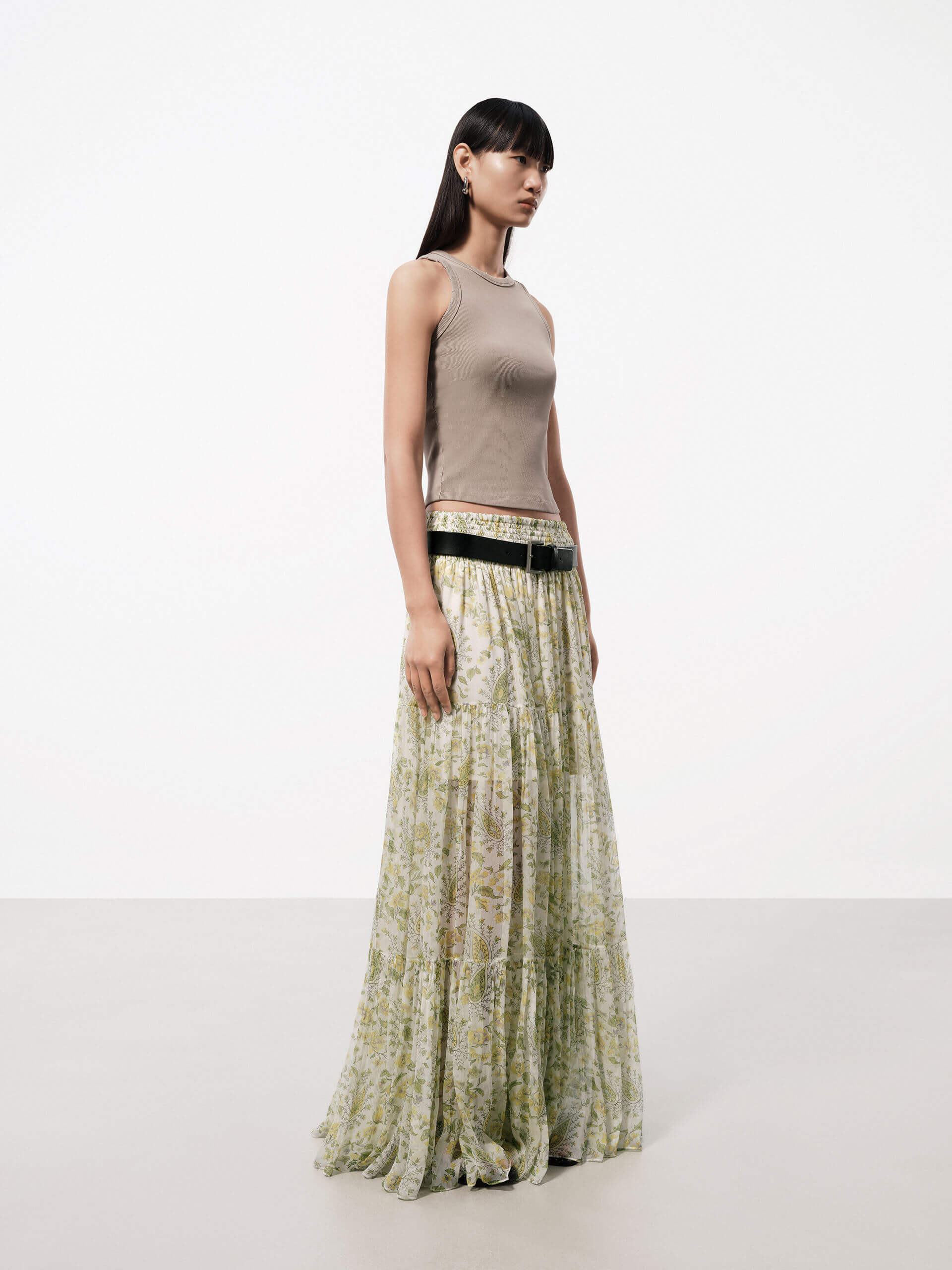 This stunning floral print flowy maxi skirt is made from comfortable chiffon fabric and features a graceful long silhouette. The delicate pleat details and soft green color with floral print are perfectly complemented by the elastic waistband for a flattering fit. Includes a mini lining skirt for added coverage.