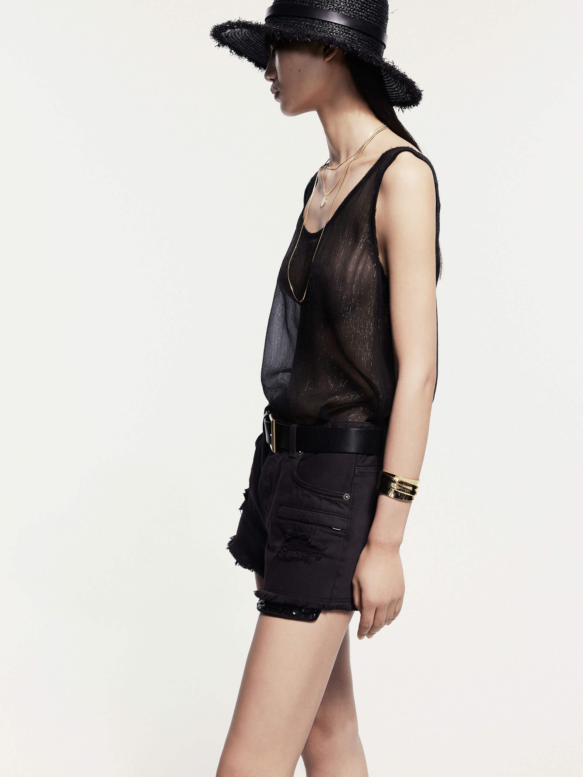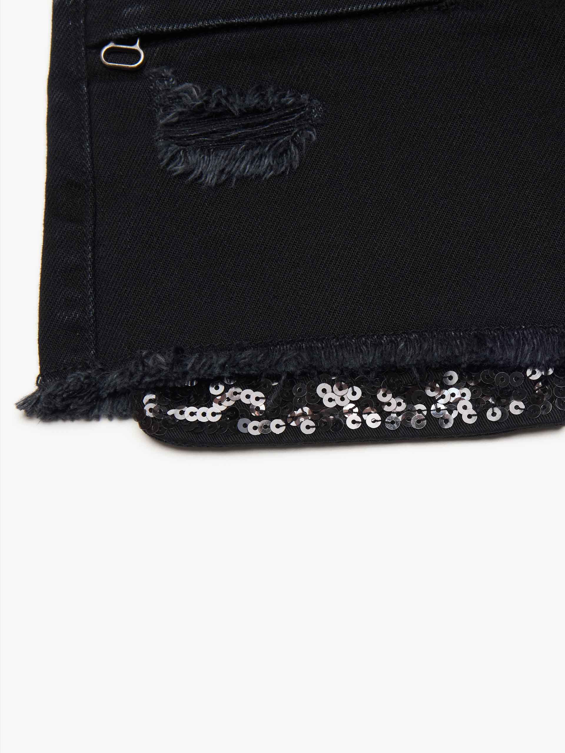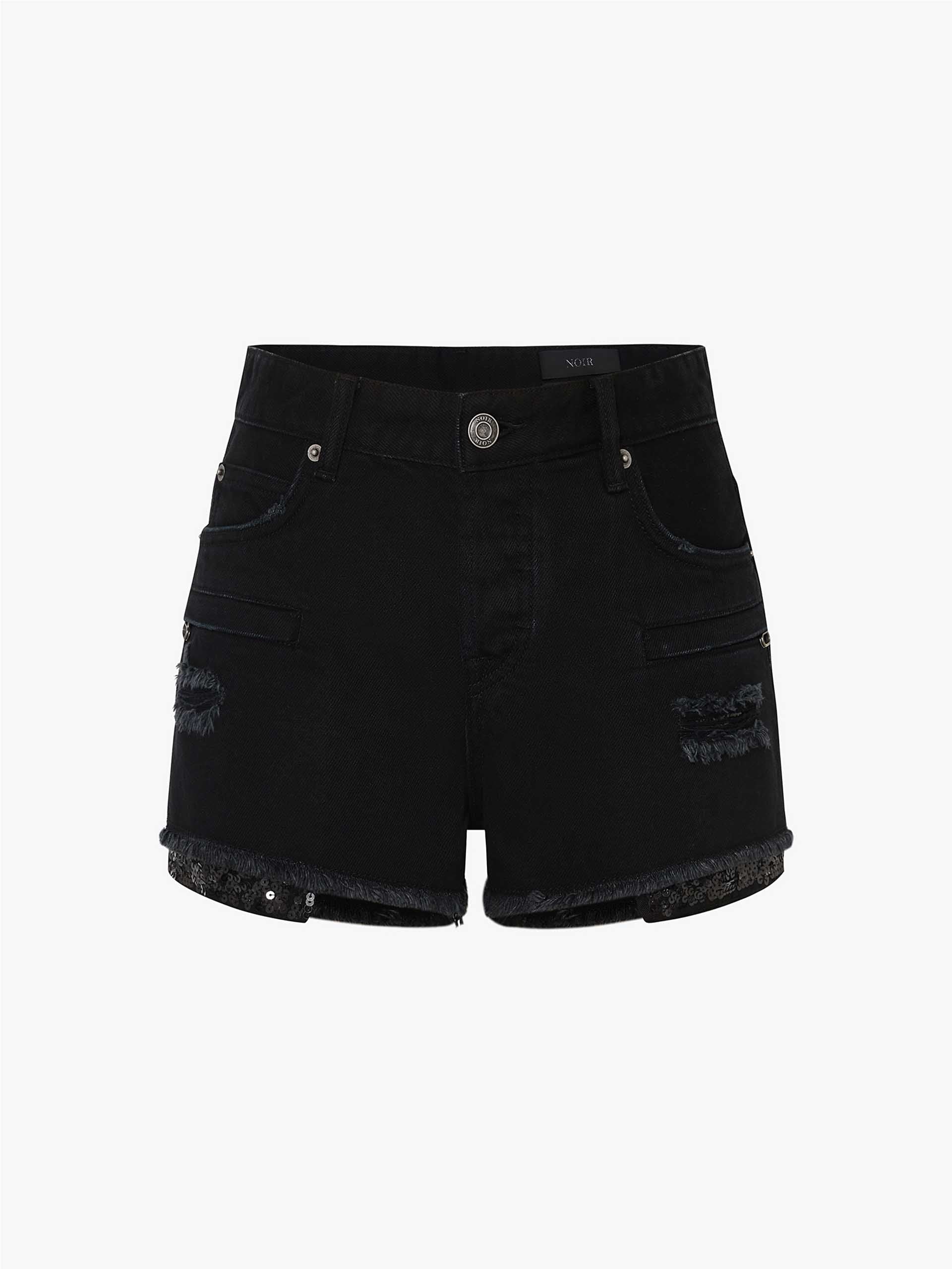 These denim shorts from MO&Co. Noir combine a trendy distressed design with the comfort and durability of premium Turkish cotton. The mid-low rise waistline and button fastening provide a comfortable and secure fit. The longer pockets not only offer practicality but also add a glamorous touch with their sequin embellishments. Please note, the waist belt is not included.