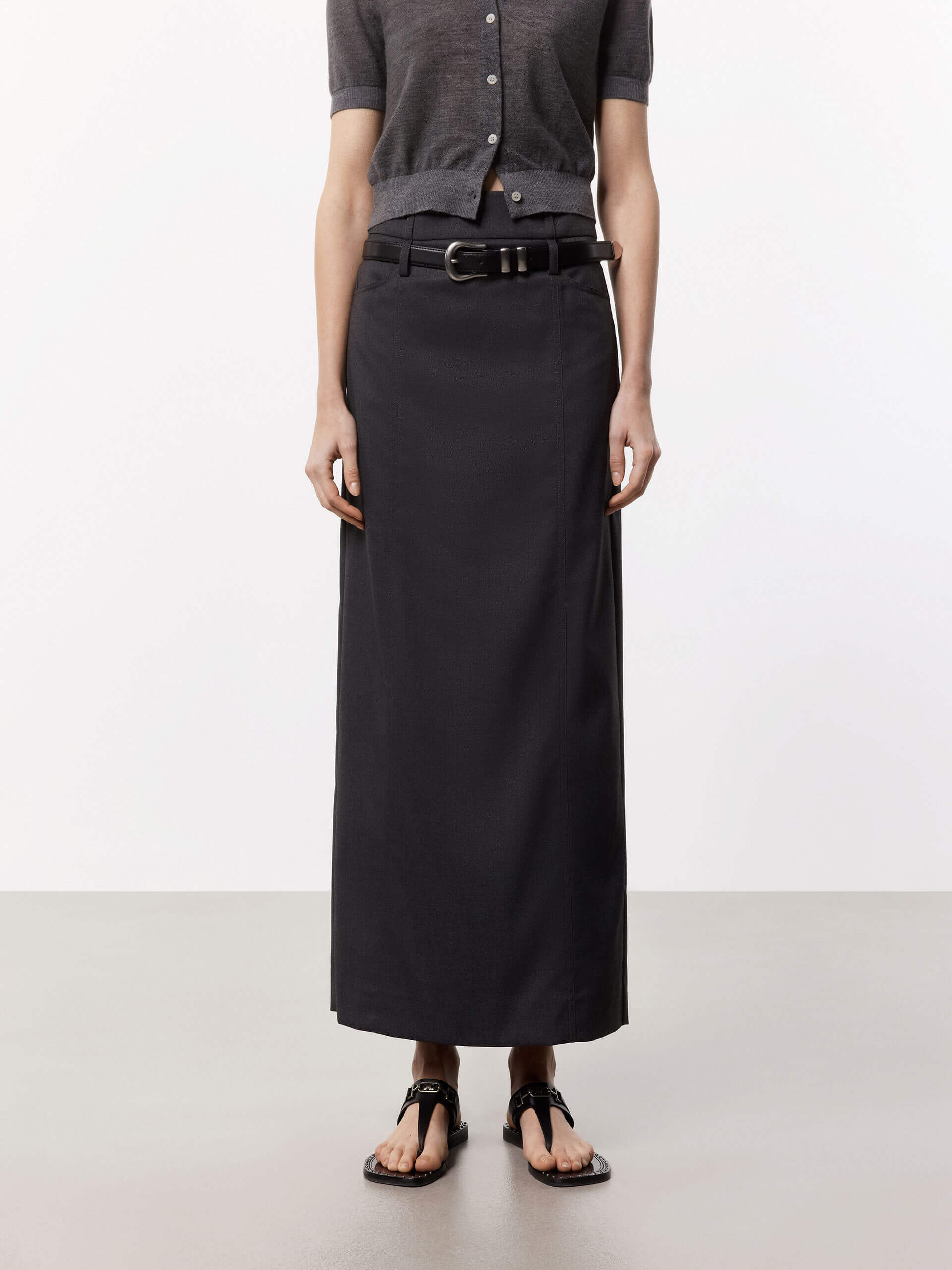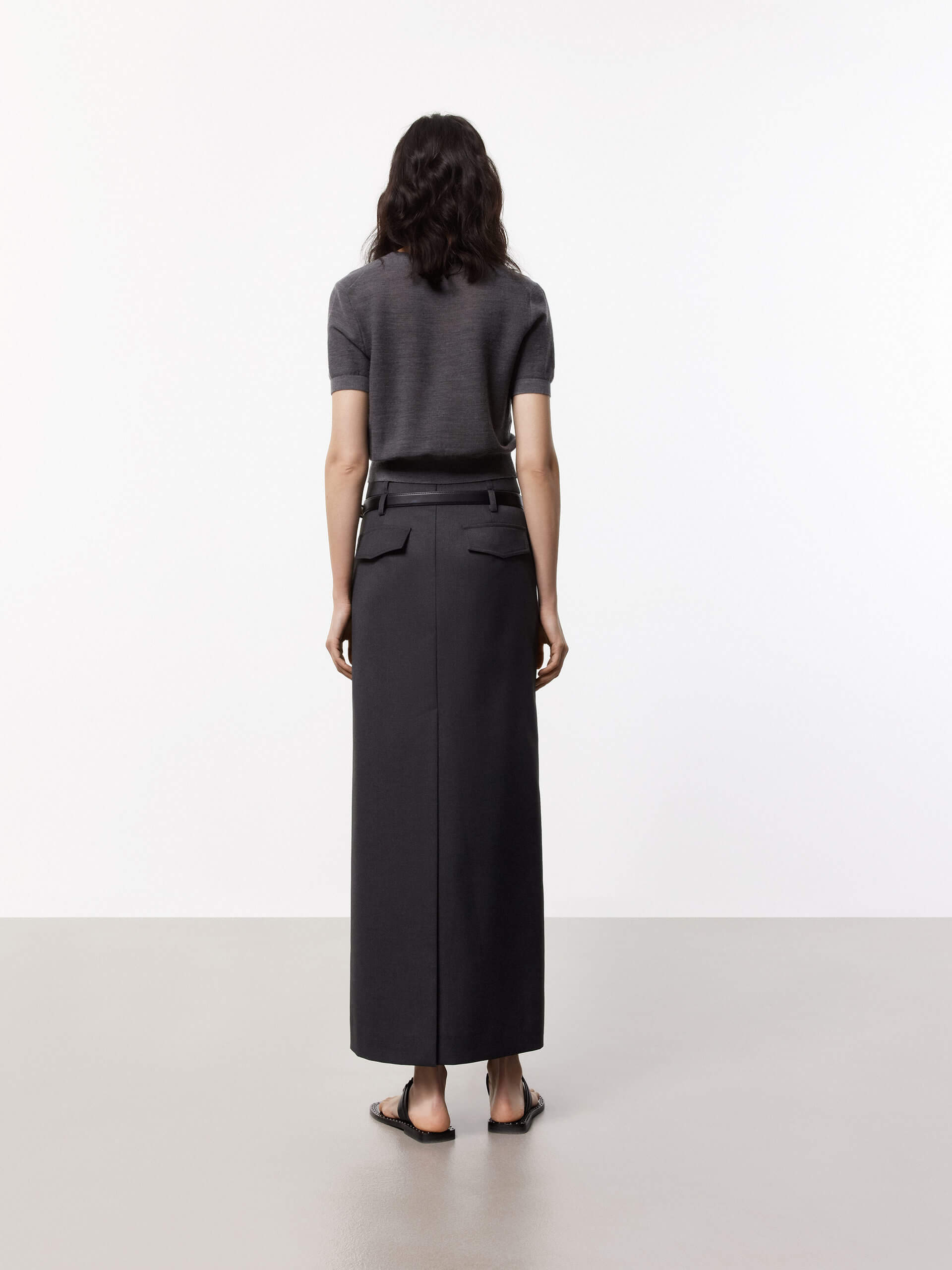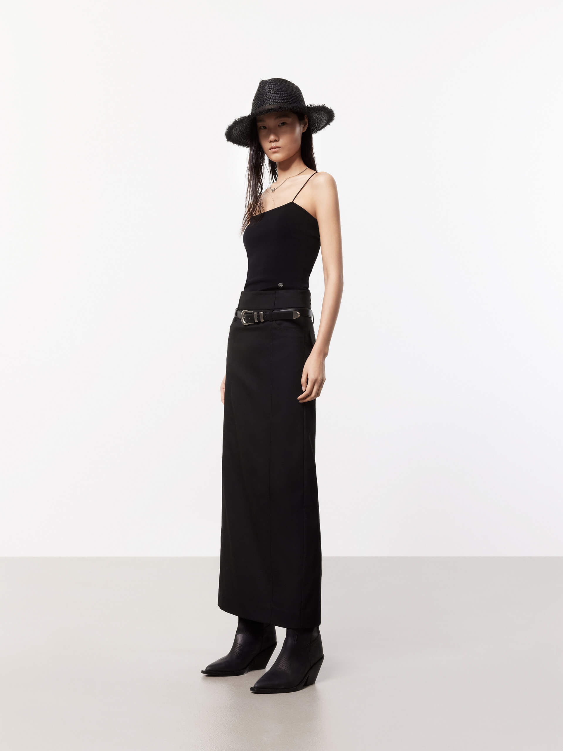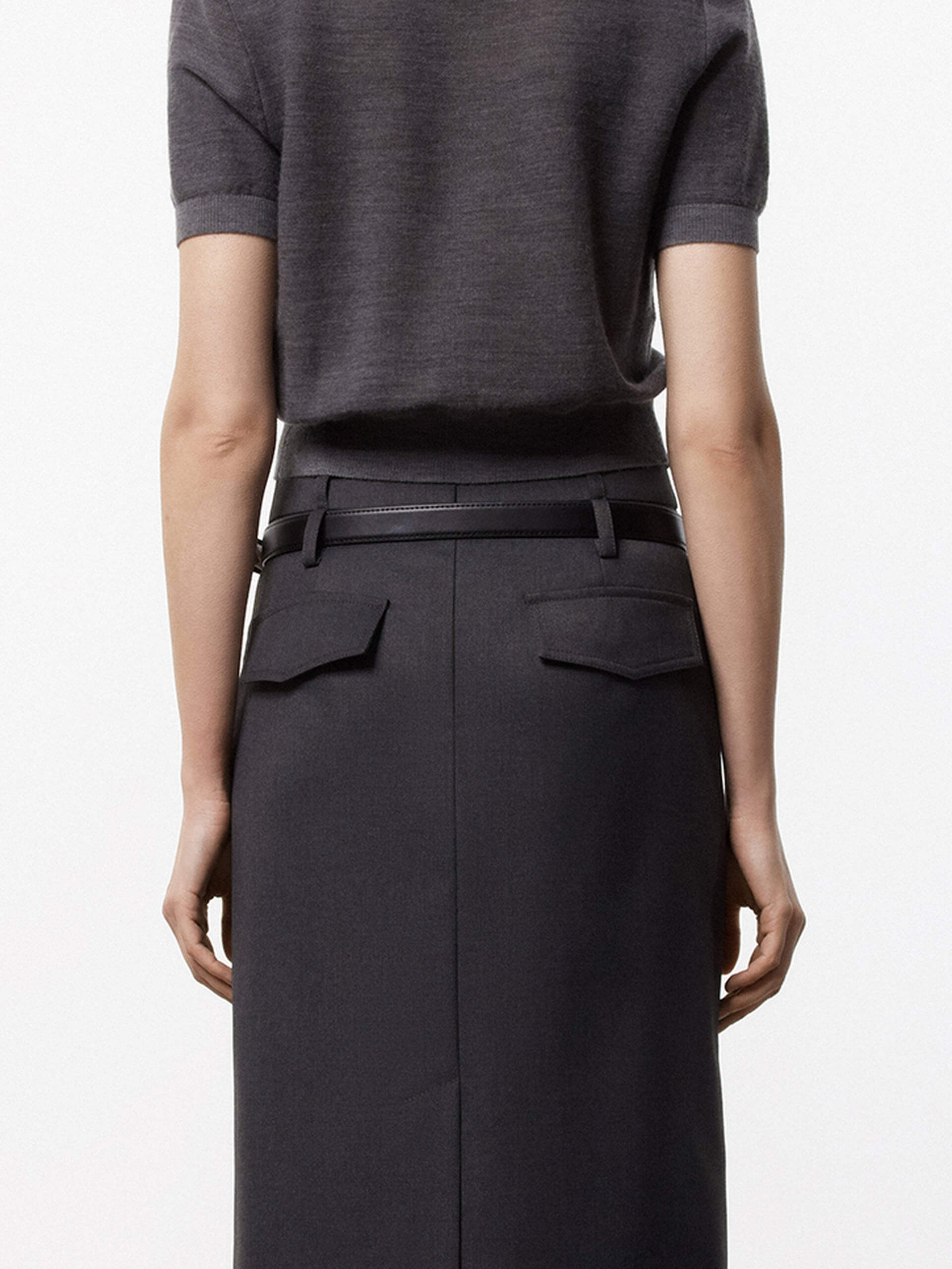 This skirt with a straight-cut silhouette is a versatile and elegant piece that can be dressed up or down depending on the occasion. Made from well-made fabric, this skirt is designed to drape beautifully and provide a comfortable fit. Features a wide waist design and the back slit detail adds a touch of sophistication and allows for easy movement. Pair it with a t-shirt and sandals for a laid-back vibe.