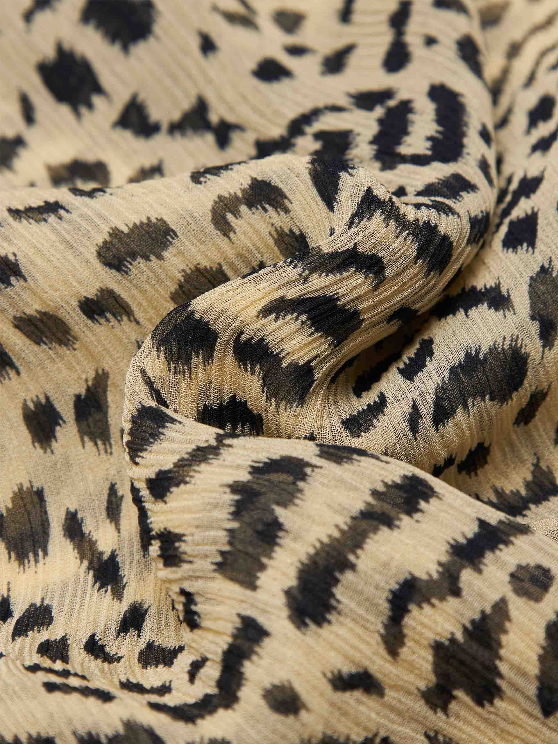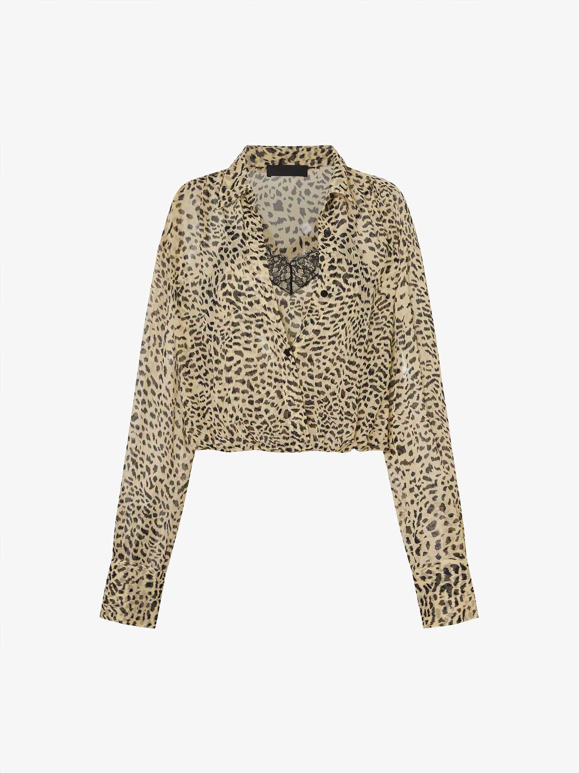 Indulge in the luxurious feel of this smooth silk blouse. With its flowy and relaxed fit and bold leopard print, it exudes feminine charm and visual interest. The V-neck and lace detailing add a touch of sophistication. Perfect for creating chic office looks with tailored pants and heels, or a more casual look with jeans and ankle boots.