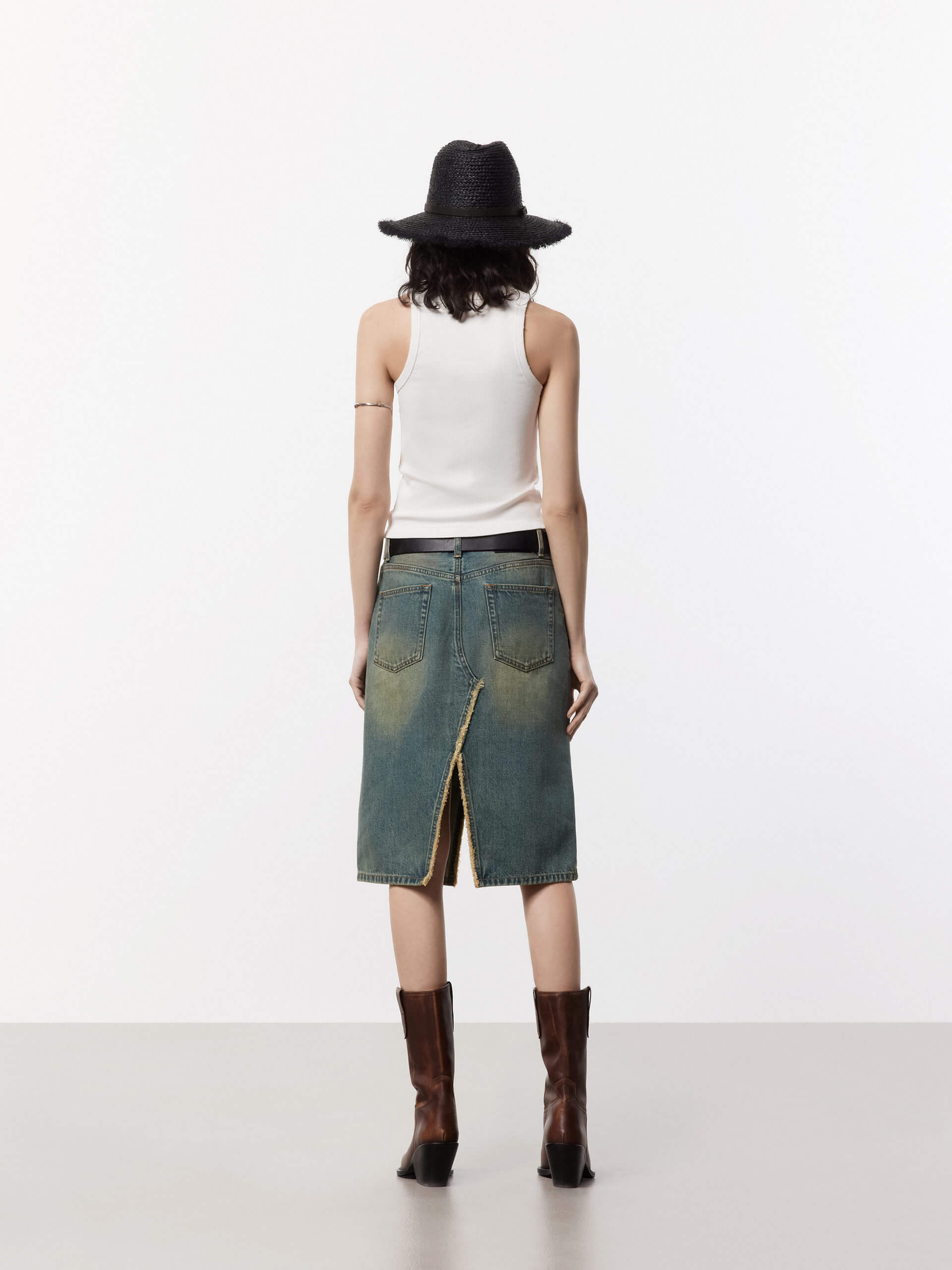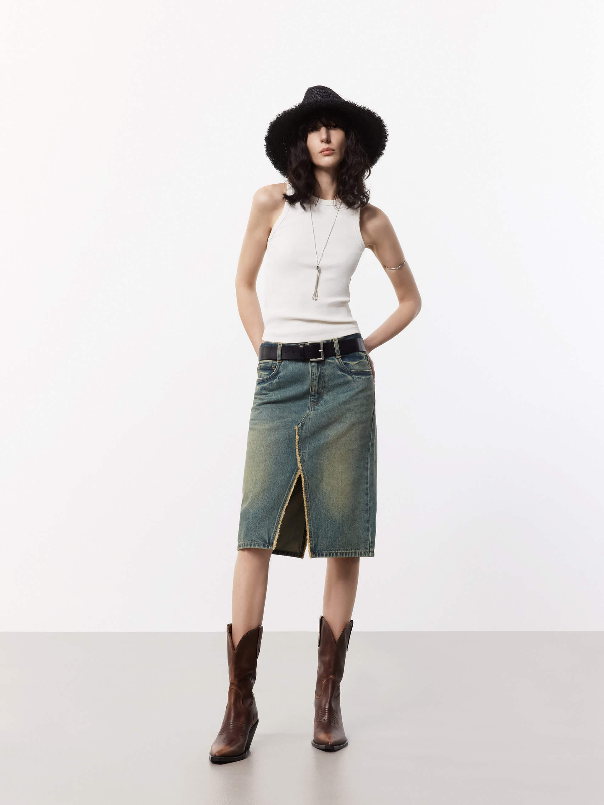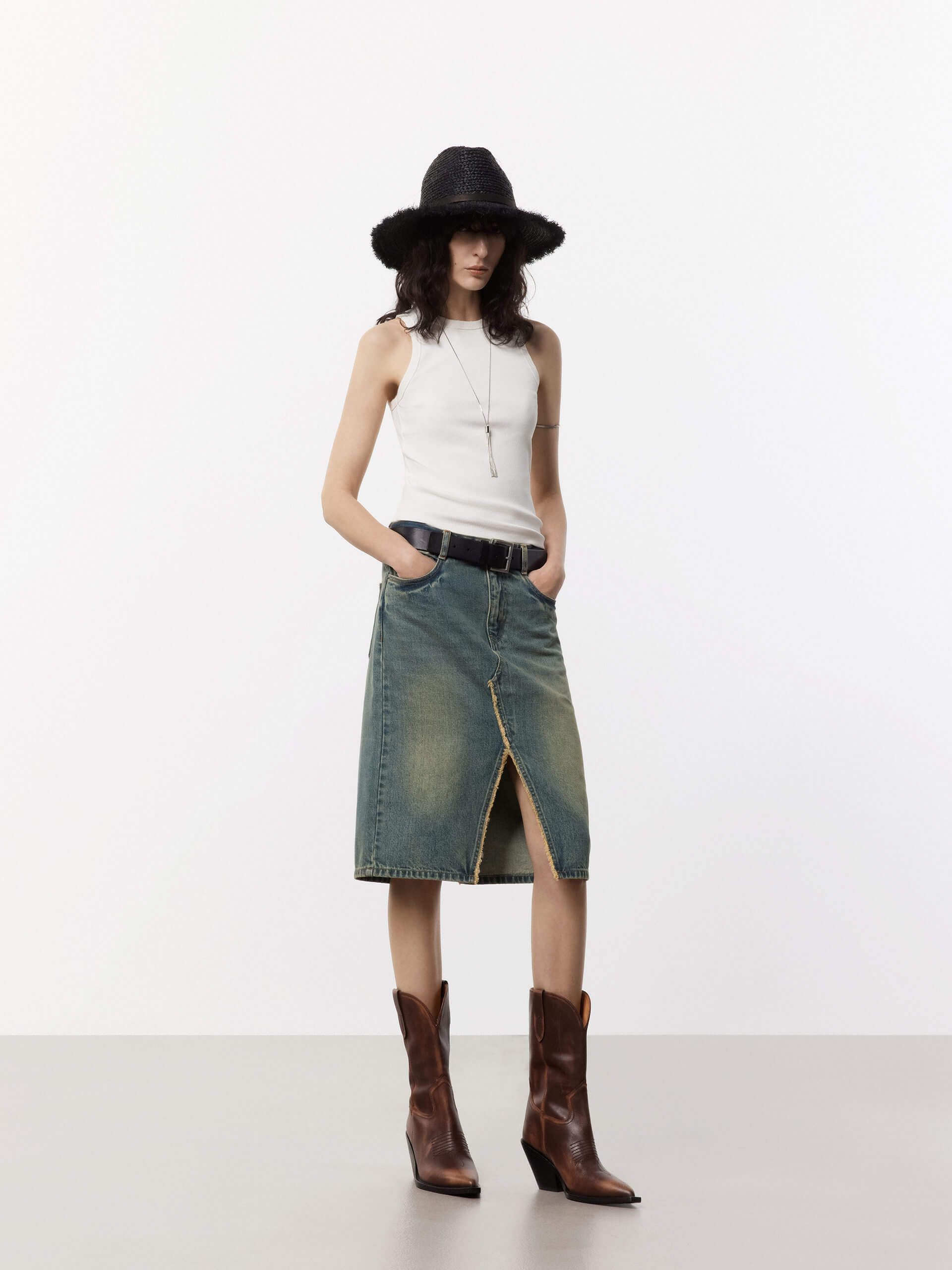 - Round neckline and distressed trim details