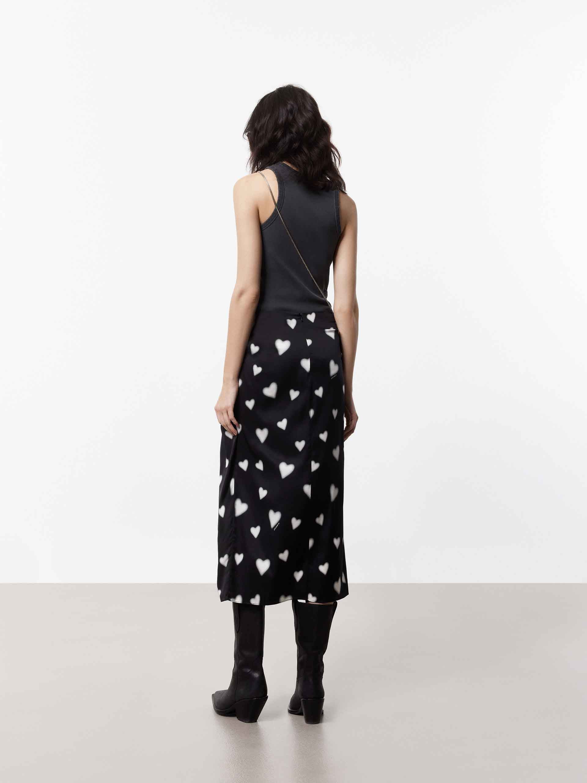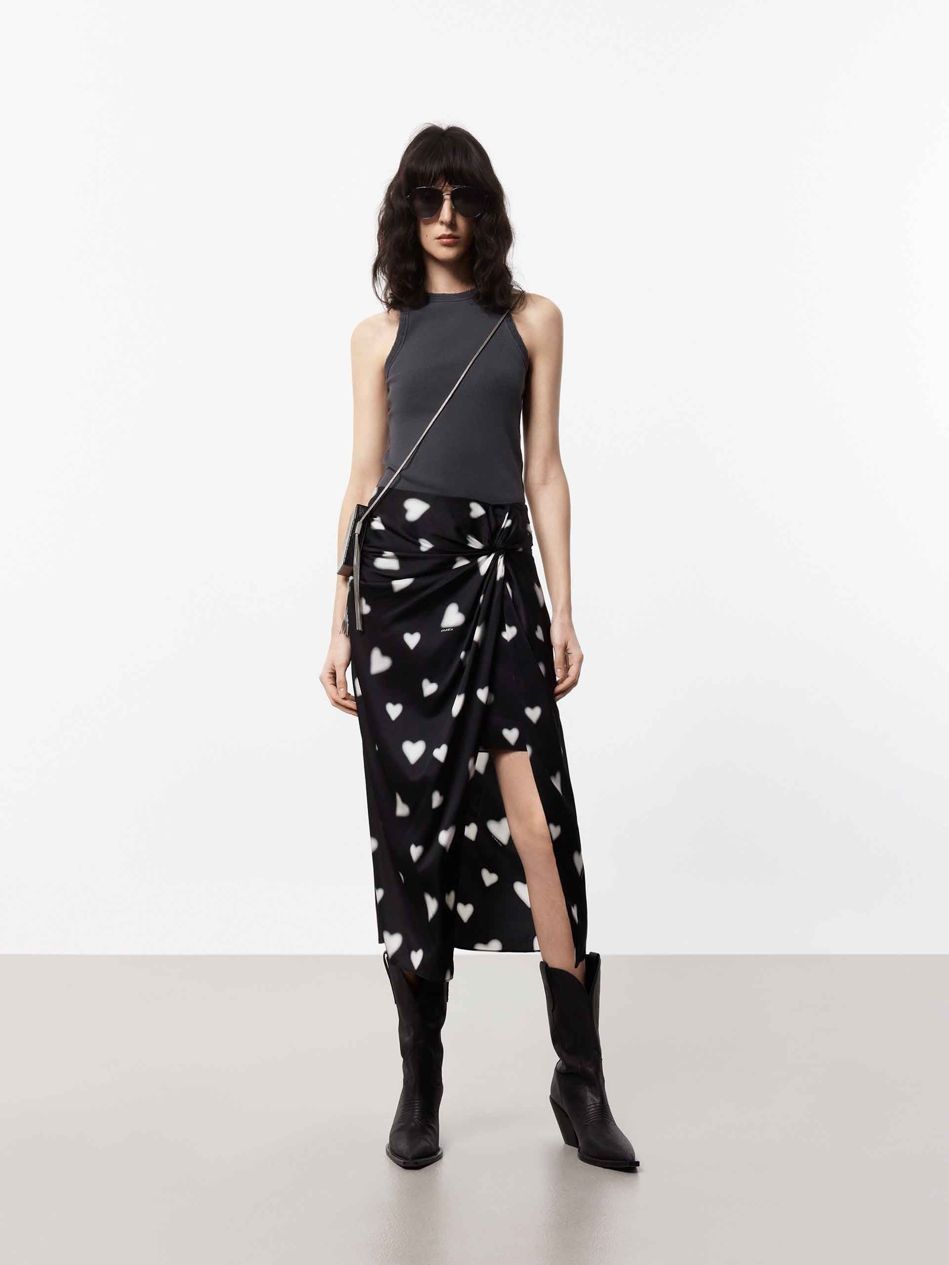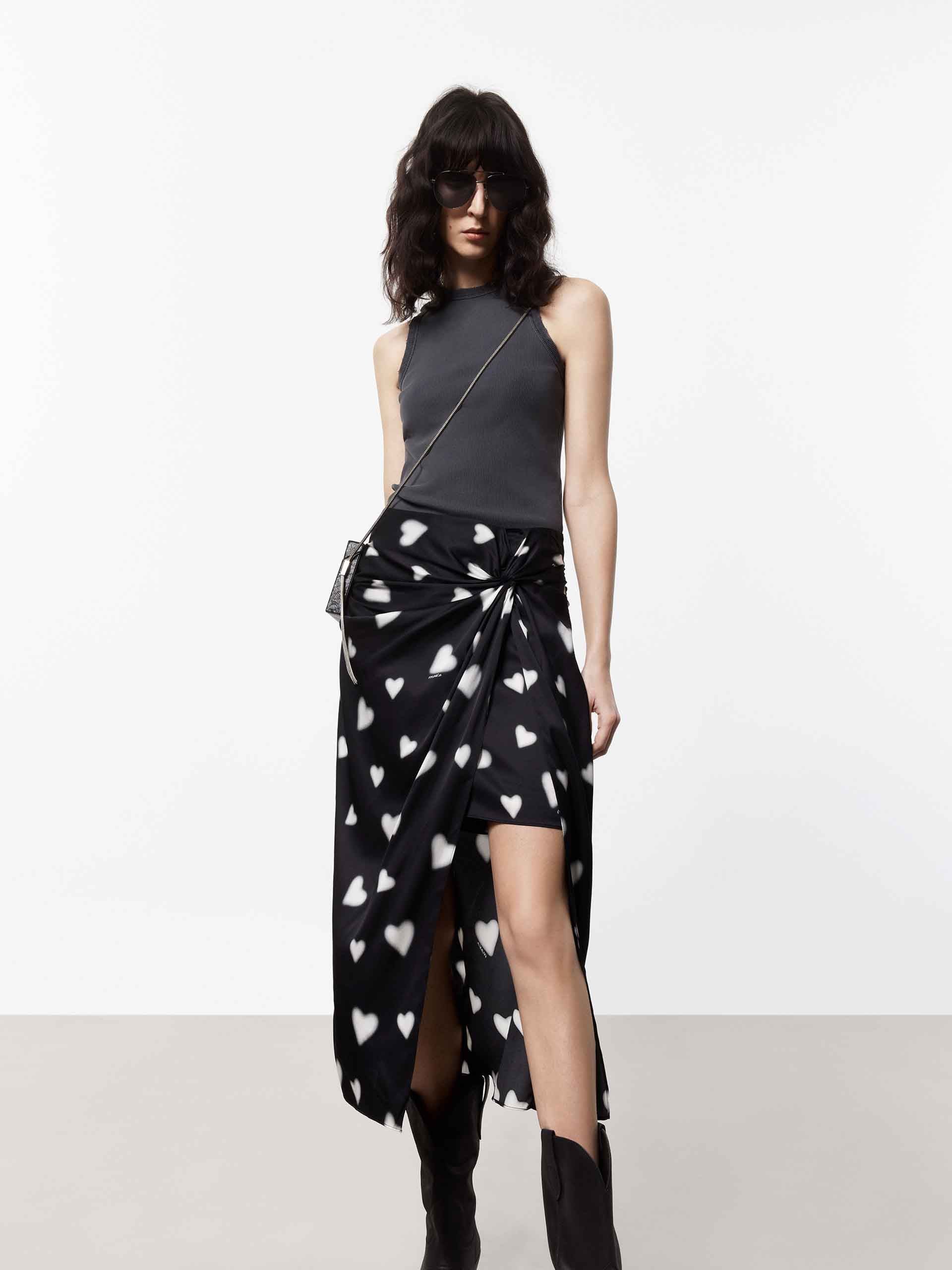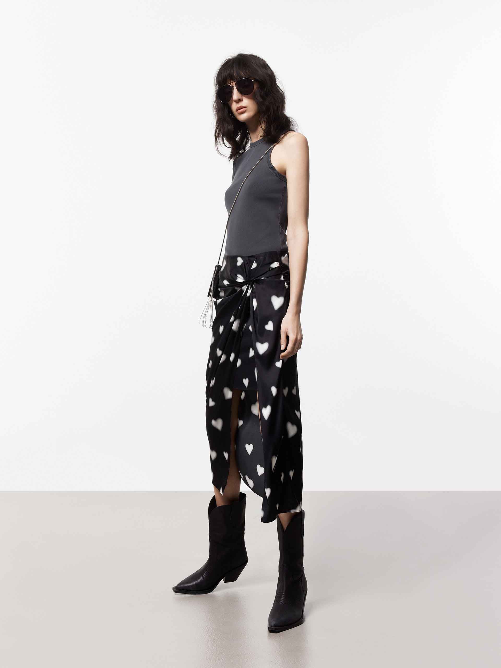 - Round neckline and distressed trim details