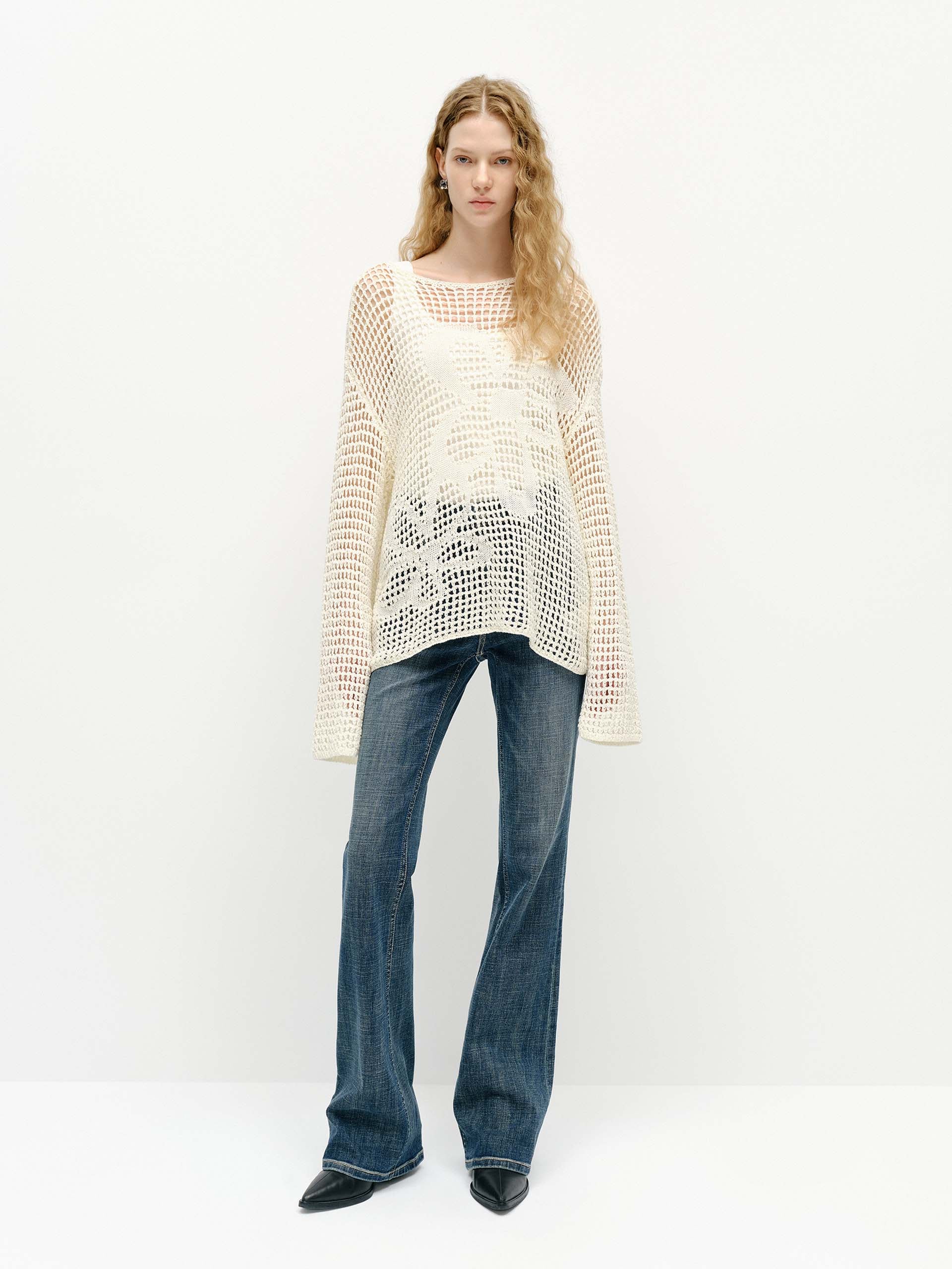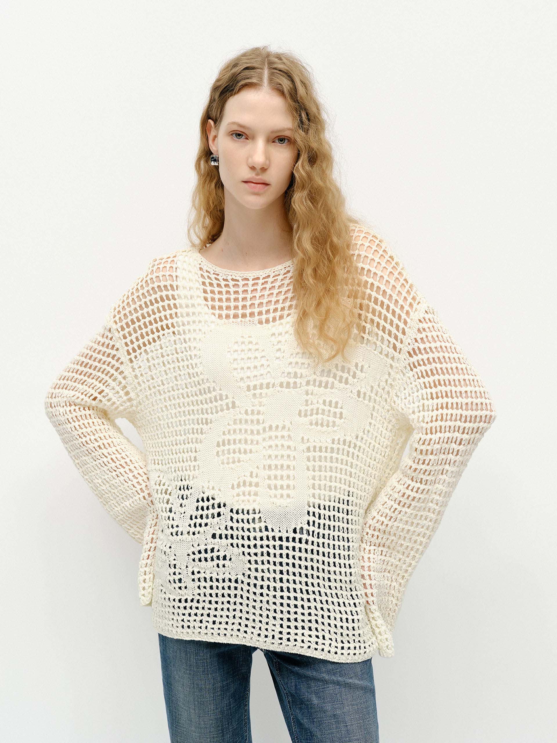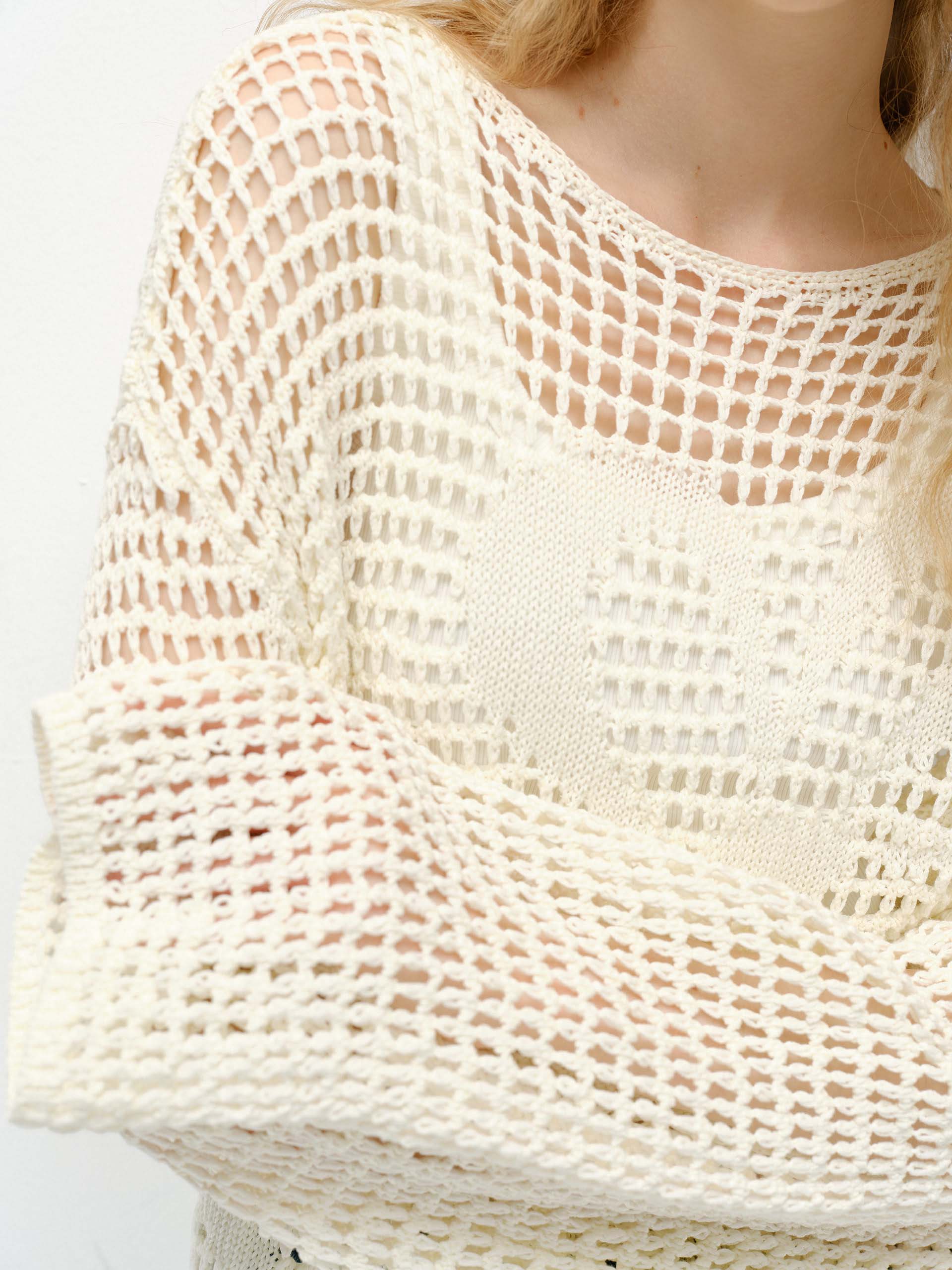 Crafted from comfortable cotton, ensuring a soft and cozy feel. This sweater features a relaxed, easy-going fit with a classic crewneck, long sleeves and a delicate flower pattern at the front. Crochet design that is perfect for layering over a tank top.