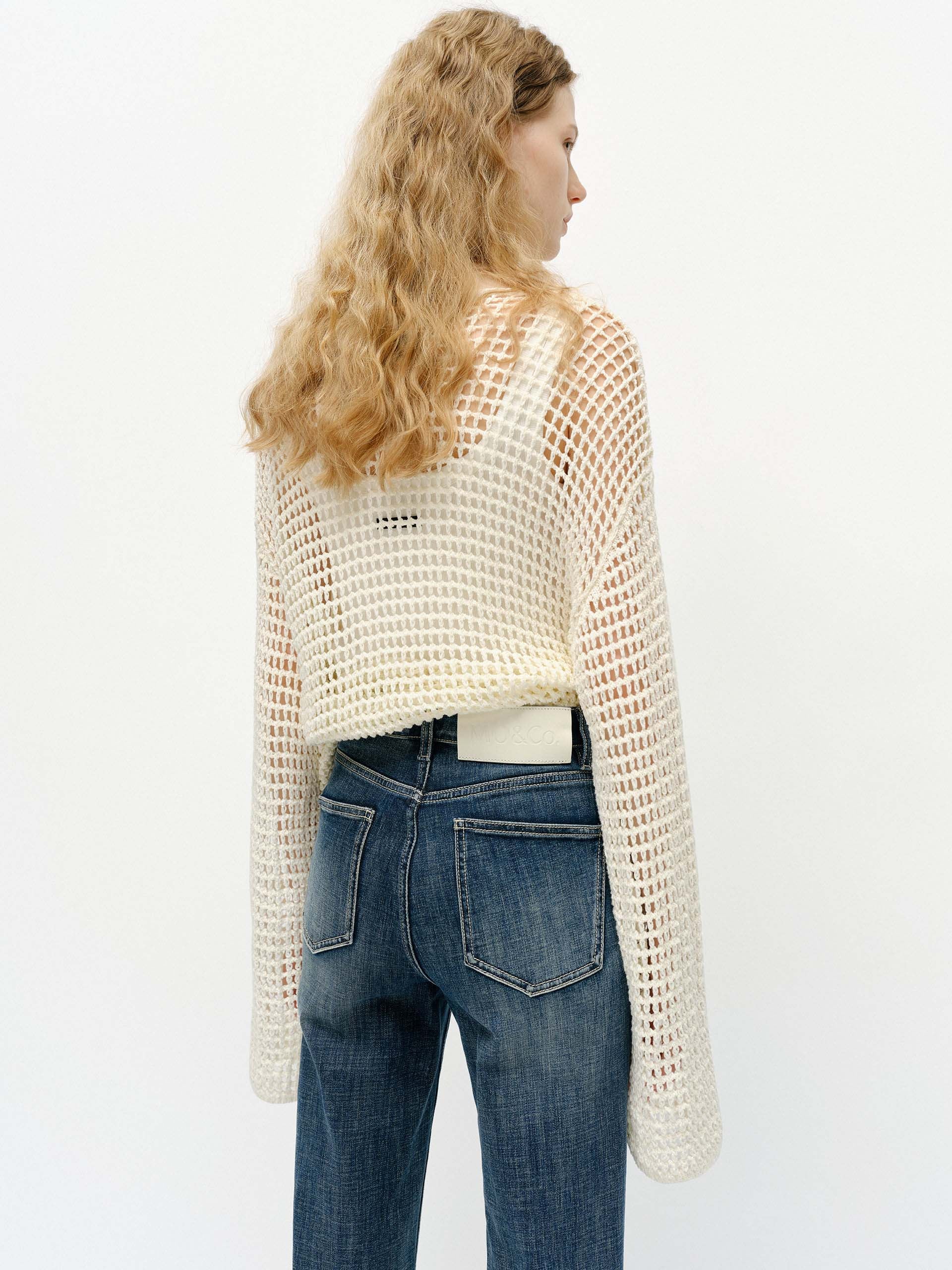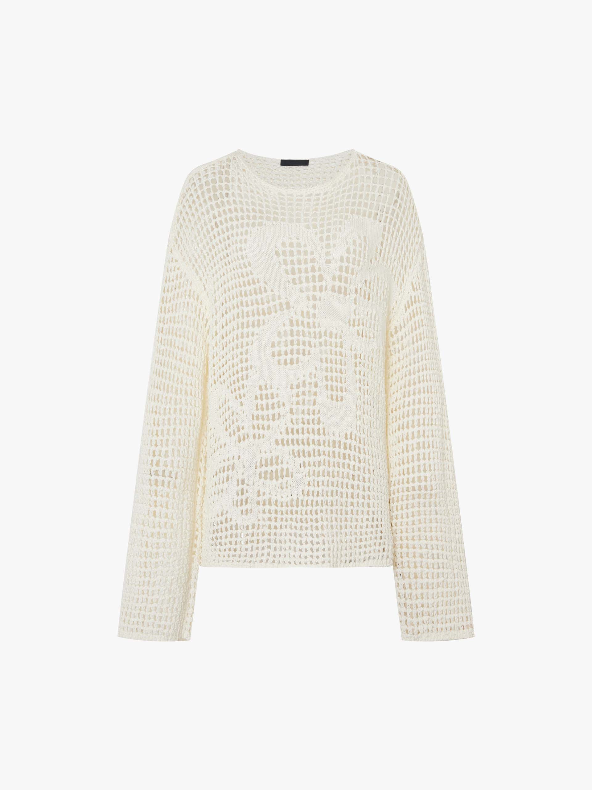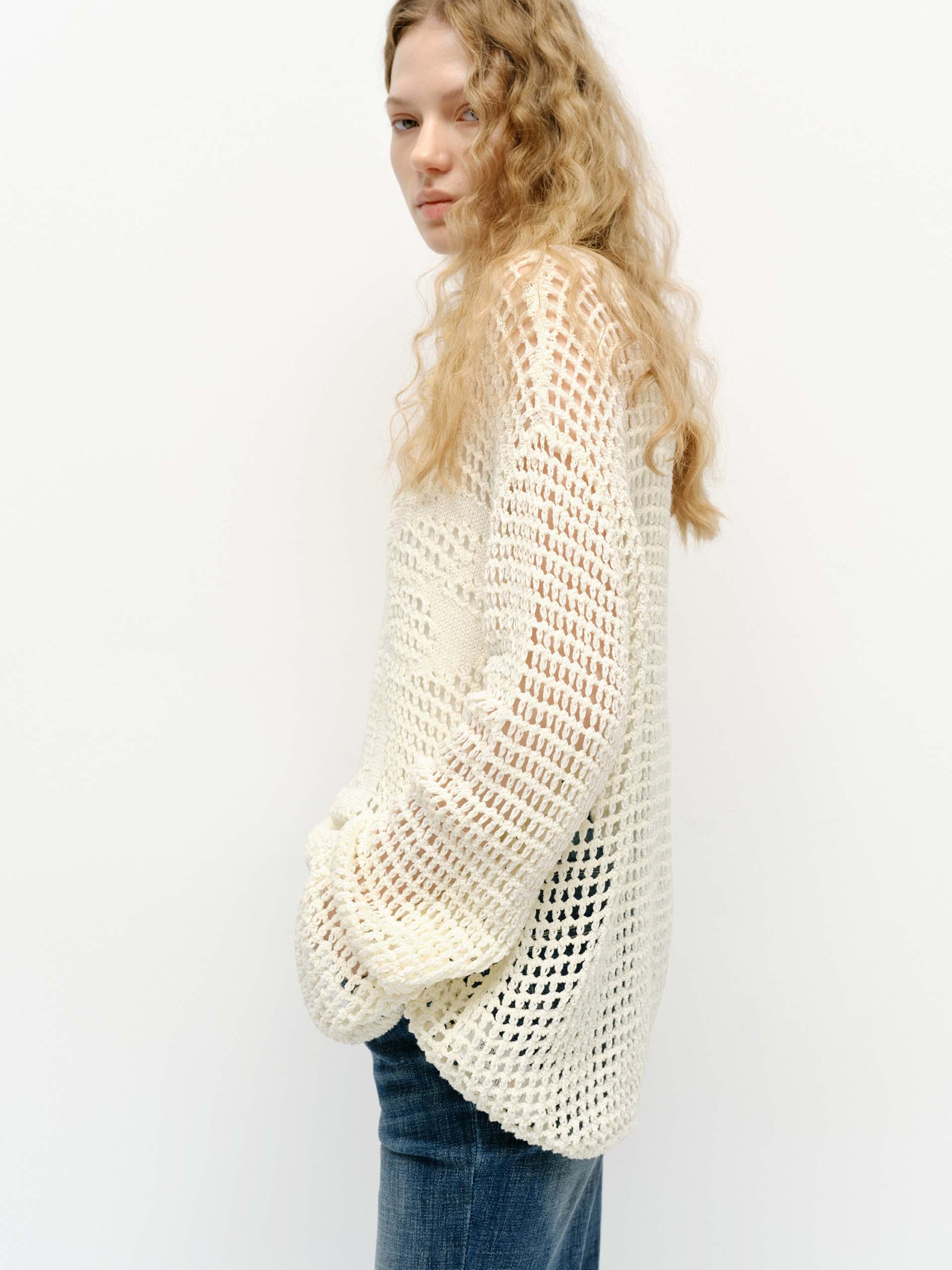 Crafted from comfortable cotton, ensuring a soft and cozy feel. This sweater features a relaxed, easy-going fit with a classic crewneck, long sleeves and a delicate flower pattern at the front. Crochet design that is perfect for layering over a tank top.