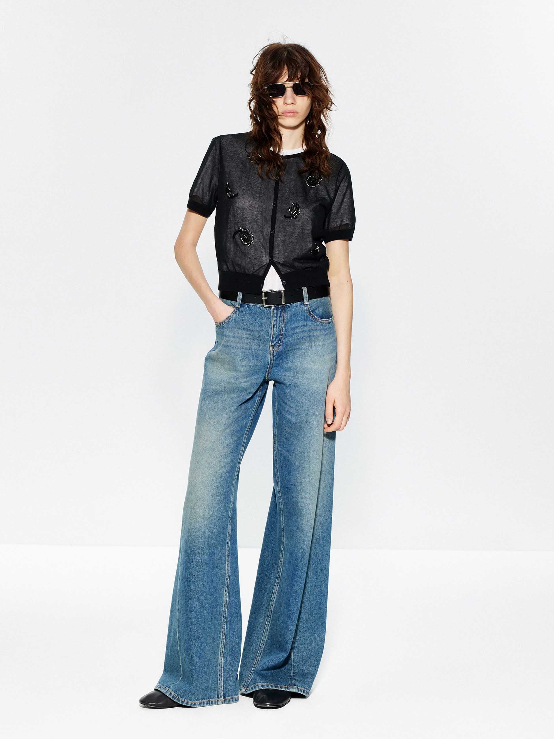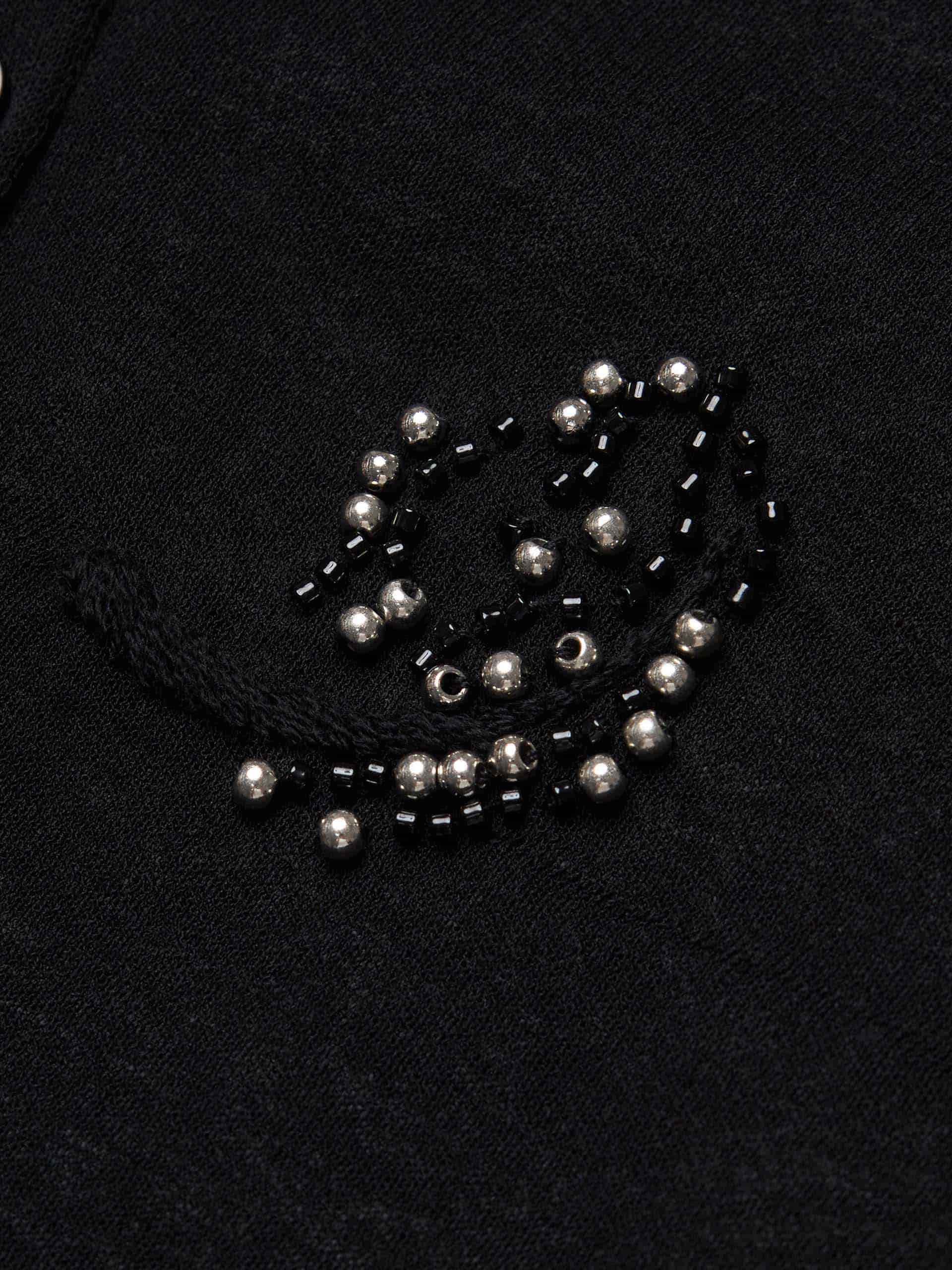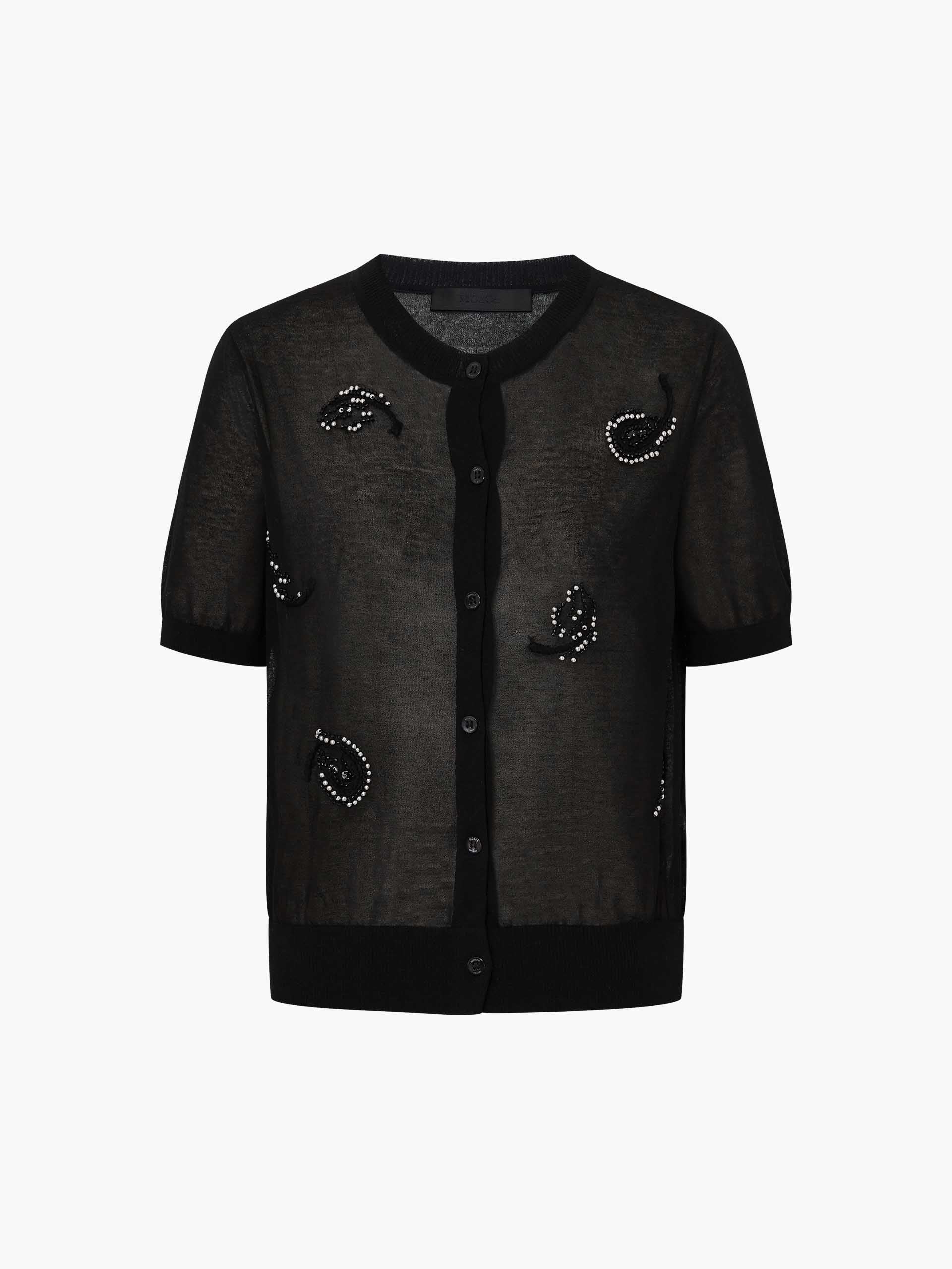 Add a touch of elegance to your wardrobe with our knitted cardigan. Designed with a classic round neck and adorned with black and white pearls, this cardigan is the perfect blend of style and comfort. Made with a cotton blend, it also features custom buttons for a personalized touch.
