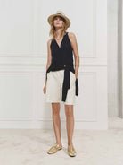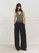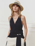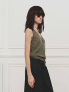 - Deep V-neck and sleeveless design