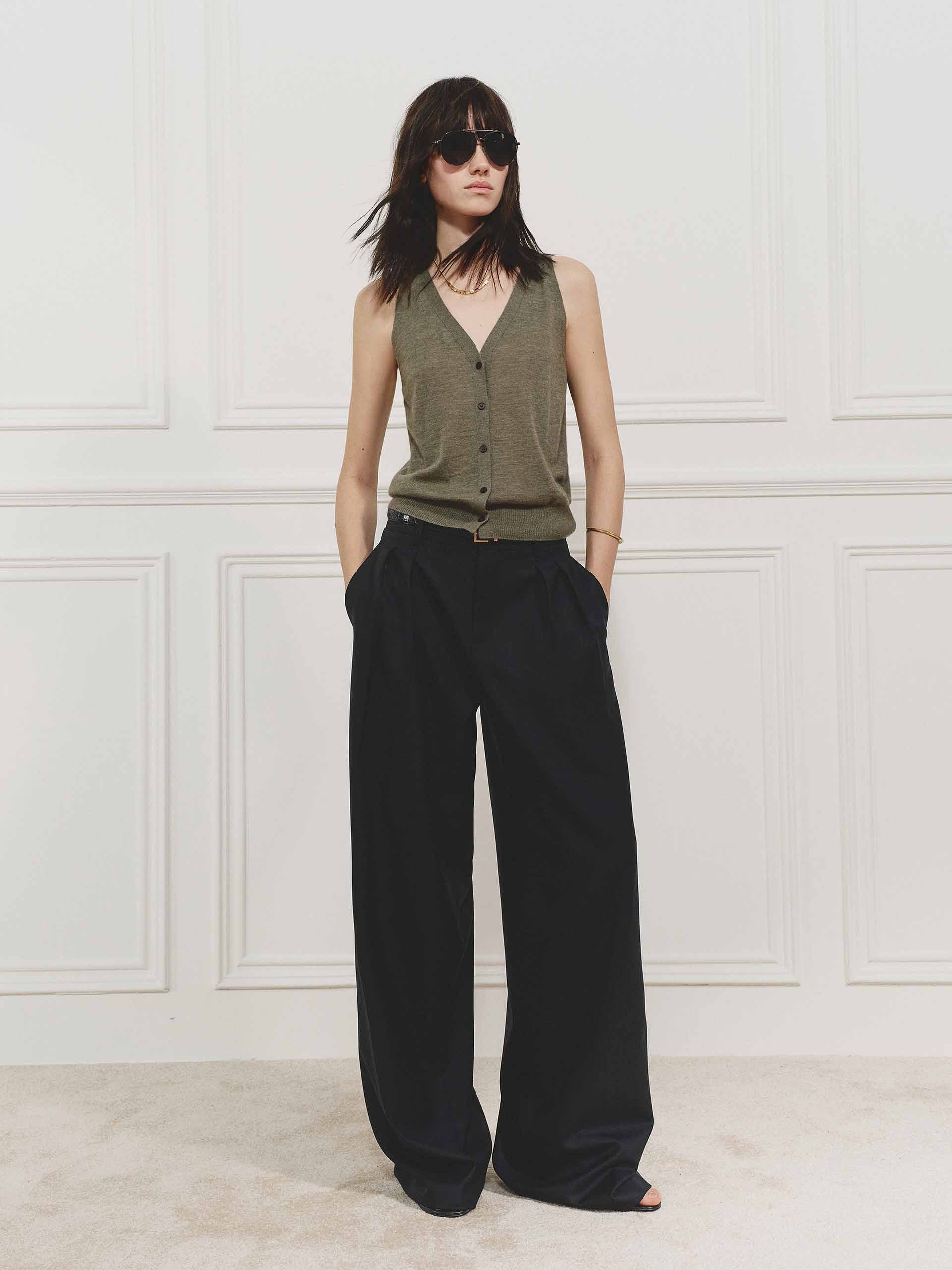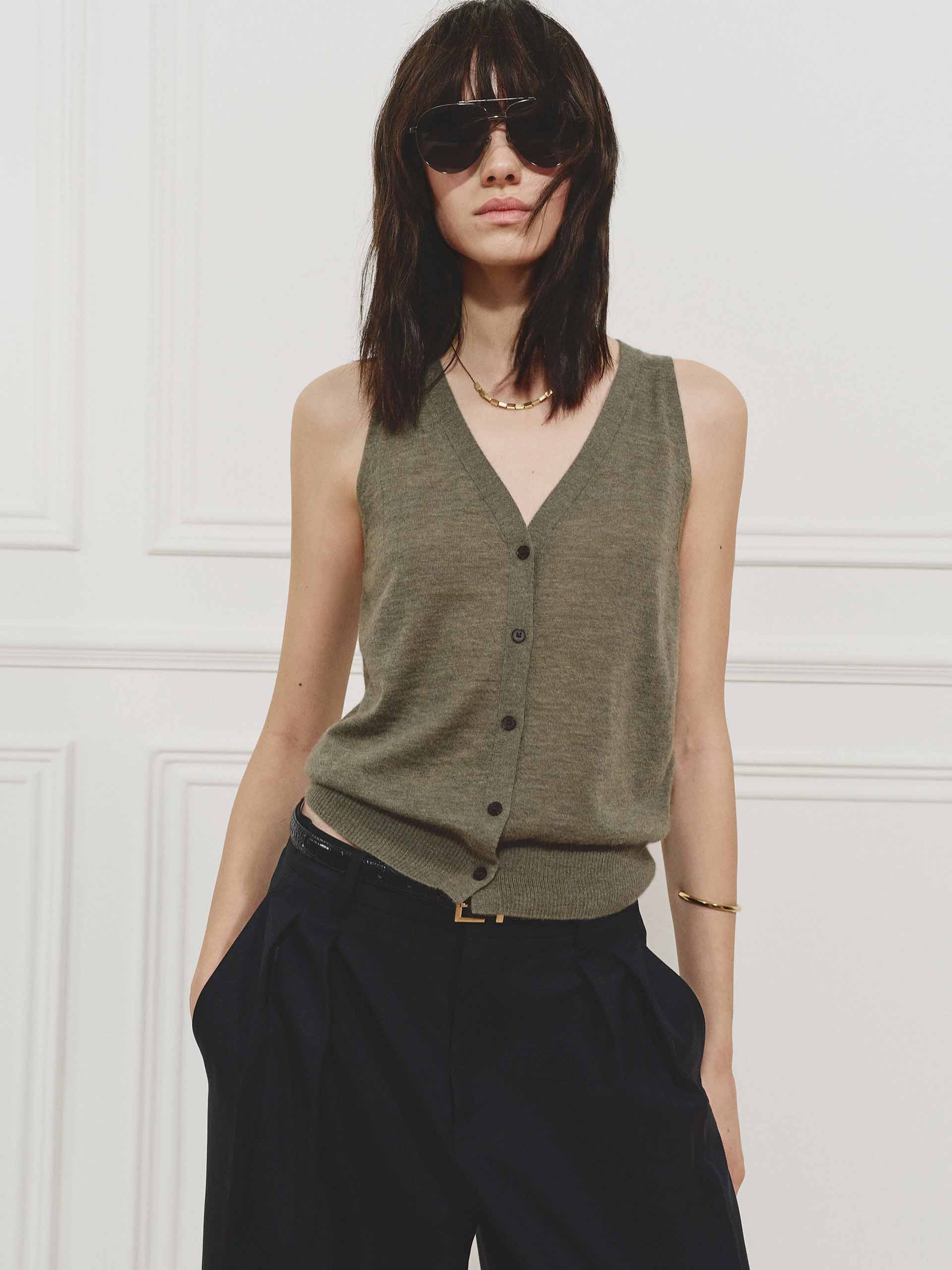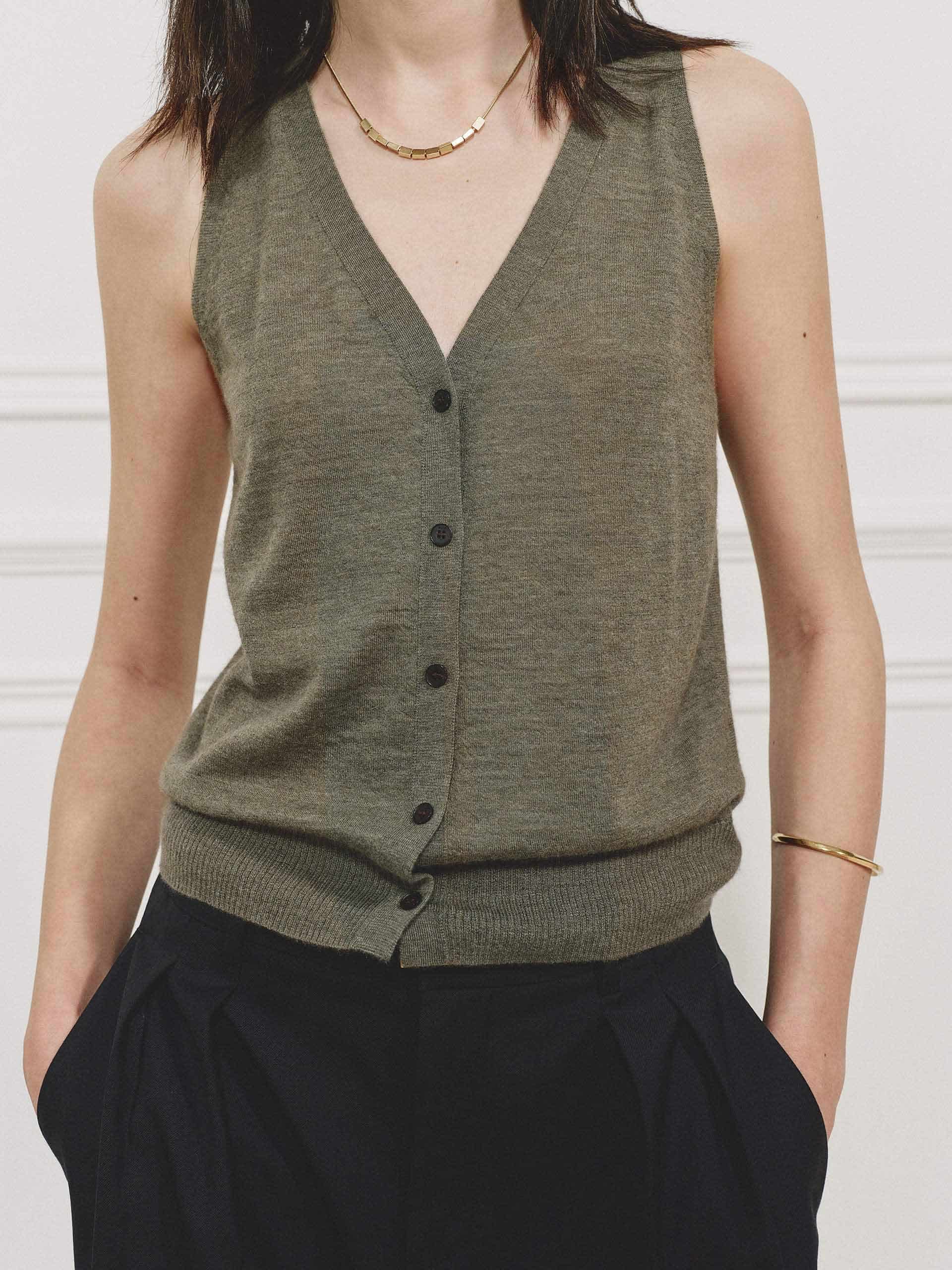Elevate your essentials with this luxuriously soft cashmere knit cardigan. Crafted from 100% premium cashmere, it features a flattering deep V-neck, sleeveless silhouette, and button closure for effortless layering. Perfect to wear it with pants or casual shorts for chic look.