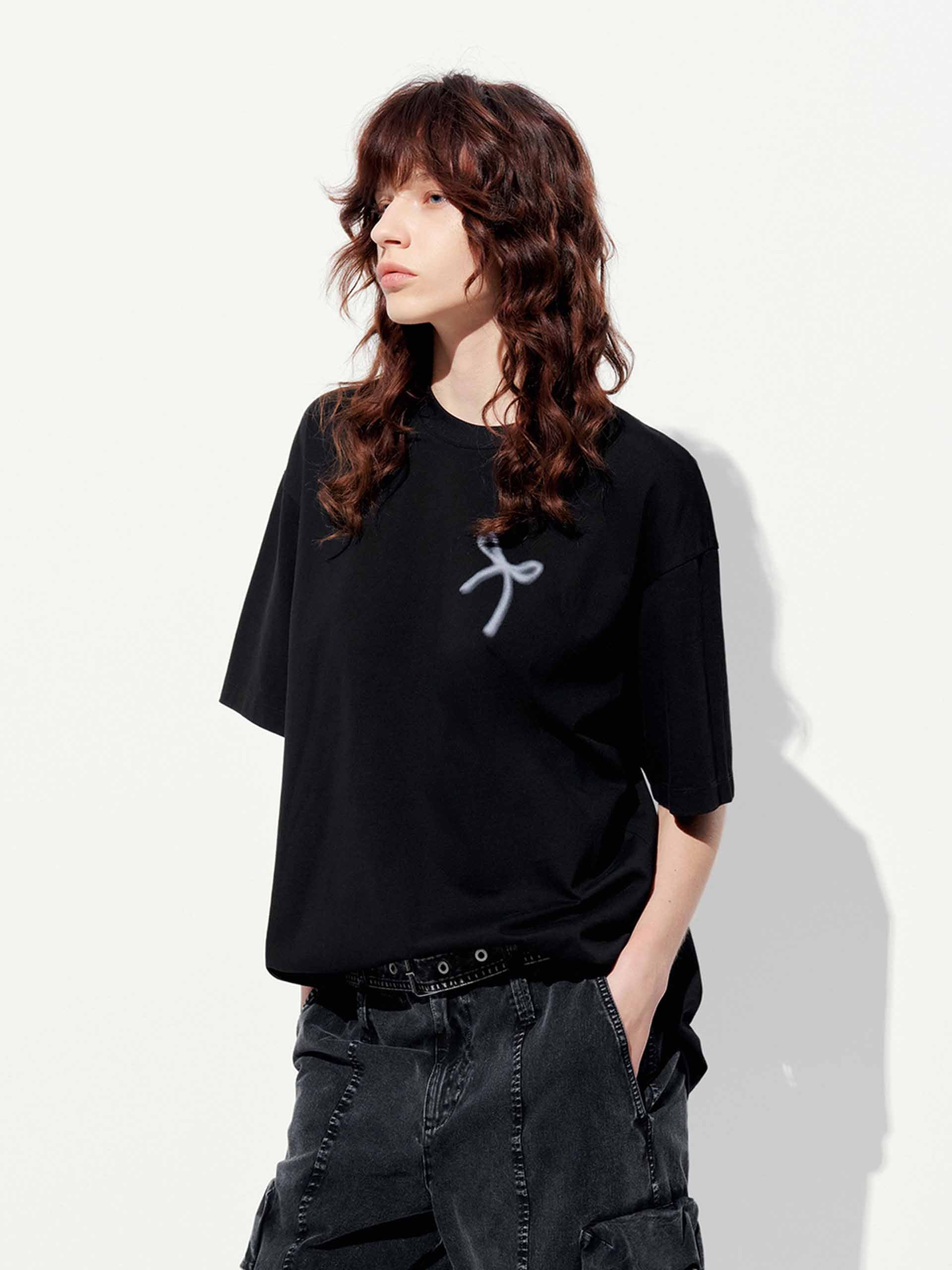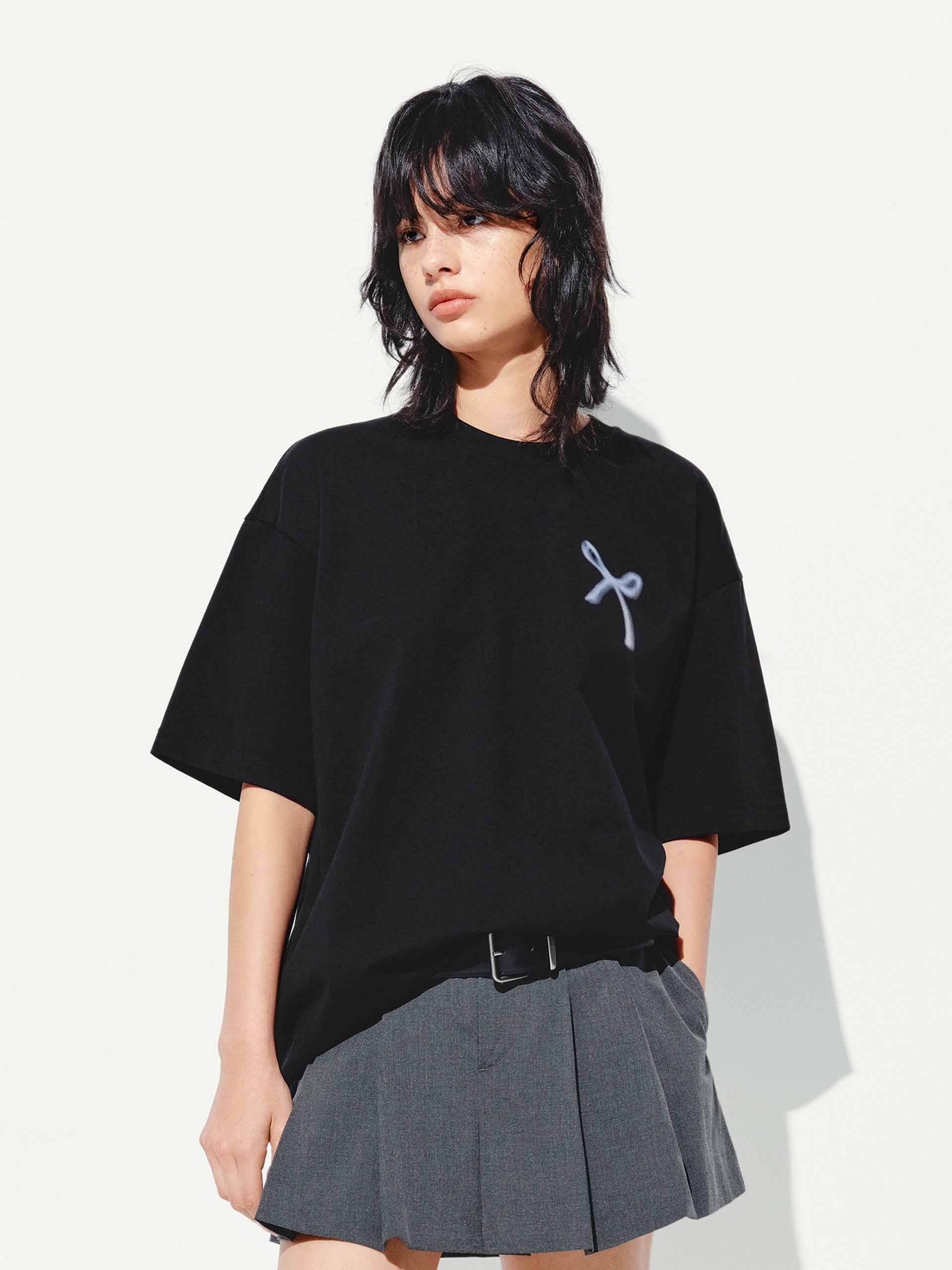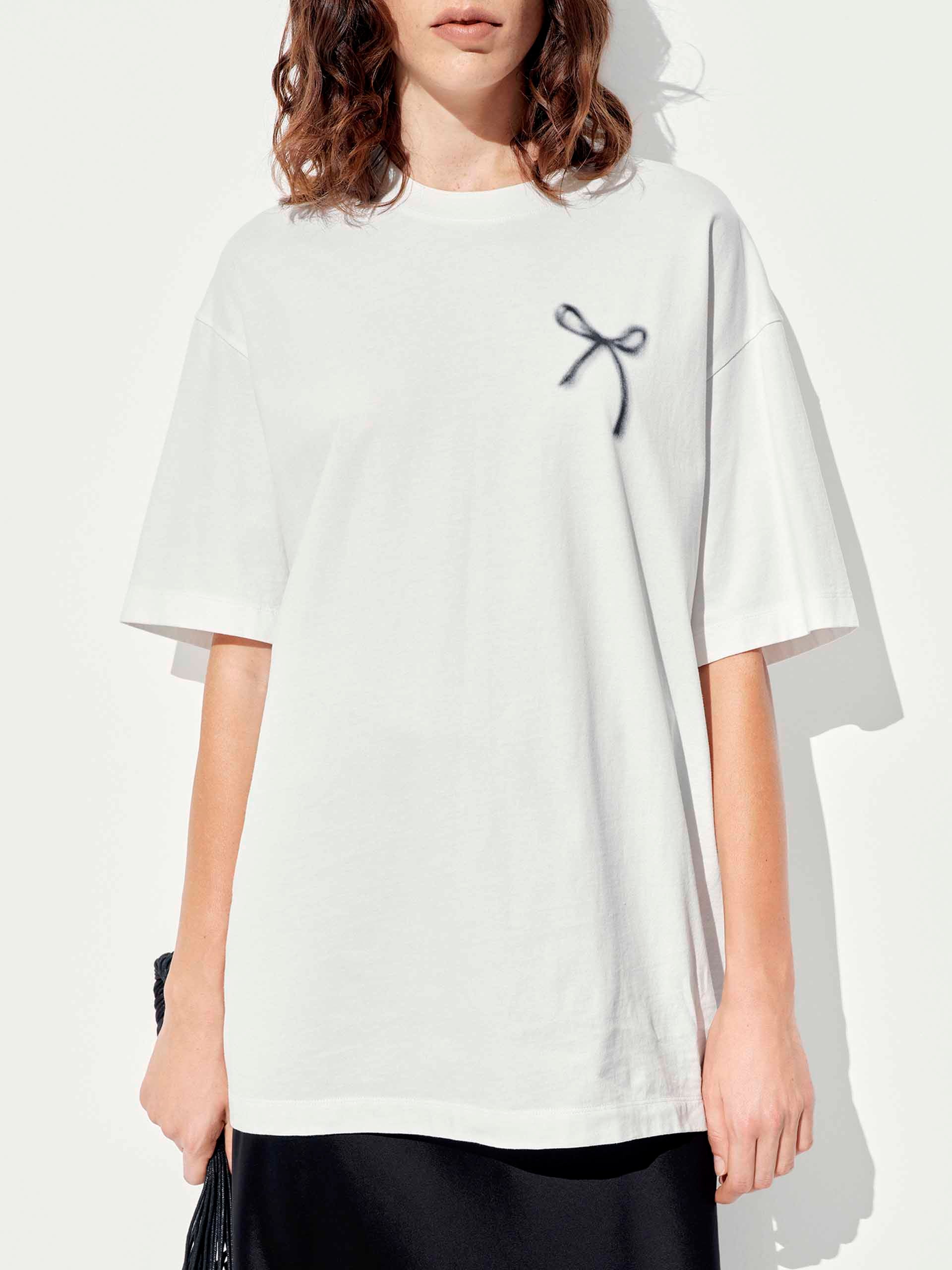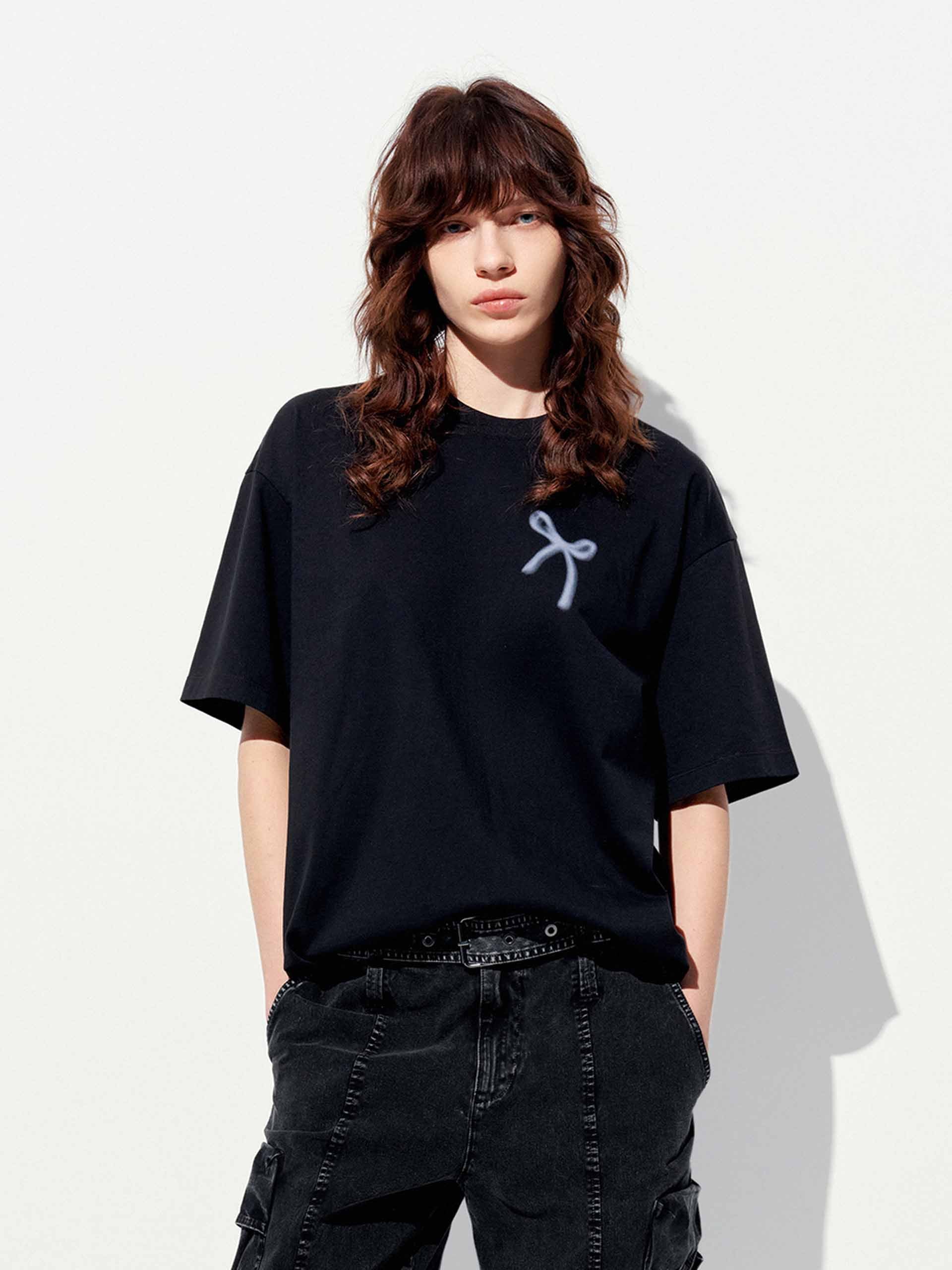 Add a touch of playful elegance to your wardrobe with our t-shirt, featuring a delicate all-over bow pattern that exudes sweet sophistication. The relaxed fit and artfully dropped shoulders create an effortlessly chic silhouette. Designed for versatility, this tee's breathable fabric and classic round neck keep you cool and comfortable, while the short sleeves offer comfort and wearability.