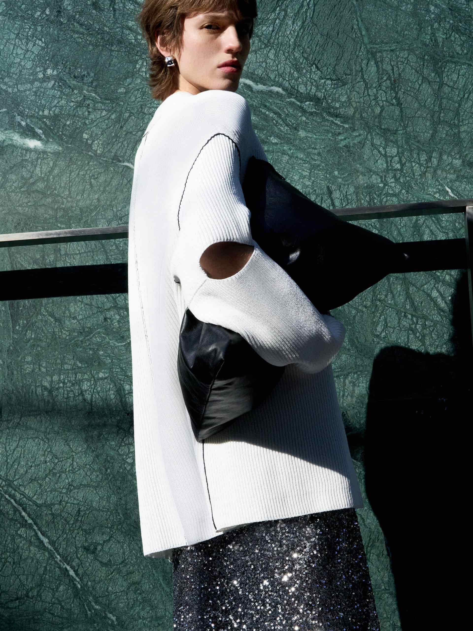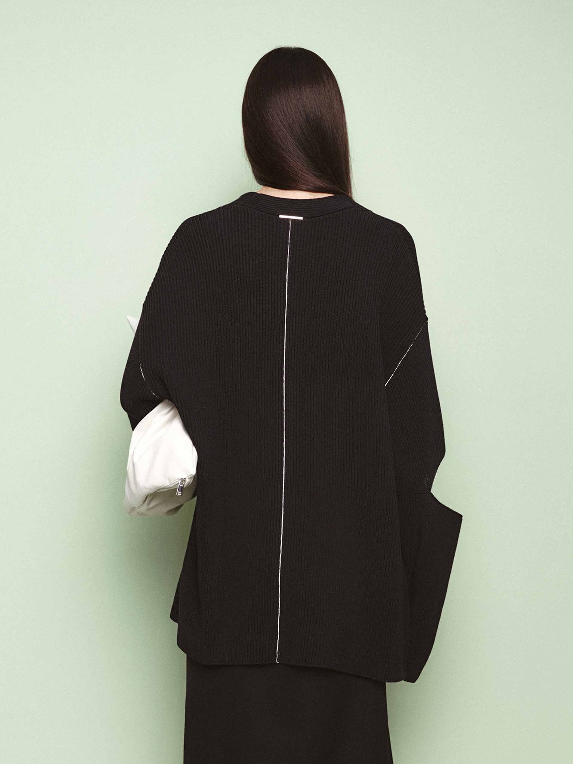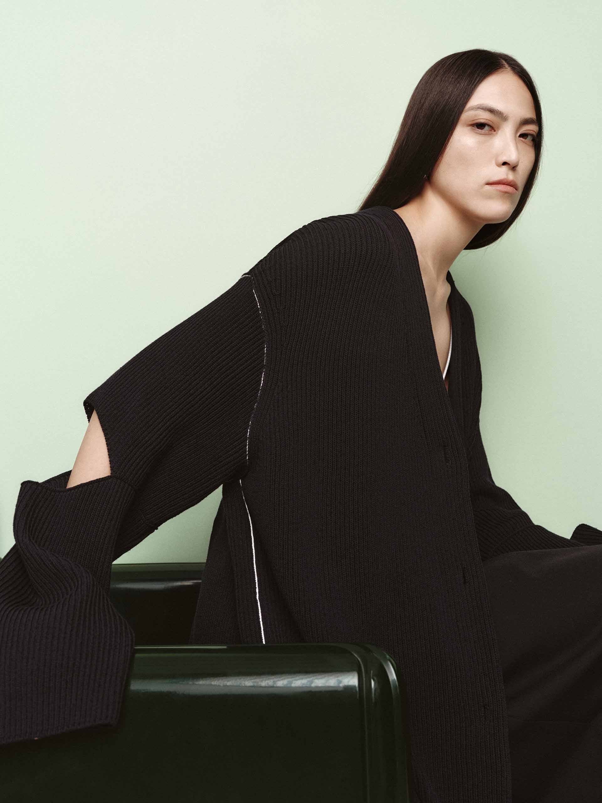 This unique piece from the MO&Co and GAUCHERE collaboration combines modern design with effortless style. It features a V-neckline with a button closure and the dropped shoulders with contrast seamlines add a relaxed yet structured silhouette, while the cut-out detail at the sleeves introduces a bold and contemporary touch.