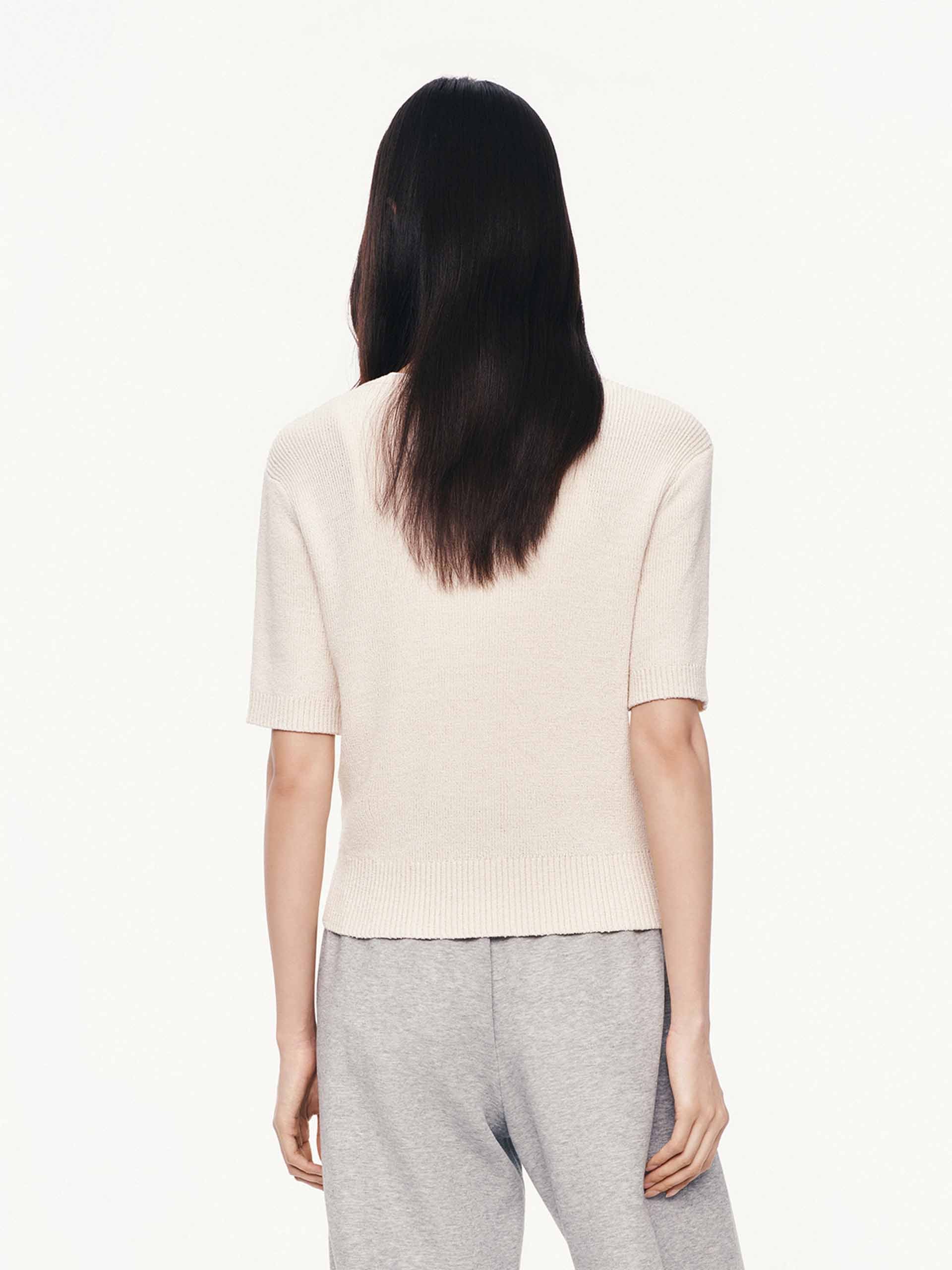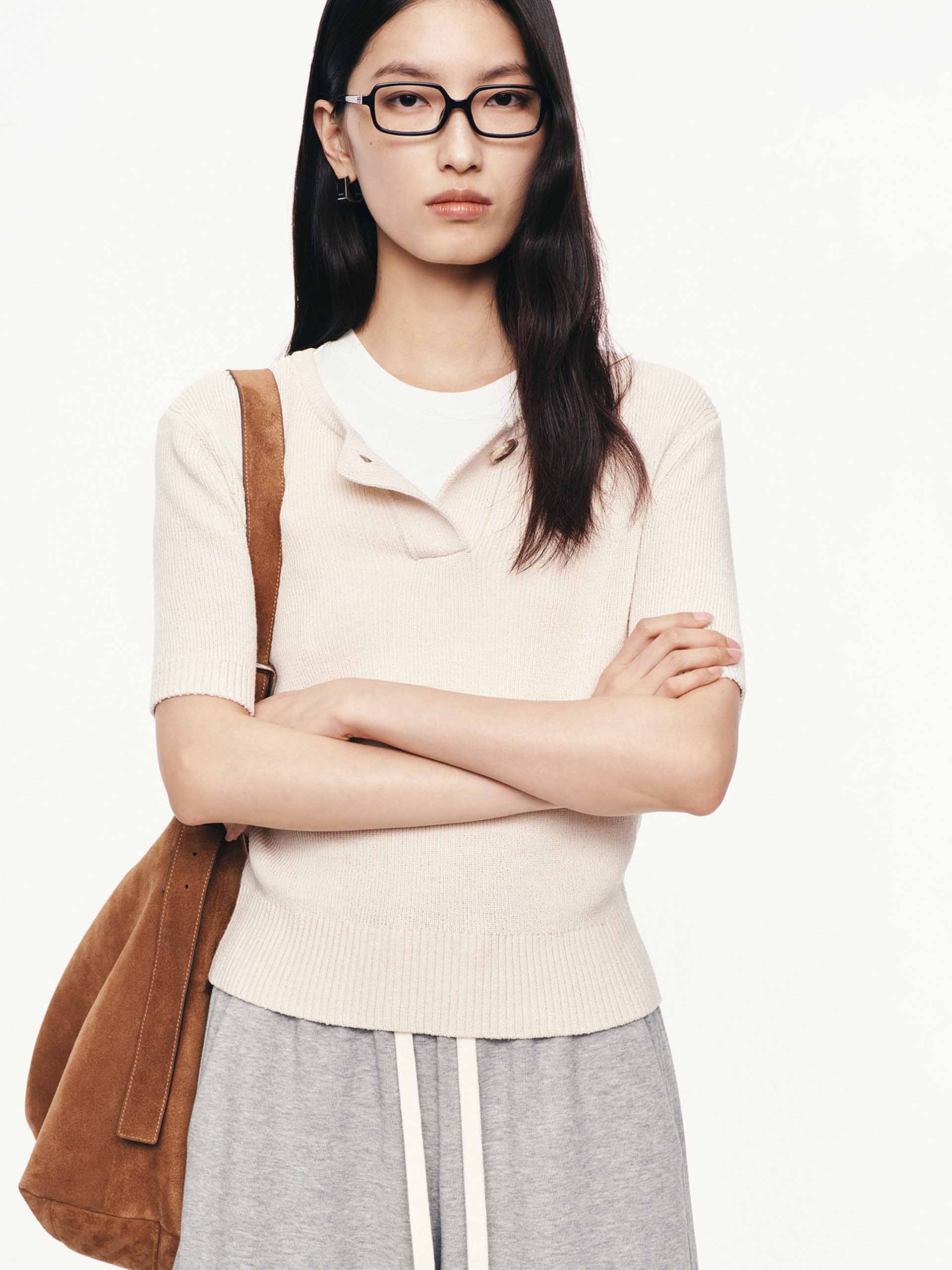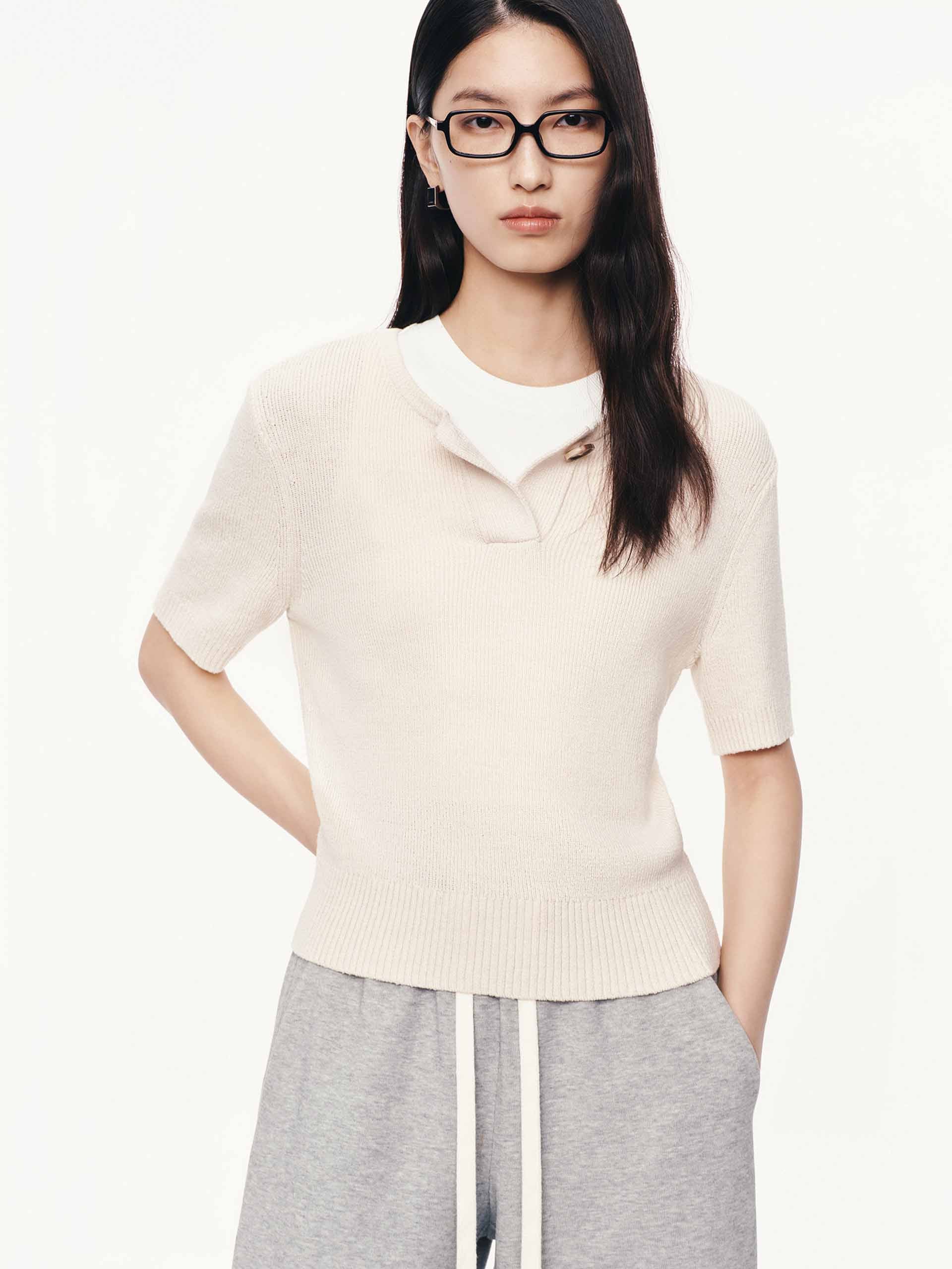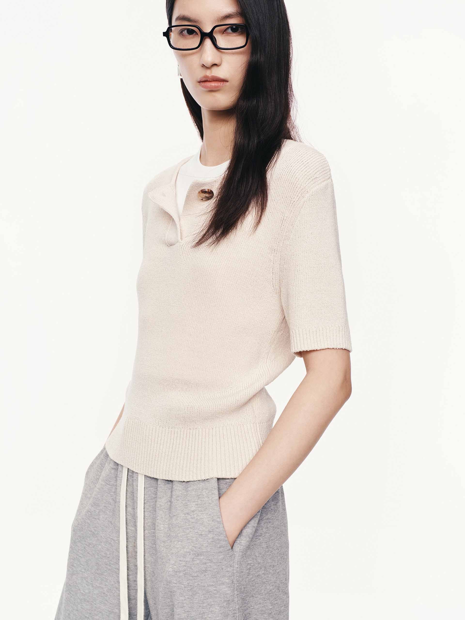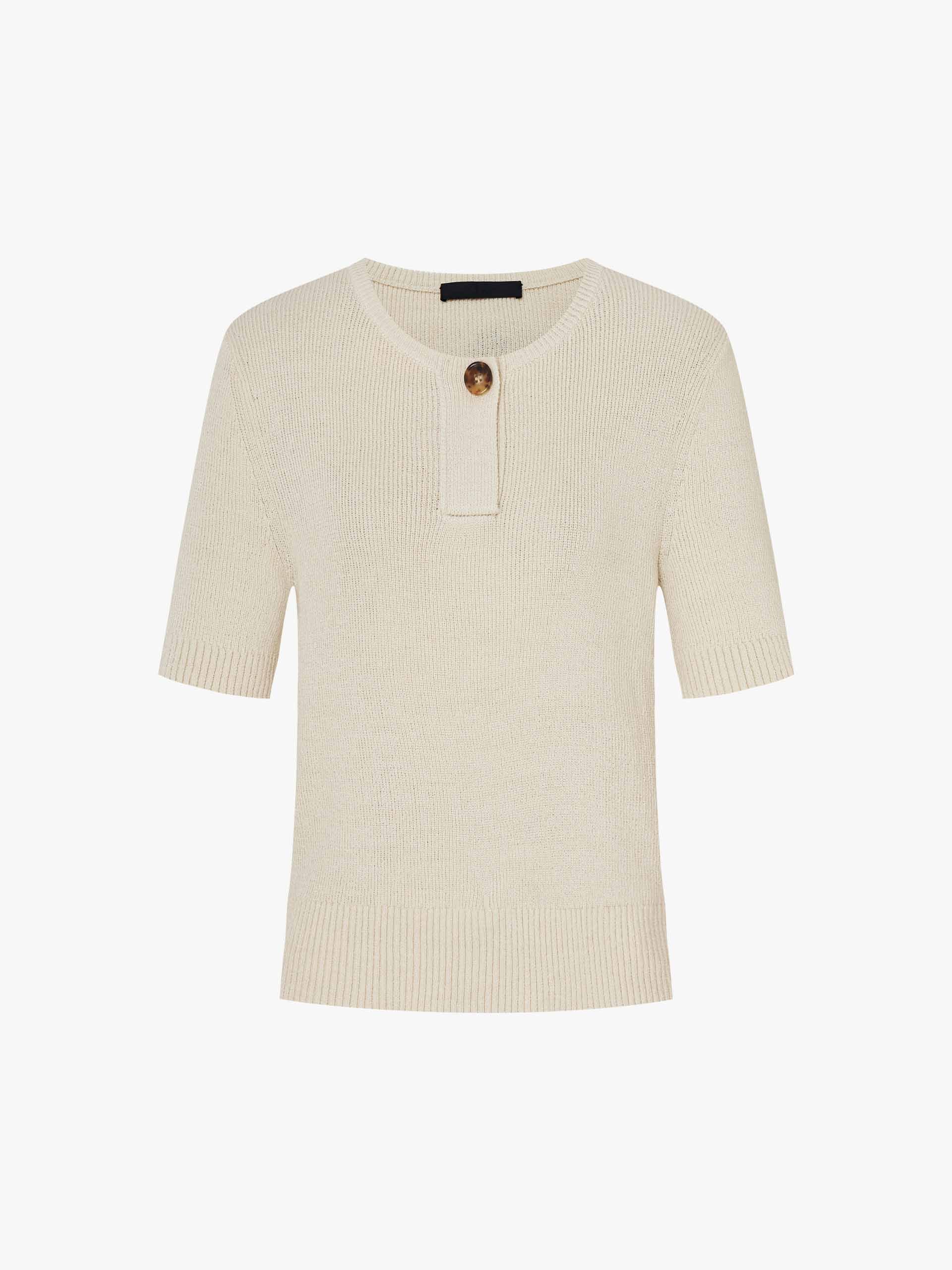 Crafted from 100% premium wool, this sweater offers lightweight warmth and timeless style. A ribbed hem provides subtle structure and a flattering finish. The crew neckline and short sleeves keep it versatile for layering or wearing solo, while the elegant half-button closure adds a touch of refined detail.