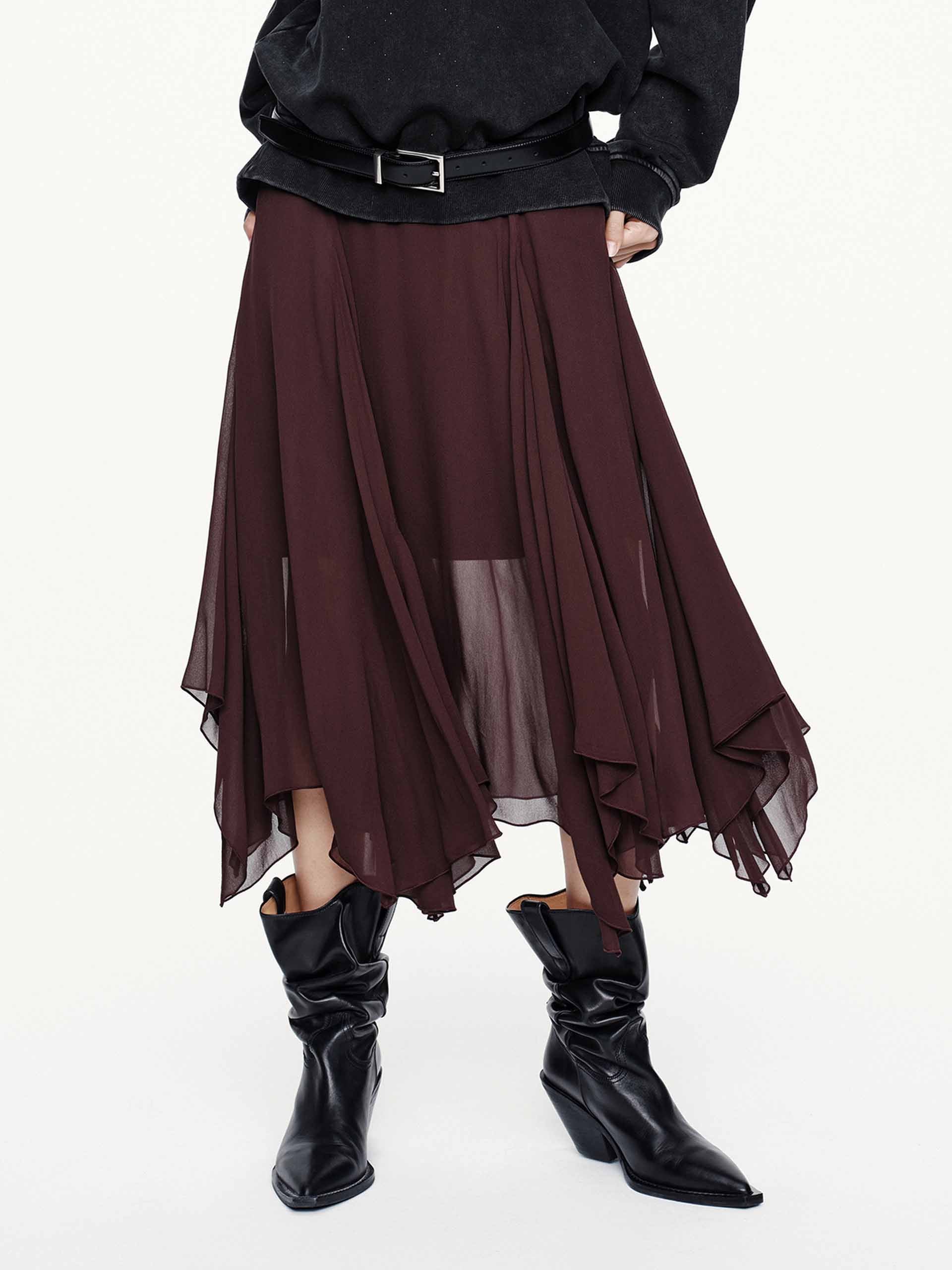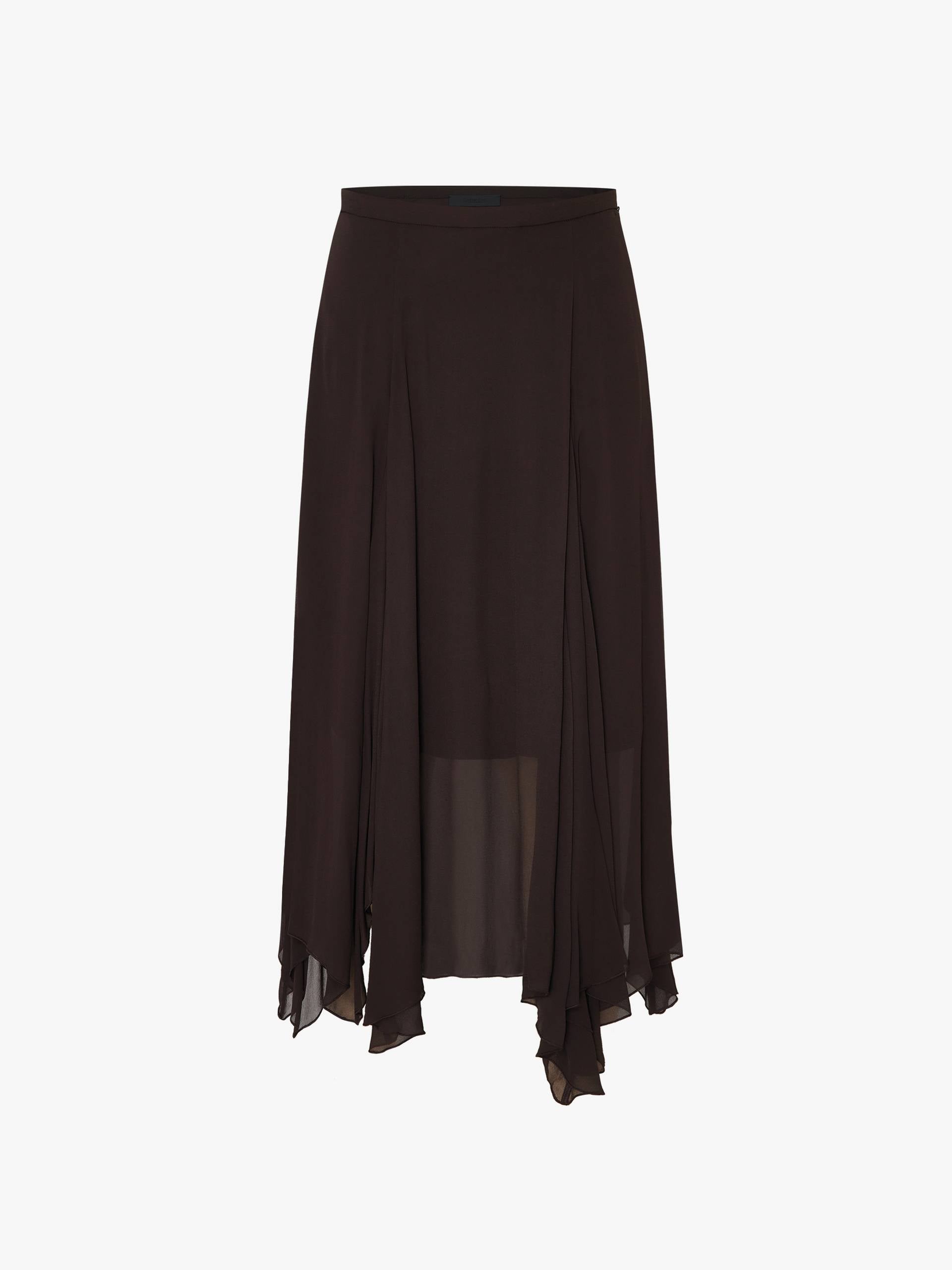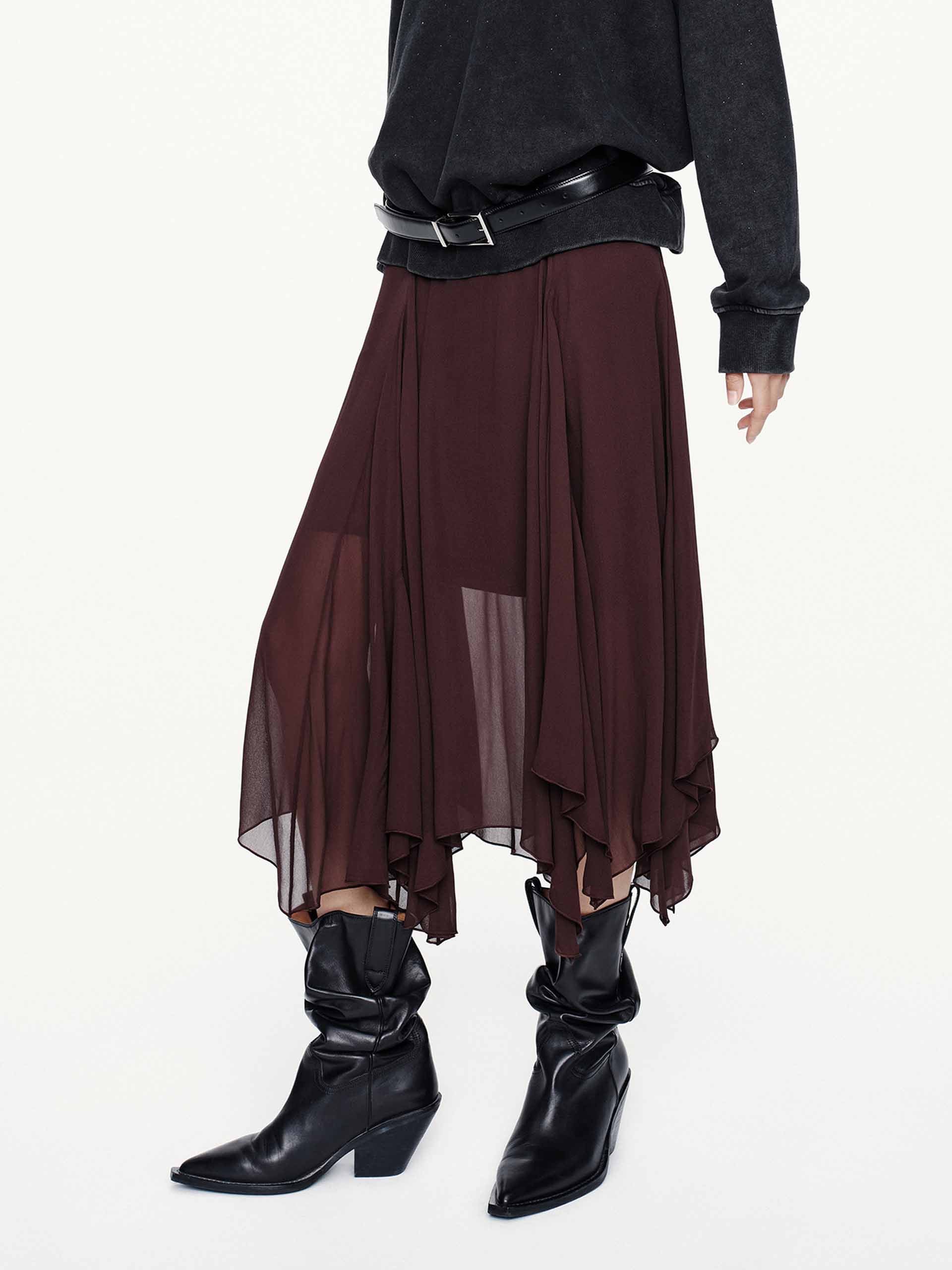 Embrace effortless elegance with this skirt, where modern design meets romantic movement. Layers of airy fabric float with every step, their delicate tulle accents peeking through for subtle texture and volume. A discreet side zipper ensures clean lines, while the inner lining maintains both modesty and fluid drape. The dark brown skirt may appear burgundy under different lighting.